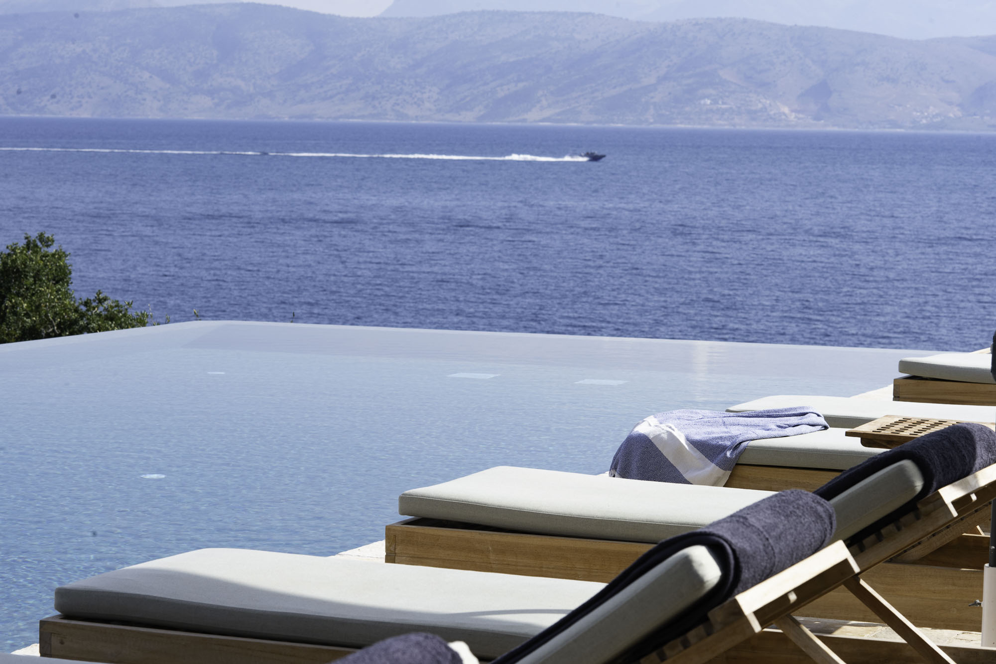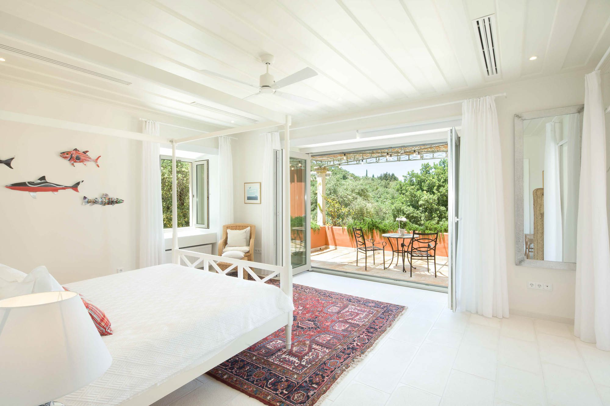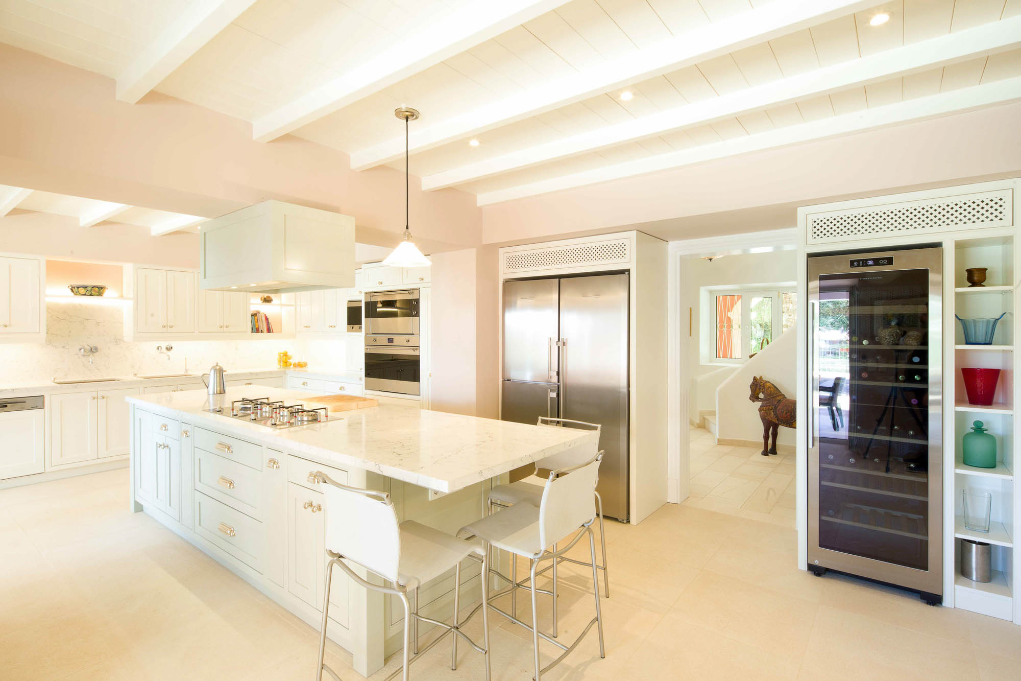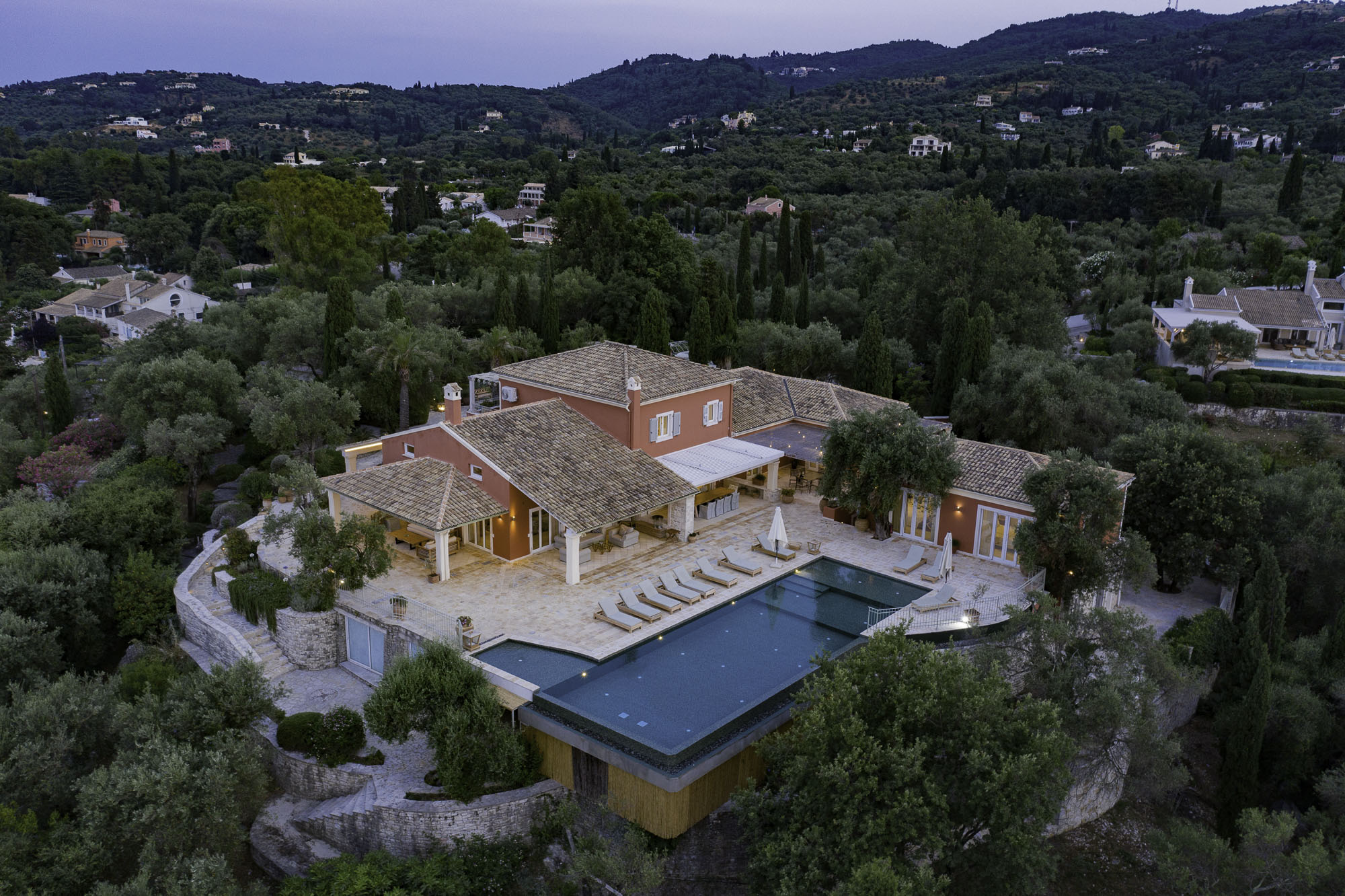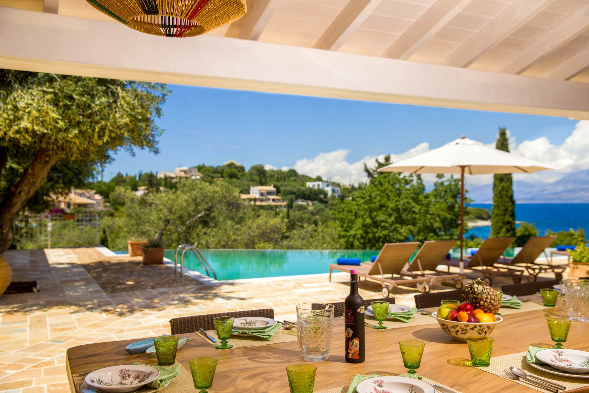 A pergola-covered outdoor kitchen and dining room feature a wood-burning pizza oven and a long dining table for 16. Poolside, another pergola shades a table seating 12 and a gas barbecue. There are numerous places to sit and enjoy the different views and a beautiful infinity pool with views out across the sea to the mainland beyond. From the garden, it’s a short walk down a path to the sea or set off through the olive groves to Kassiopi.