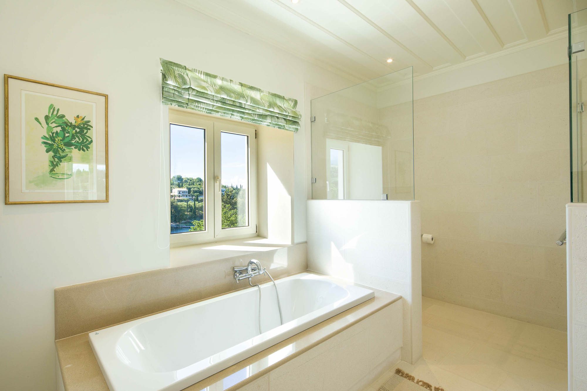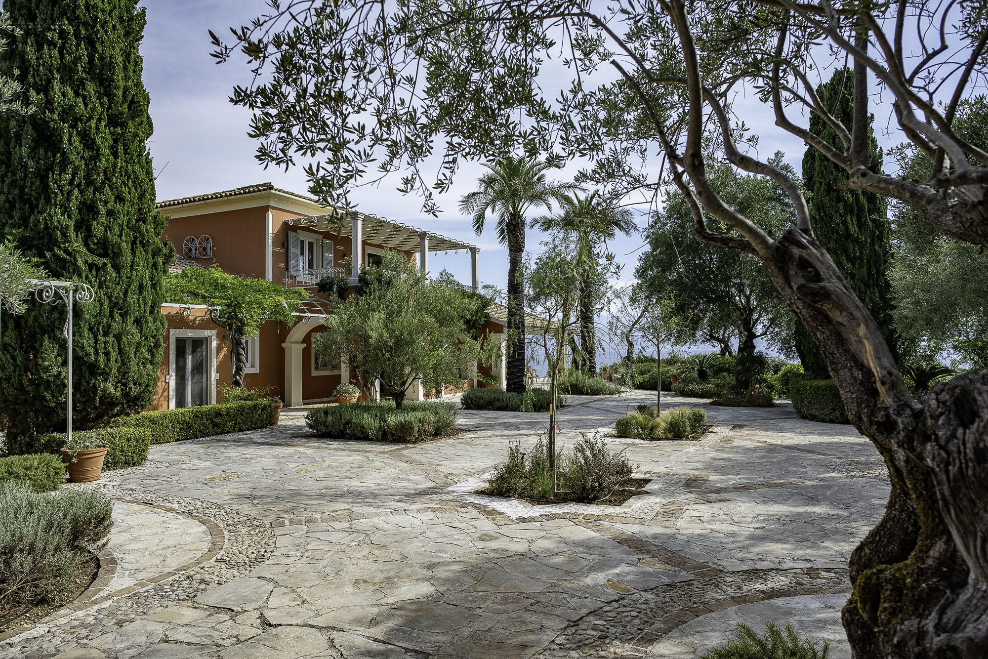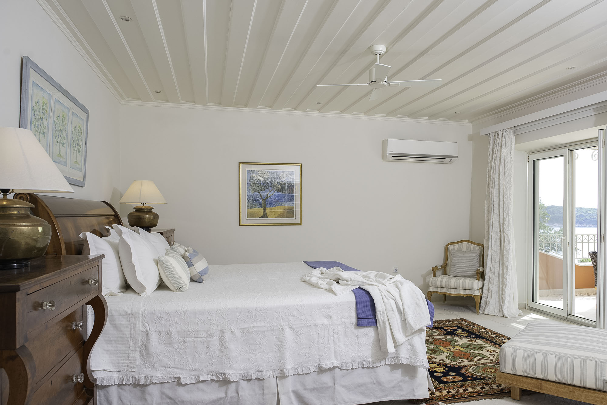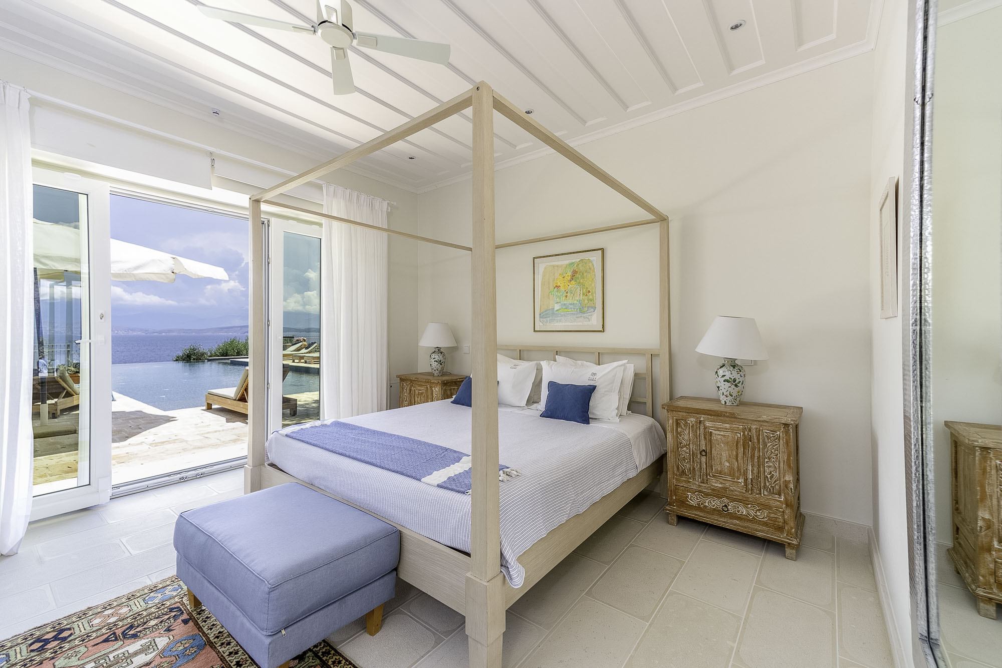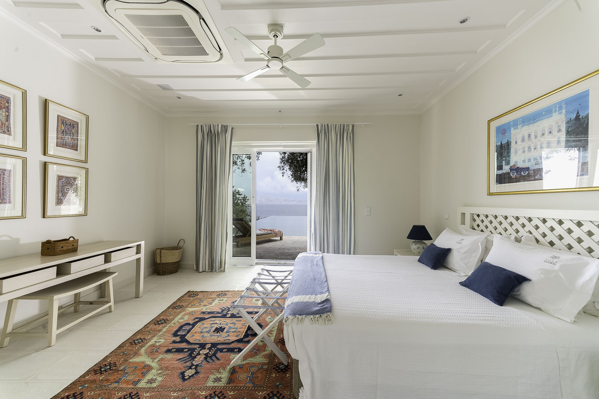 A pergola-covered outdoor kitchen and dining room feature a wood-burning pizza oven and a long dining table for 16. Poolside, another pergola shades a table seating 12 and a gas barbecue. There are numerous places to sit and enjoy the different views and a beautiful infinity pool with views out across the sea to the mainland beyond. From the garden, it’s a short walk down a path to the sea or set off through the olive groves to Kassiopi.
