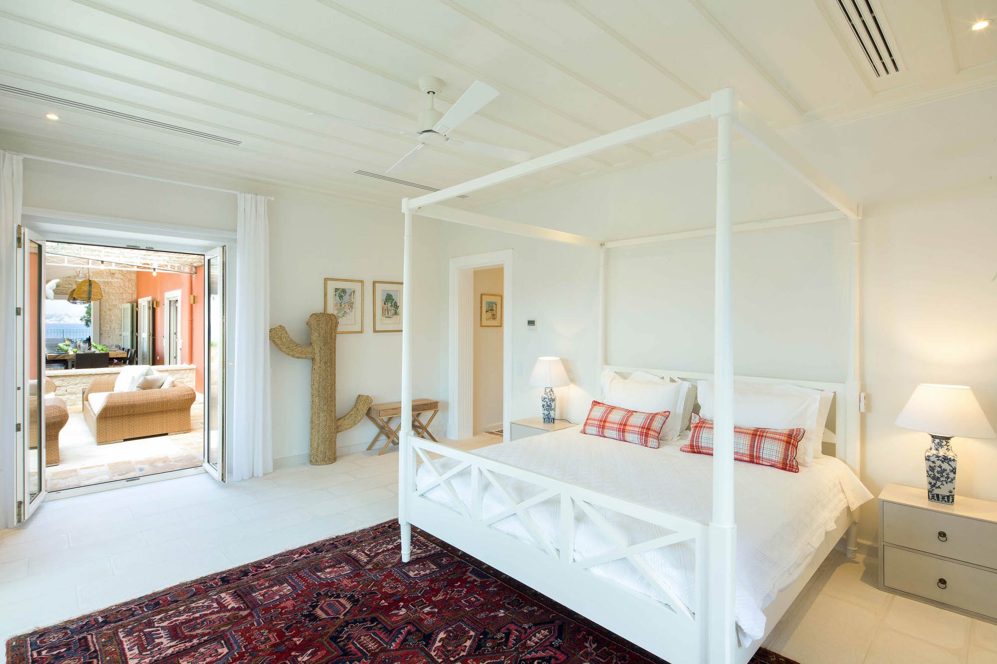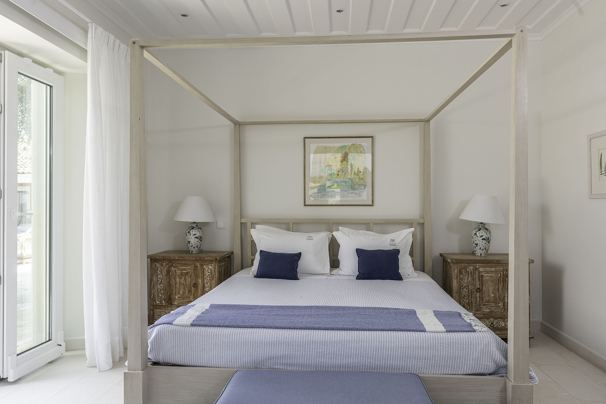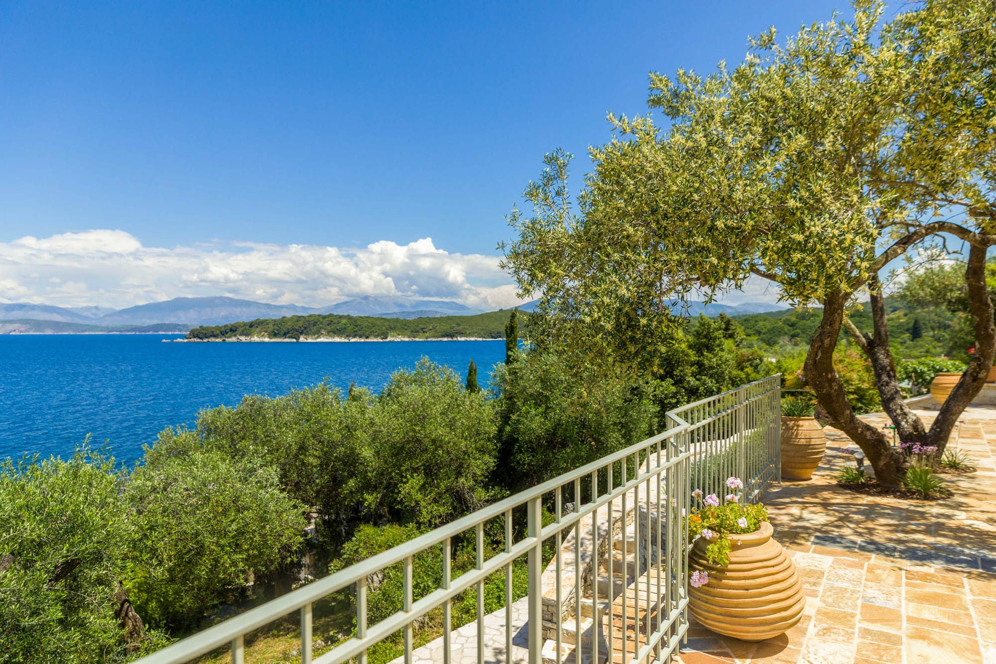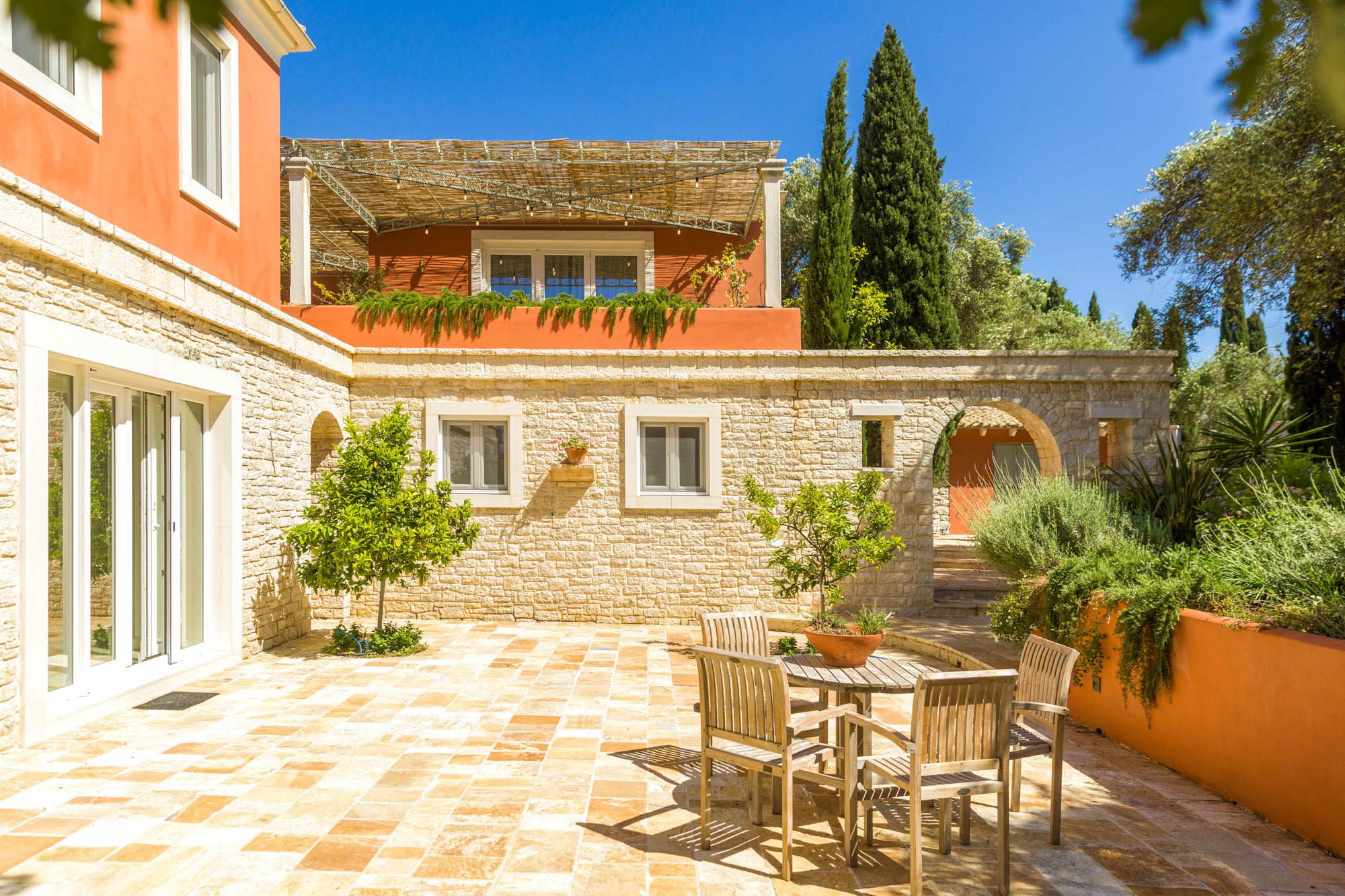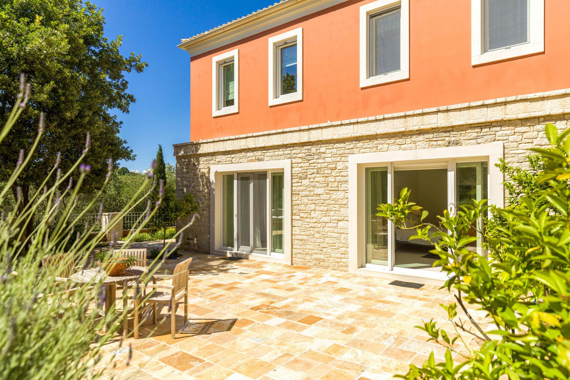 A pergola-covered outdoor kitchen and dining room feature a wood-burning pizza oven and a long dining table for 16. Poolside, another pergola shades a table seating 12 and a gas barbecue. There are numerous places to sit and enjoy the different views and a beautiful infinity pool with views out across the sea to the mainland beyond. From the garden, it’s a short walk down a path to the sea or set off through the olive groves to Kassiopi.