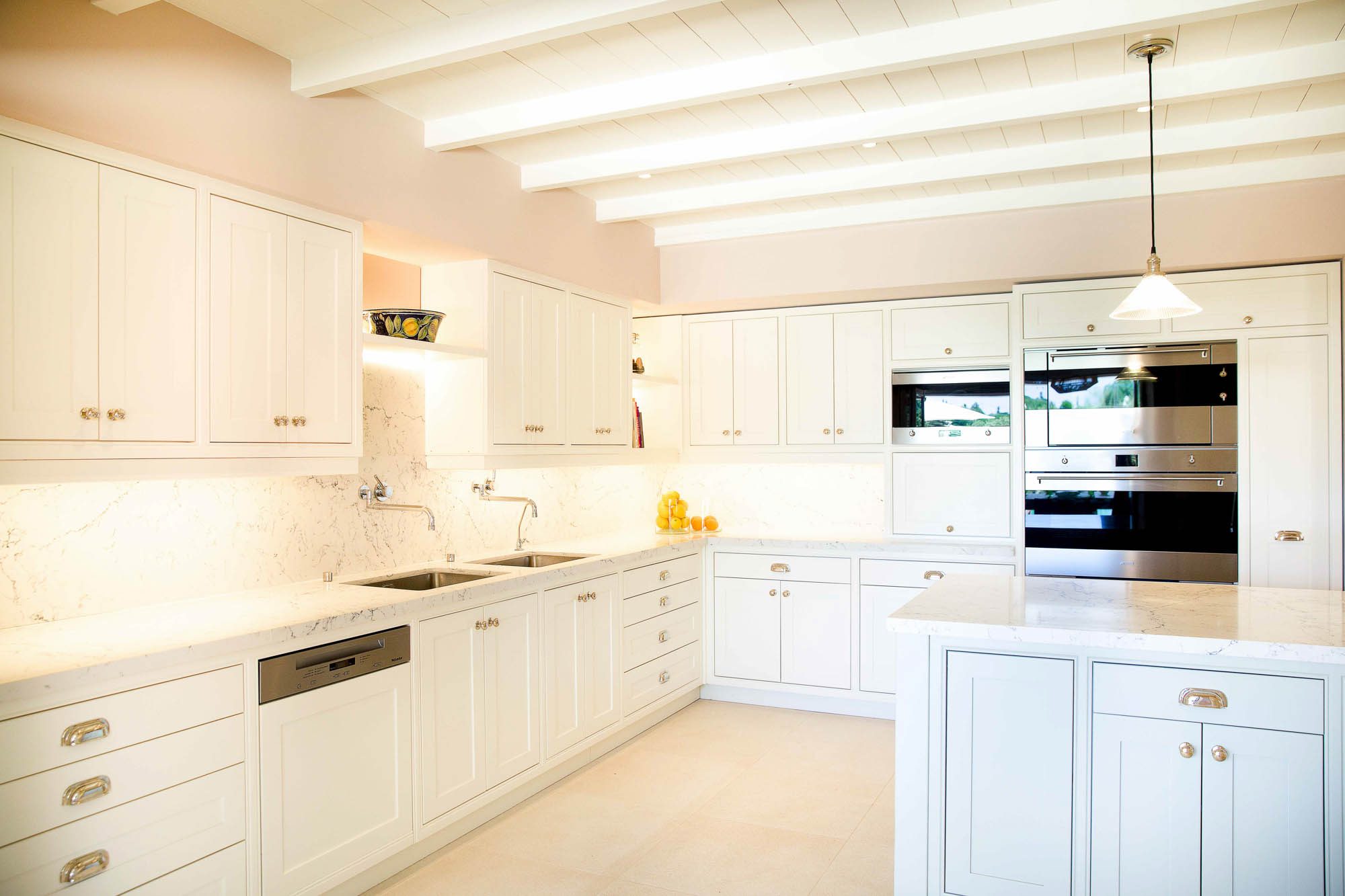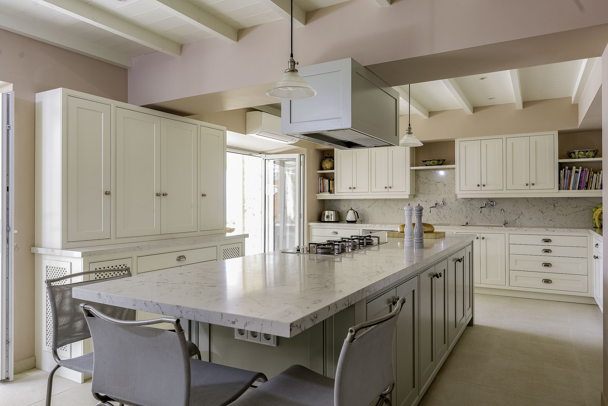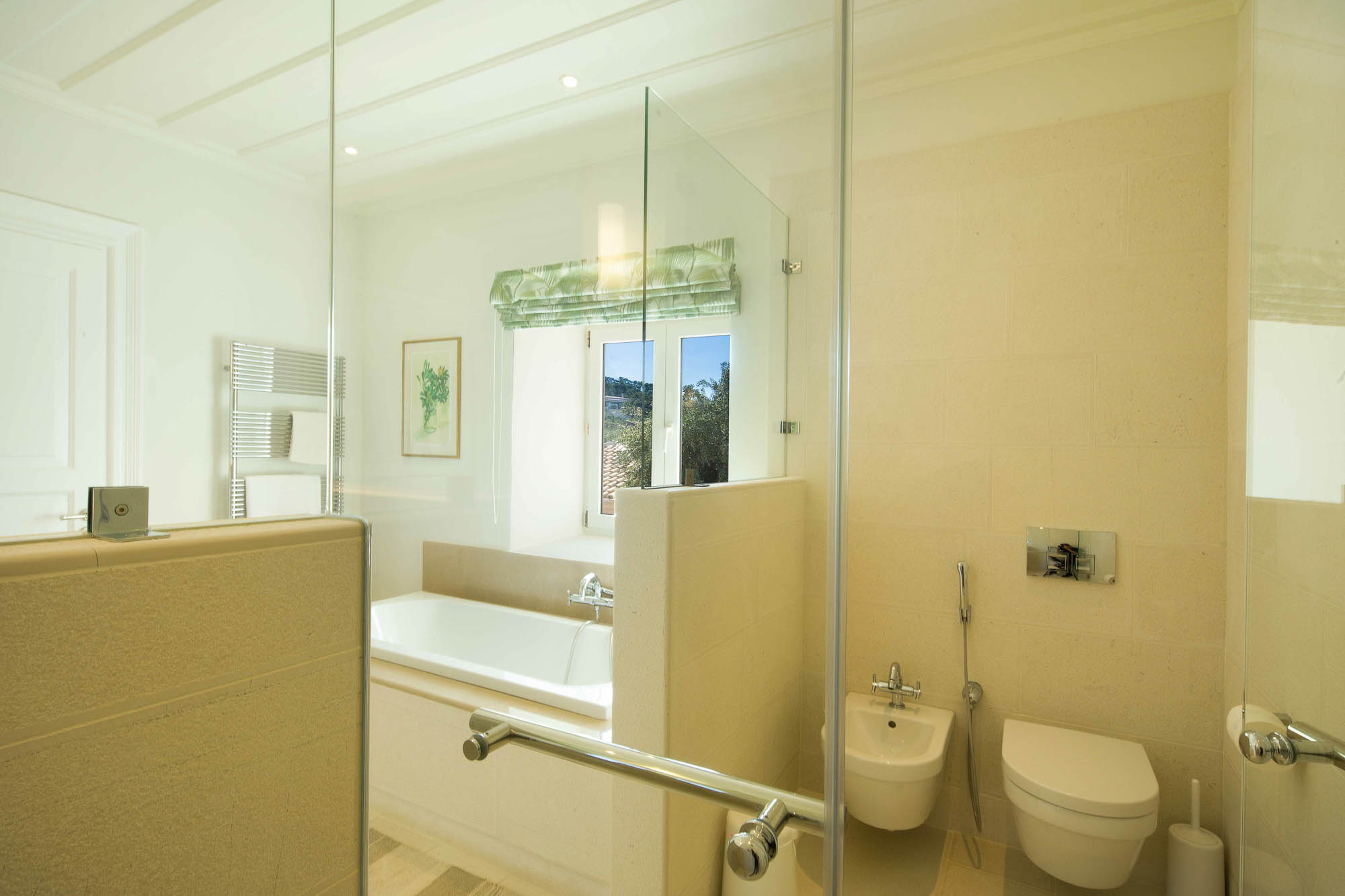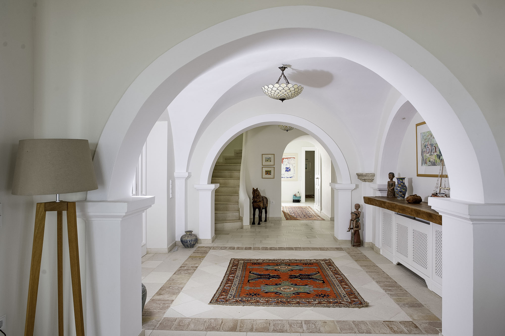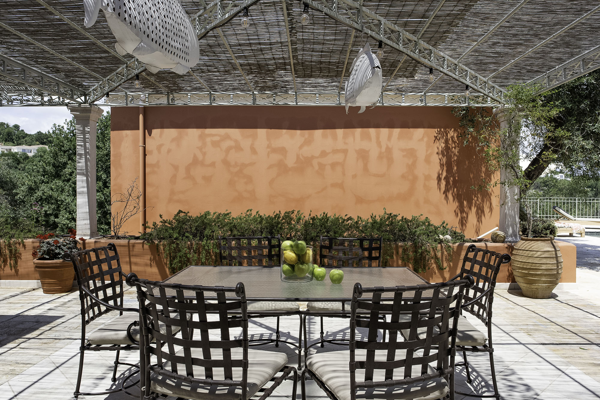 A pergola-covered outdoor kitchen and dining room feature a wood-burning pizza oven and a long dining table for 16. Poolside, another pergola shades a table seating 12 and a gas barbecue. There are numerous places to sit and enjoy the different views and a beautiful infinity pool with views out across the sea to the mainland beyond. From the garden, it’s a short walk down a path to the sea or set off through the olive groves to Kassiopi.