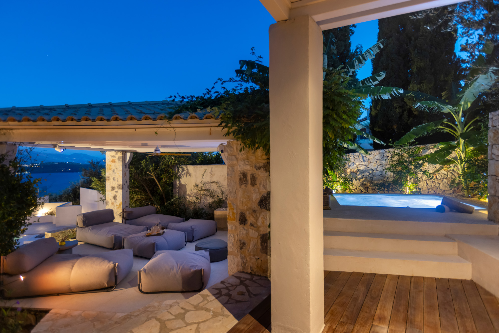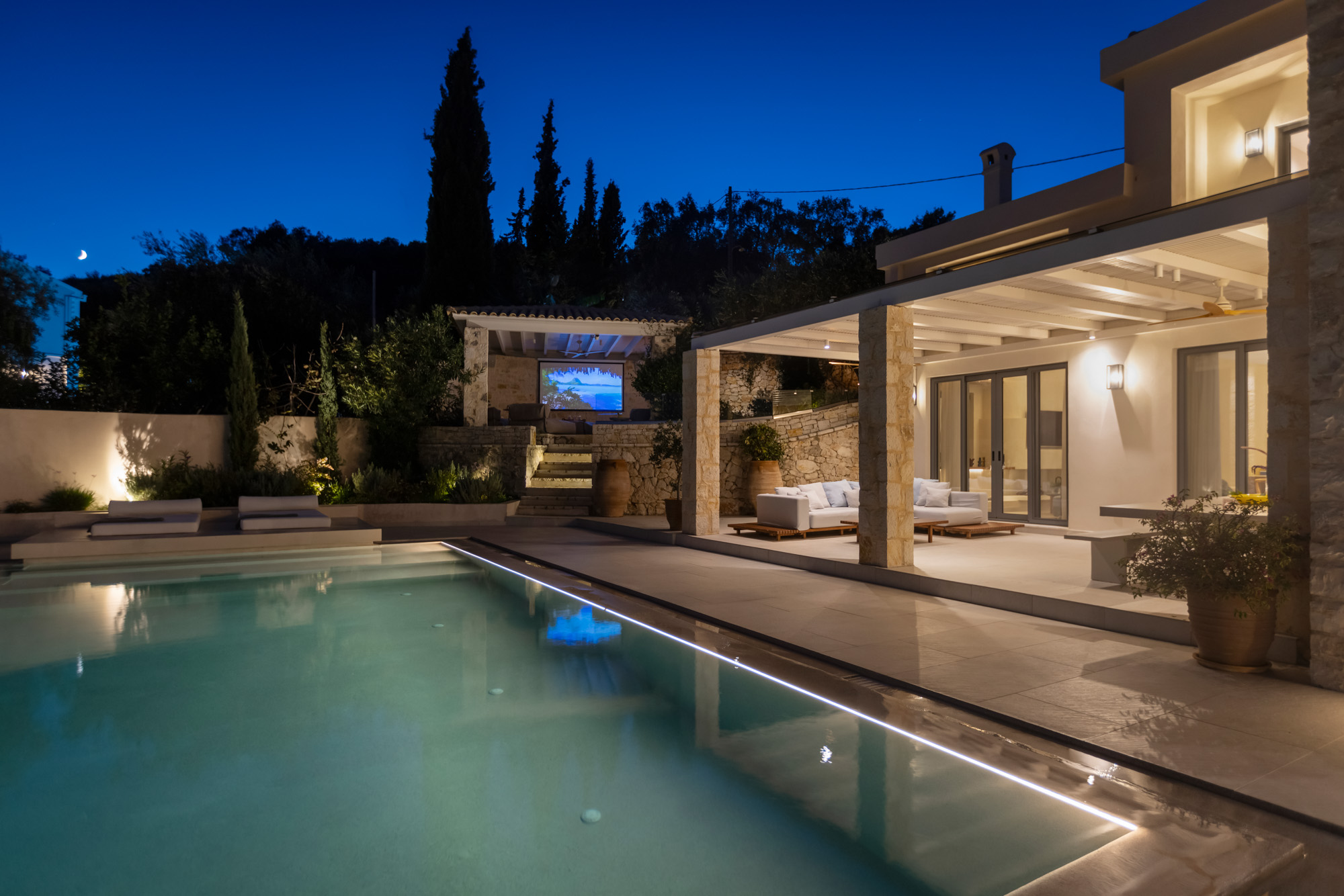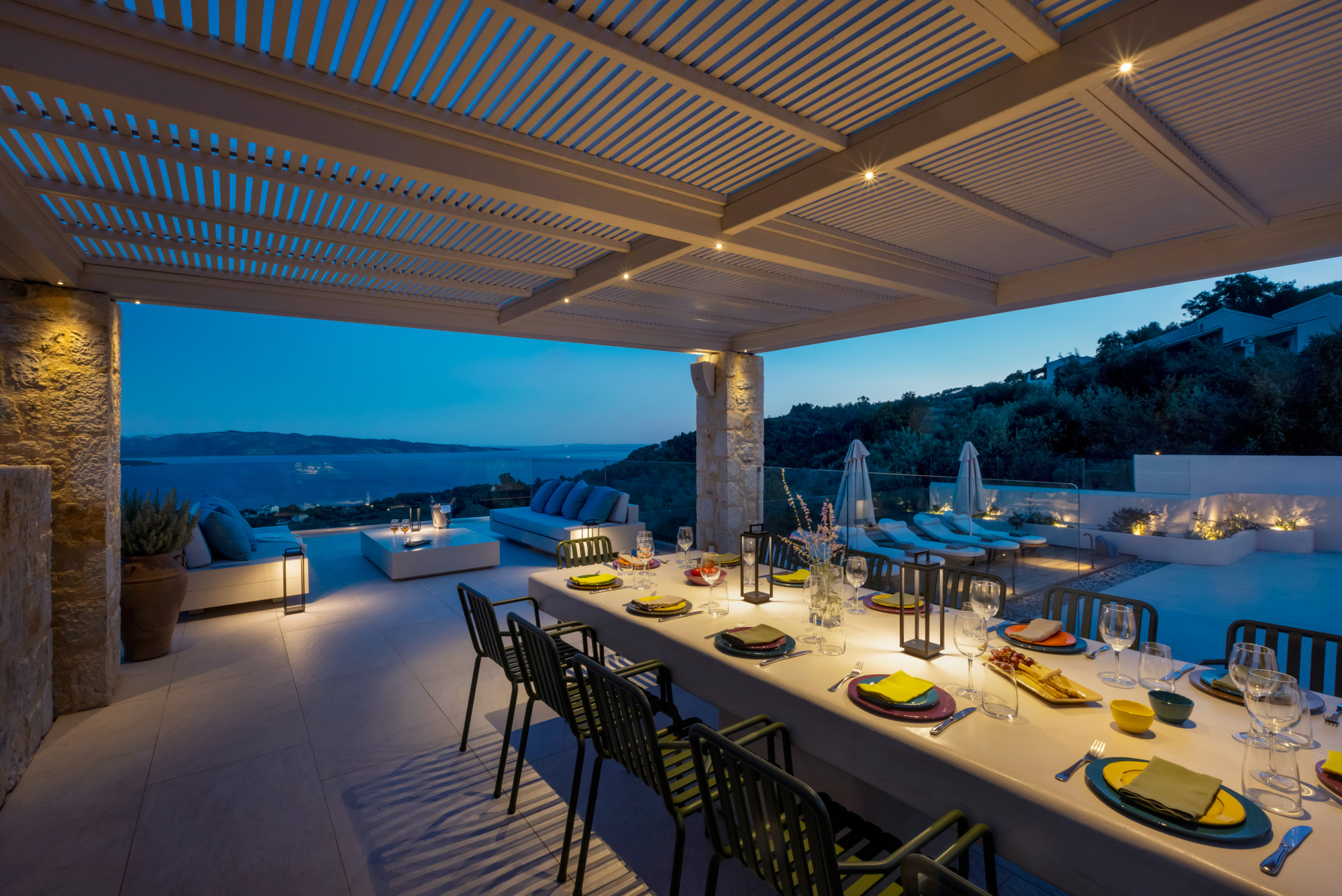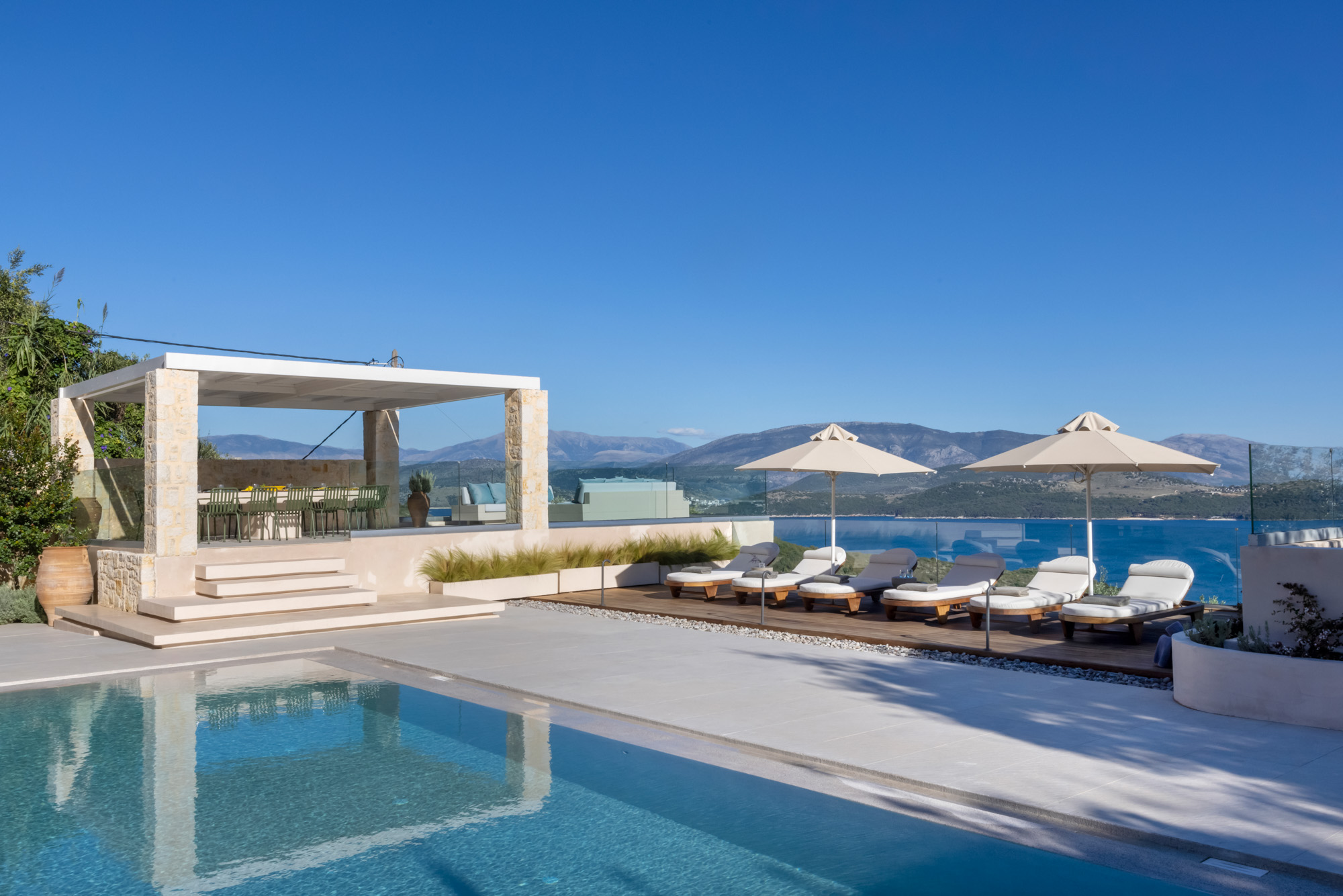 This contemporary villa has fabulous outdoor living spaces, includes both chef and concierge services, and is great for larger groups of friends or families. It is just a short drive to St Stephano, Avlaki and Kerasia beaches.