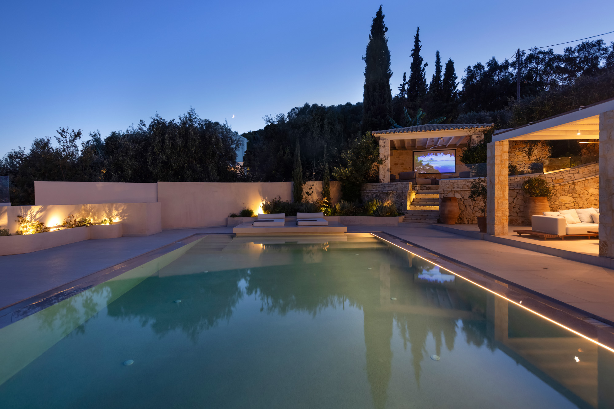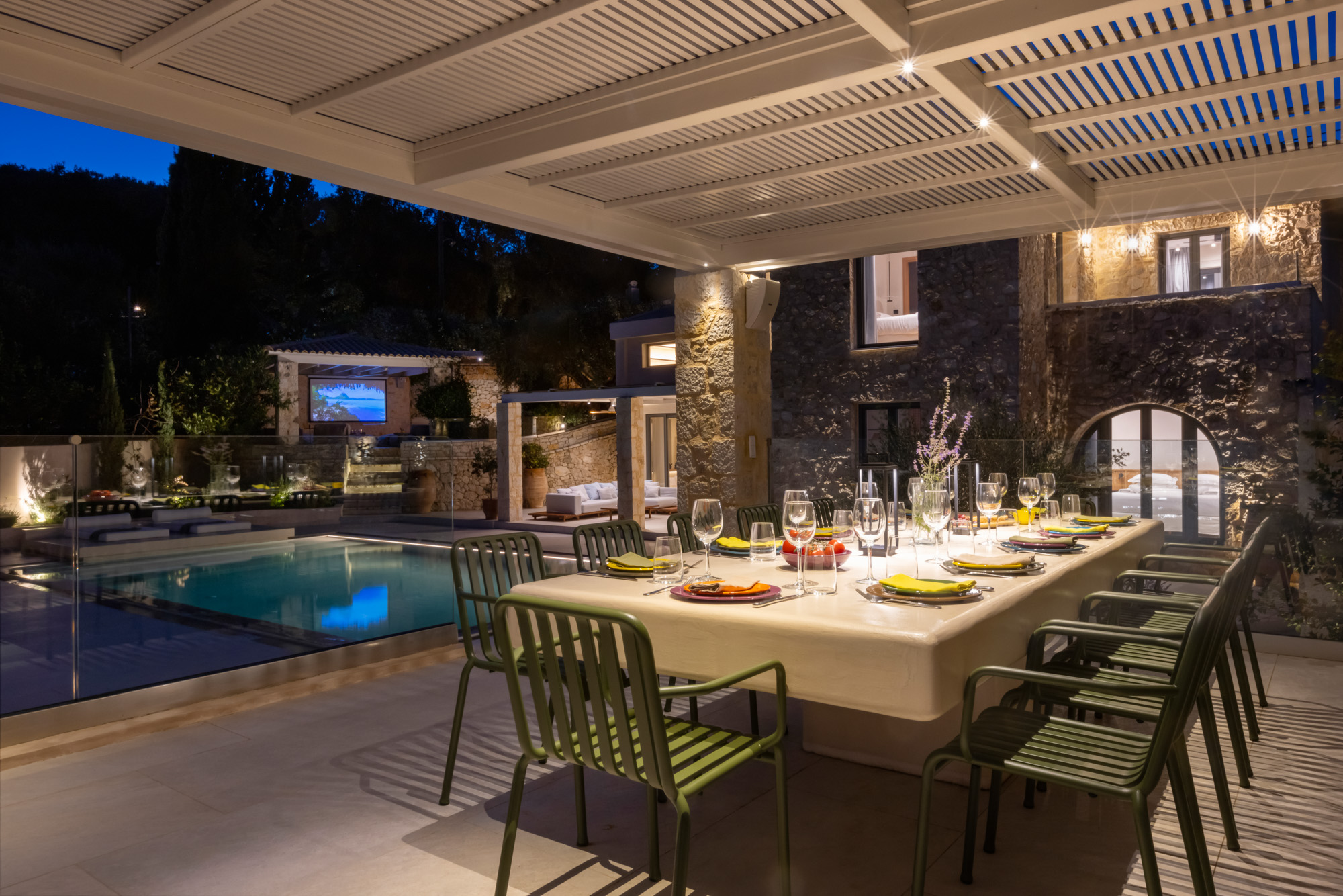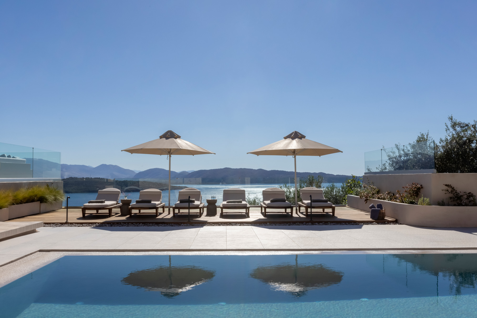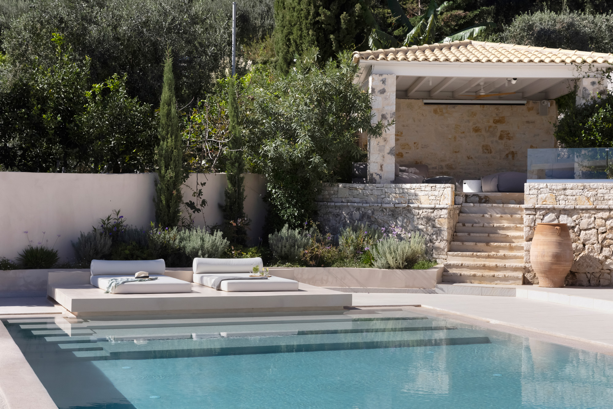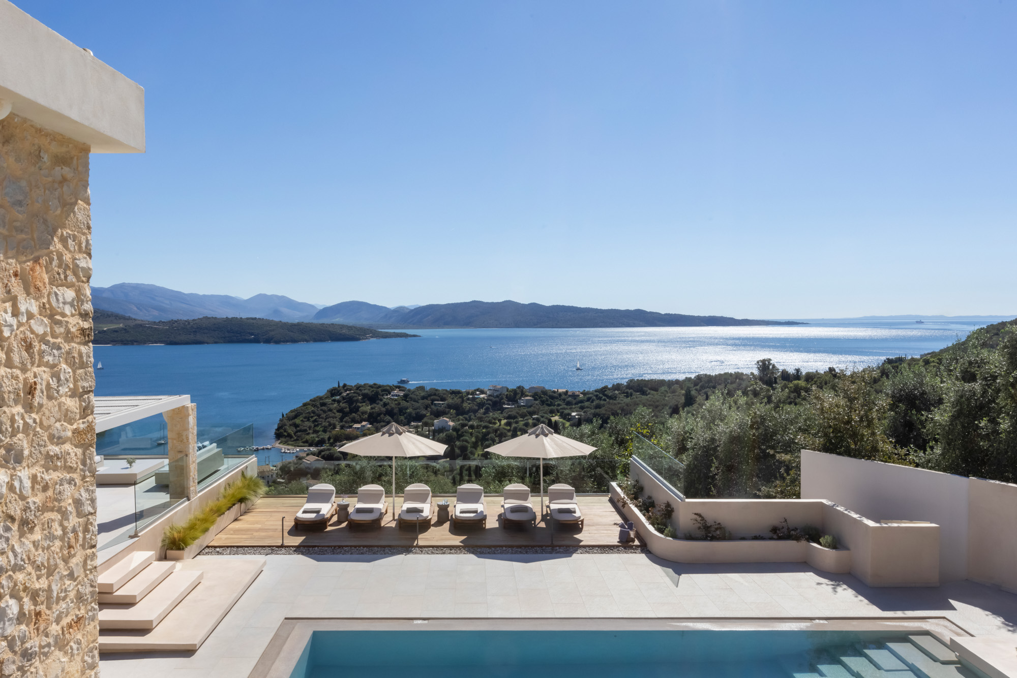 This contemporary villa has fabulous outdoor living spaces, includes both chef and concierge services, and is great for larger groups of friends or families. It is just a short drive to St Stephano, Avlaki and Kerasia beaches.