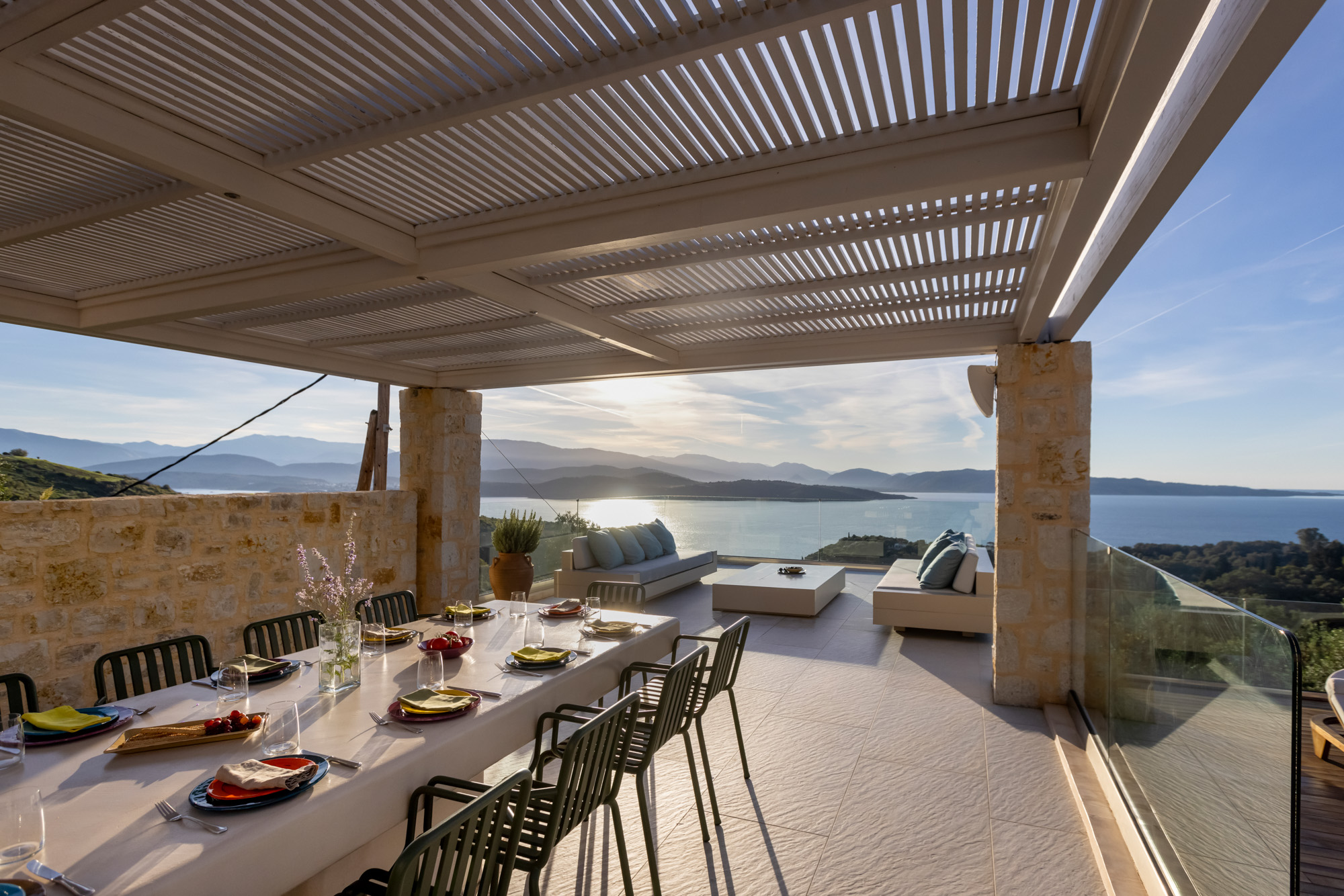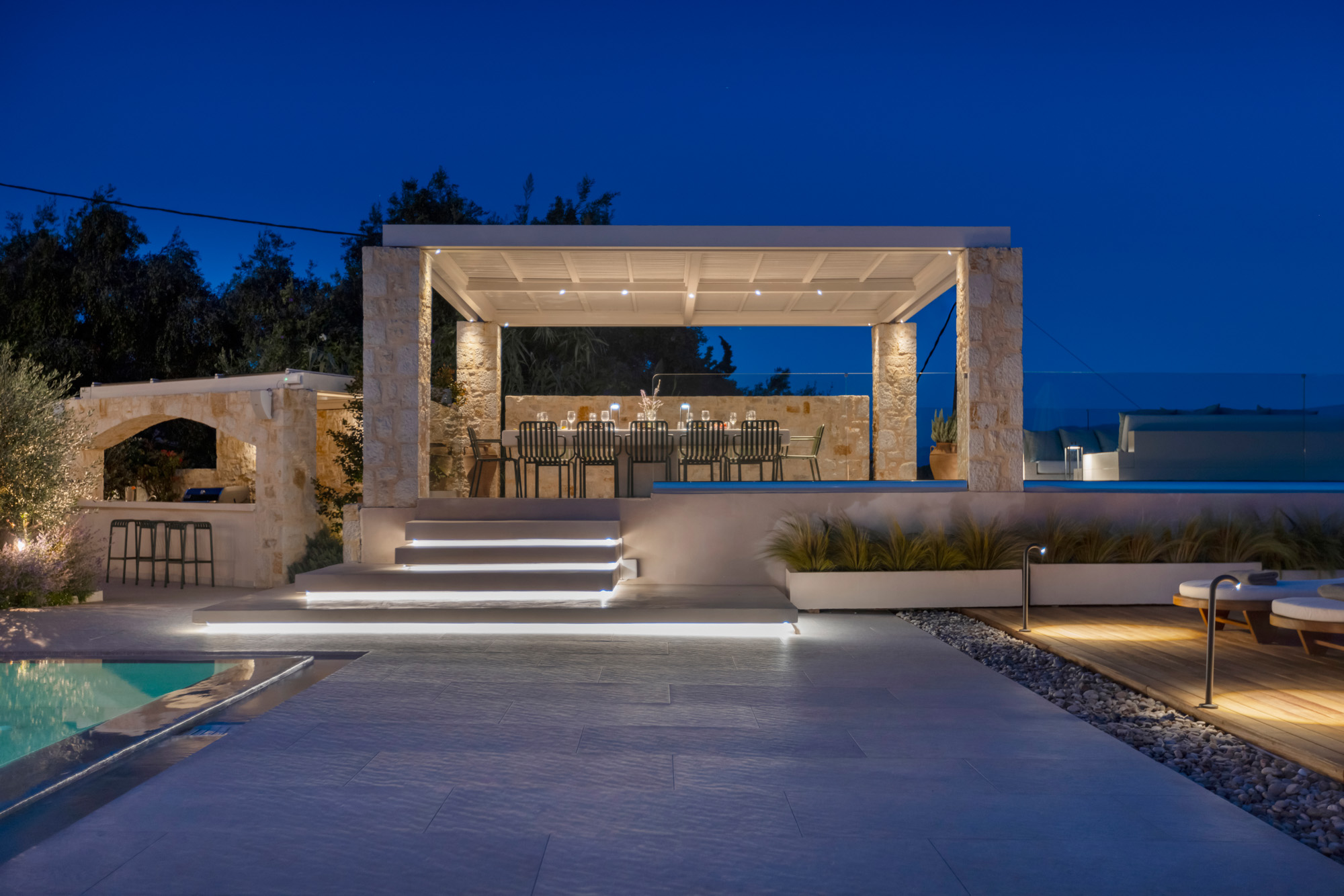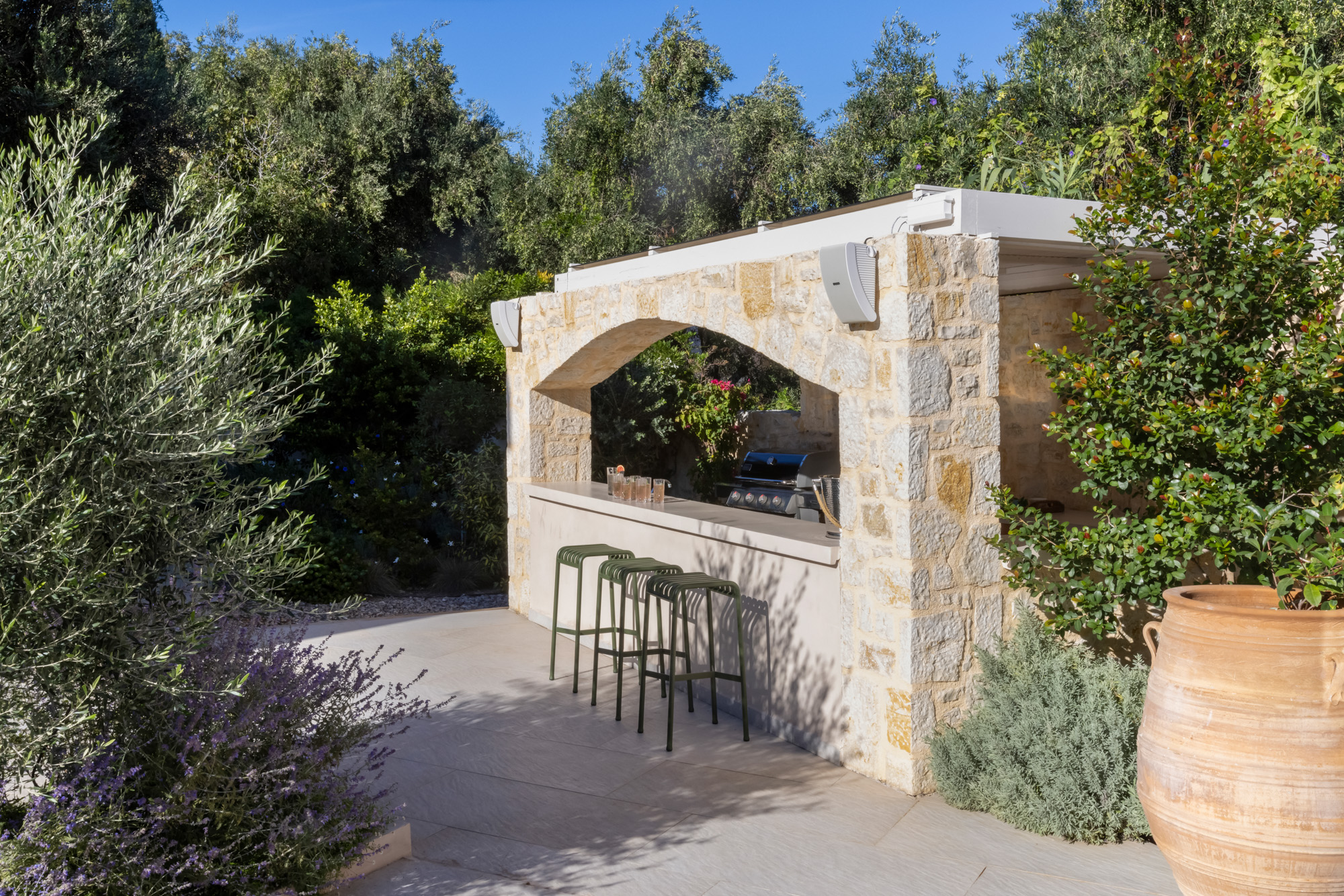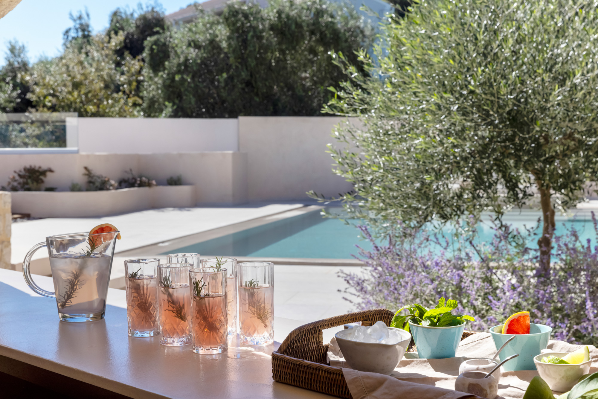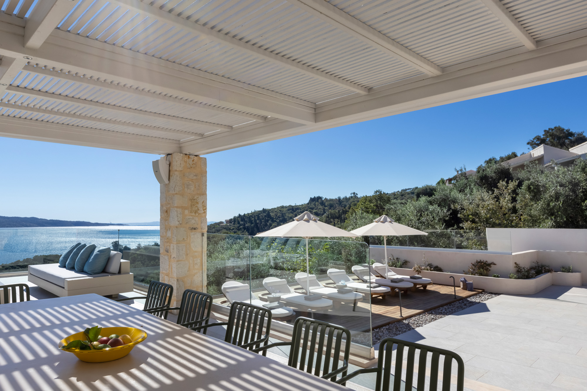 This contemporary villa has fabulous outdoor living spaces, includes both chef and concierge services, and is great for larger groups of friends or families. It is just a short drive to St Stephano, Avlaki and Kerasia beaches.