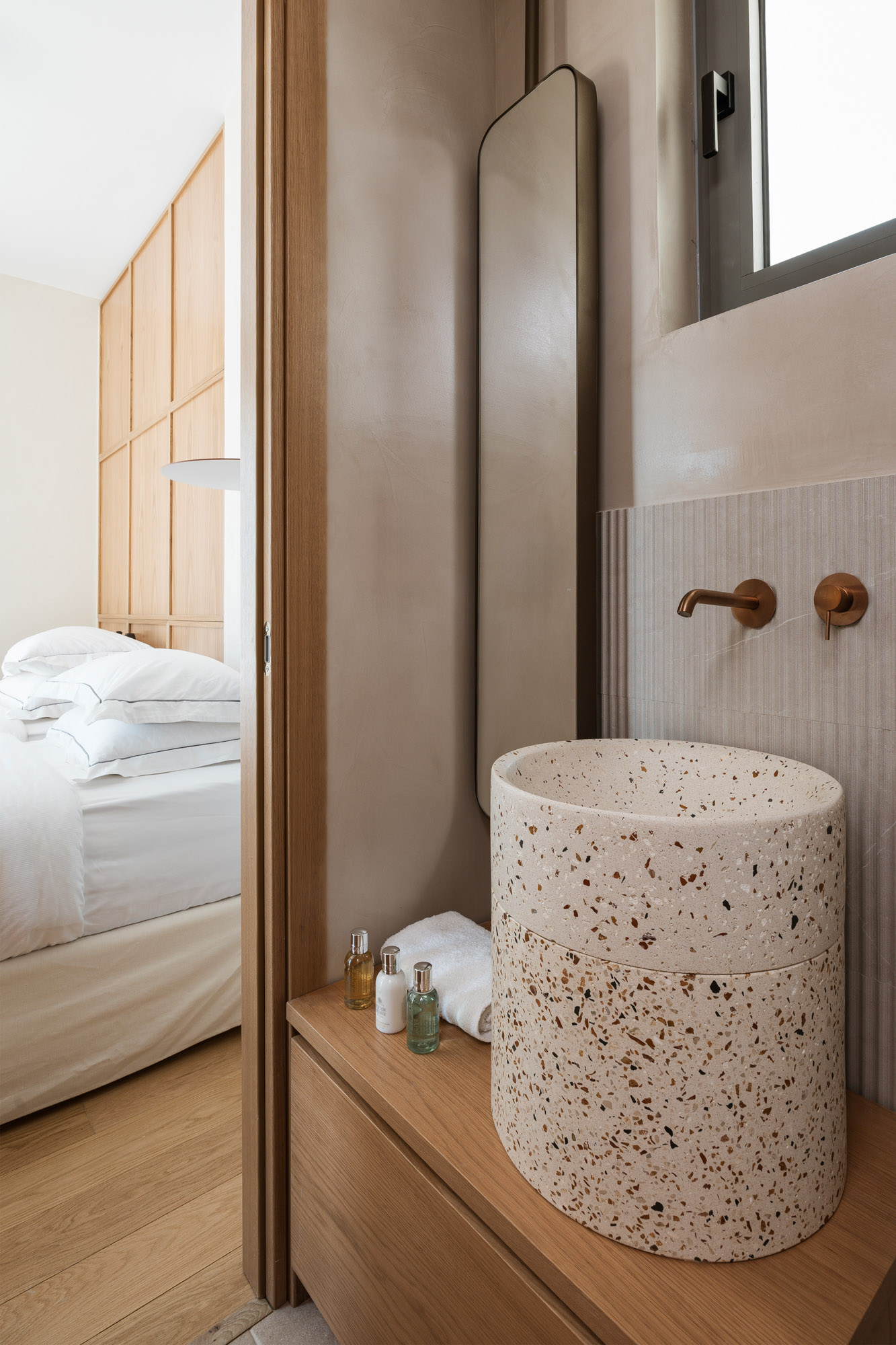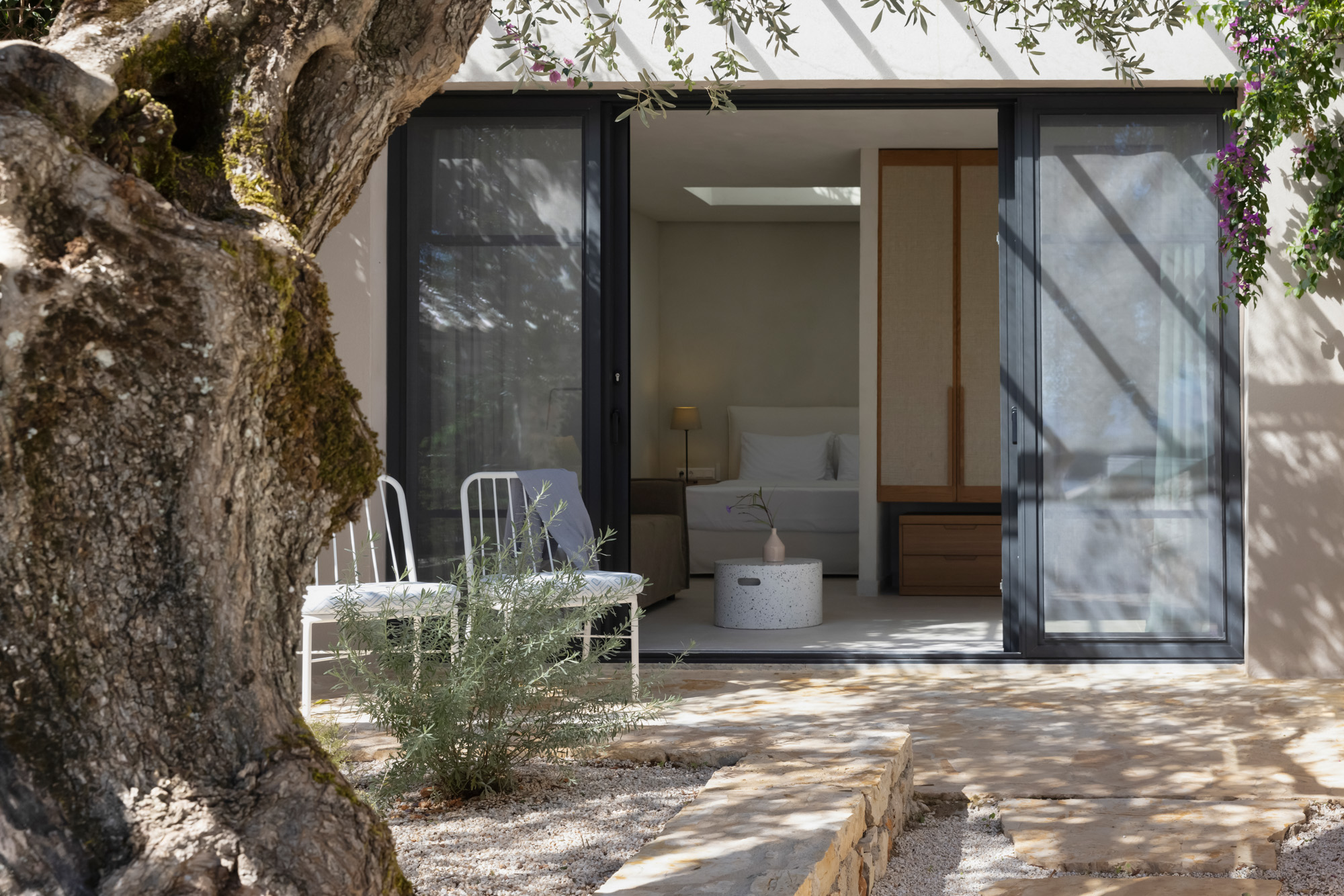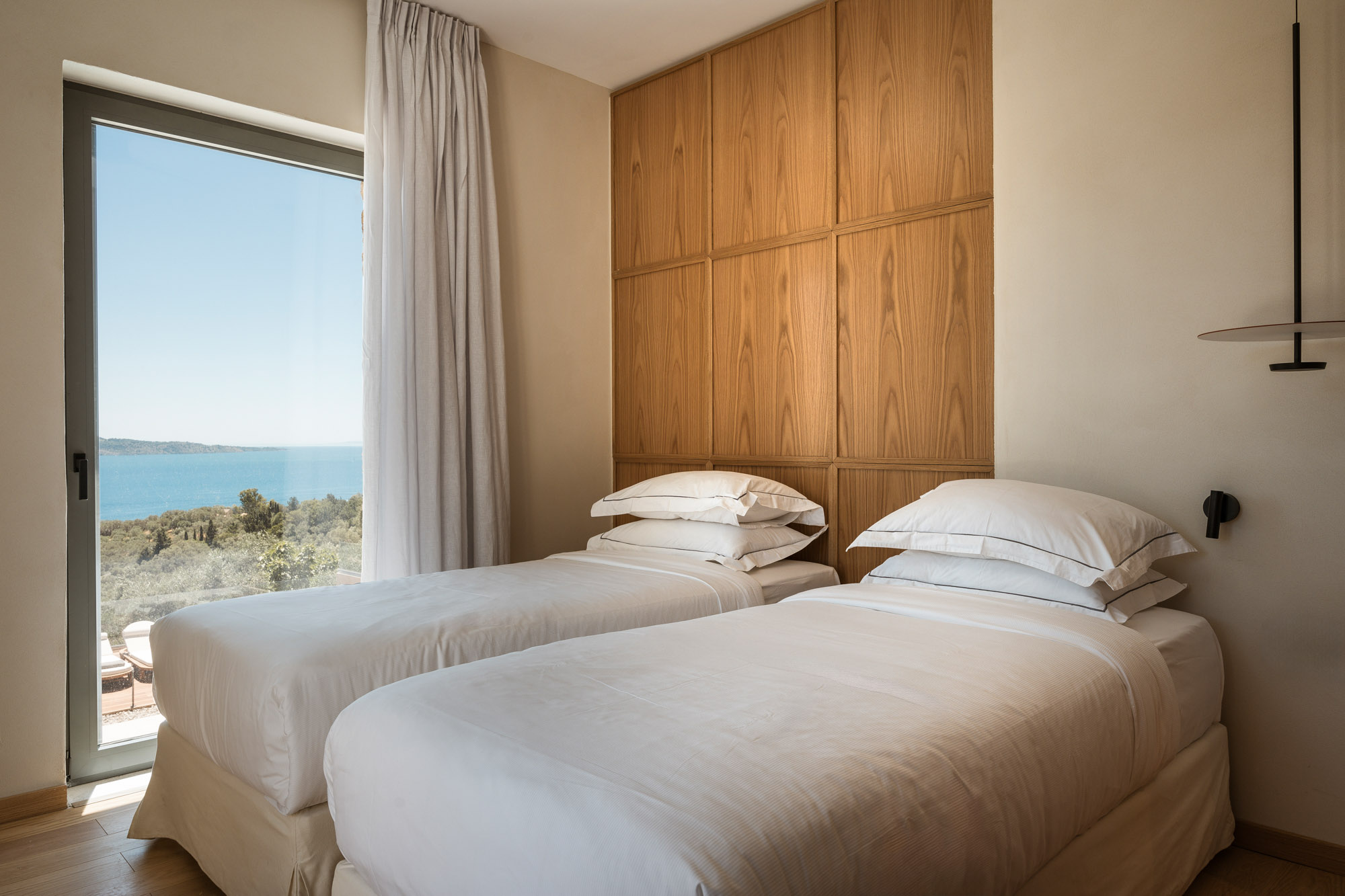 The open-plan kitchen/living room has large sets of sliding glass doors opening onto the terrace, with views to the Albanian mountains. The bedrooms are split across three floors in the main house. There's one additional bedroom with independent access, a kitchenette, and a living area in the guest house.