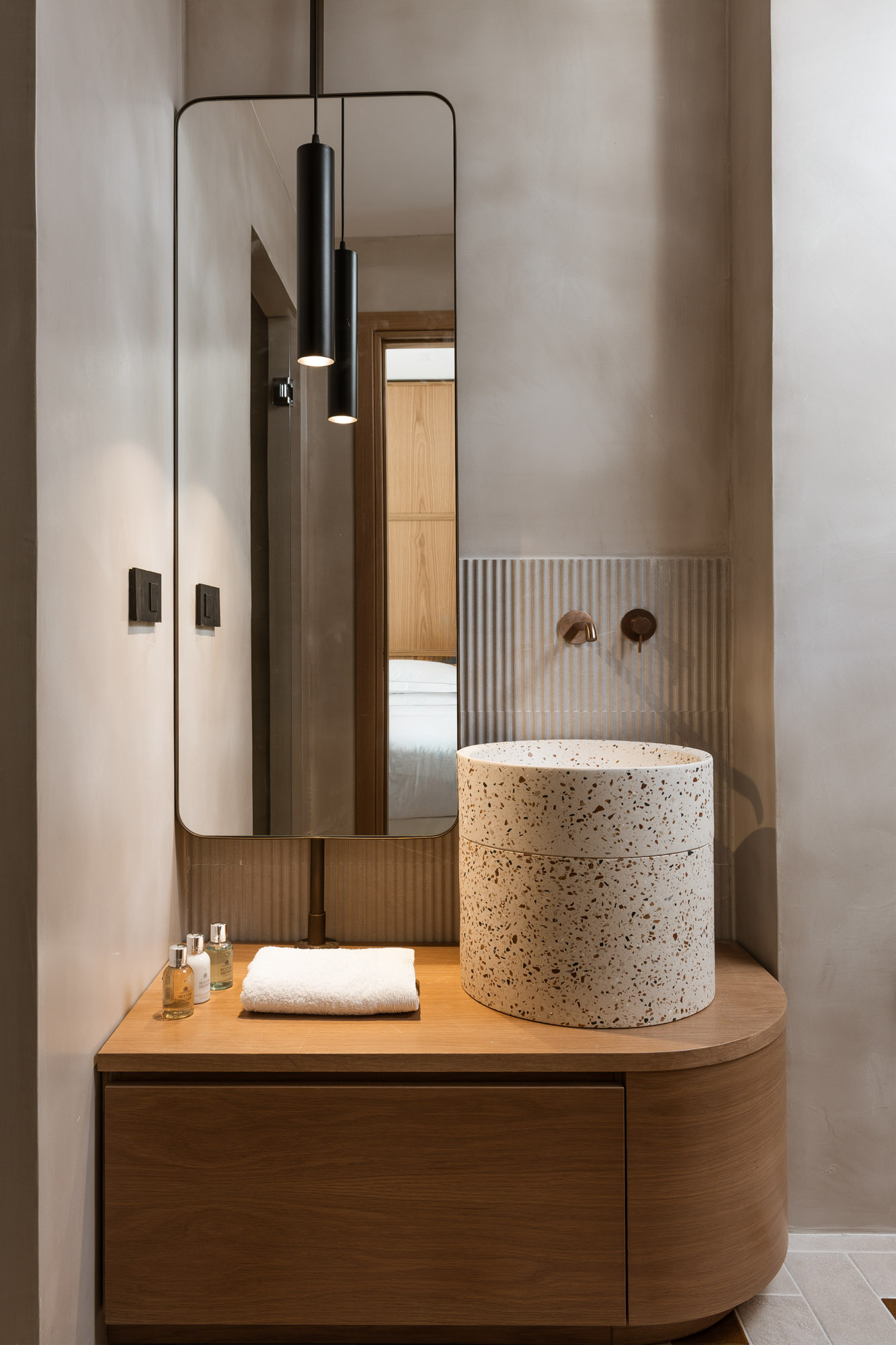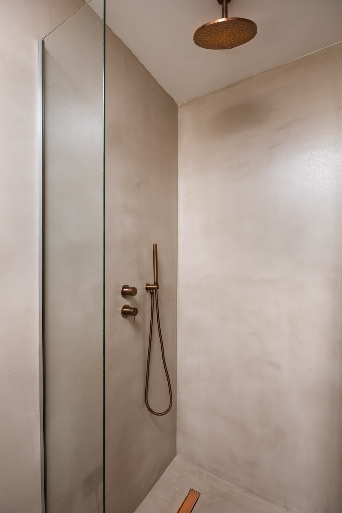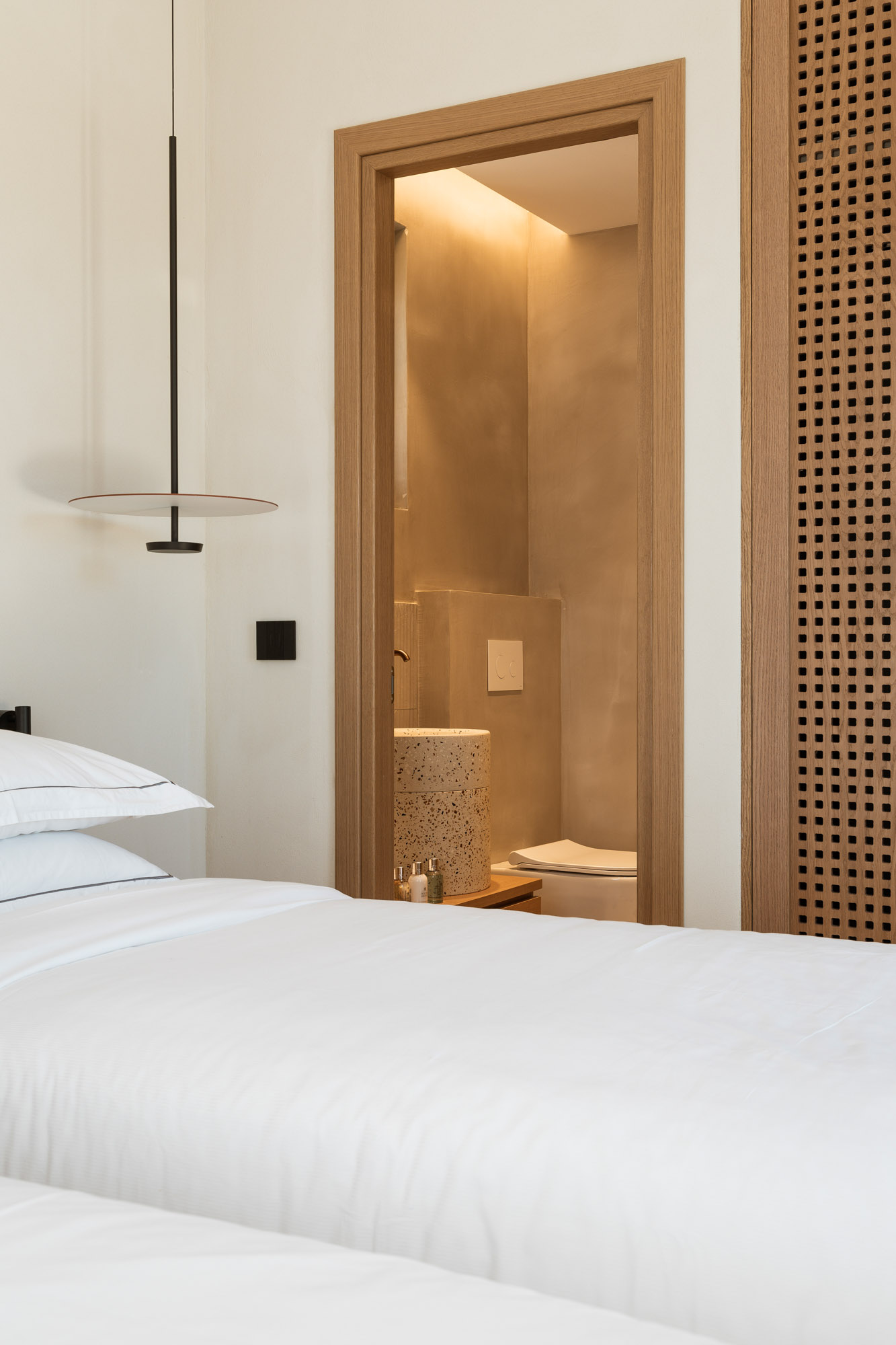 The open-plan kitchen/living room has large sets of sliding glass doors opening onto the terrace, with views to the Albanian mountains. The bedrooms are split across three floors in the main house. There's one additional bedroom with independent access, a kitchenette, and a living area in the guest house.