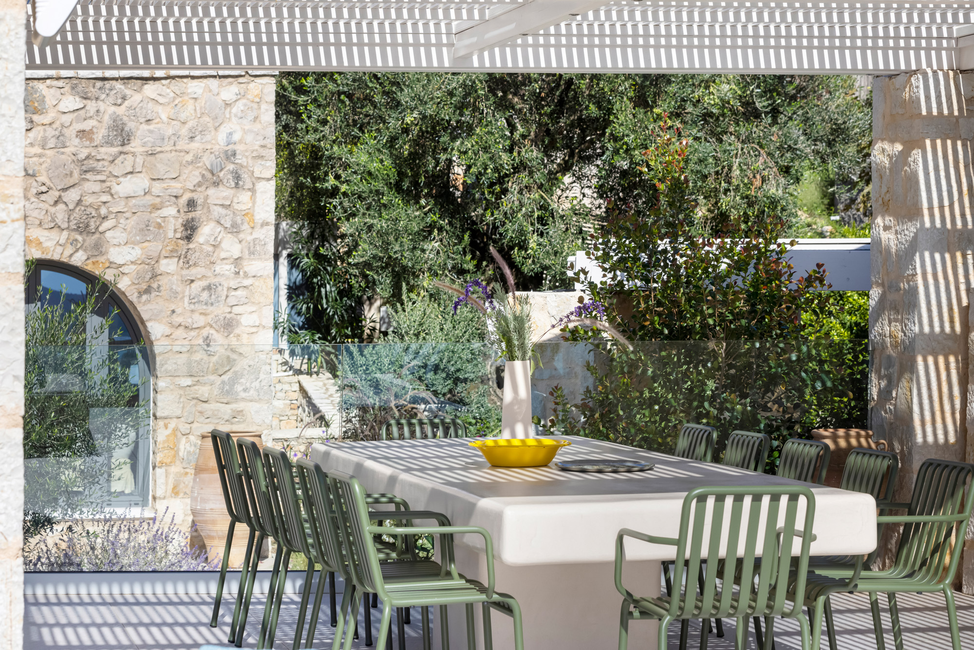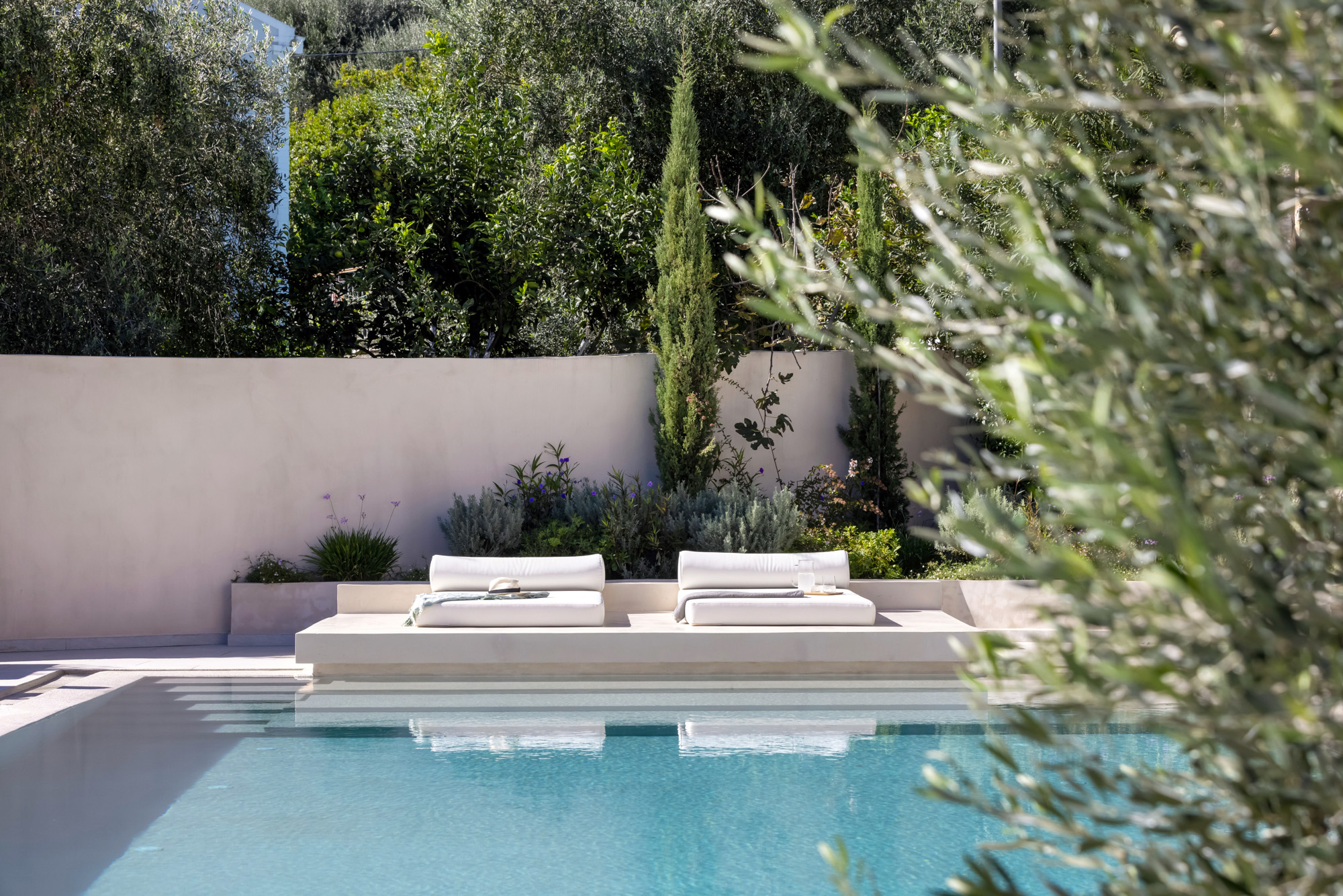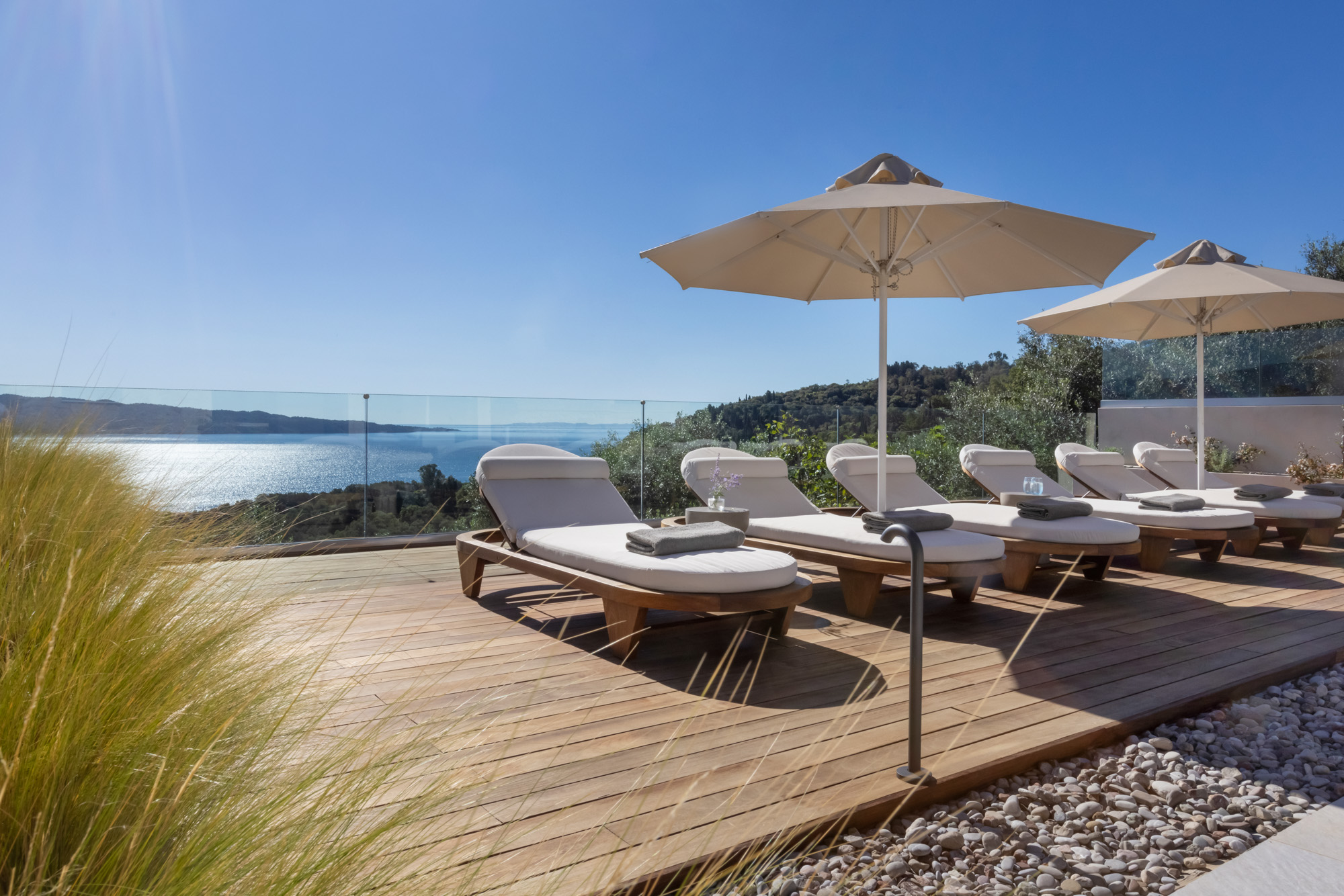 Across the spacious terraces are two separate outdoor shaded dining areas, a barbecue, plush contemporary sofas, both in the sun and shade, a sleek pool surrounded by cushioned sun beds, and decorative planters with Mediterranean flowers and shrubs. An organic vegetable garden in the grounds provides fresh produce for the chef to use.