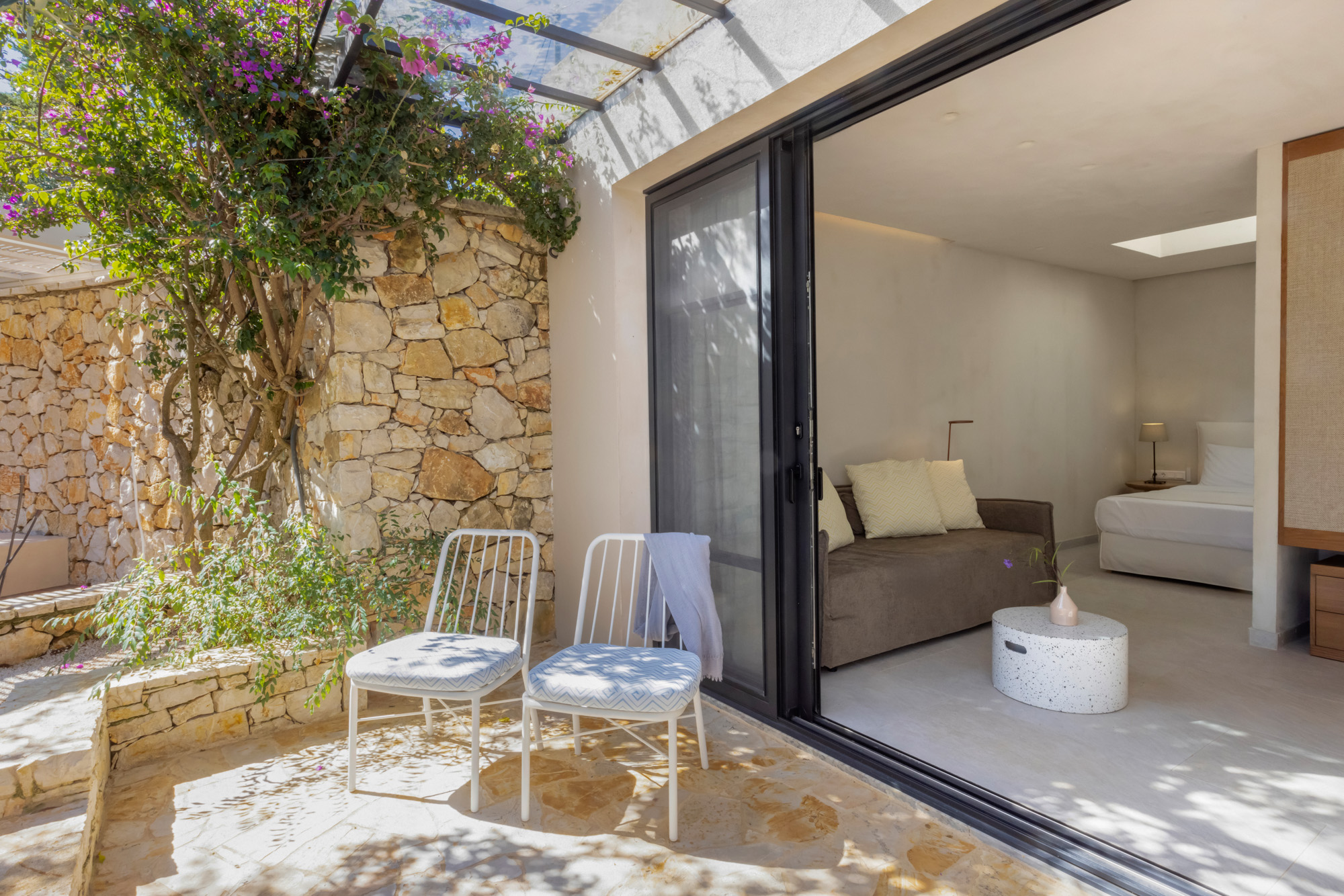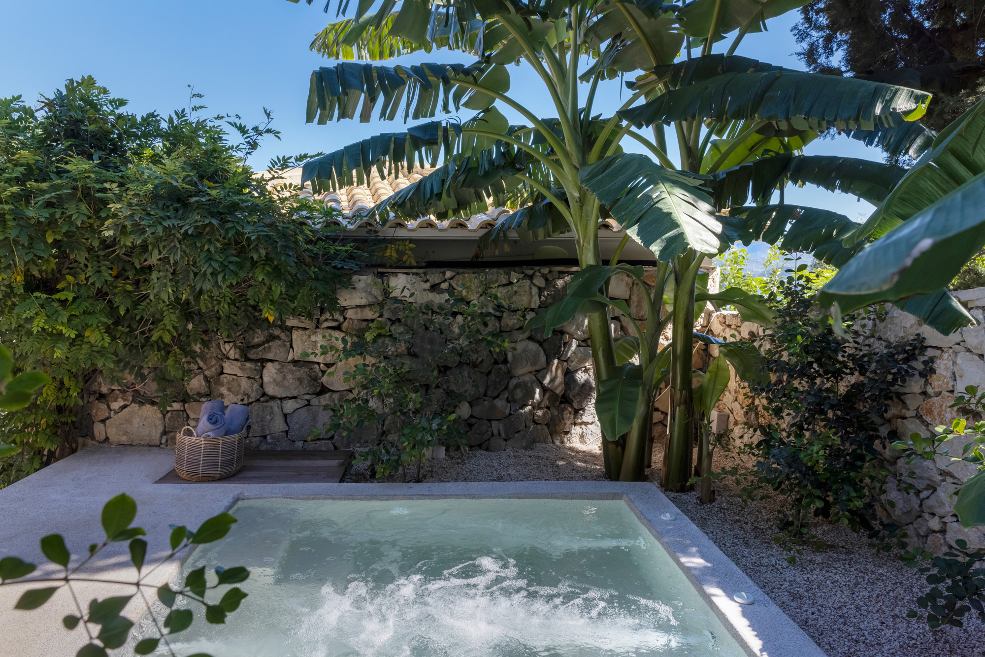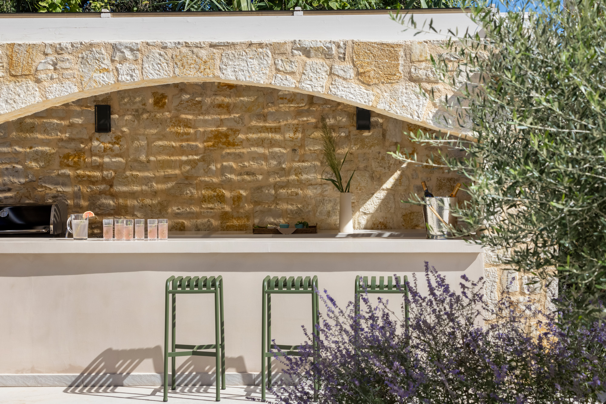 Across the spacious terraces are two separate outdoor shaded dining areas, a barbecue, plush contemporary sofas, both in the sun and shade, a sleek pool surrounded by cushioned sun beds, and decorative planters with Mediterranean flowers and shrubs. An organic vegetable garden in the grounds provides fresh produce for the chef to use.