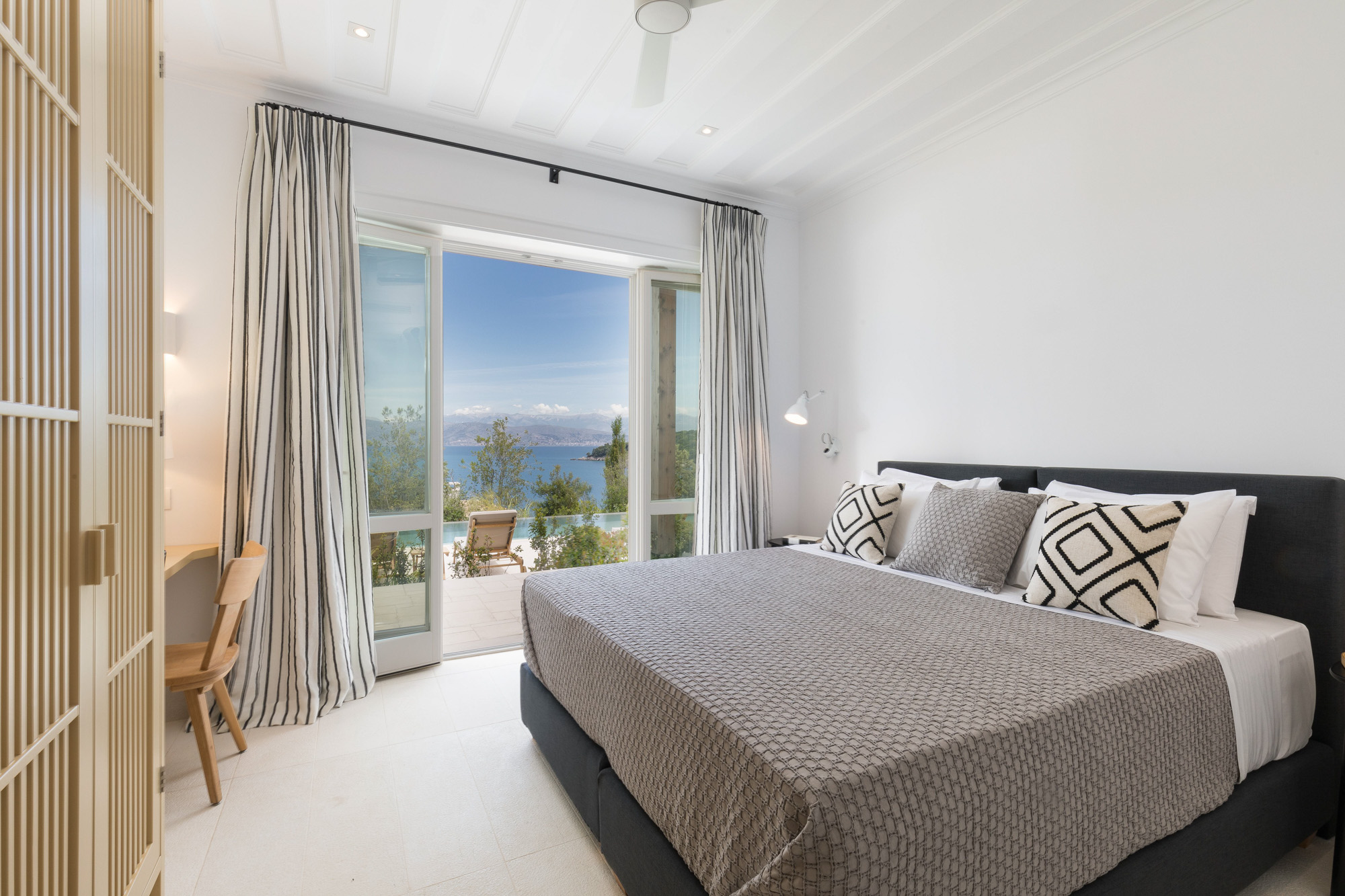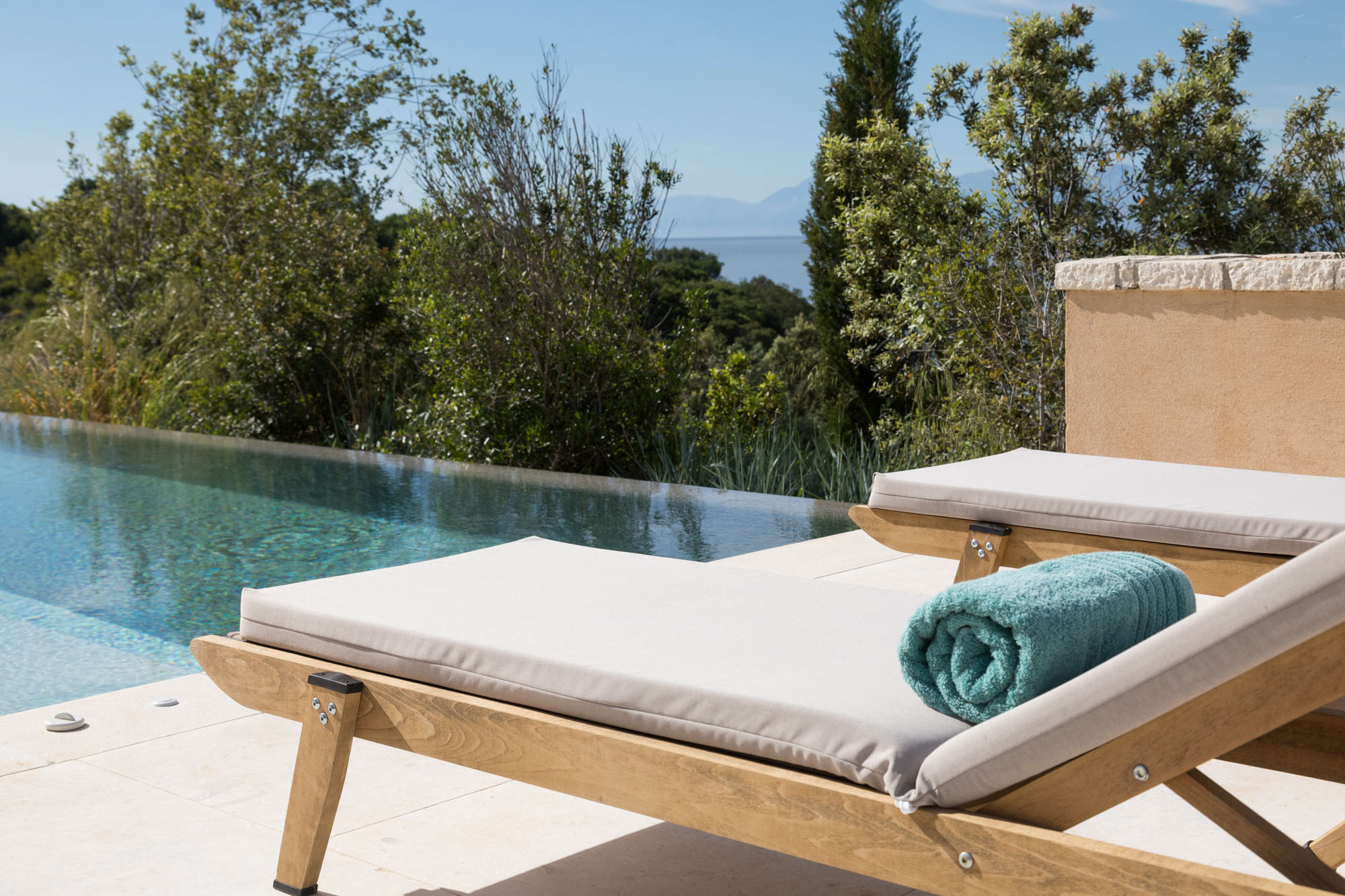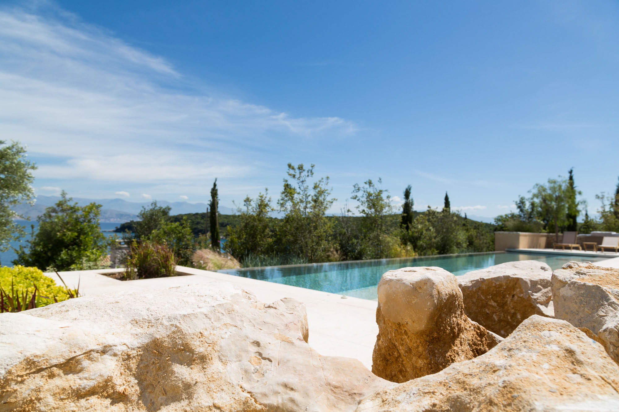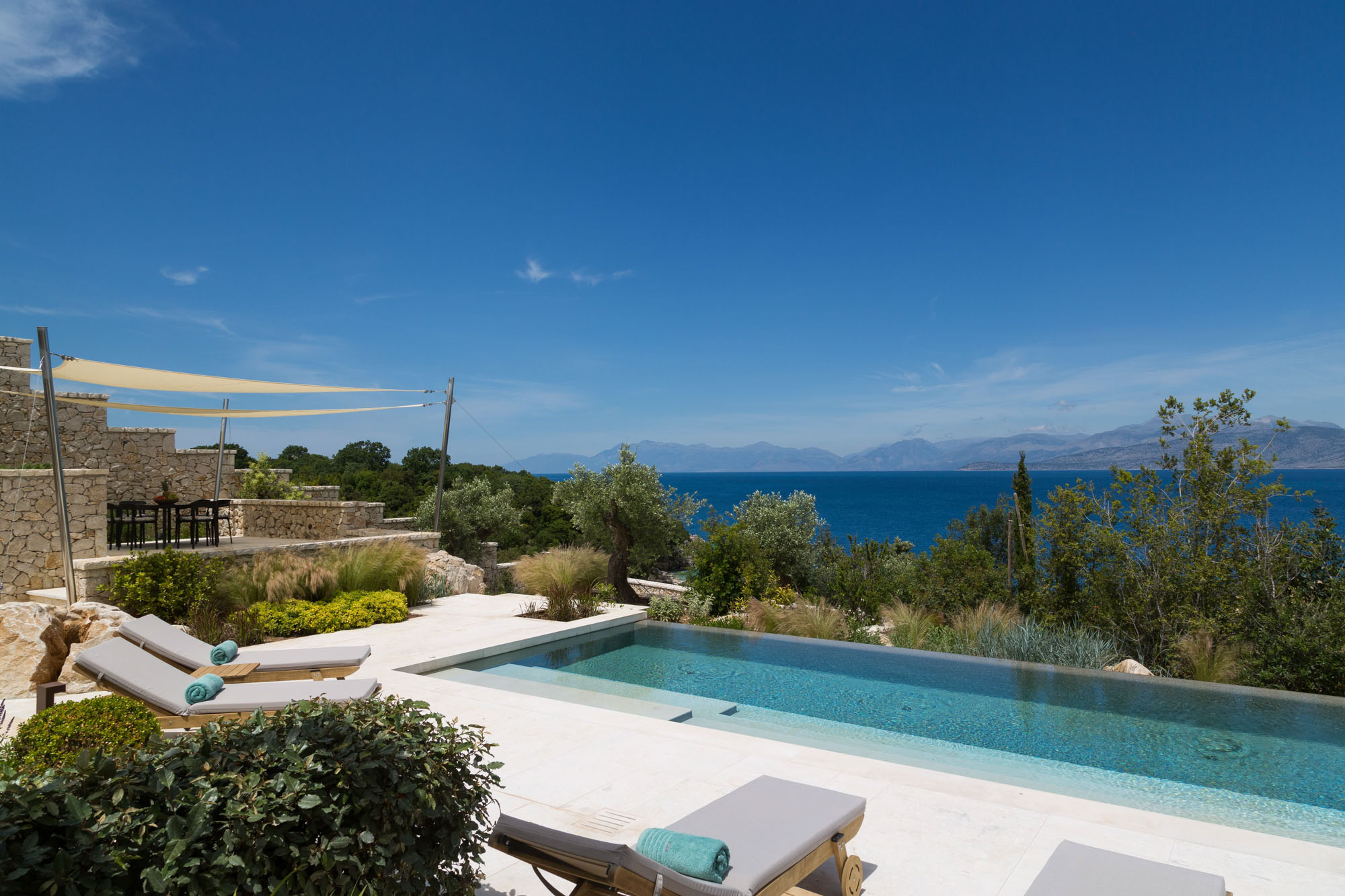 There are plenty of other places to relax and enjoy the views, both under awnings for shade or on sun loungers, around the 17-metre infinity swimming pool. There is table tennis on the upper terrace and a private boules court with views out to the Ionian Sea. The expertly designed gardens provide privacy while blending into the Corfiot landscape.