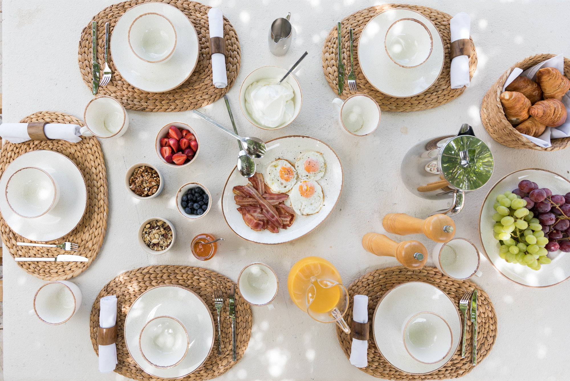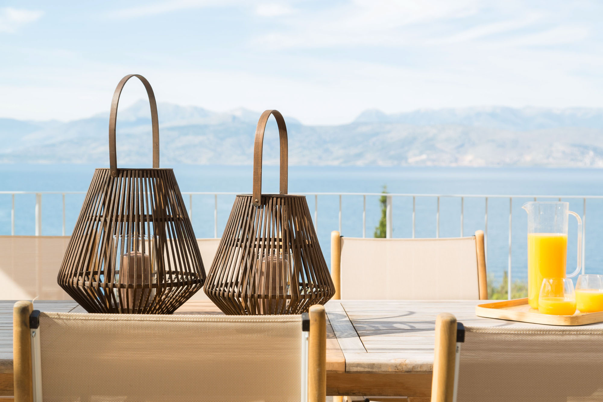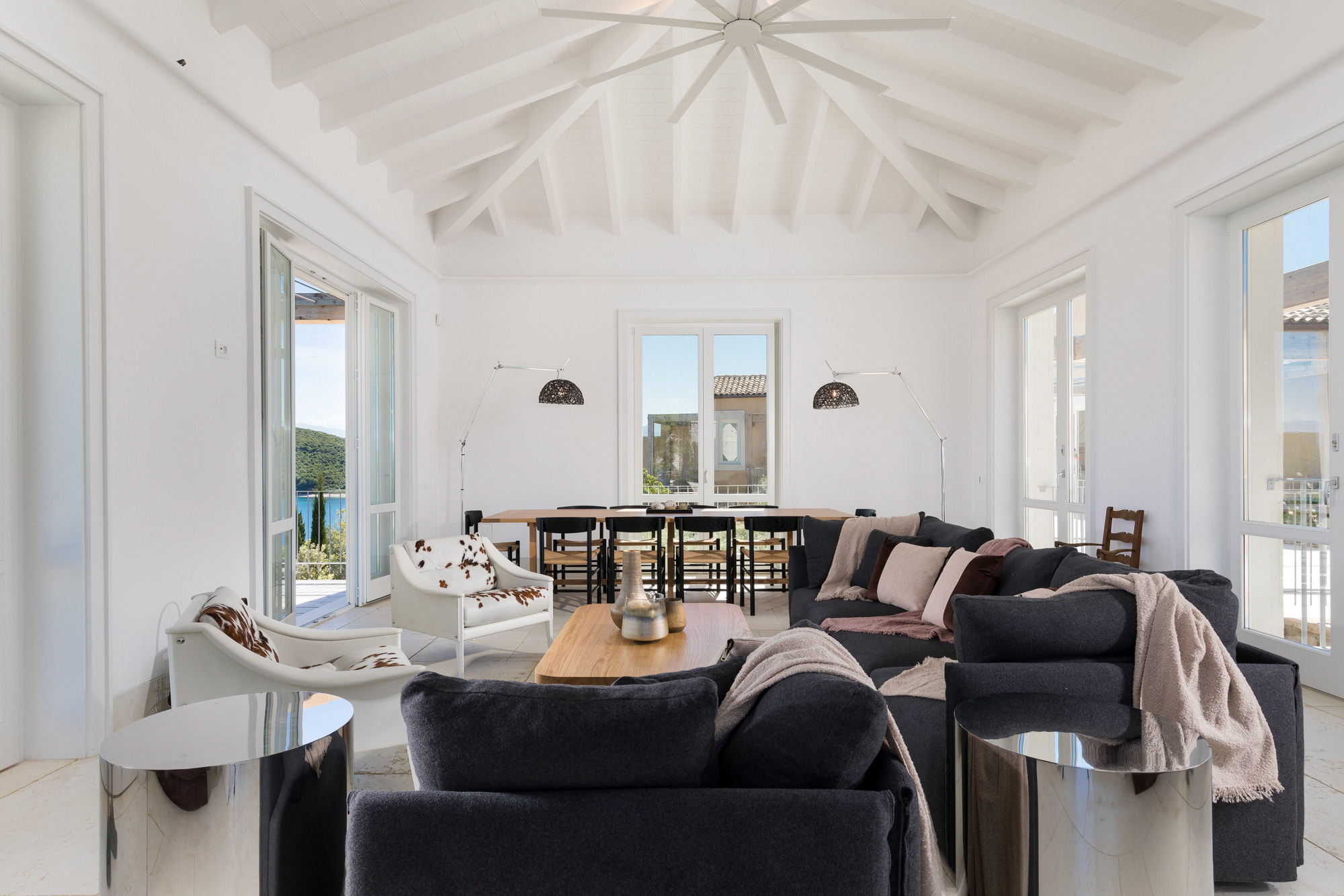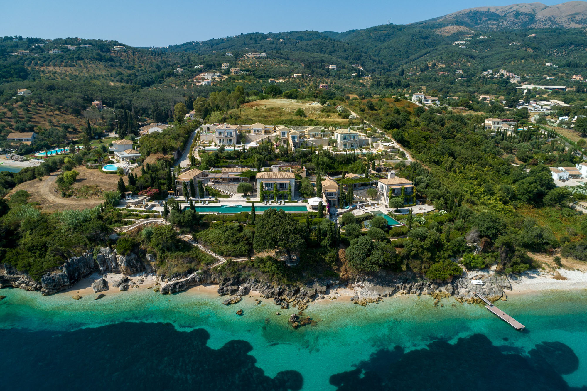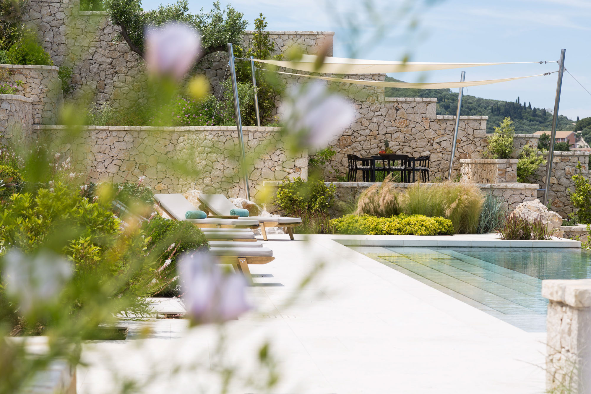 There are plenty of other places to relax and enjoy the views, both under awnings for shade or on sun loungers, around the 17-metre infinity swimming pool. There is table tennis on the upper terrace and a private boules court with views out to the Ionian Sea. The expertly designed gardens provide privacy while blending into the Corfiot landscape.