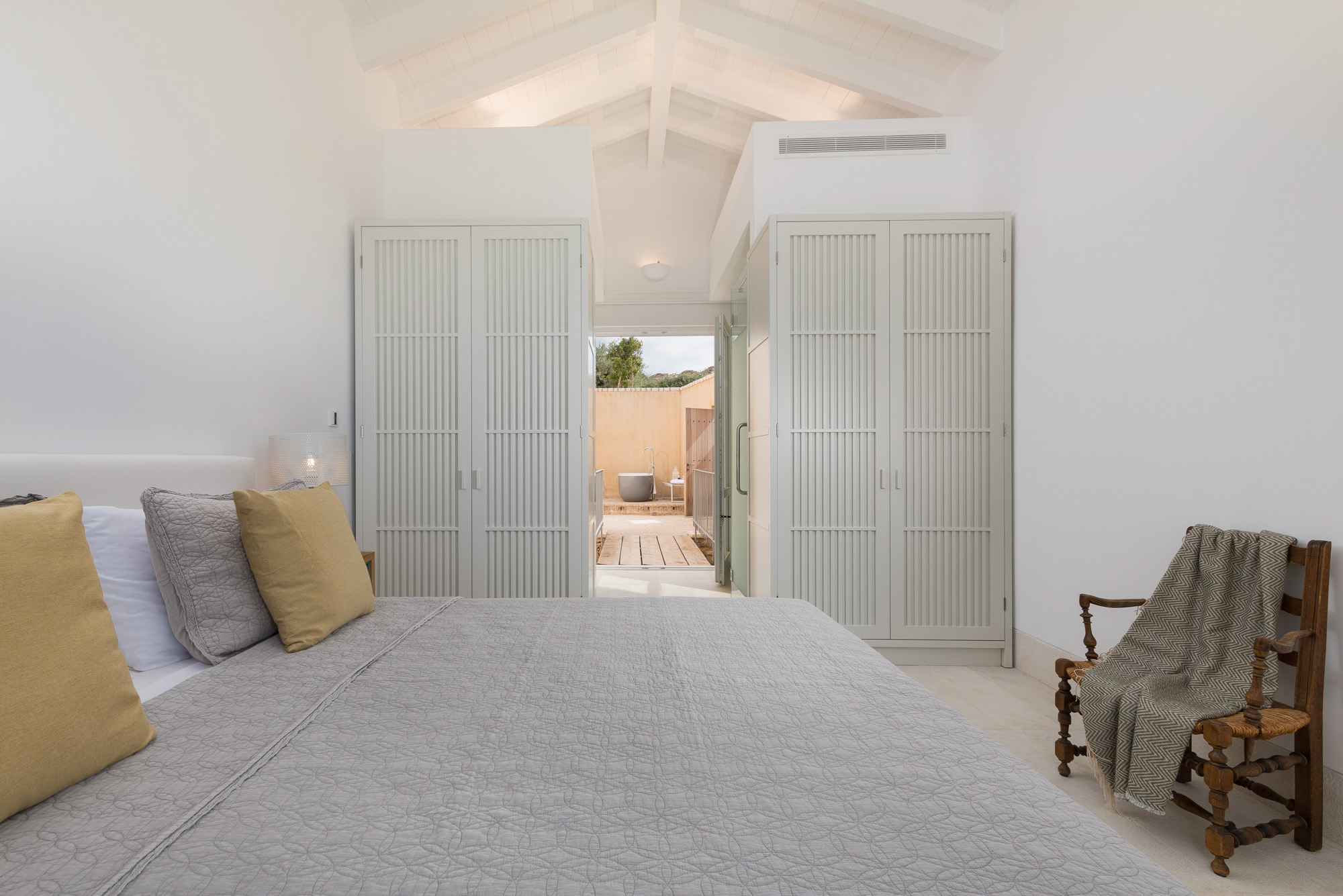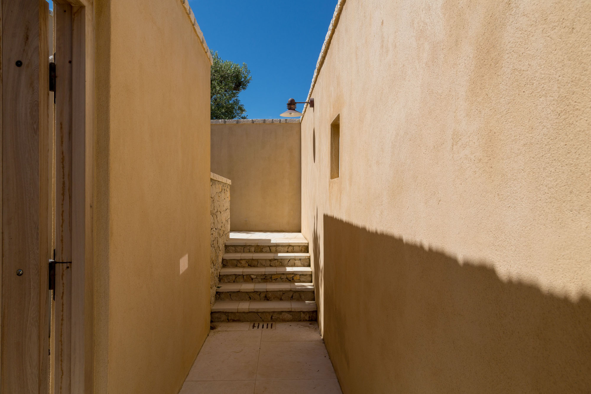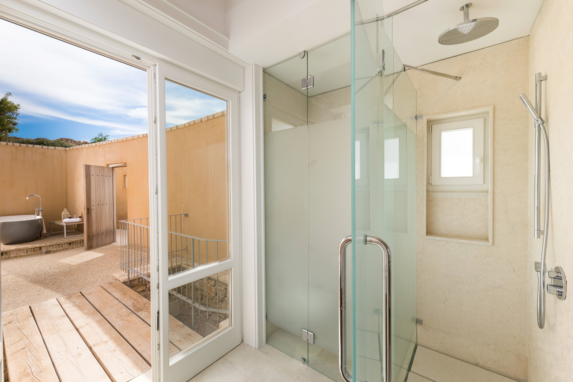 The latter is accessed via the TV room on the pool terrace and is great for teenagers or children. It could also work well with bedroom four across the courtyard as a family suite. Each bedroom (other than the bunk room) stands alone, with a separate entrance giving more privacy. The communal living/dining room on the upper floor has high ceilings, a dining table for 14, and doors onto a sea-facing balcony with seating and shade. An external spiral staircase leads down to the pool terrace, giving access to two bedrooms, a fully equipped gym, and a separate massage/treatment room.