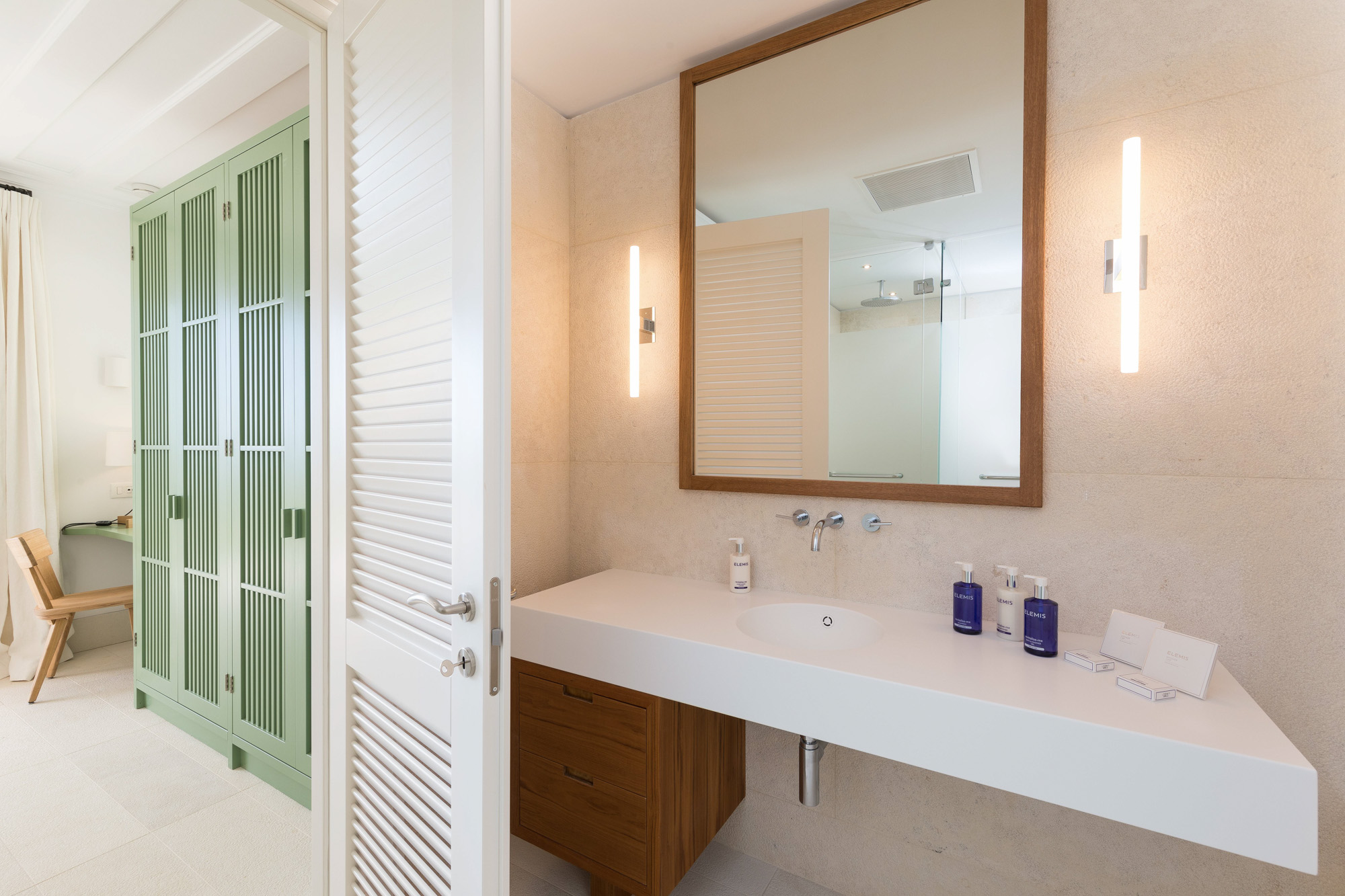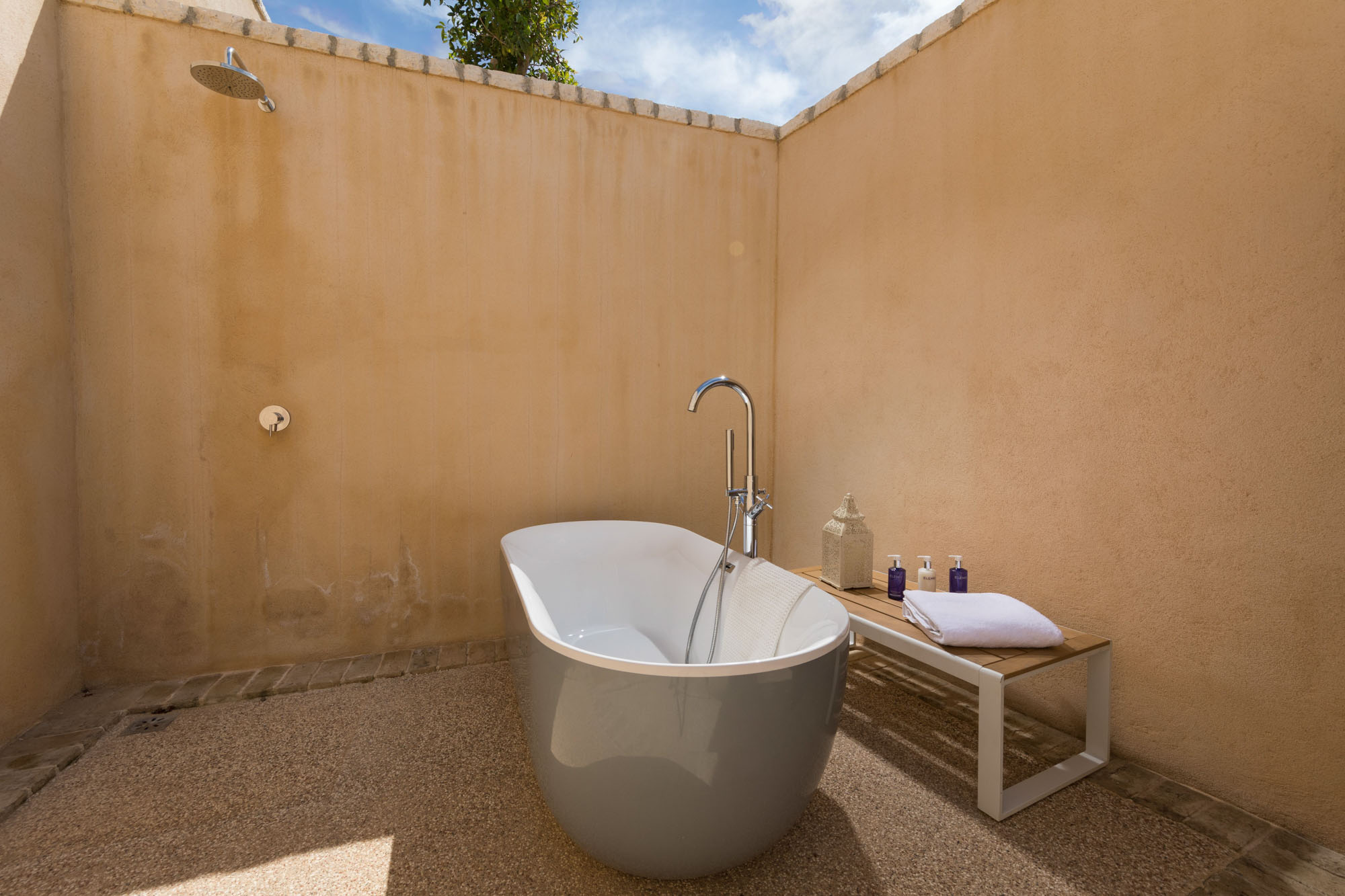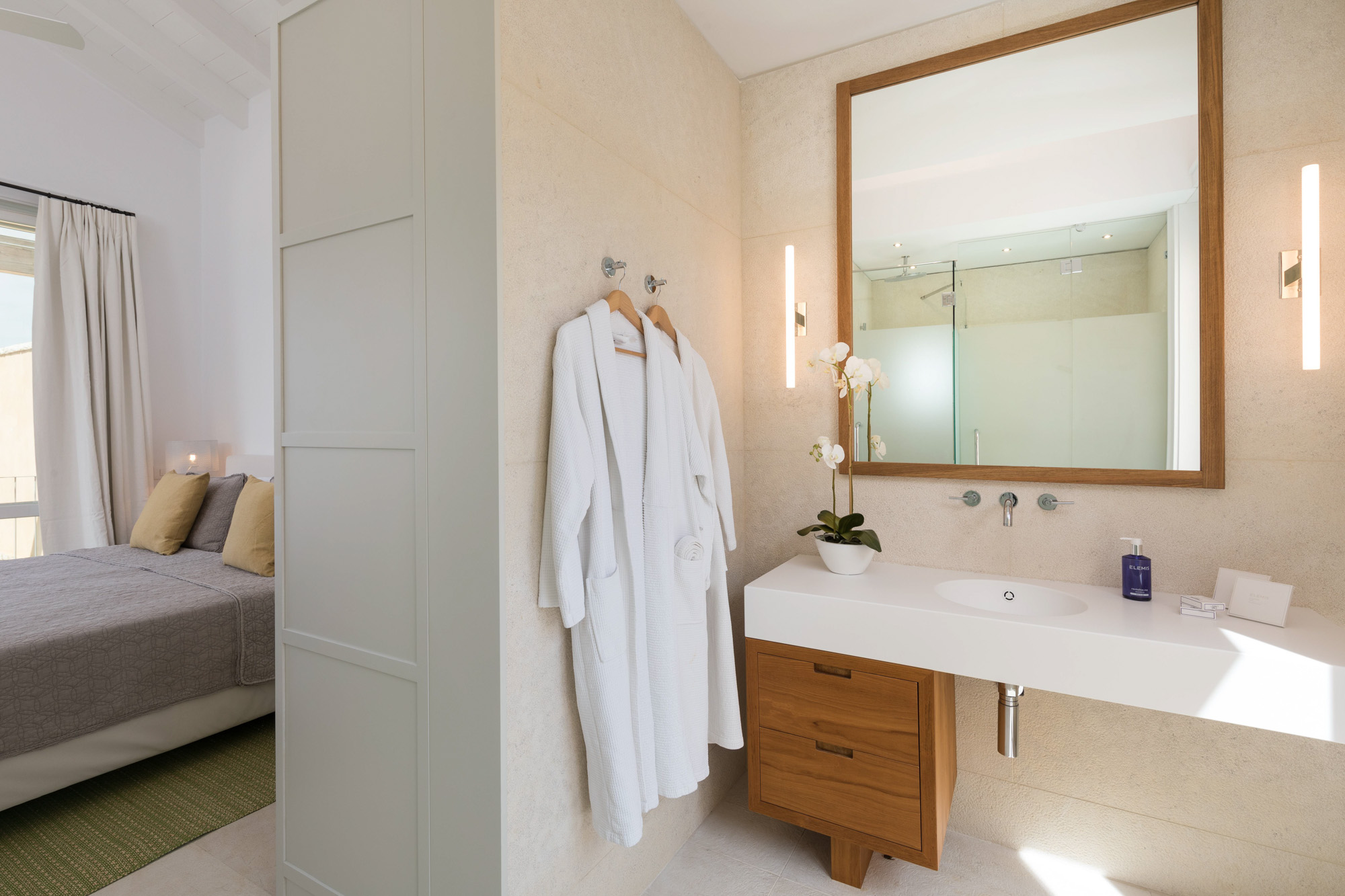 The latter is accessed via the TV room on the pool terrace and is great for teenagers or children. It could also work well with bedroom four across the courtyard as a family suite. Each bedroom (other than the bunk room) stands alone, with a separate entrance giving more privacy. The communal living/dining room on the upper floor has high ceilings, a dining table for 14, and doors onto a sea-facing balcony with seating and shade. An external spiral staircase leads down to the pool terrace, giving access to two bedrooms, a fully equipped gym, and a separate massage/treatment room.