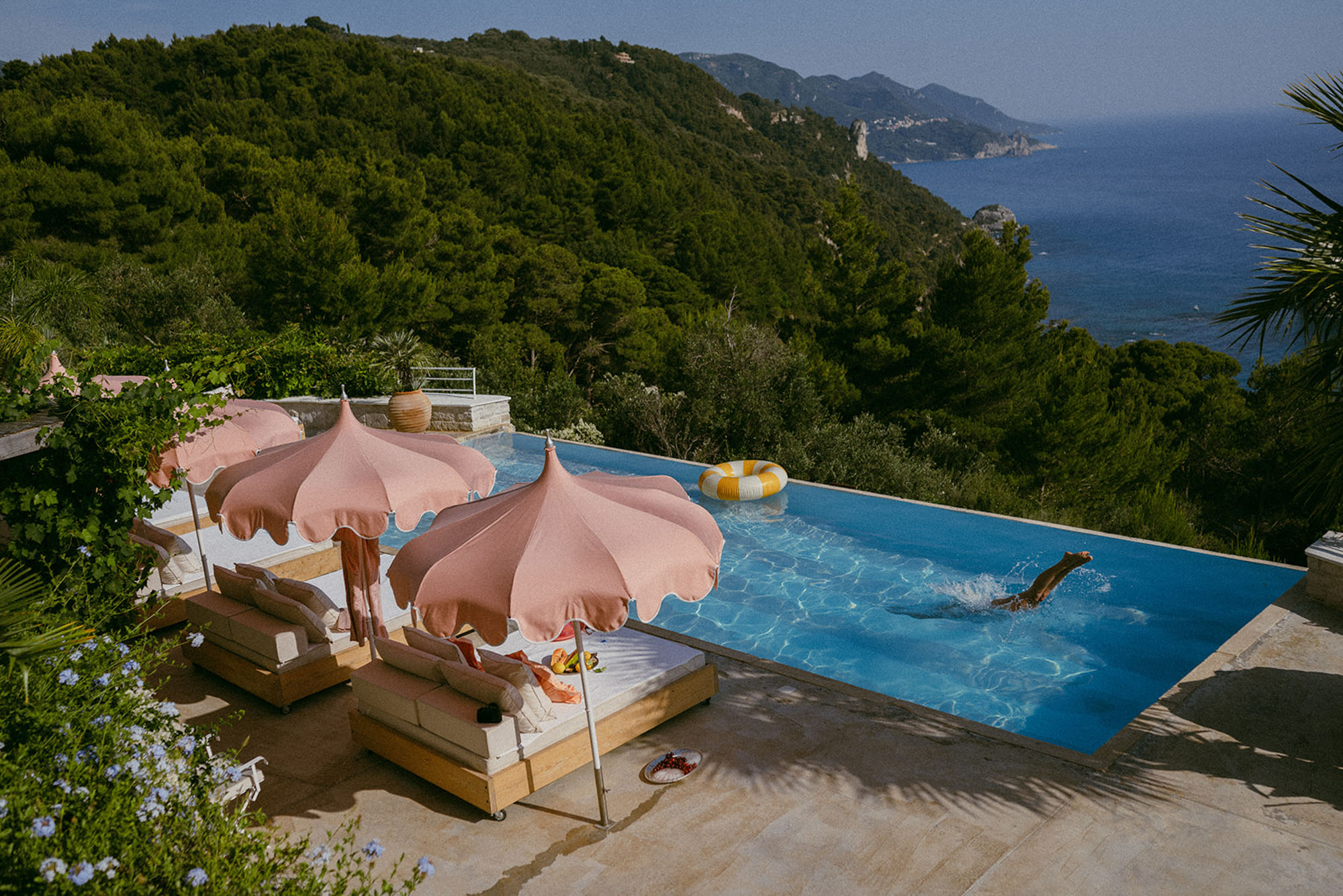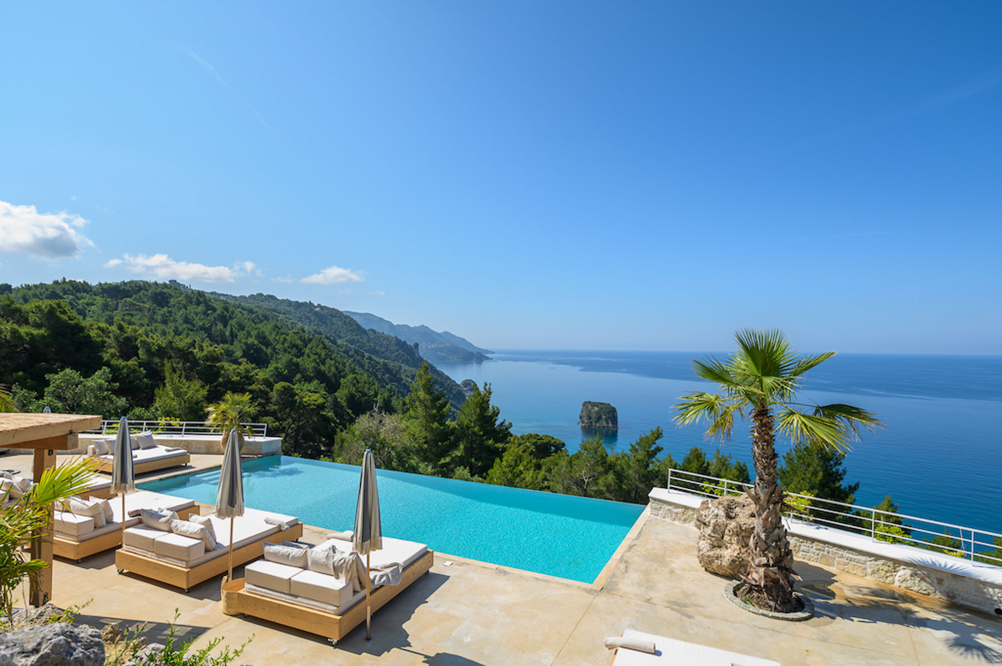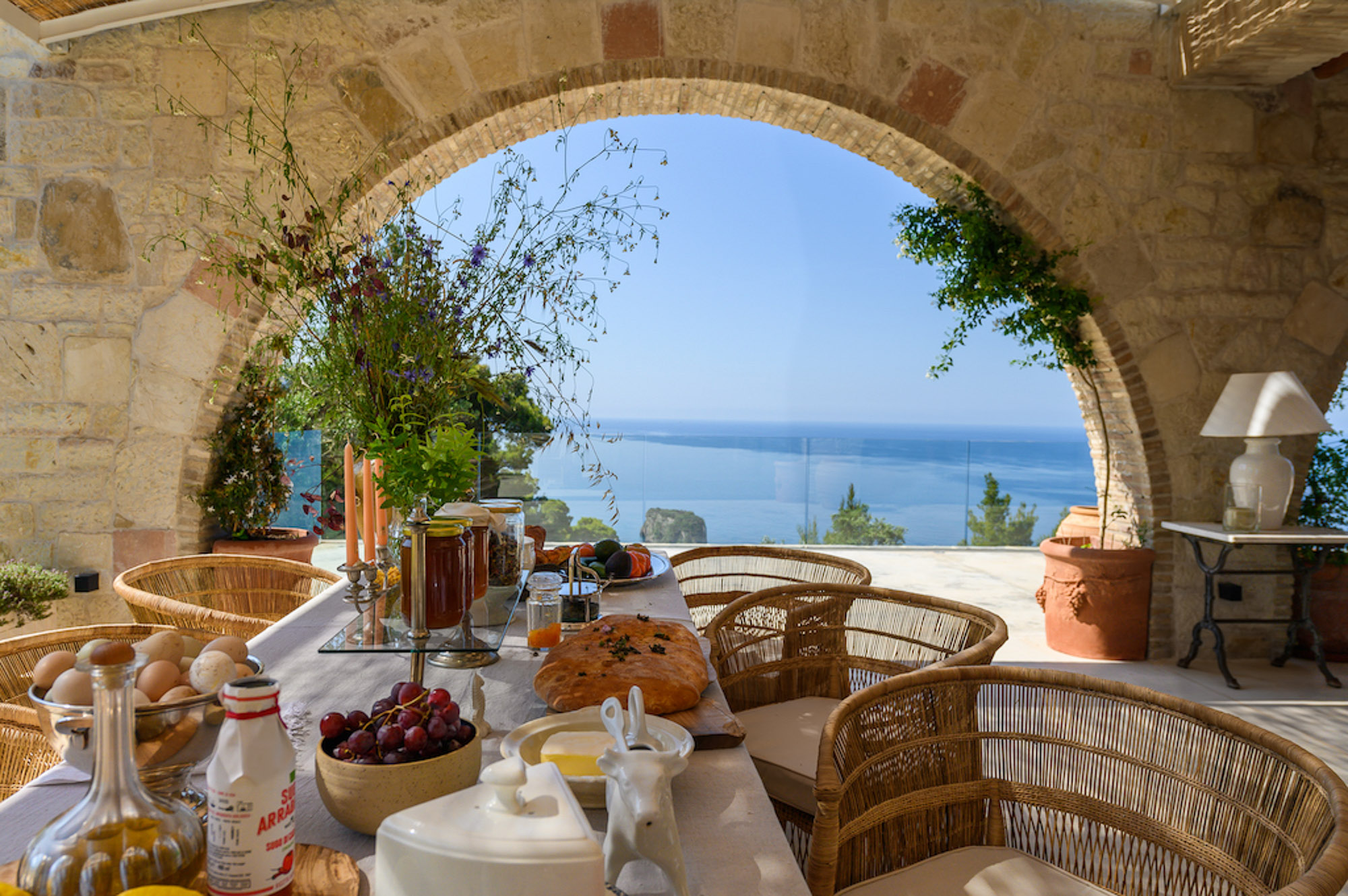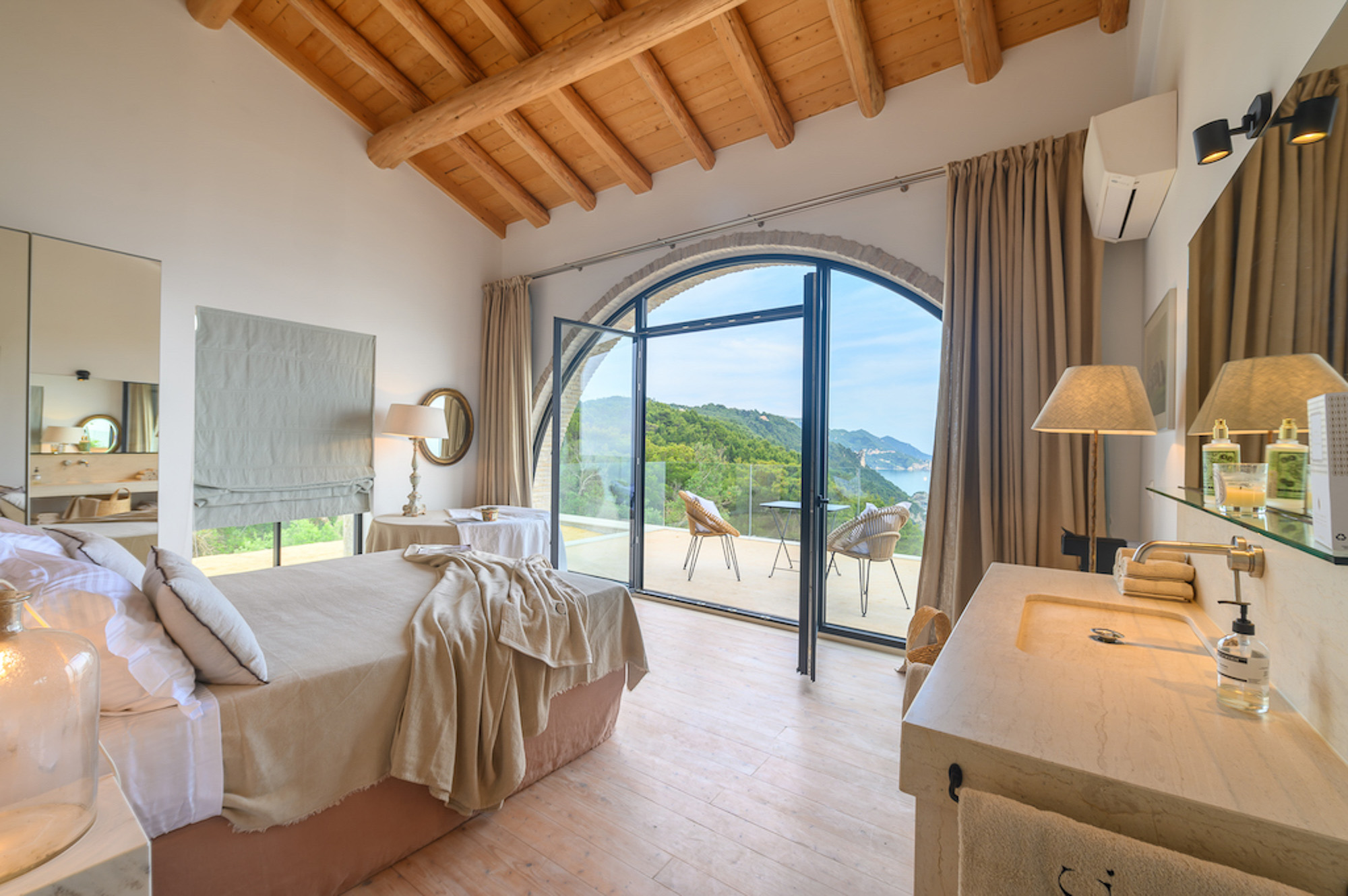 Villa Yaliskari is set within an 8-acre olive grove surrounded by green wilderness. The estate offers magical views of the sea, mountains, and the little island of Kyriadiki. The closest beach is a short walk away, and its event area makes it one of the best venues for weddings or other special celebrations in Corfu.
