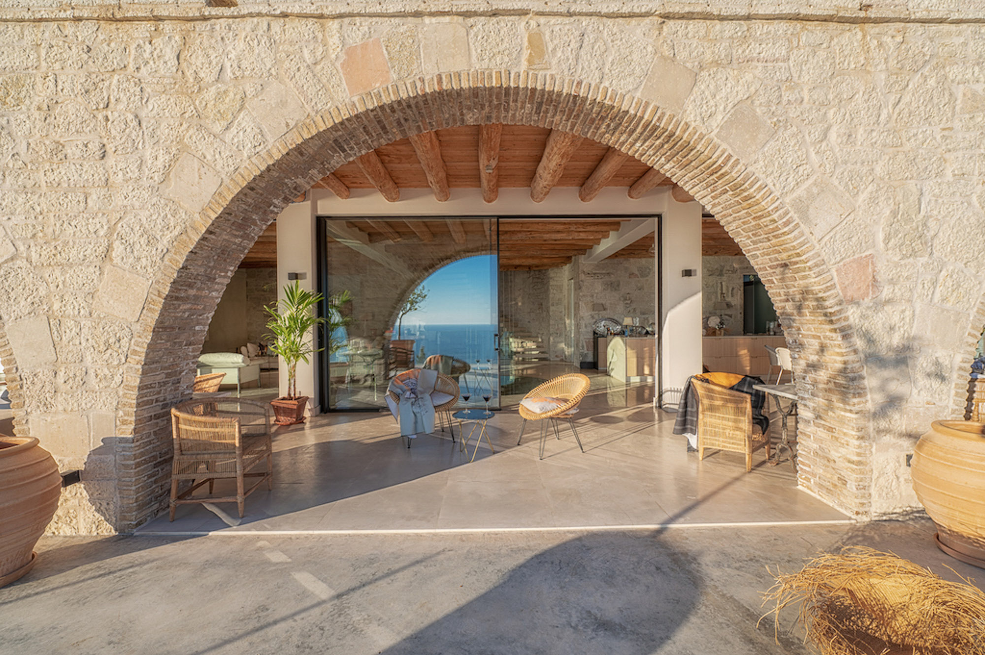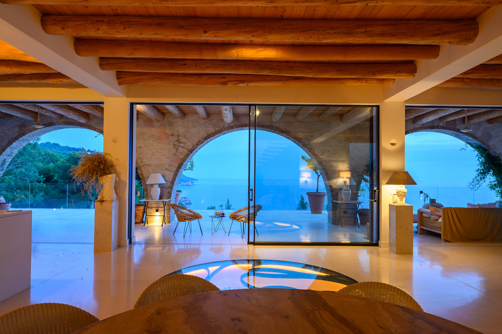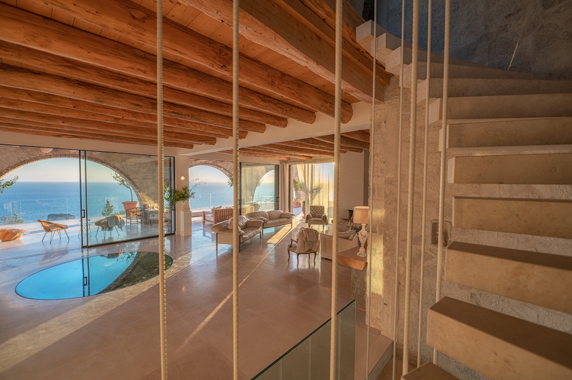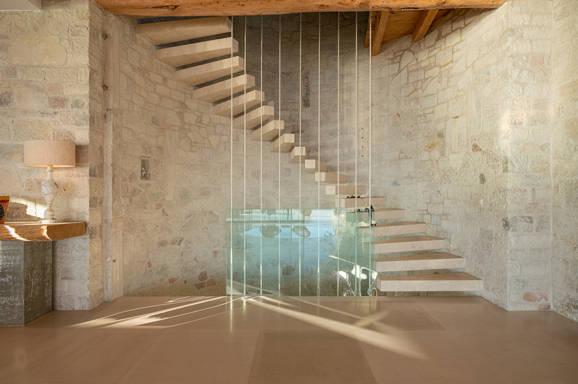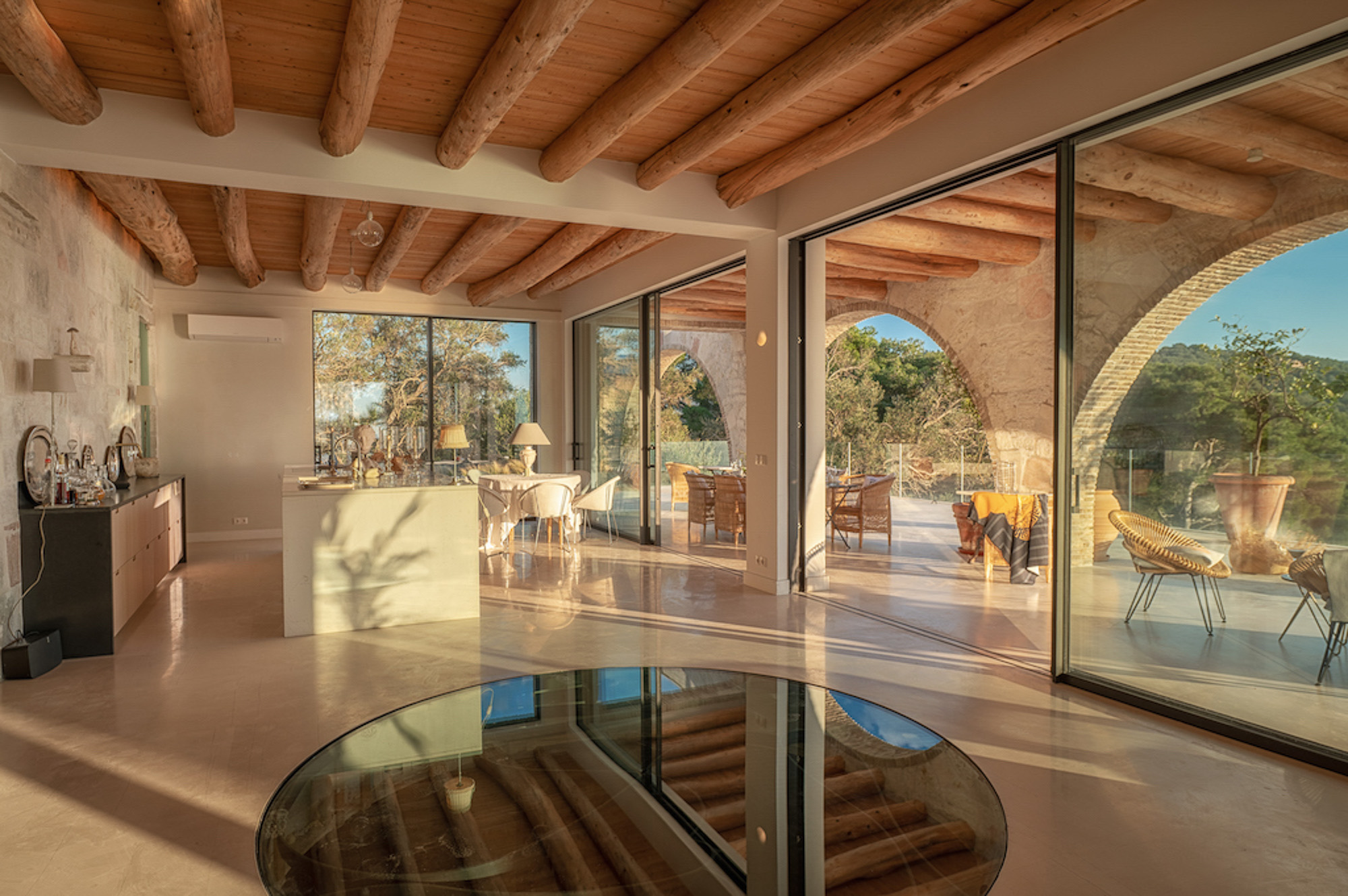 The house is largely built of classic materials that have been restored, imbuing the modern design with a sense of history. Ancient stones and traditional bricks contrast with the wall of glass. Cypress wood, used for beamed ceilings and upper floors, fills the house with its subtle perfume. The property features a private home cinema, jacuzzi, and sauna. Down below, a glass section of flooring in the living room highlights the circular wine bar beneath. The villa offers four bedrooms on the first floor and two on the lower floor.