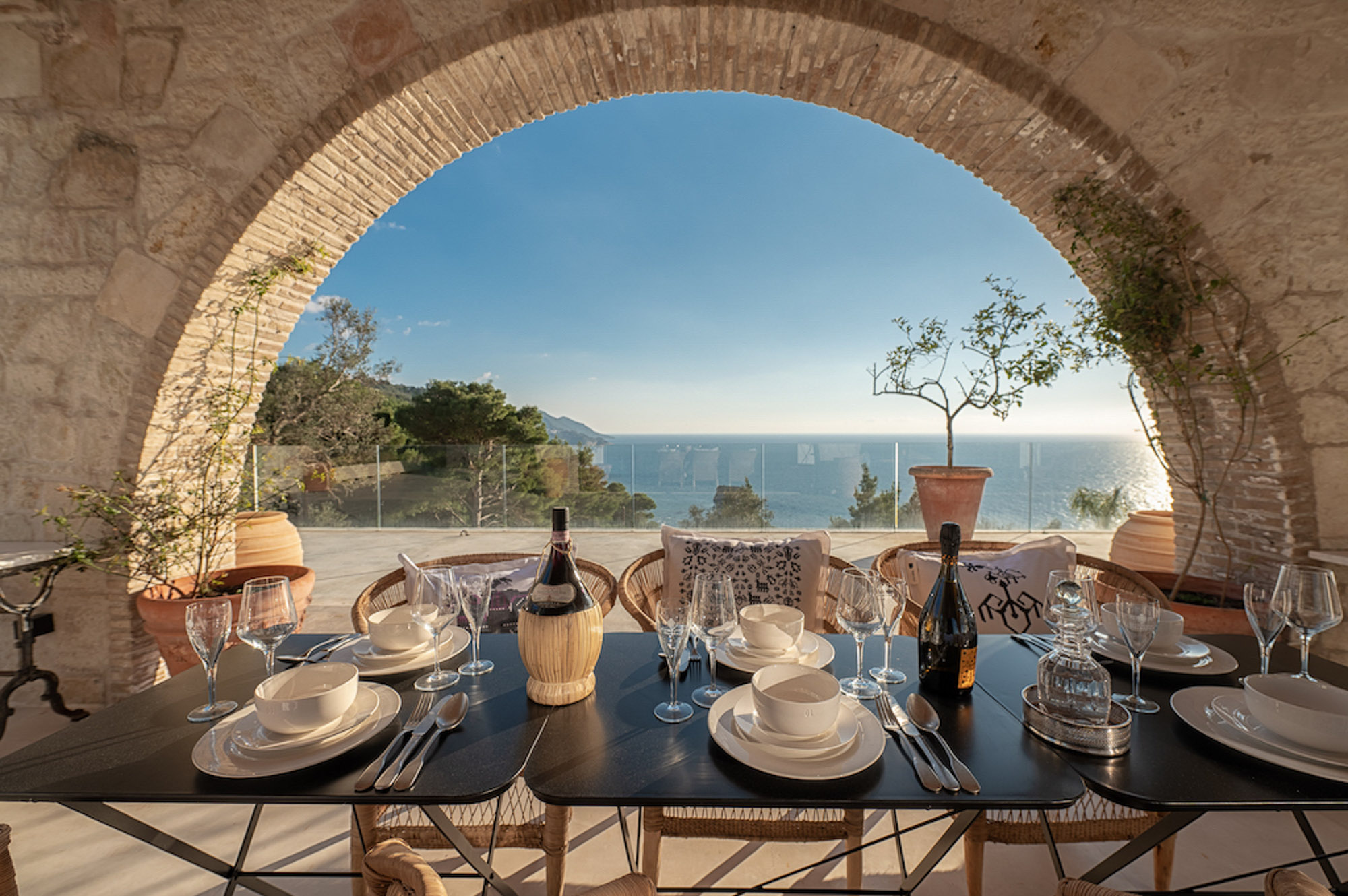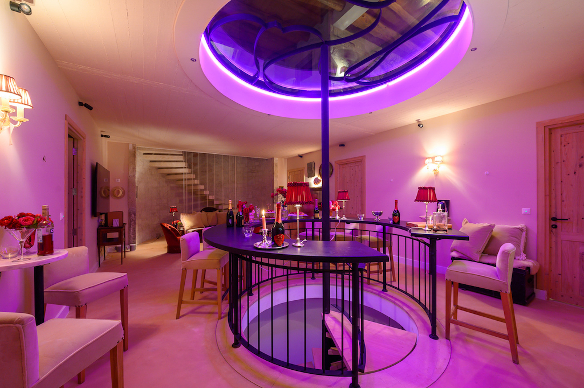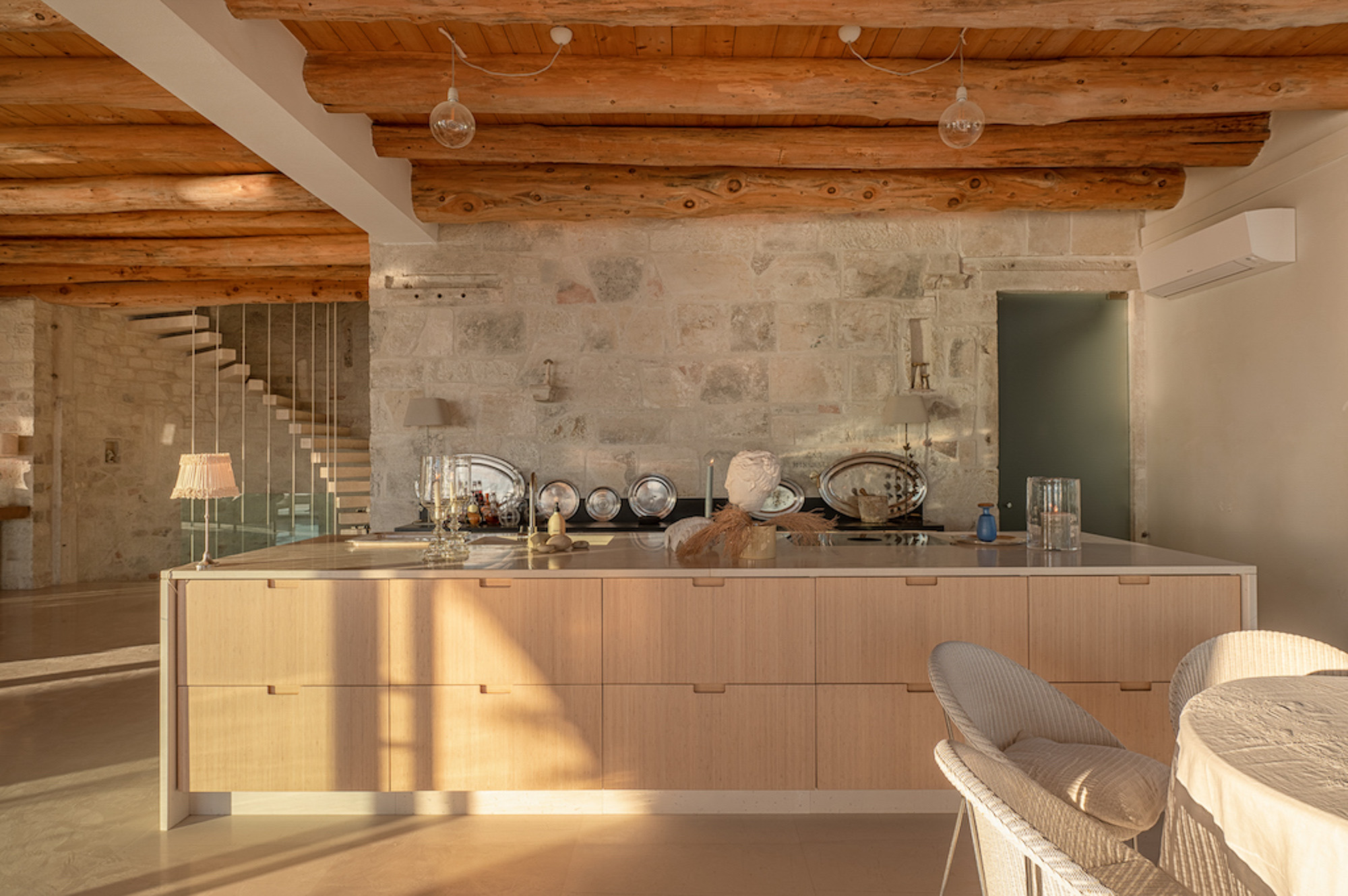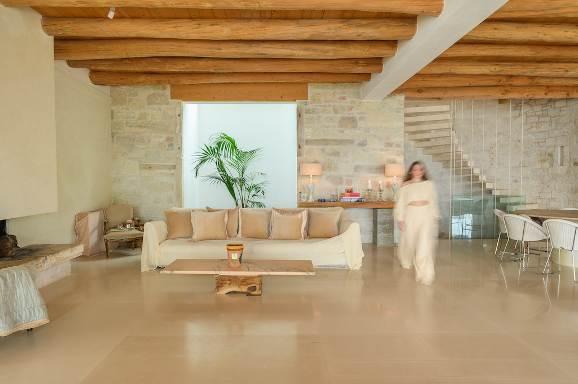 The house is largely built of classic materials that have been restored, imbuing the modern design with a sense of history. Ancient stones and traditional bricks contrast with the wall of glass. Cypress wood, used for beamed ceilings and upper floors, fills the house with its subtle perfume. The property features a private home cinema, jacuzzi, and sauna. Down below, a glass section of flooring in the living room highlights the circular wine bar beneath. The villa offers four bedrooms on the first floor and two on the lower floor.