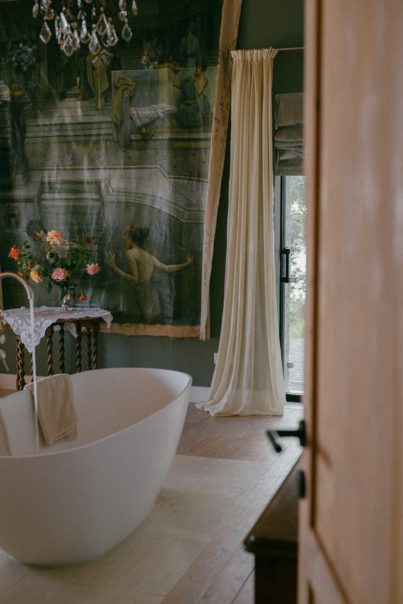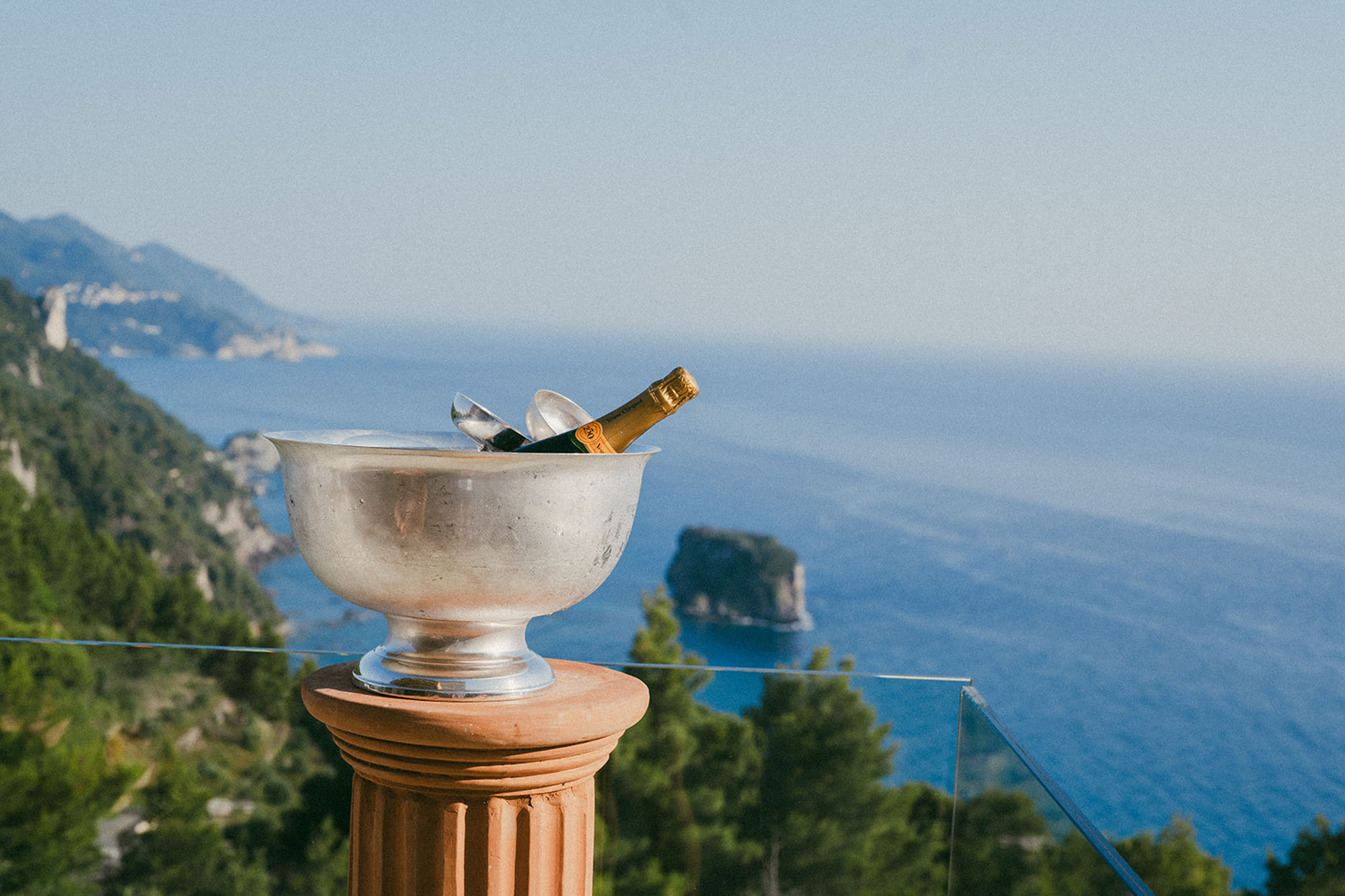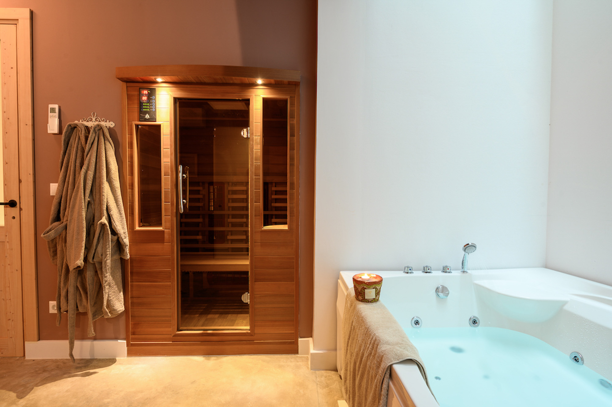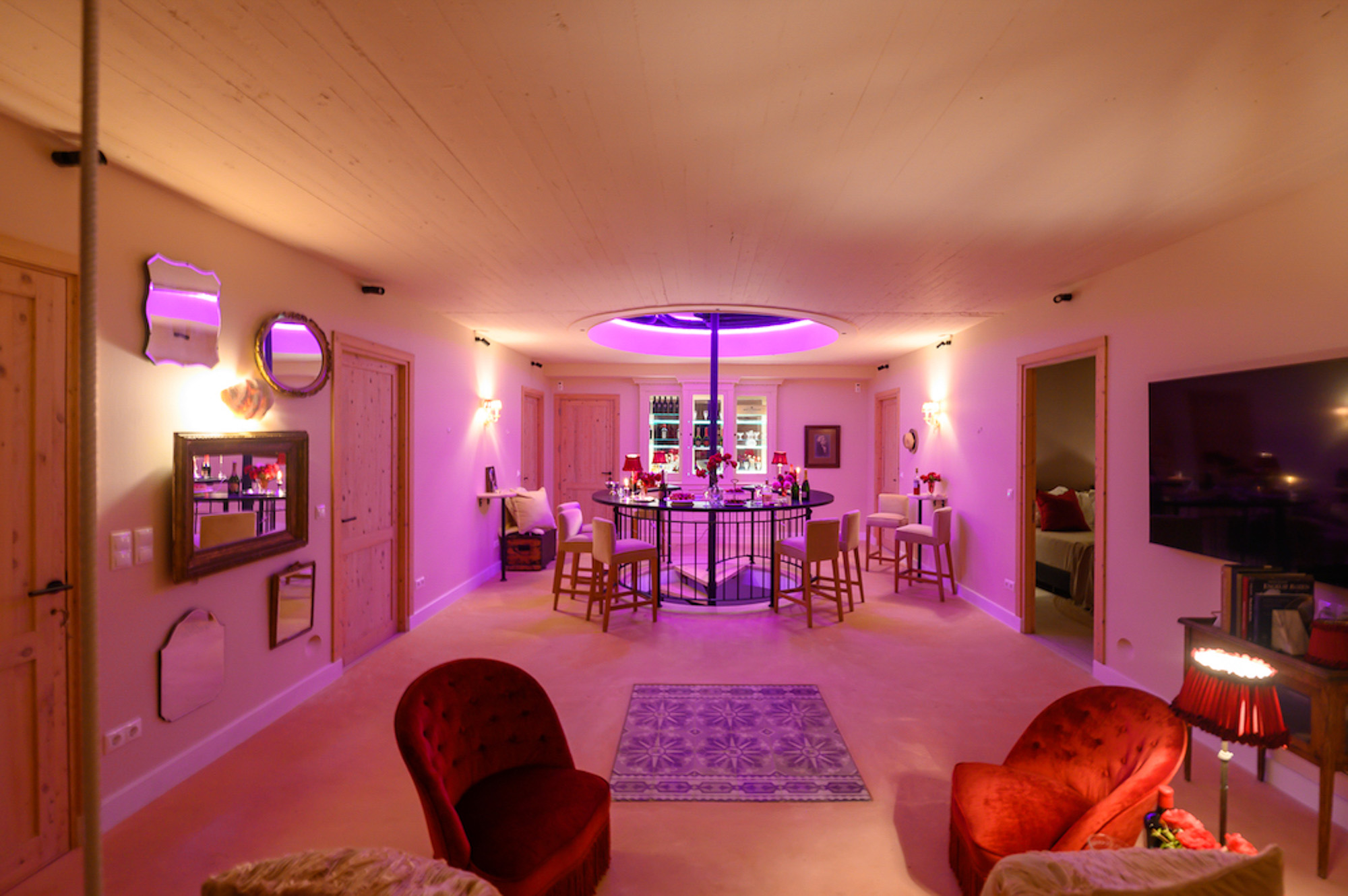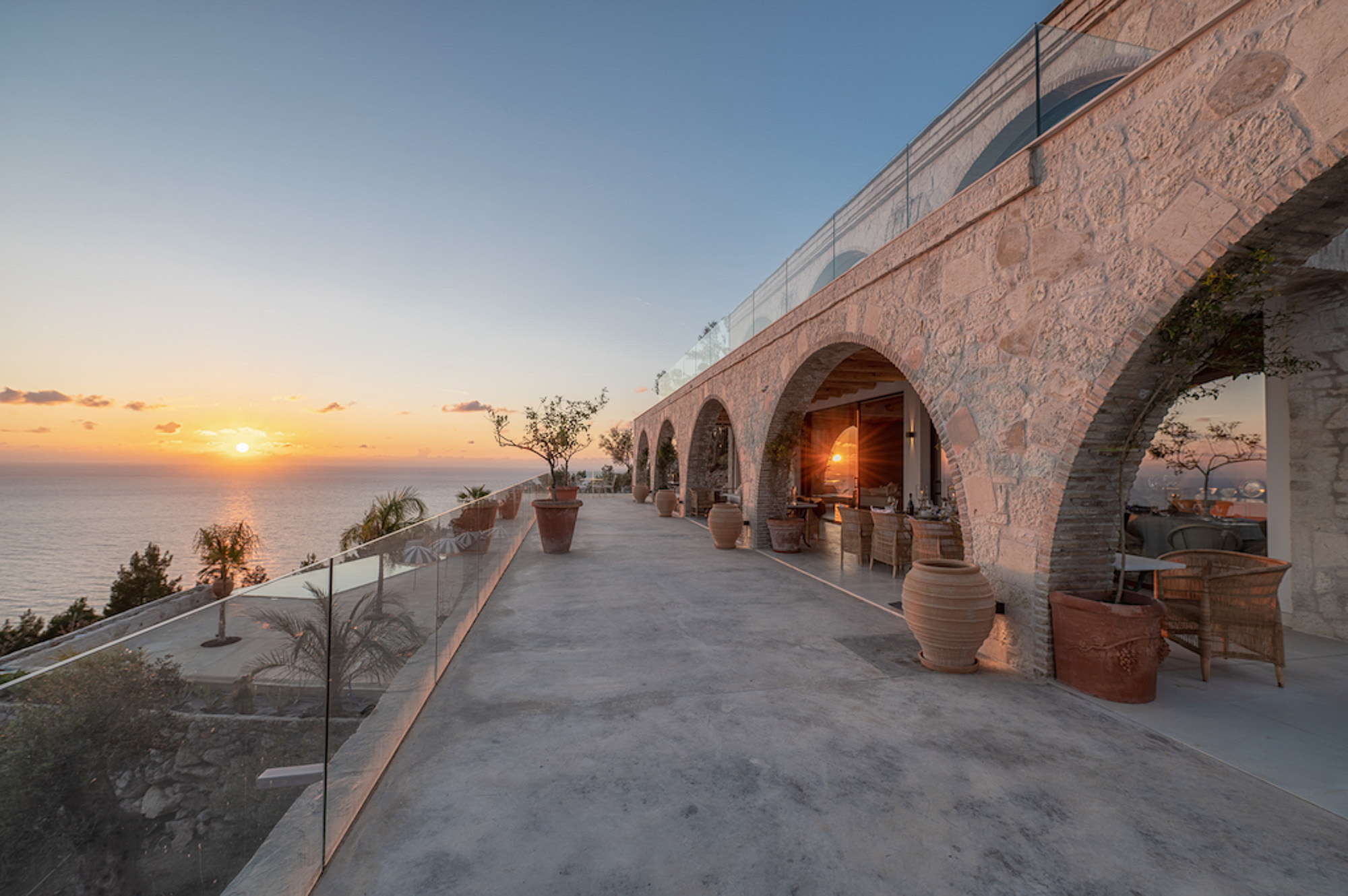 The house is largely built of classic materials that have been restored, imbuing the modern design with a sense of history. Ancient stones and traditional bricks contrast with the wall of glass. Cypress wood, used for beamed ceilings and upper floors, fills the house with its subtle perfume. The property features a private home cinema, jacuzzi, and sauna. Down below, a glass section of flooring in the living room highlights the circular wine bar beneath. The villa offers four bedrooms on the first floor and two on the lower floor.