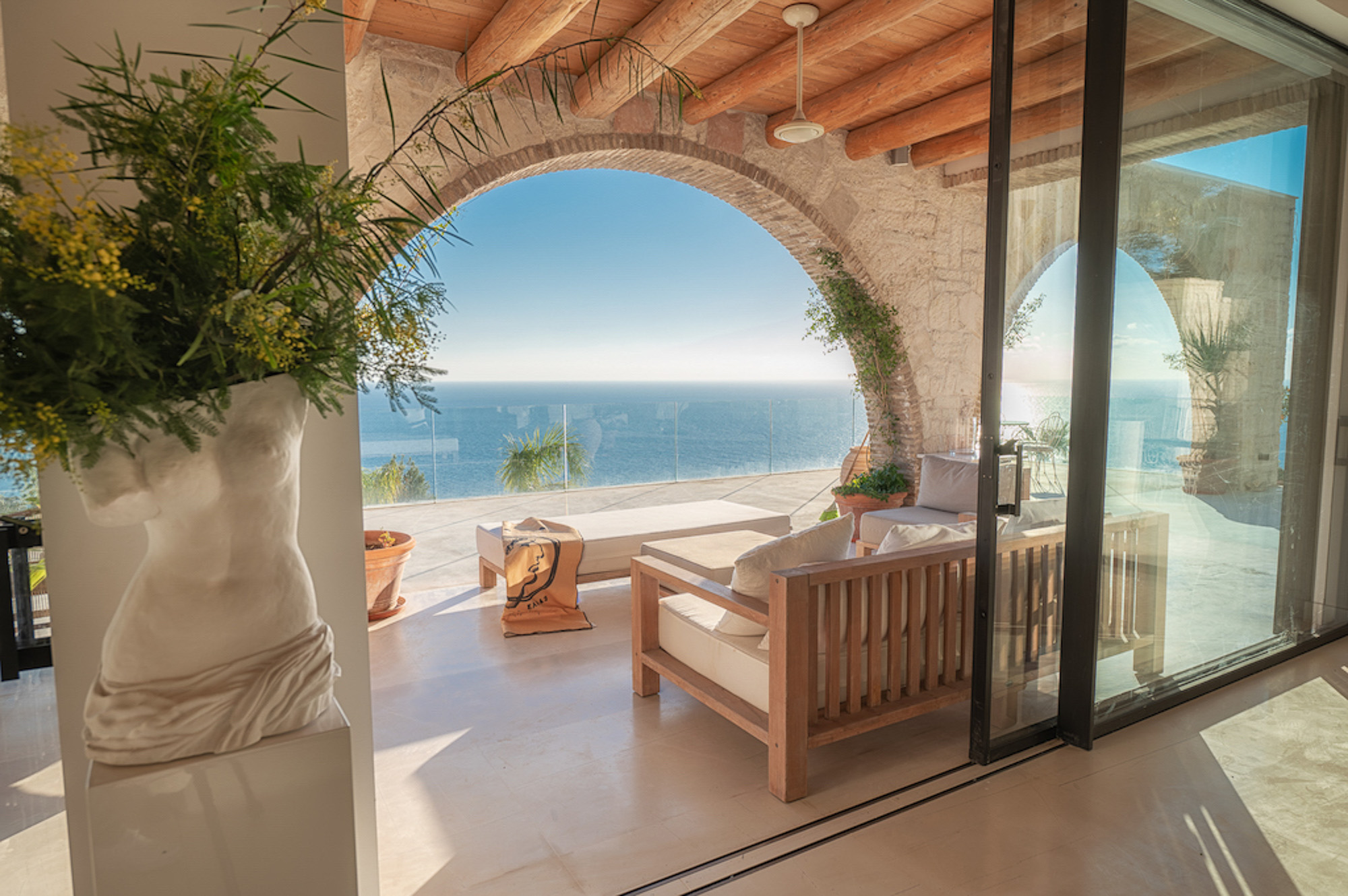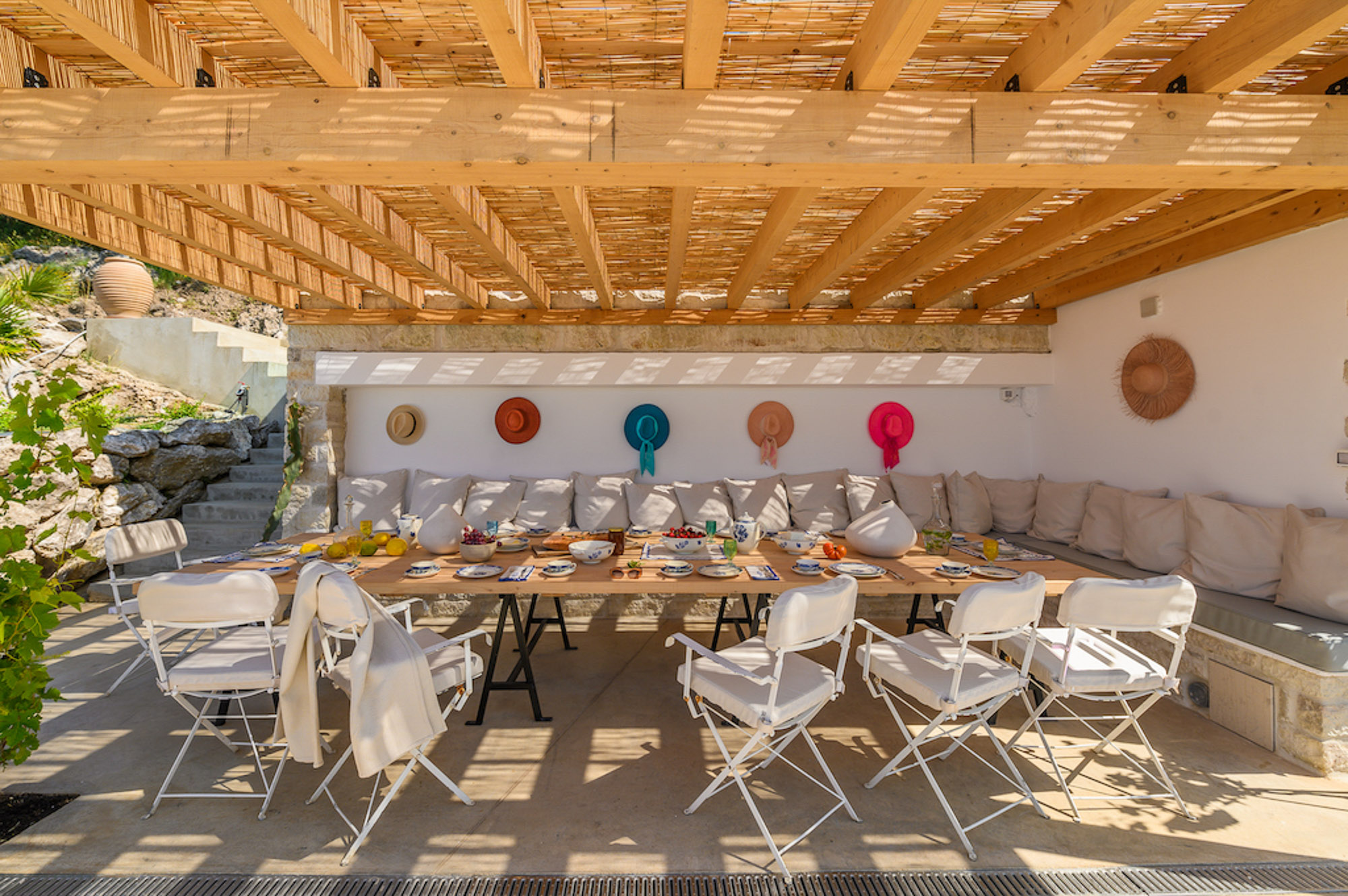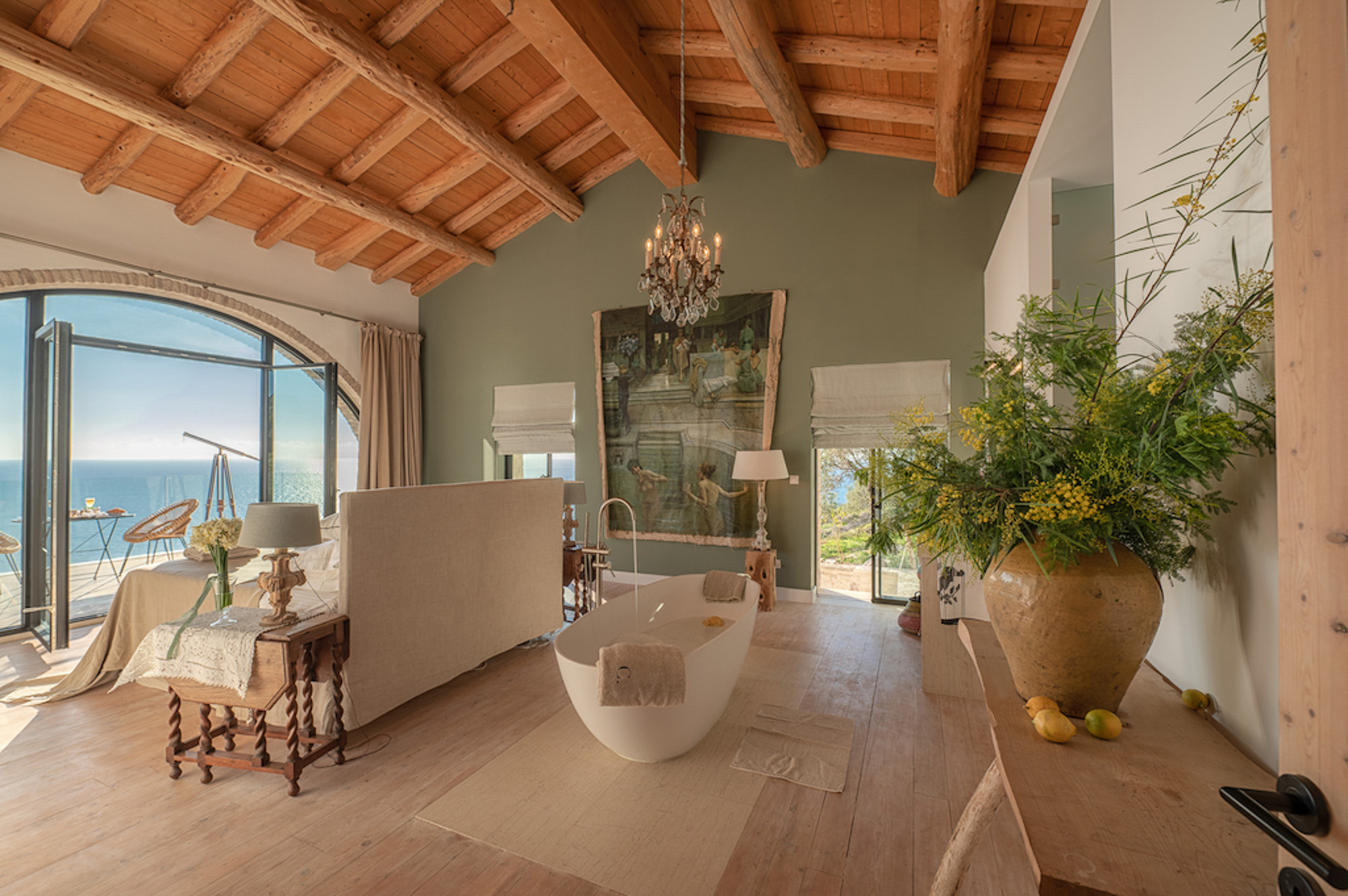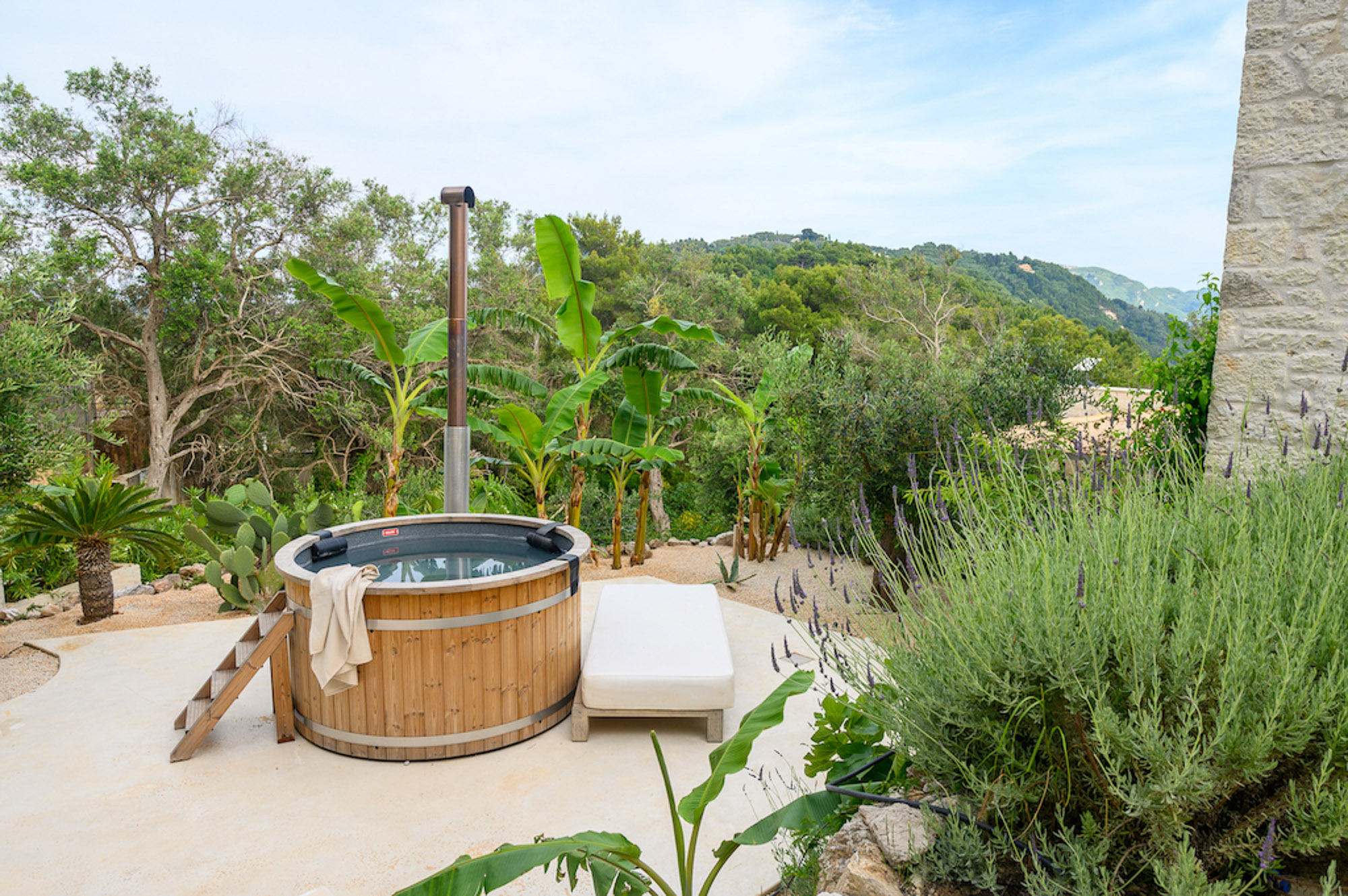 A shaded dining area along the front of the house is ideal for al fresco meals. The lower terrace invites relaxation, with plush double-width sunbeds beside an infinity pool that seems to merge with the horizon. At the back of the villa, a Moroccan-inspired garden shaded by citrus and palm trees offers hammocks, cosy seating, and an array of herbs, flowers, and exotic plants. Here, guests can unwind on soft sofas or in the hot tub, enjoying the tranquillity of a lush retreat.