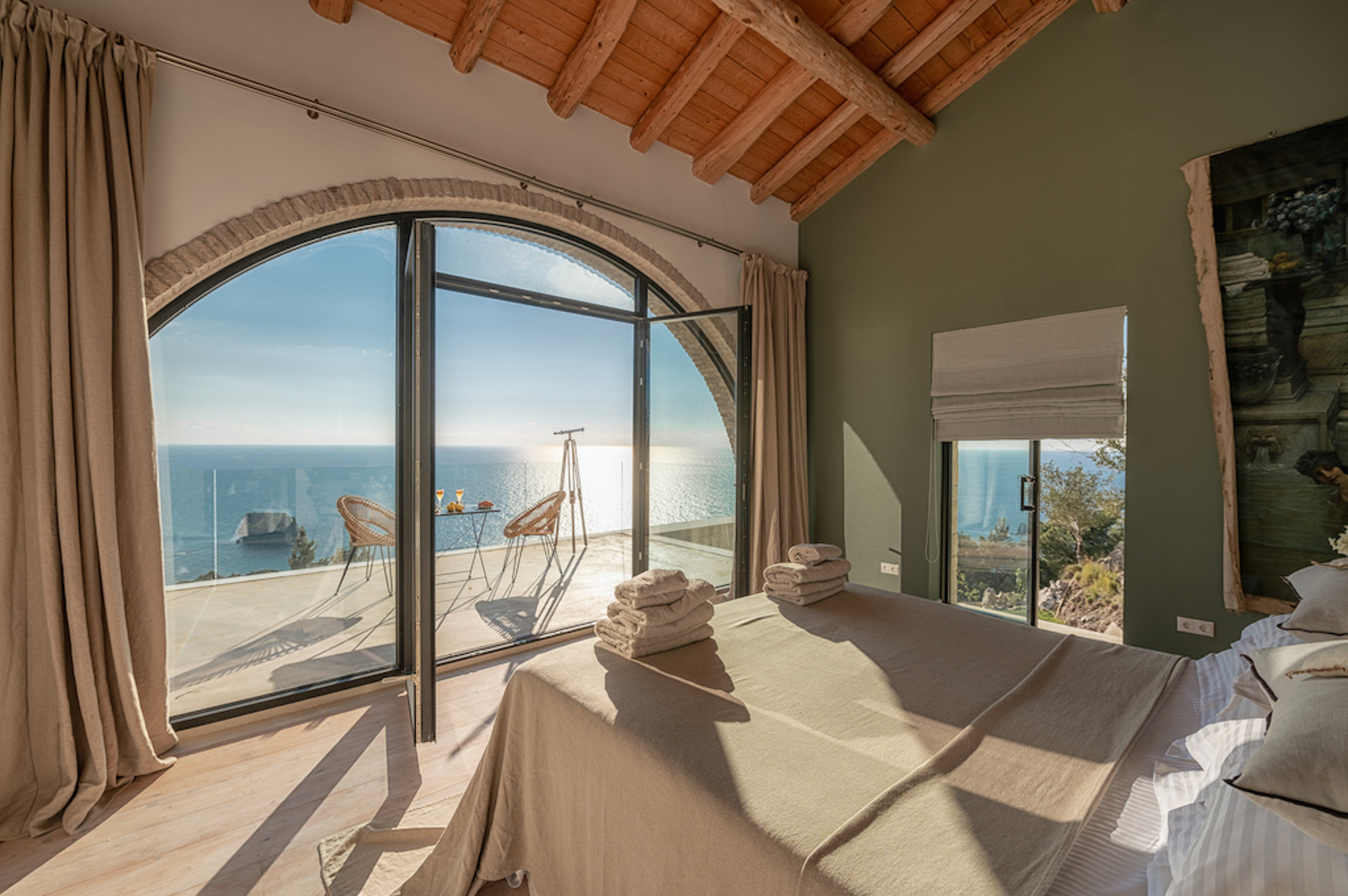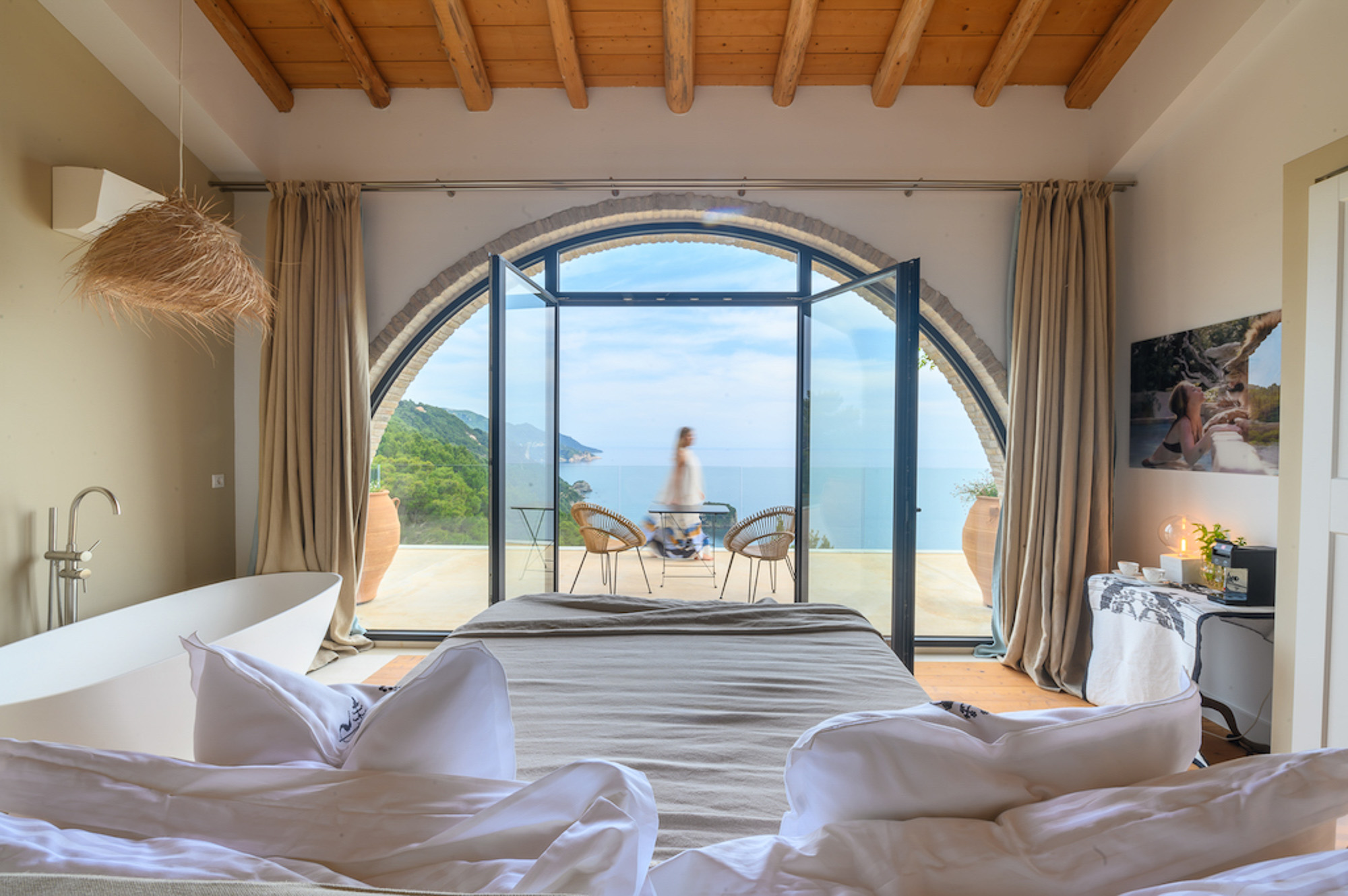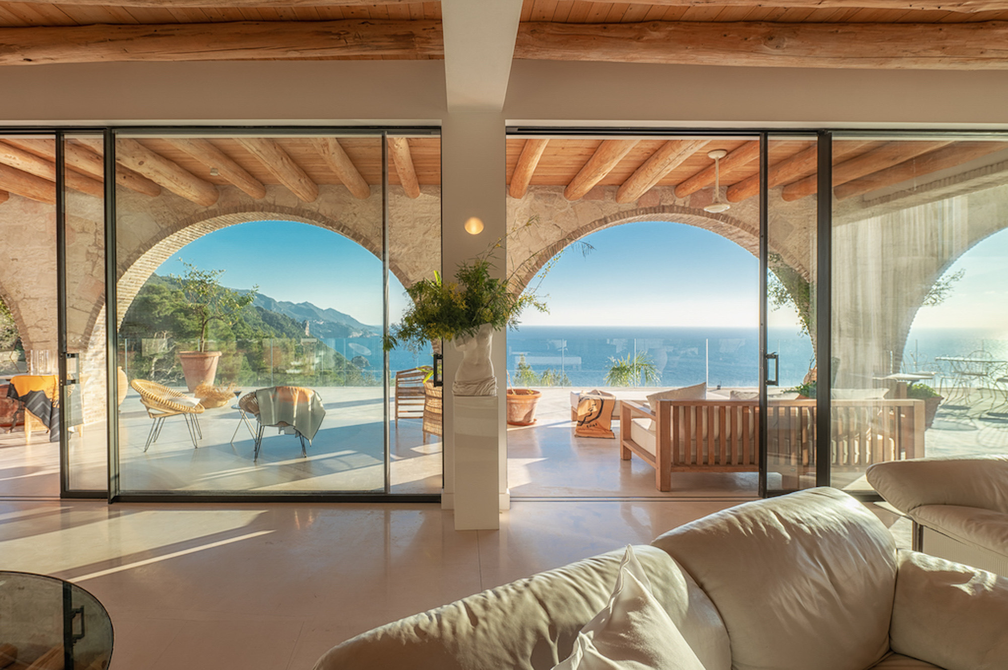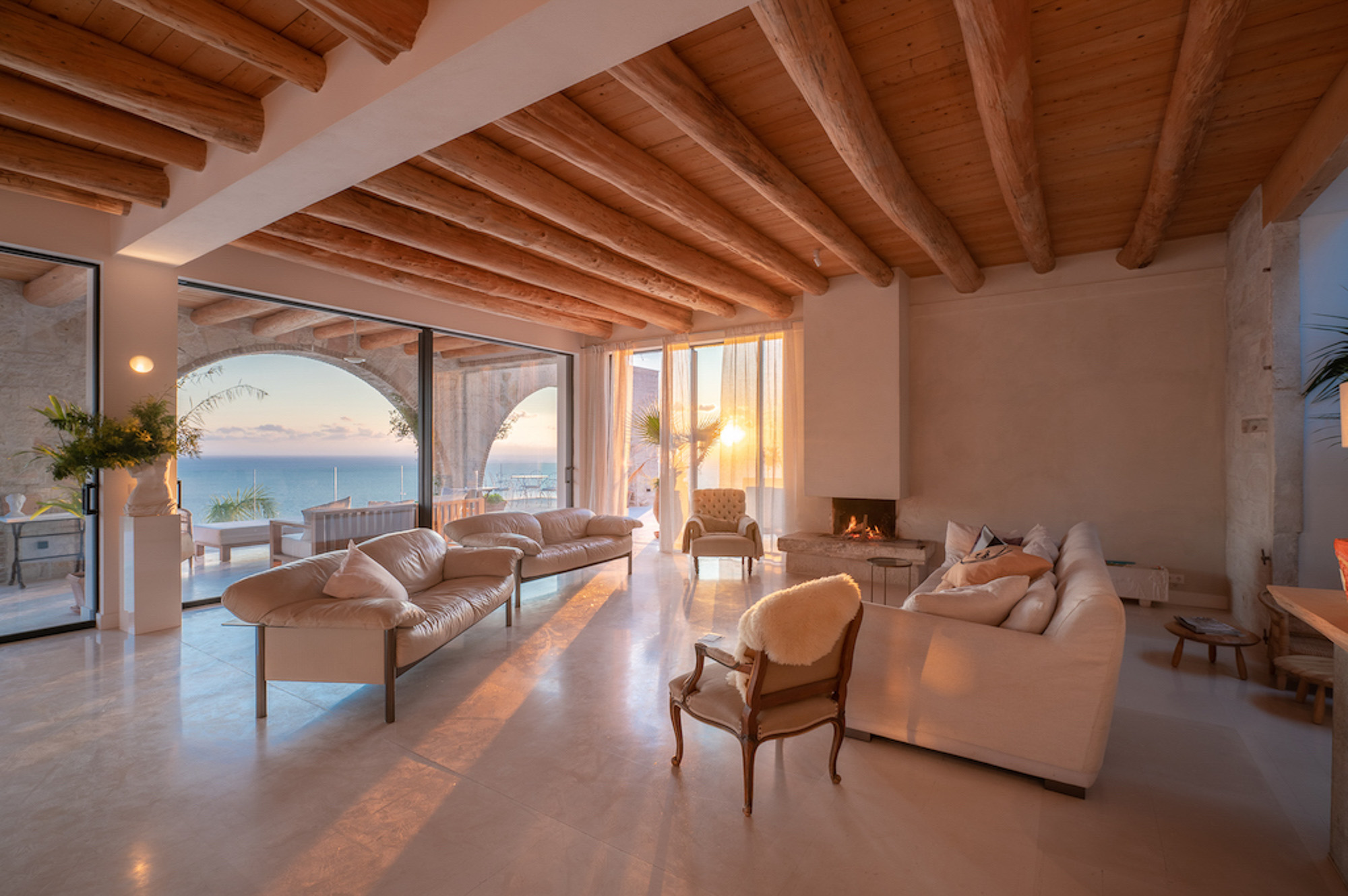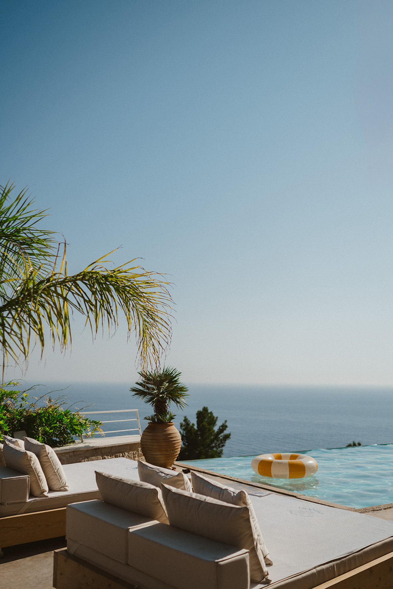 A shaded dining area along the front of the house is ideal for al fresco meals. The lower terrace invites relaxation, with plush double-width sunbeds beside an infinity pool that seems to merge with the horizon. At the back of the villa, a Moroccan-inspired garden shaded by citrus and palm trees offers hammocks, cosy seating, and an array of herbs, flowers, and exotic plants. Here, guests can unwind on soft sofas or in the hot tub, enjoying the tranquillity of a lush retreat.