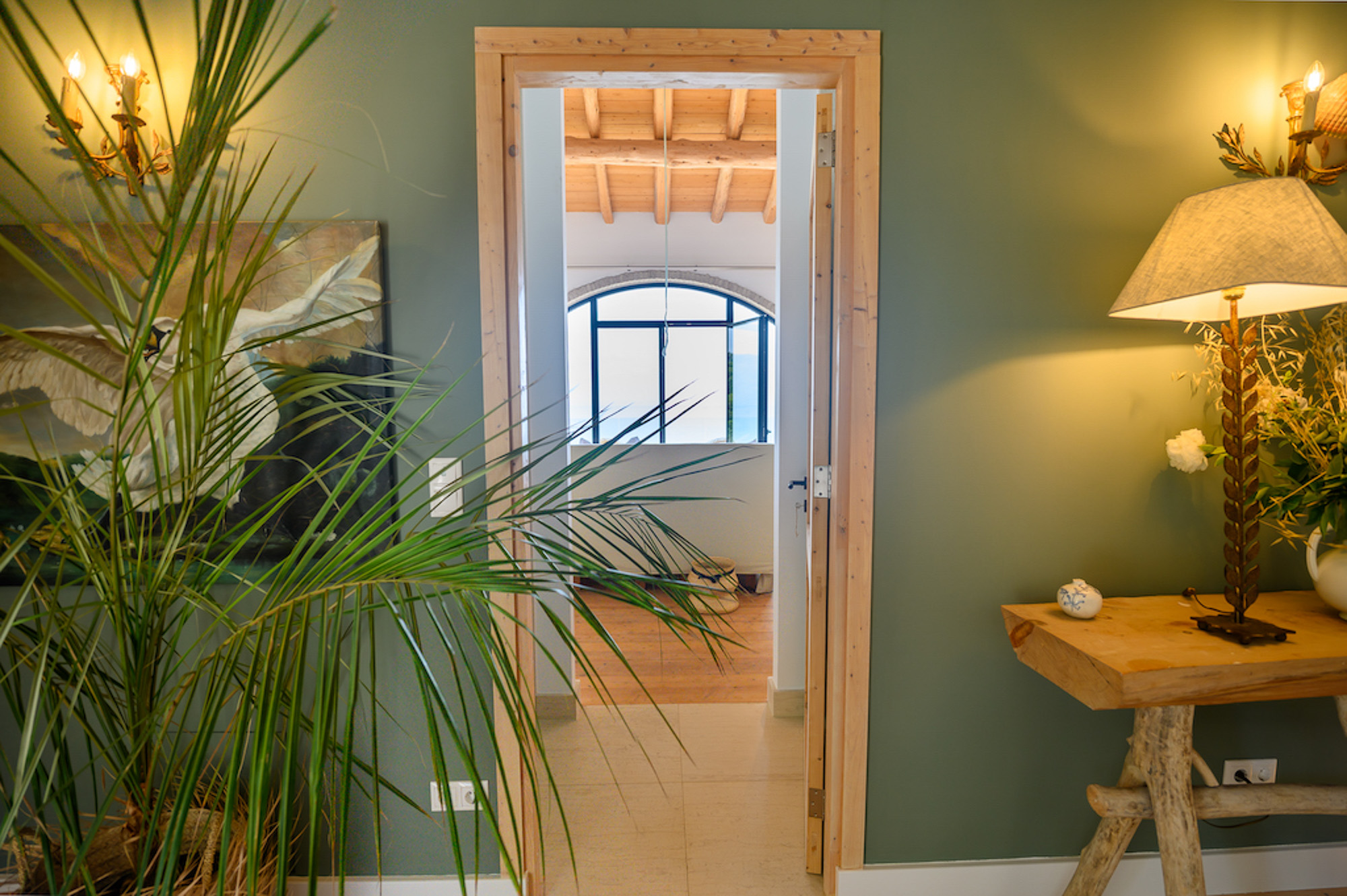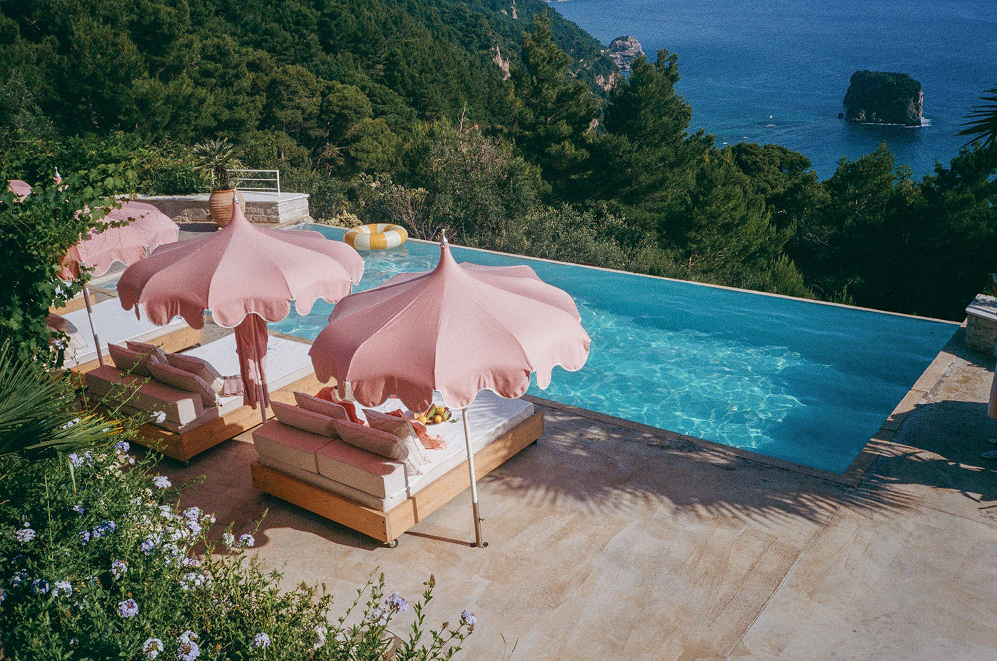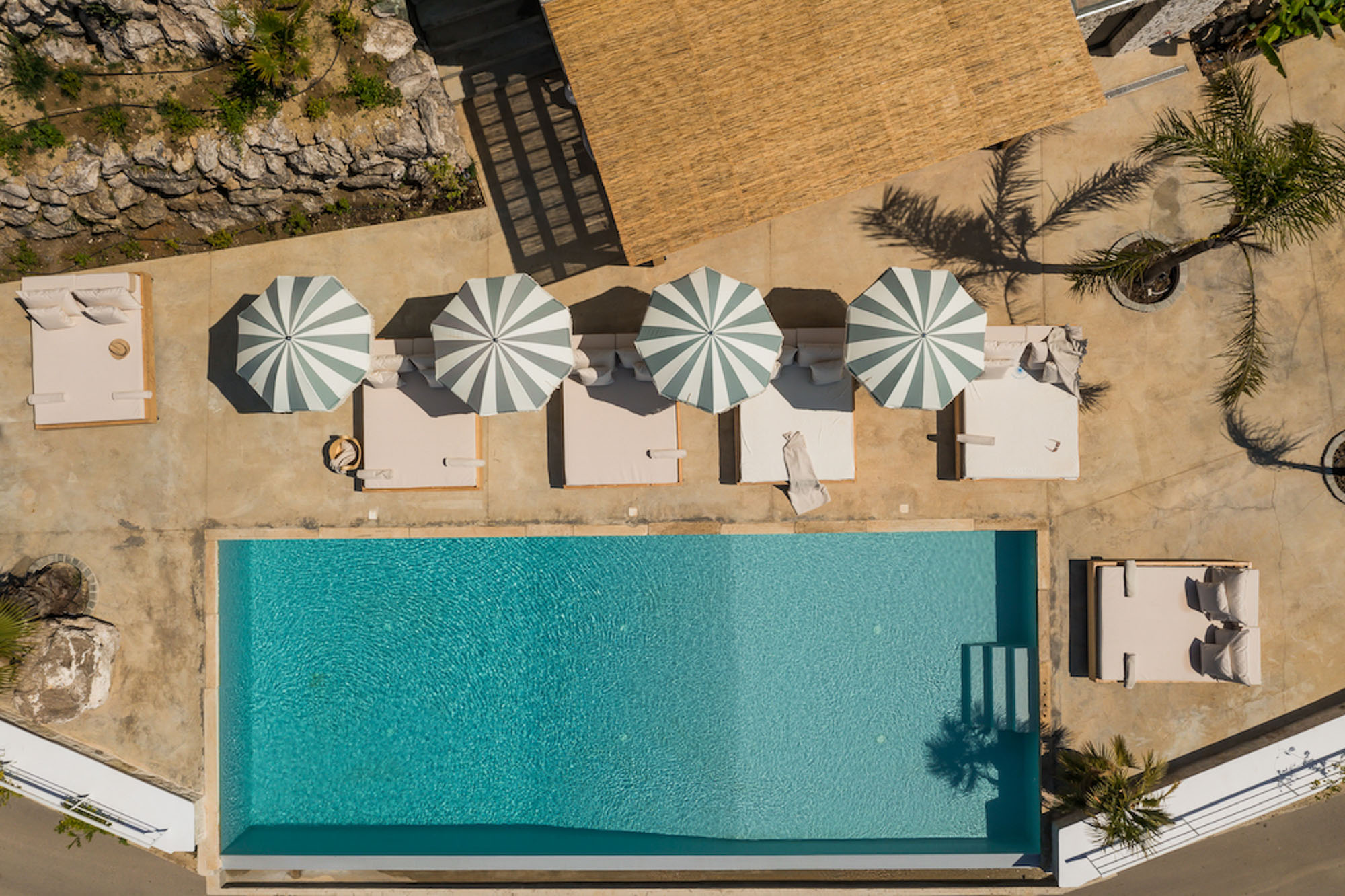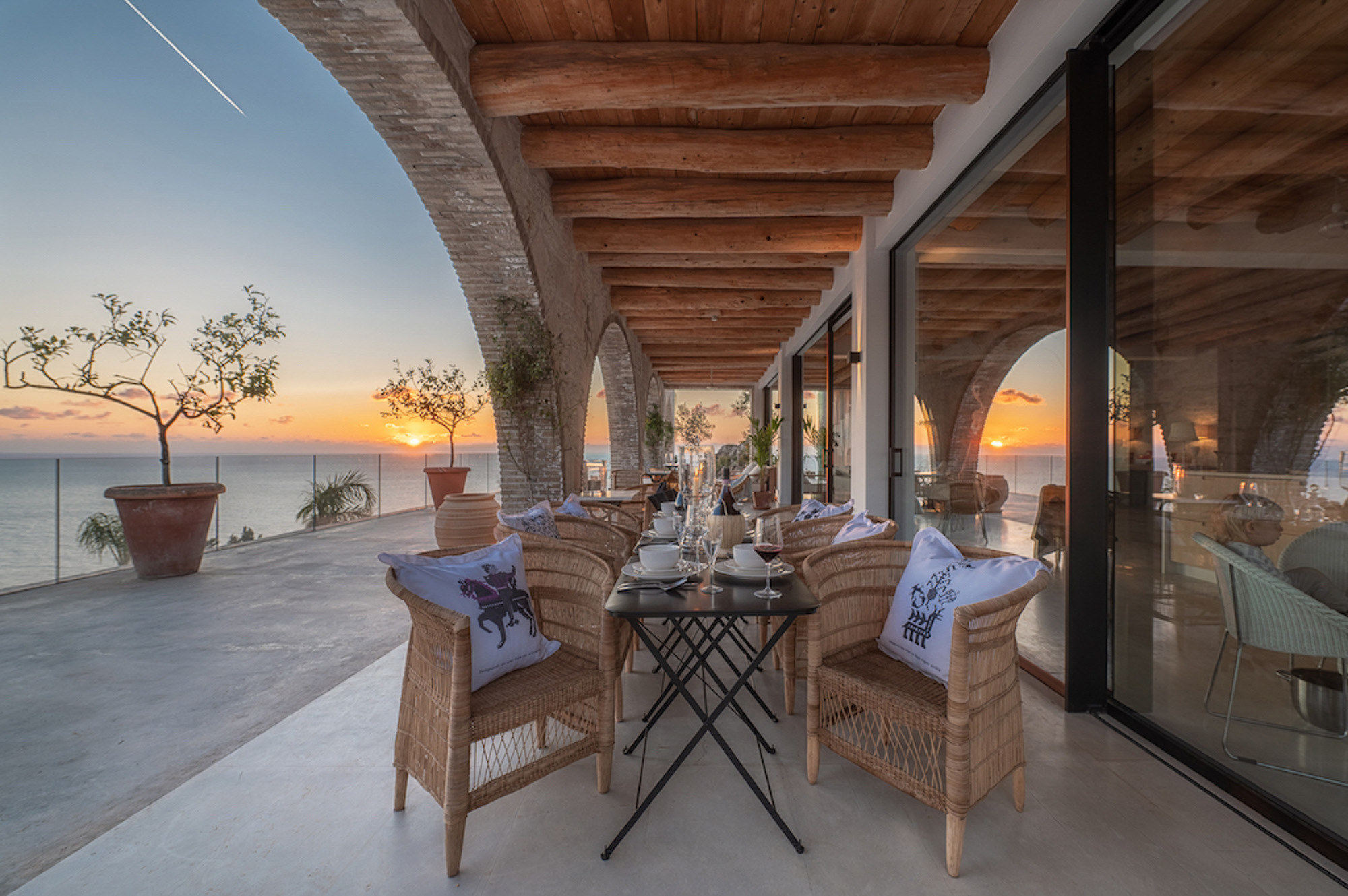 A shaded dining area along the front of the house is ideal for al fresco meals. The lower terrace invites relaxation, with plush double-width sunbeds beside an infinity pool that seems to merge with the horizon. At the back of the villa, a Moroccan-inspired garden shaded by citrus and palm trees offers hammocks, cosy seating, and an array of herbs, flowers, and exotic plants. Here, guests can unwind on soft sofas or in the hot tub, enjoying the tranquillity of a lush retreat.