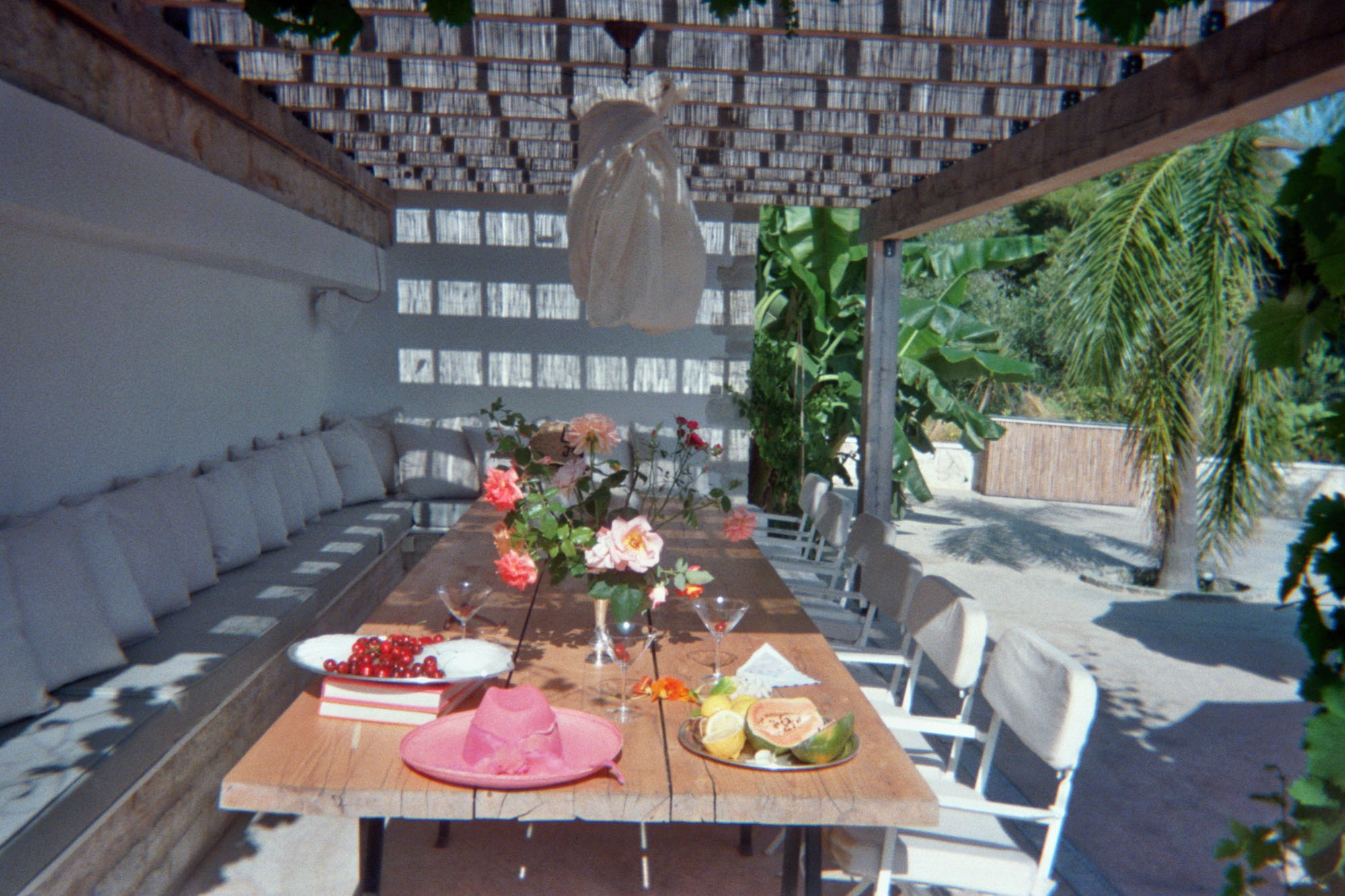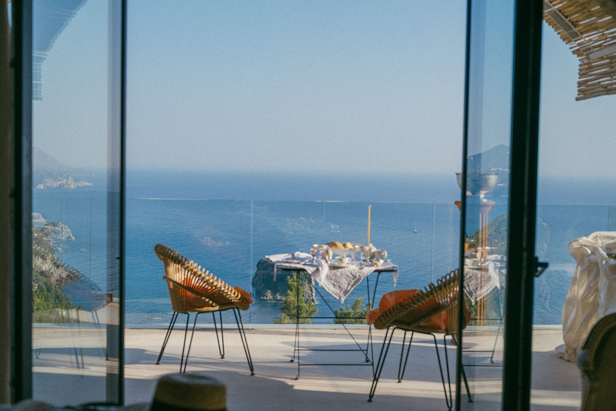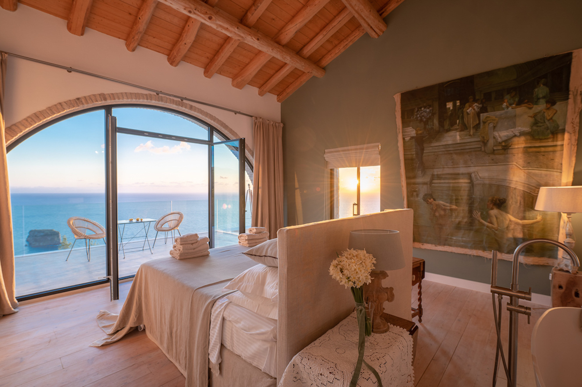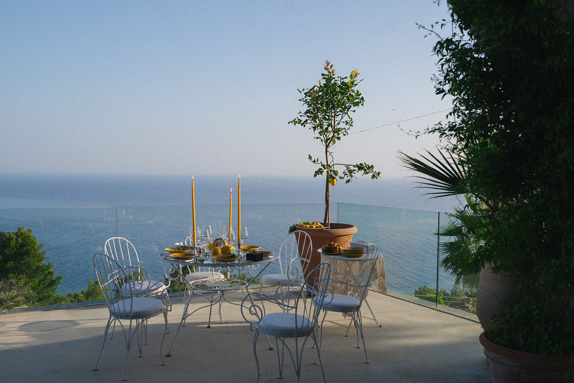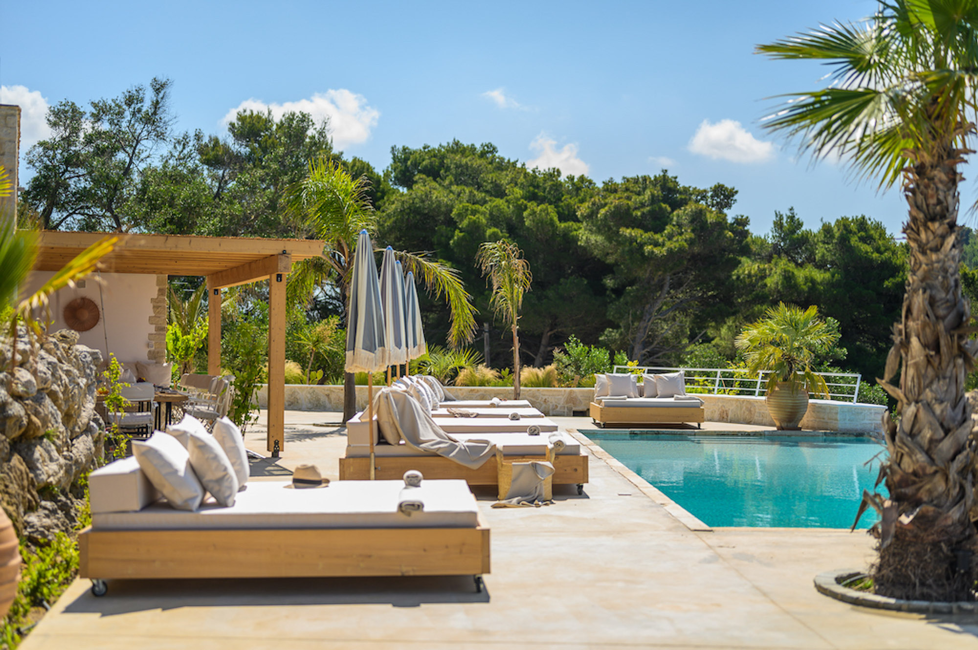 A shaded dining area along the front of the house is ideal for al fresco meals. The lower terrace invites relaxation, with plush double-width sunbeds beside an infinity pool that seems to merge with the horizon. At the back of the villa, a Moroccan-inspired garden shaded by citrus and palm trees offers hammocks, cosy seating, and an array of herbs, flowers, and exotic plants. Here, guests can unwind on soft sofas or in the hot tub, enjoying the tranquillity of a lush retreat.