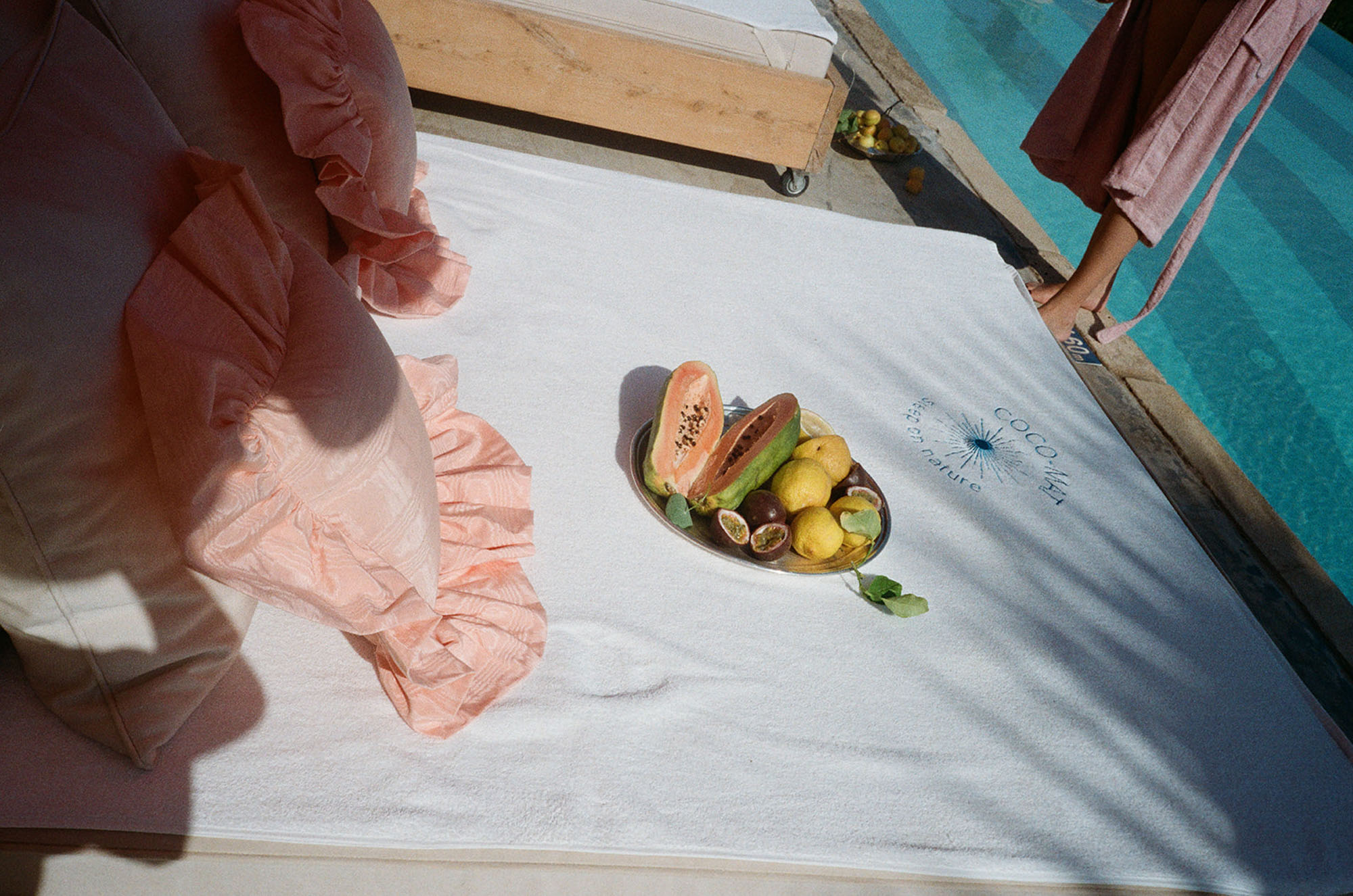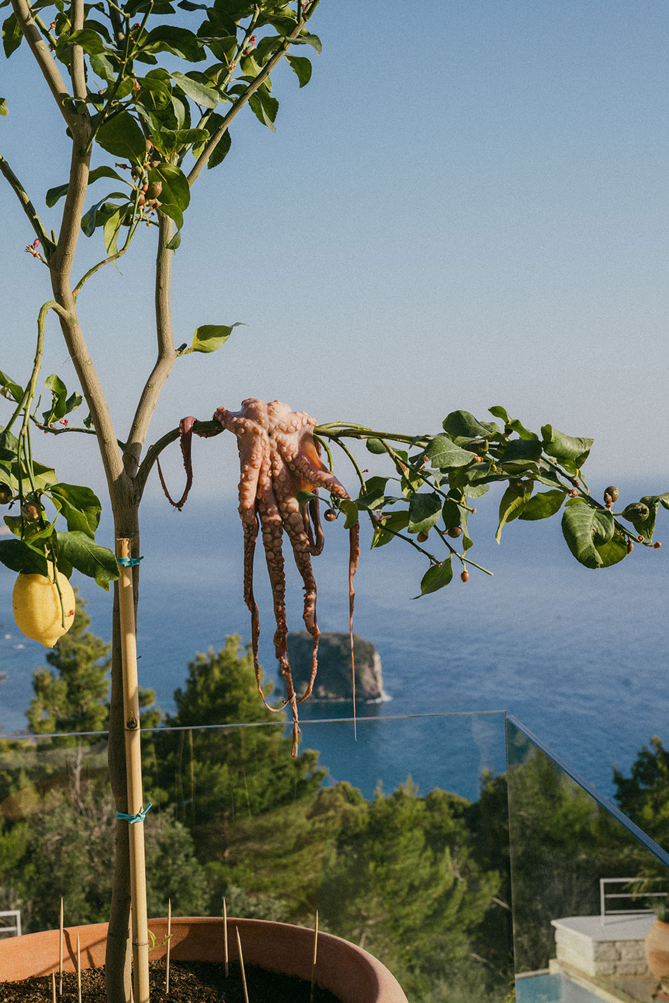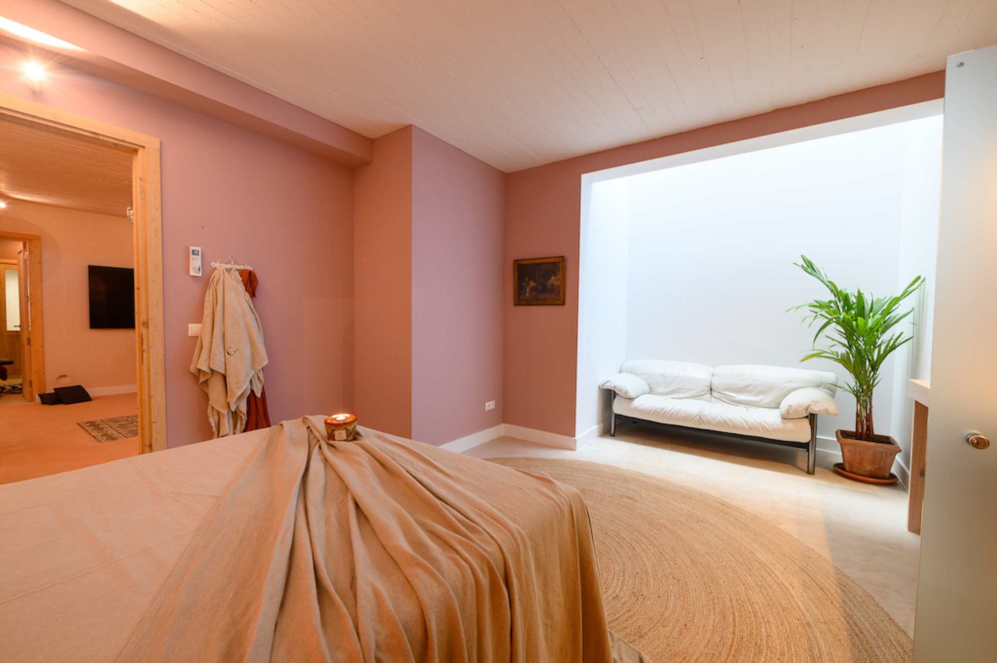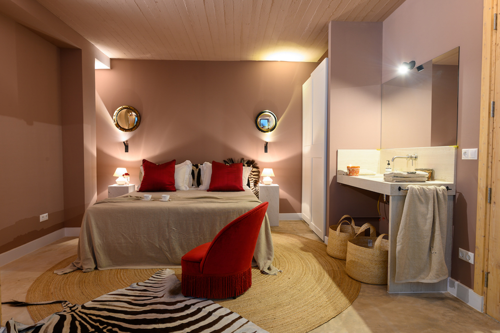 A shaded dining area along the front of the house is ideal for al fresco meals. The lower terrace invites relaxation, with plush double-width sunbeds beside an infinity pool that seems to merge with the horizon. At the back of the villa, a Moroccan-inspired garden shaded by citrus and palm trees offers hammocks, cosy seating, and an array of herbs, flowers, and exotic plants. Here, guests can unwind on soft sofas or in the hot tub, enjoying the tranquillity of a lush retreat.