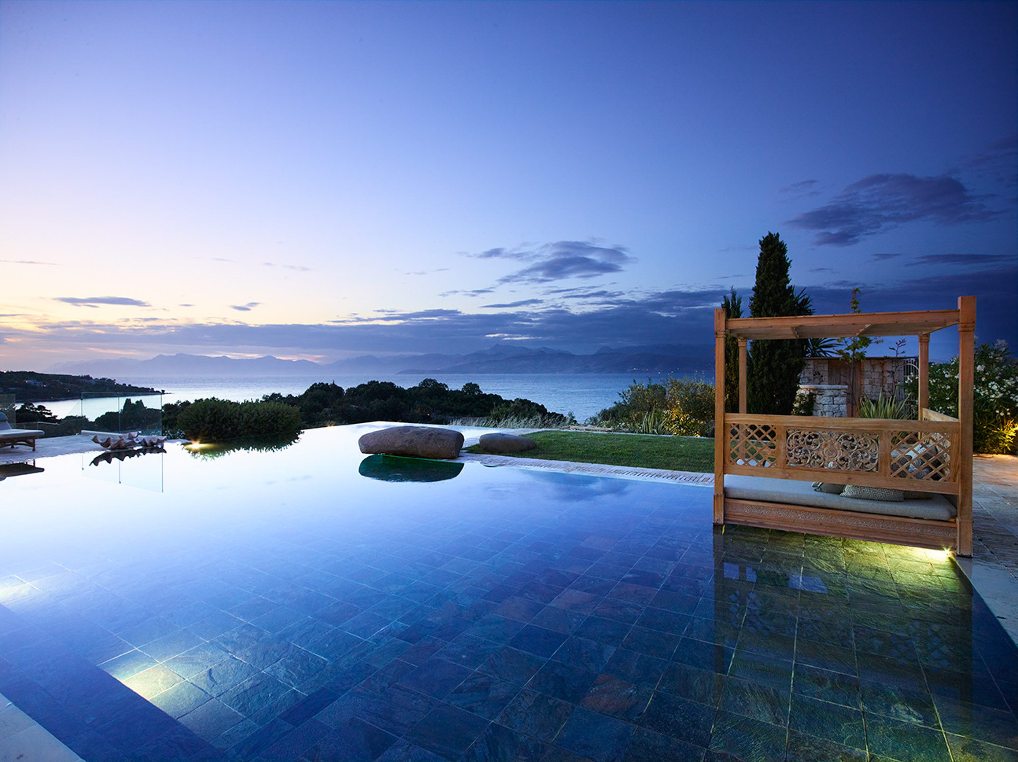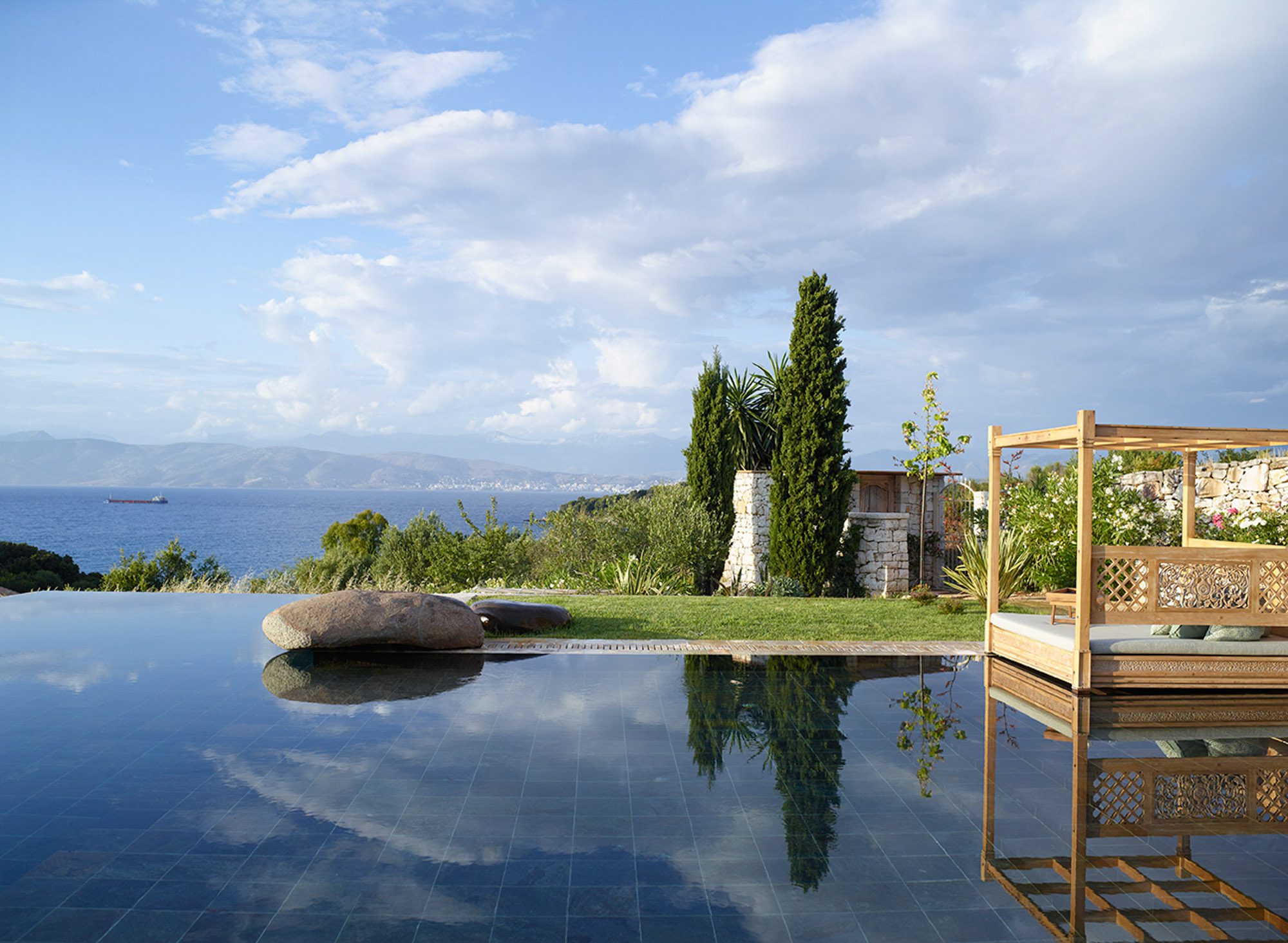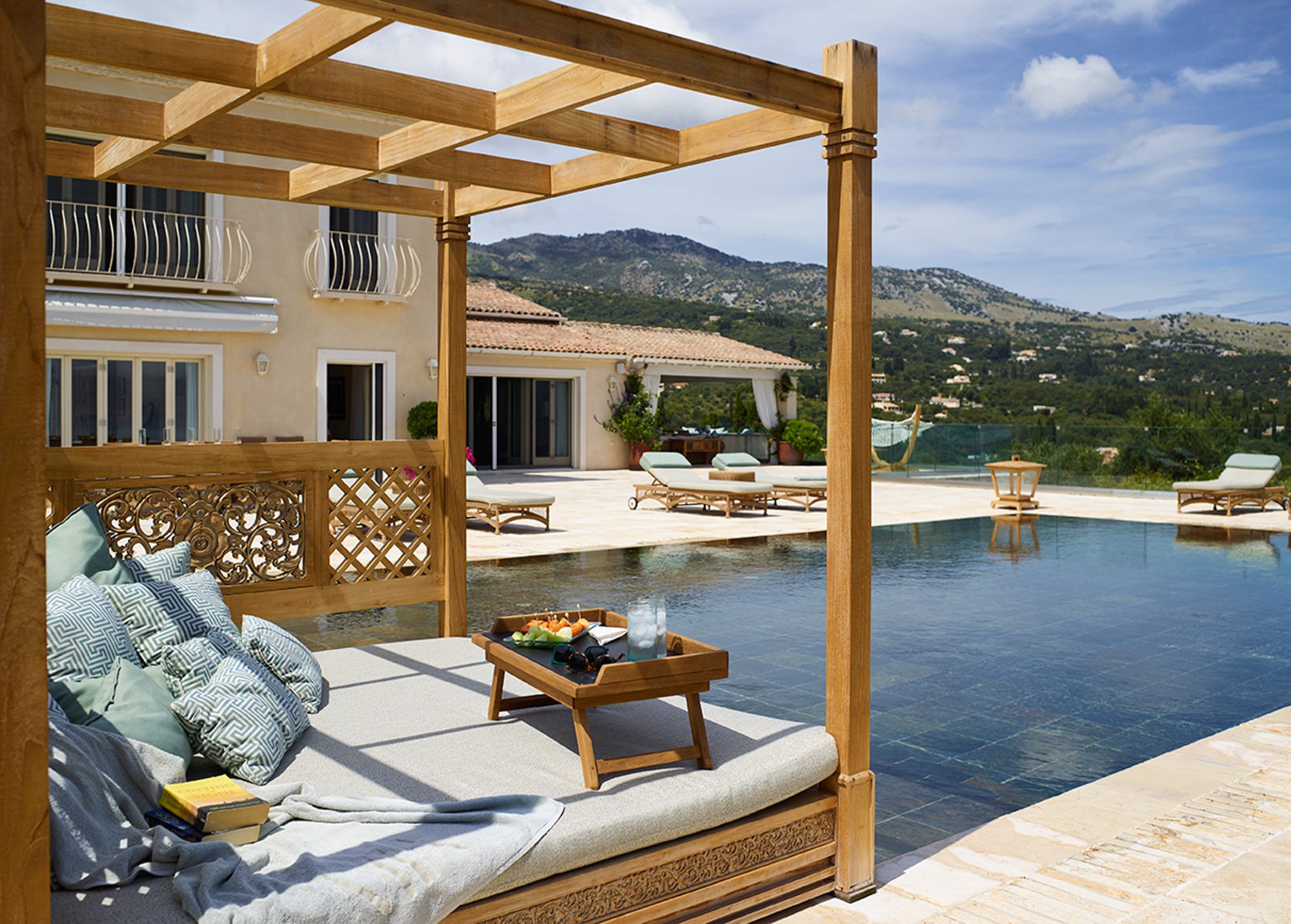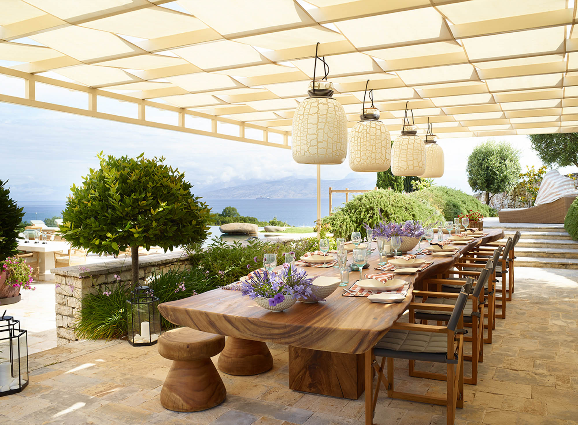 Sited in the shade of the canopied outdoor kitchen/dining area, with glorious sea views. It’s also a special place to eat by sunlight or candlelight. There’s also a further dining table for 12, on the pool terrace, a stylish outdoor lounge, hammocks for lazing, steamer chairs and sun beds to relax on, and a large cushioned day bed at one end of the L-shaped infinity pool. The garden has swings and toys for children, and seasonal fruits and vegetables are grown for guests to enjoy.