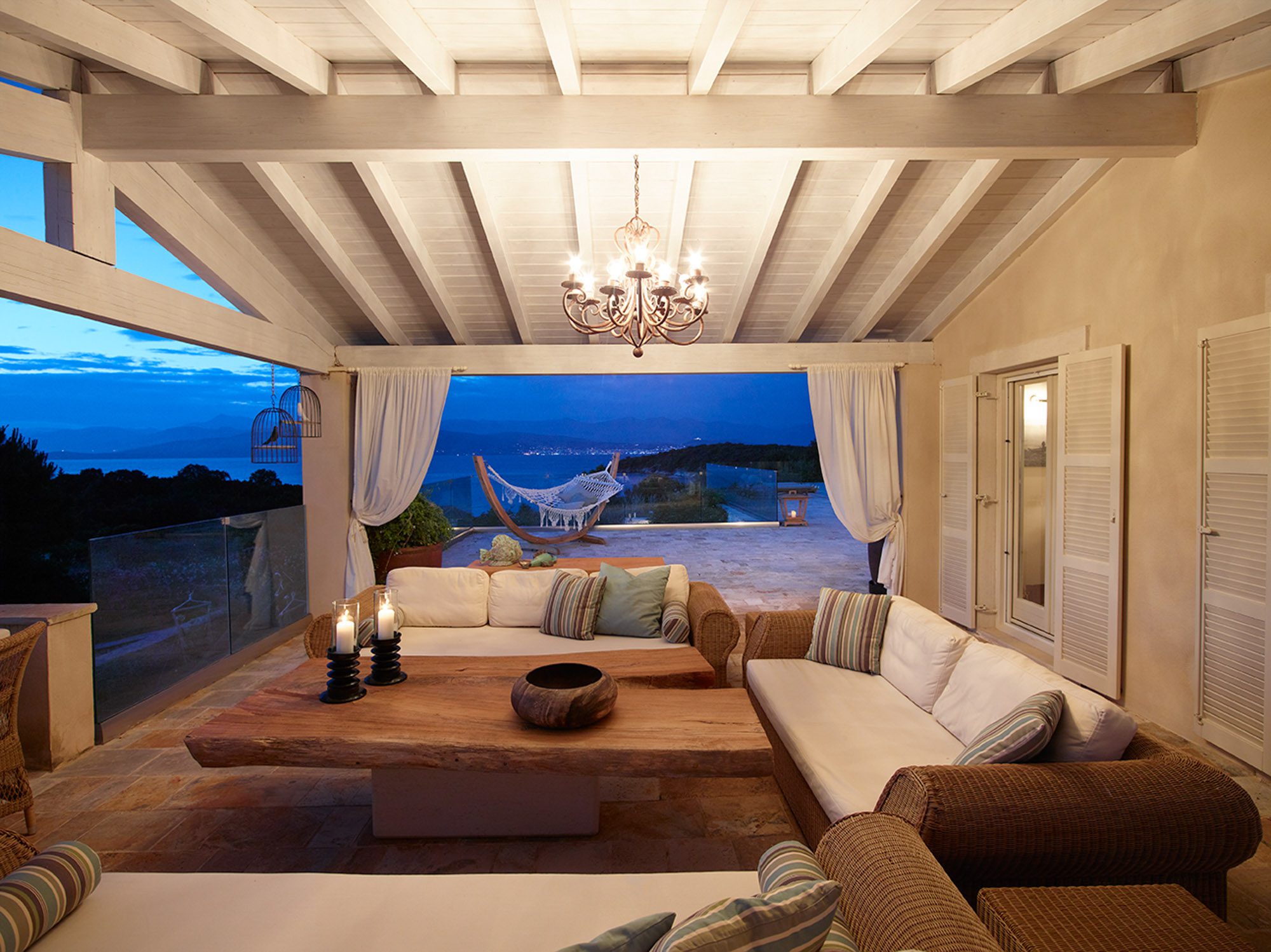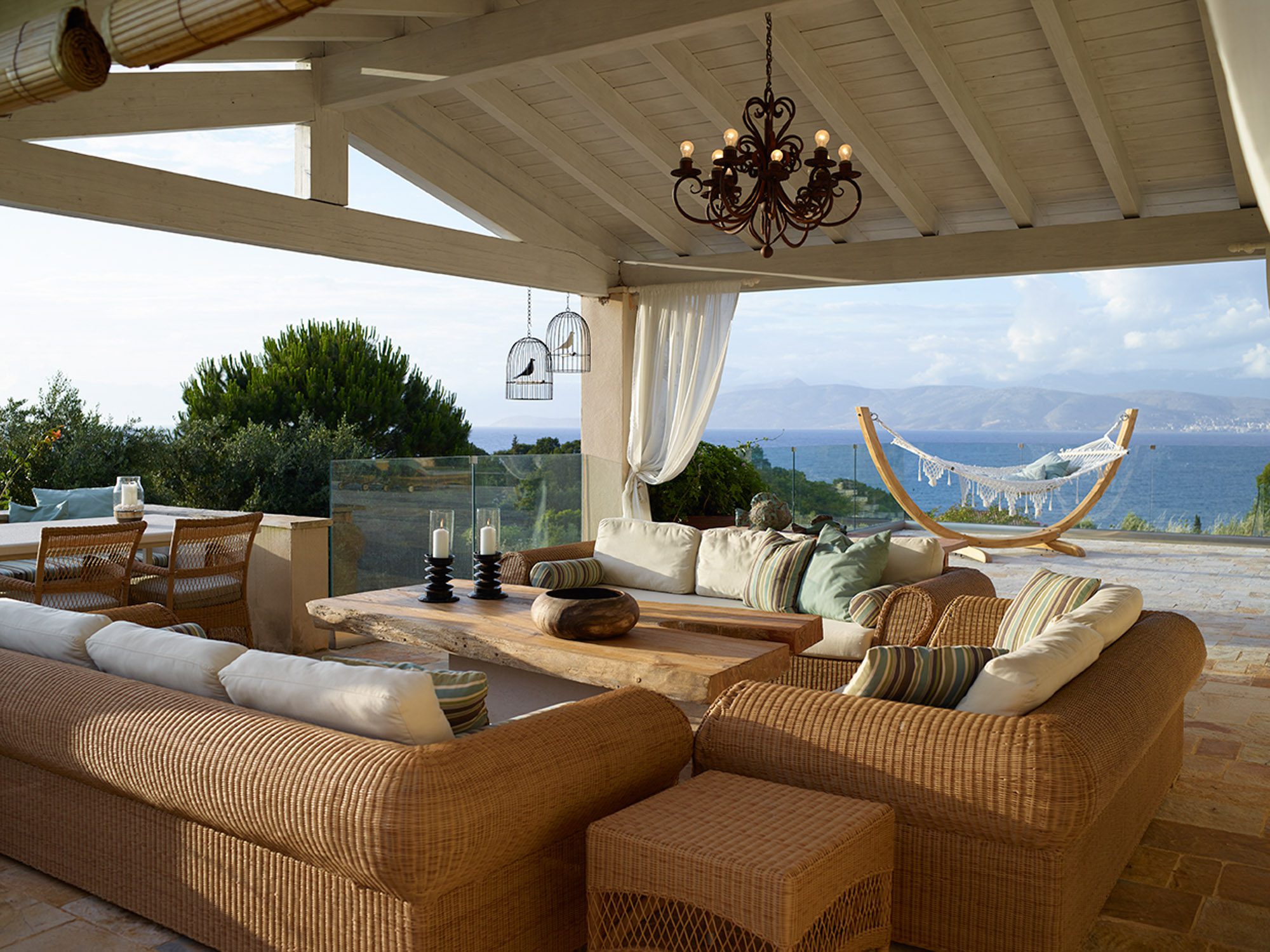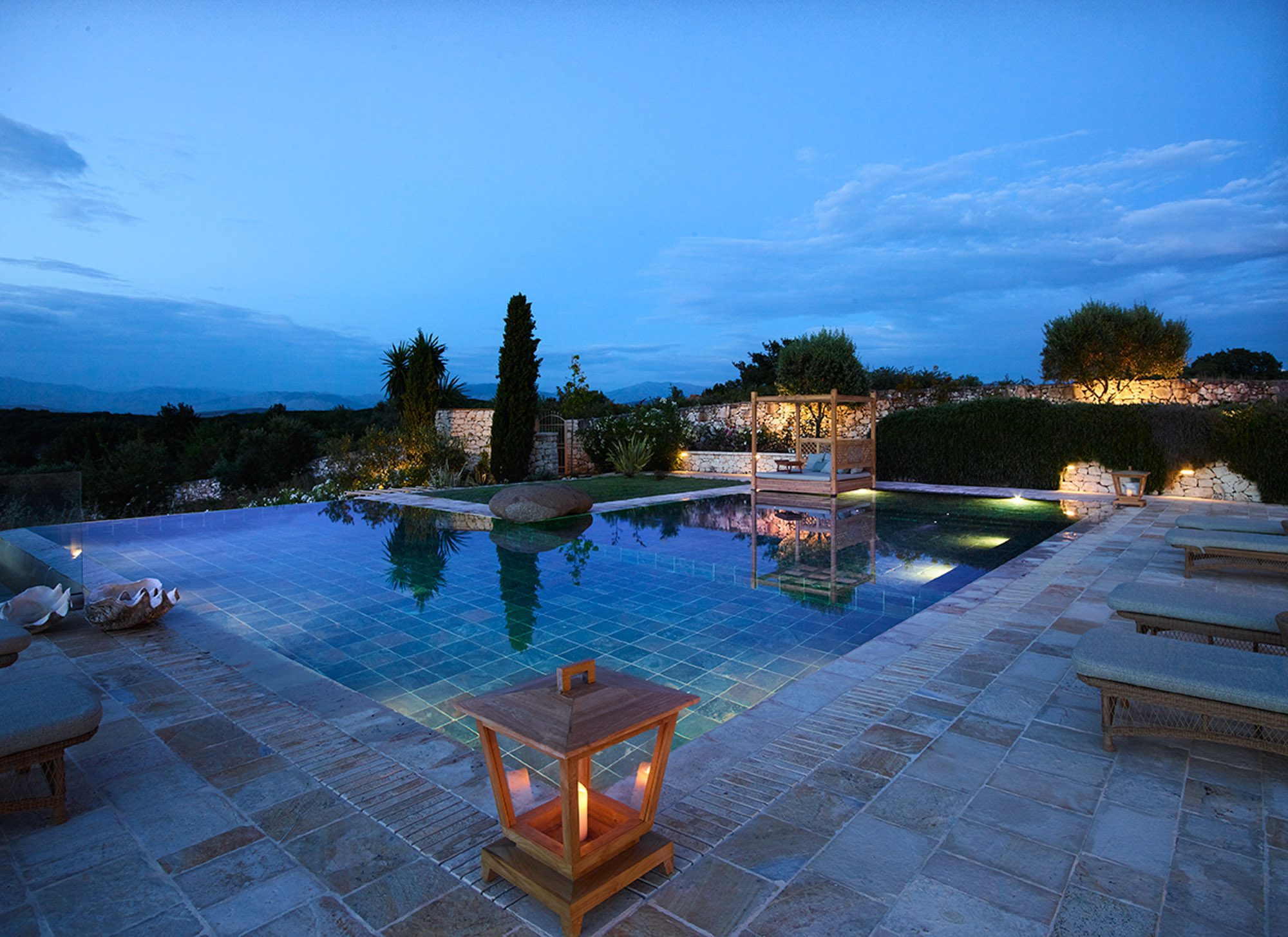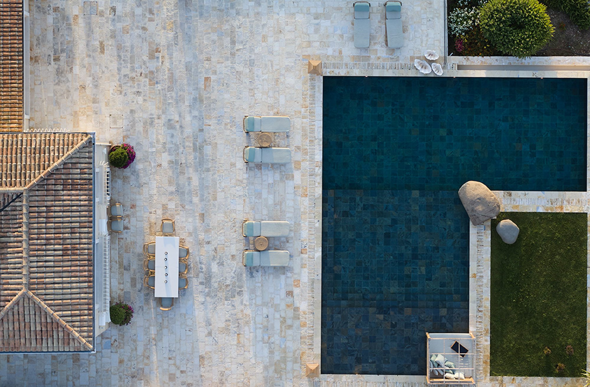 Sited in the shade of the canopied outdoor kitchen/dining area, with glorious sea views. It’s also a special place to eat by sunlight or candlelight. There’s also a further dining table for 12, on the pool terrace, a stylish outdoor lounge, hammocks for lazing, steamer chairs and sun beds to relax on, and a large cushioned day bed at one end of the L-shaped infinity pool. The garden has swings and toys for children, and seasonal fruits and vegetables are grown for guests to enjoy.