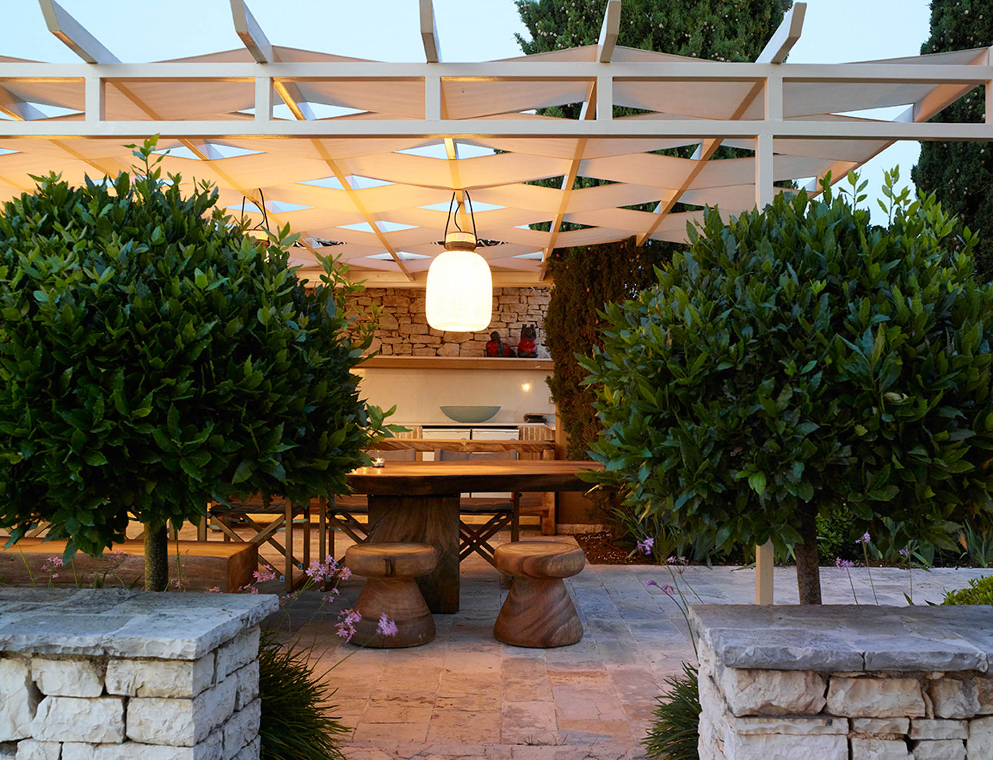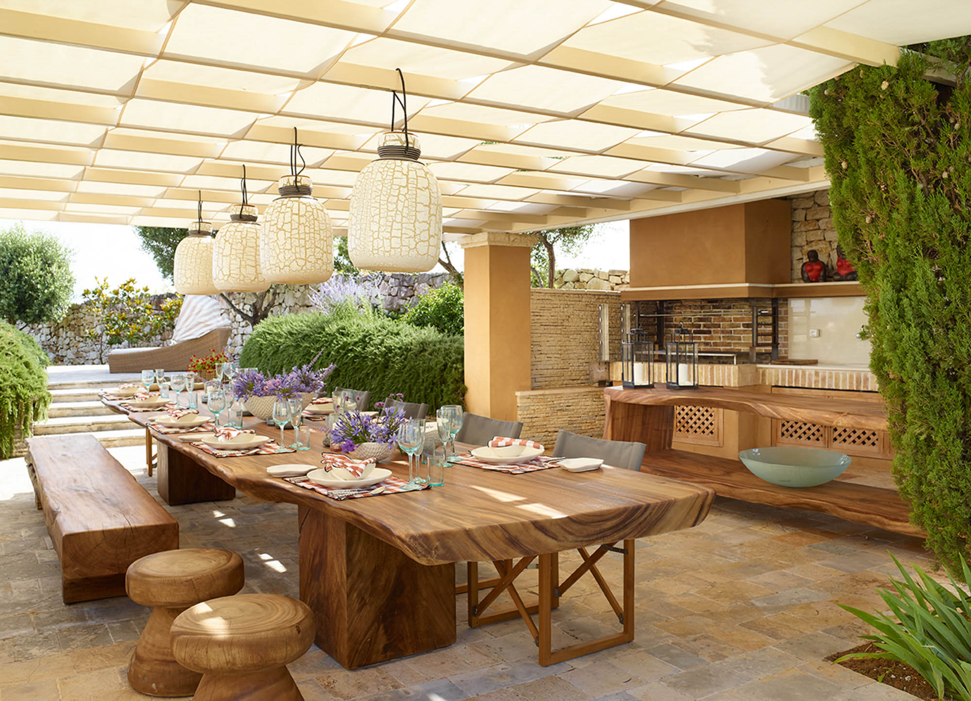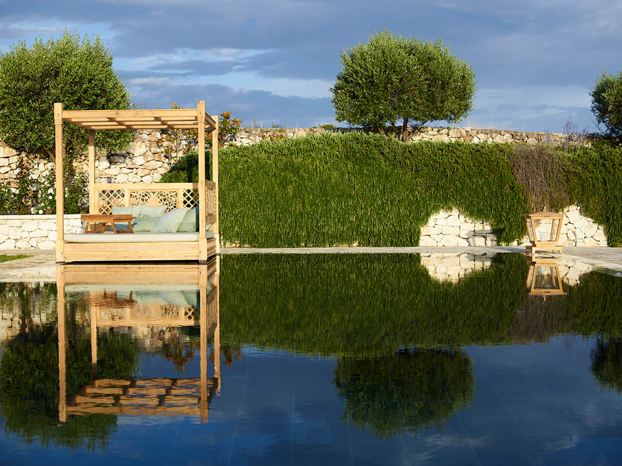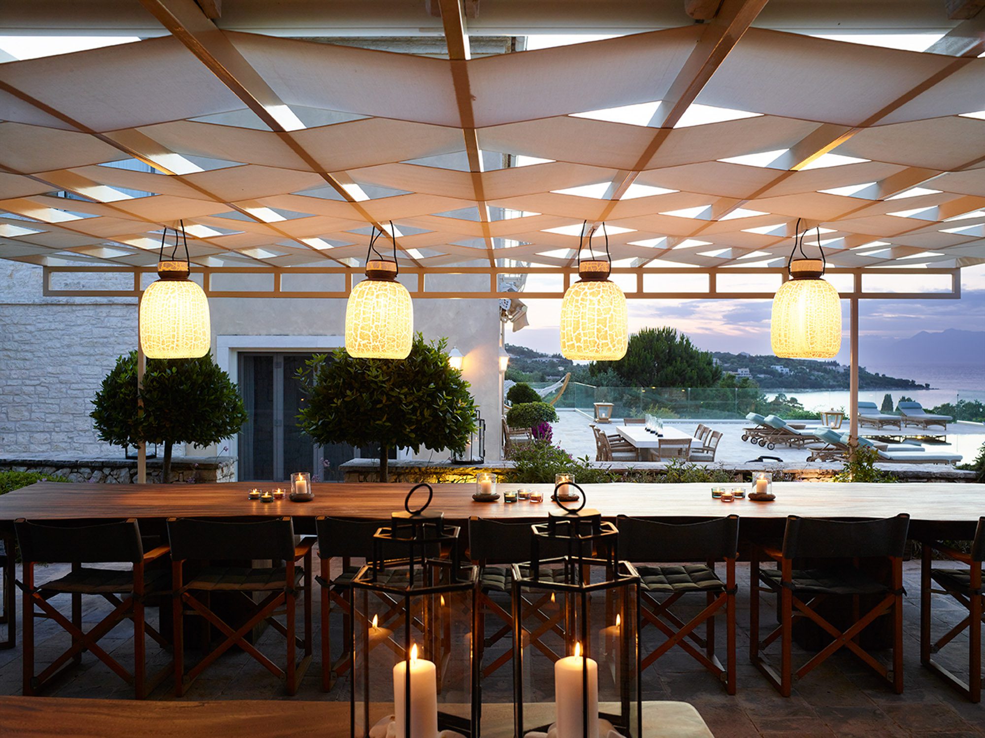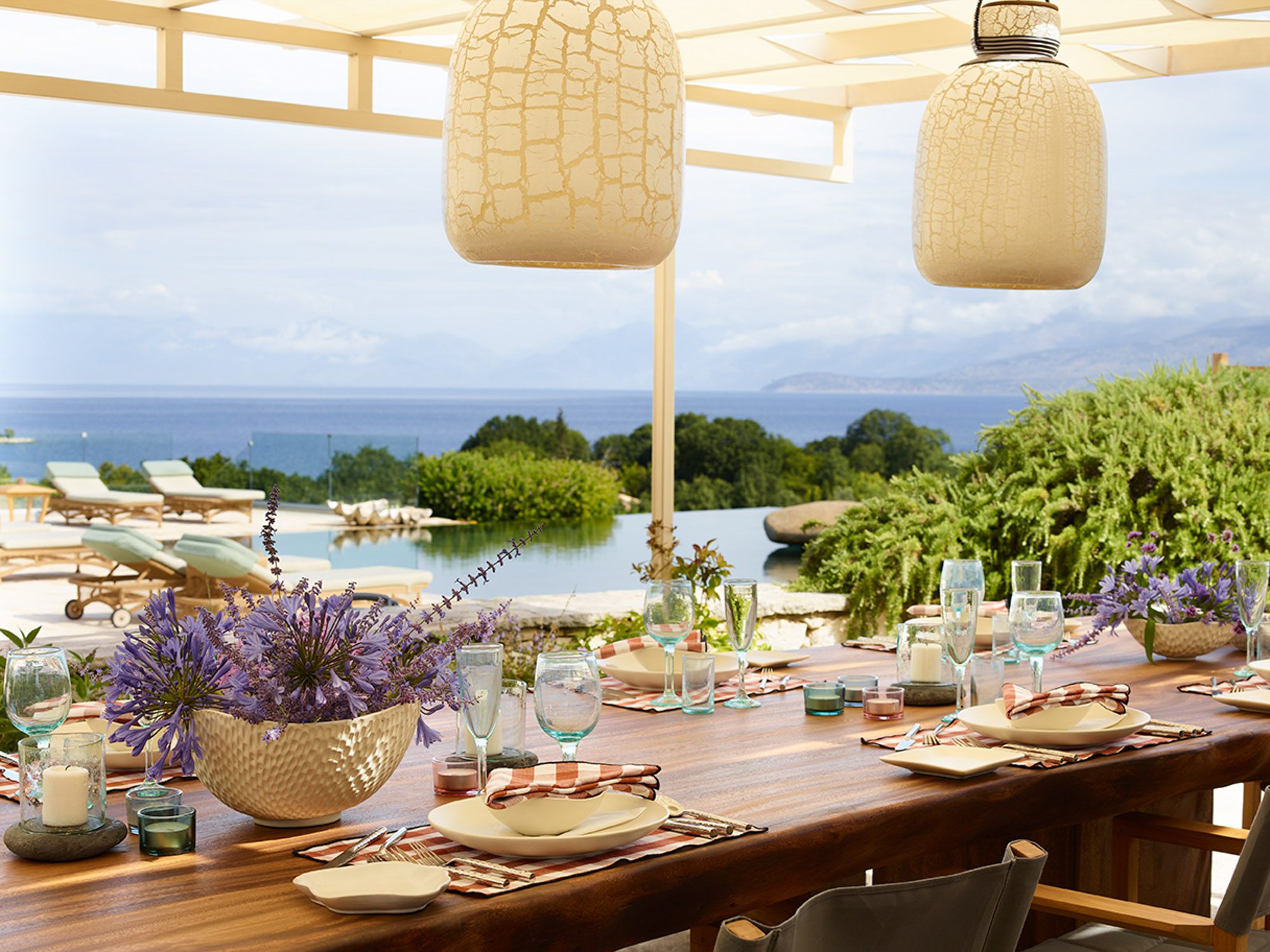 Sited in the shade of the canopied outdoor kitchen/dining area, with glorious sea views. It’s also a special place to eat by sunlight or candlelight. There’s also a further dining table for 12, on the pool terrace, a stylish outdoor lounge, hammocks for lazing, steamer chairs and sun beds to relax on, and a large cushioned day bed at one end of the L-shaped infinity pool. The garden has swings and toys for children, and seasonal fruits and vegetables are grown for guests to enjoy.