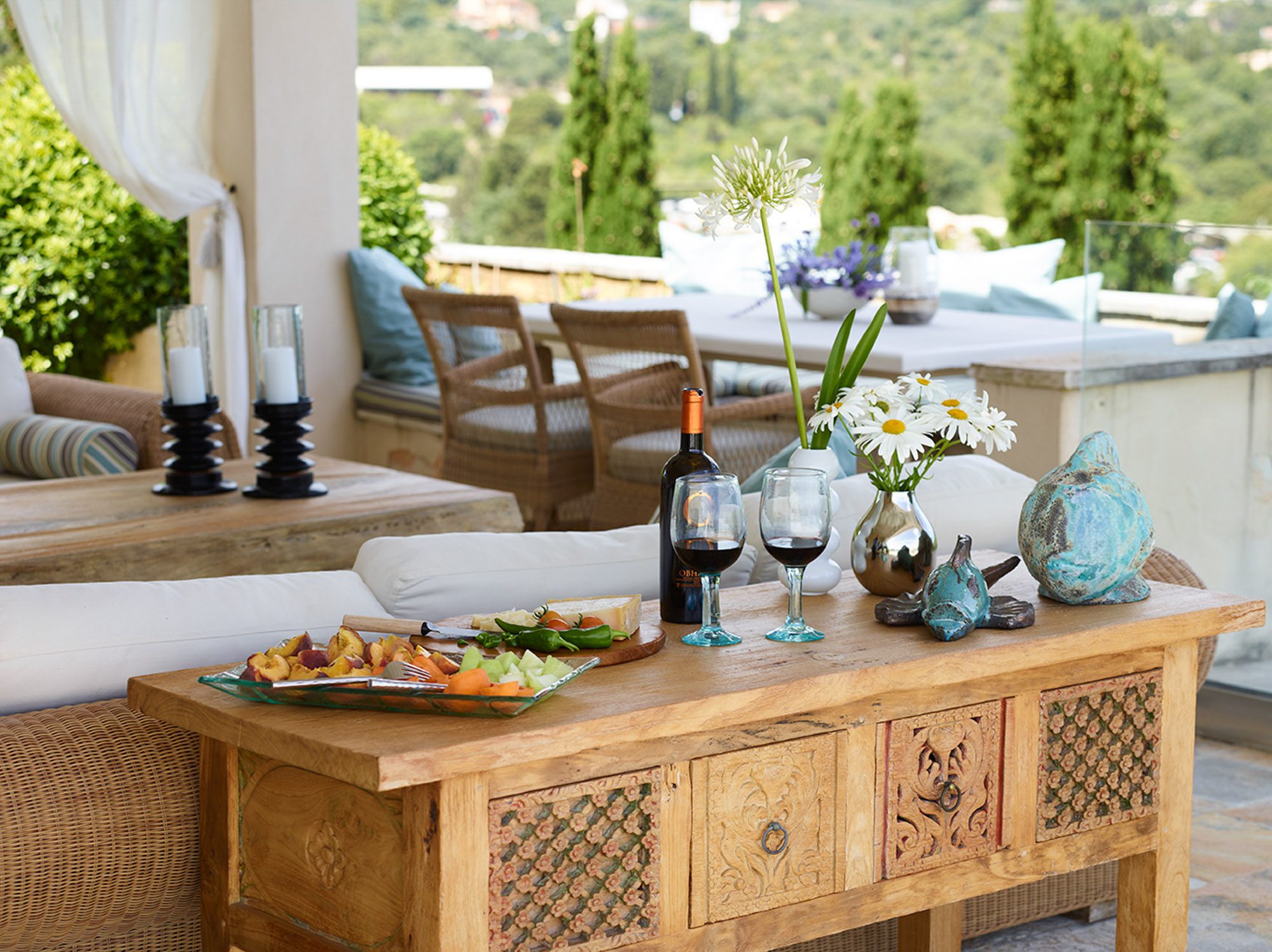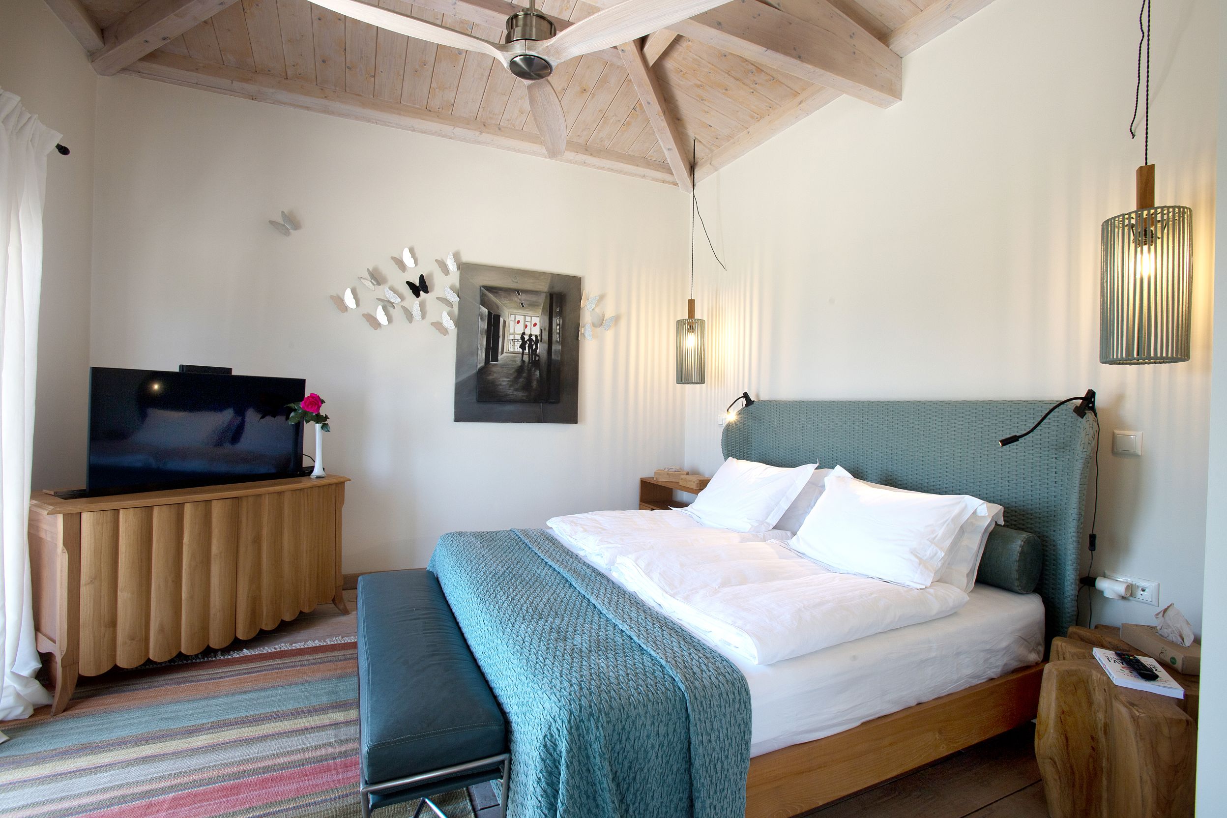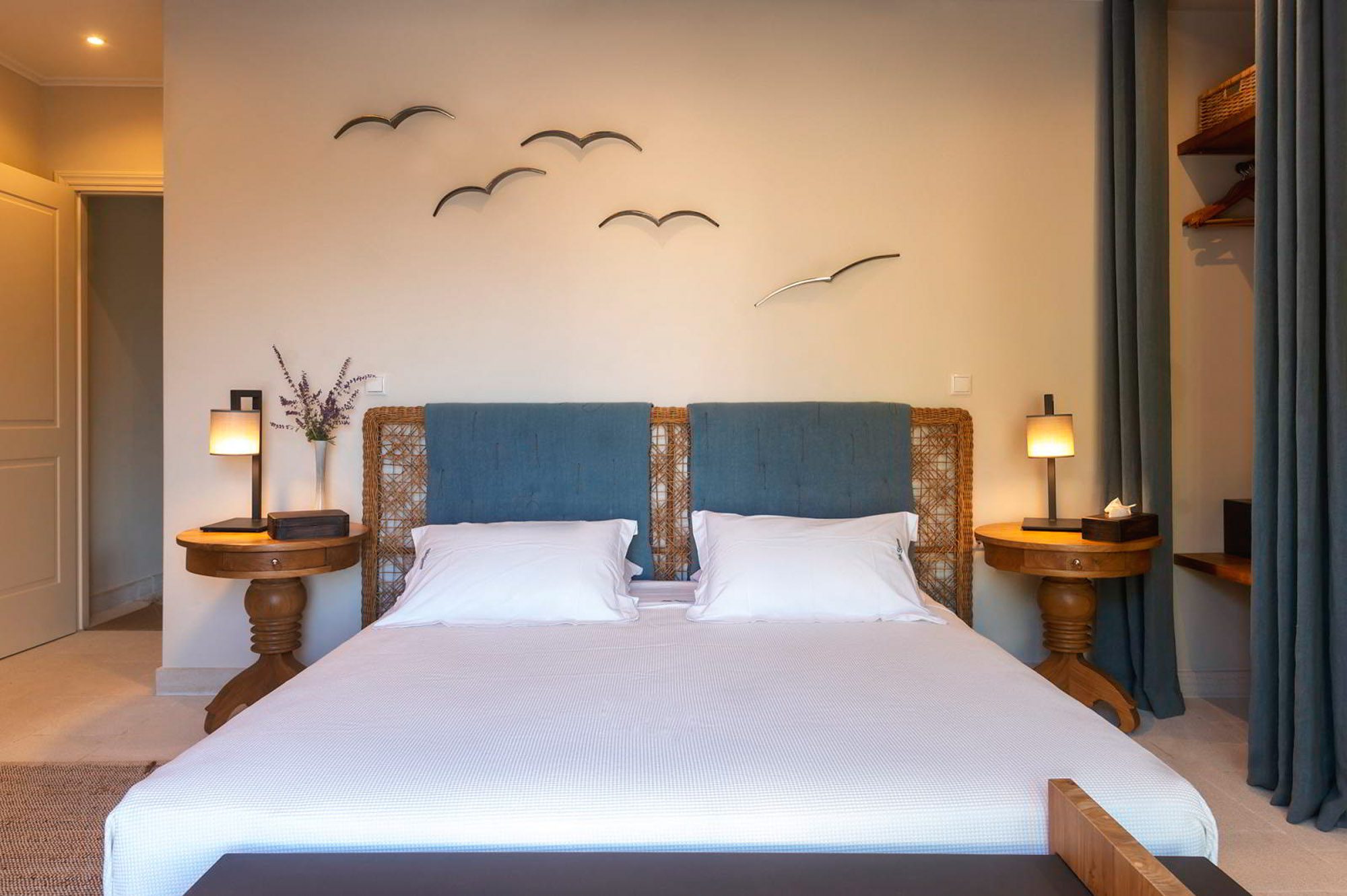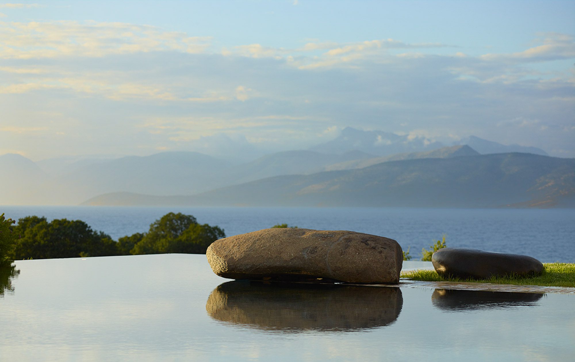 Sited in the shade of the canopied outdoor kitchen/dining area, with glorious sea views. It’s also a special place to eat by sunlight or candlelight. There’s also a further dining table for 12, on the pool terrace, a stylish outdoor lounge, hammocks for lazing, steamer chairs and sun beds to relax on, and a large cushioned day bed at one end of the L-shaped infinity pool. The garden has swings and toys for children, and seasonal fruits and vegetables are grown for guests to enjoy.
