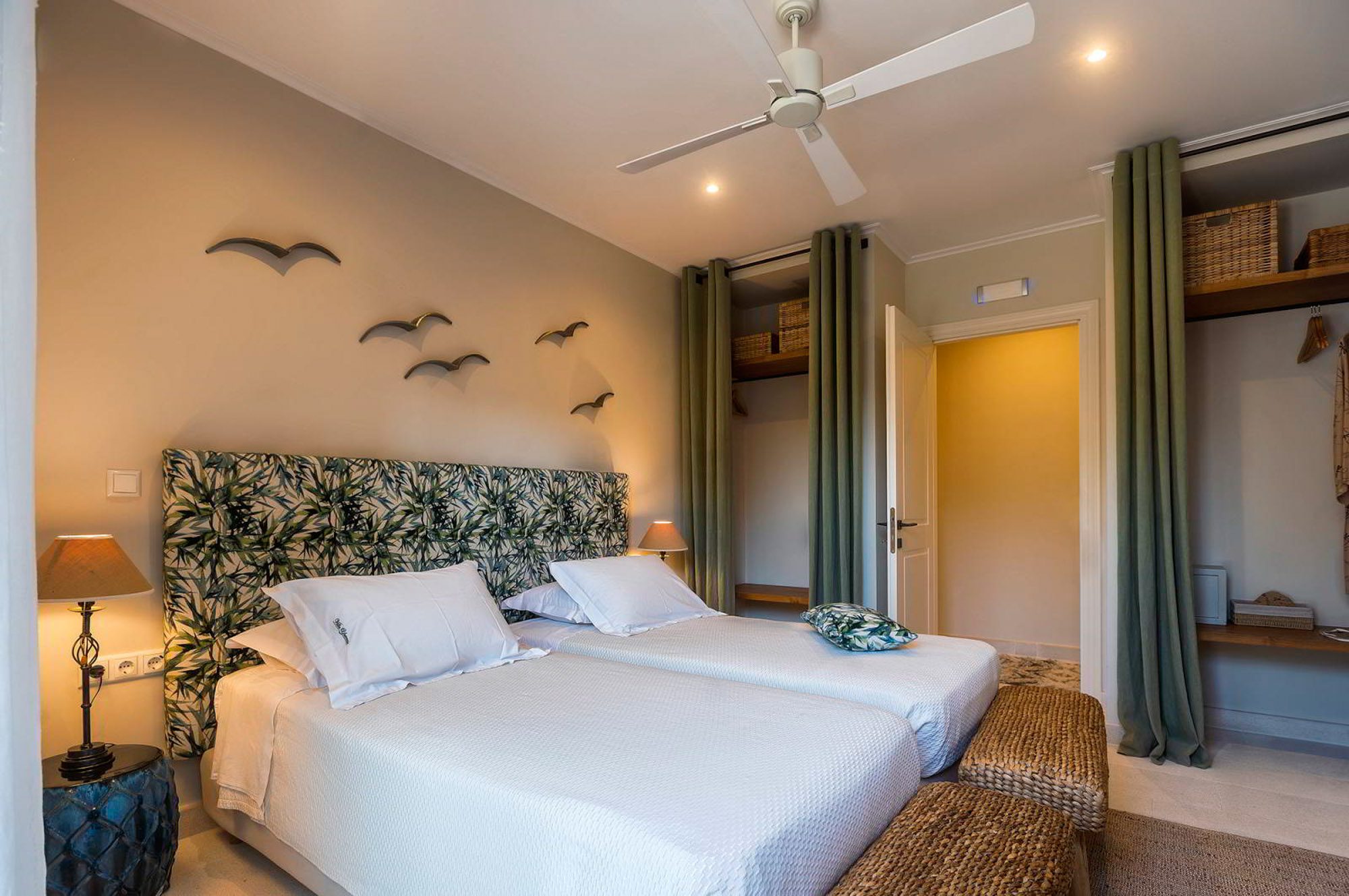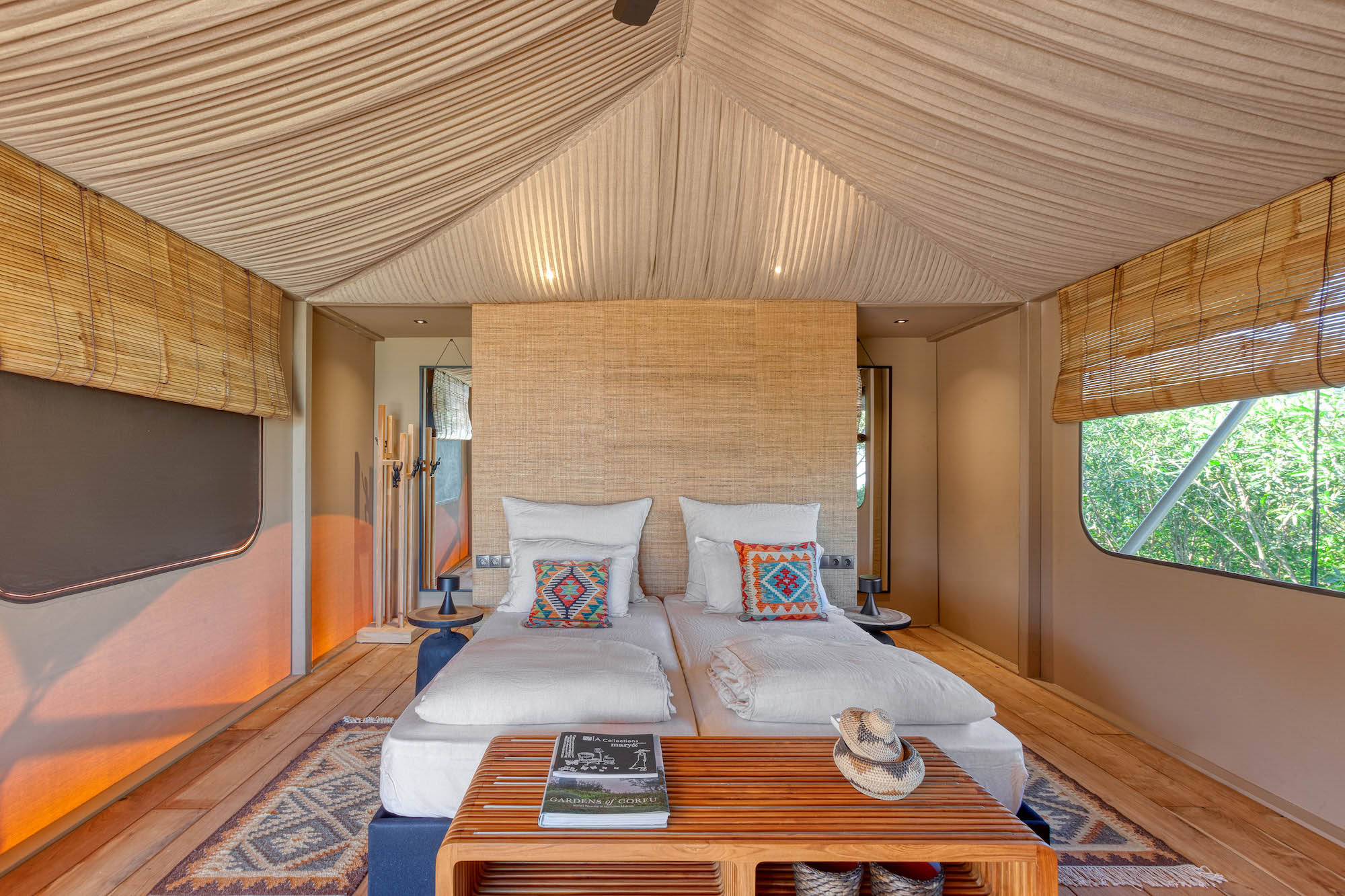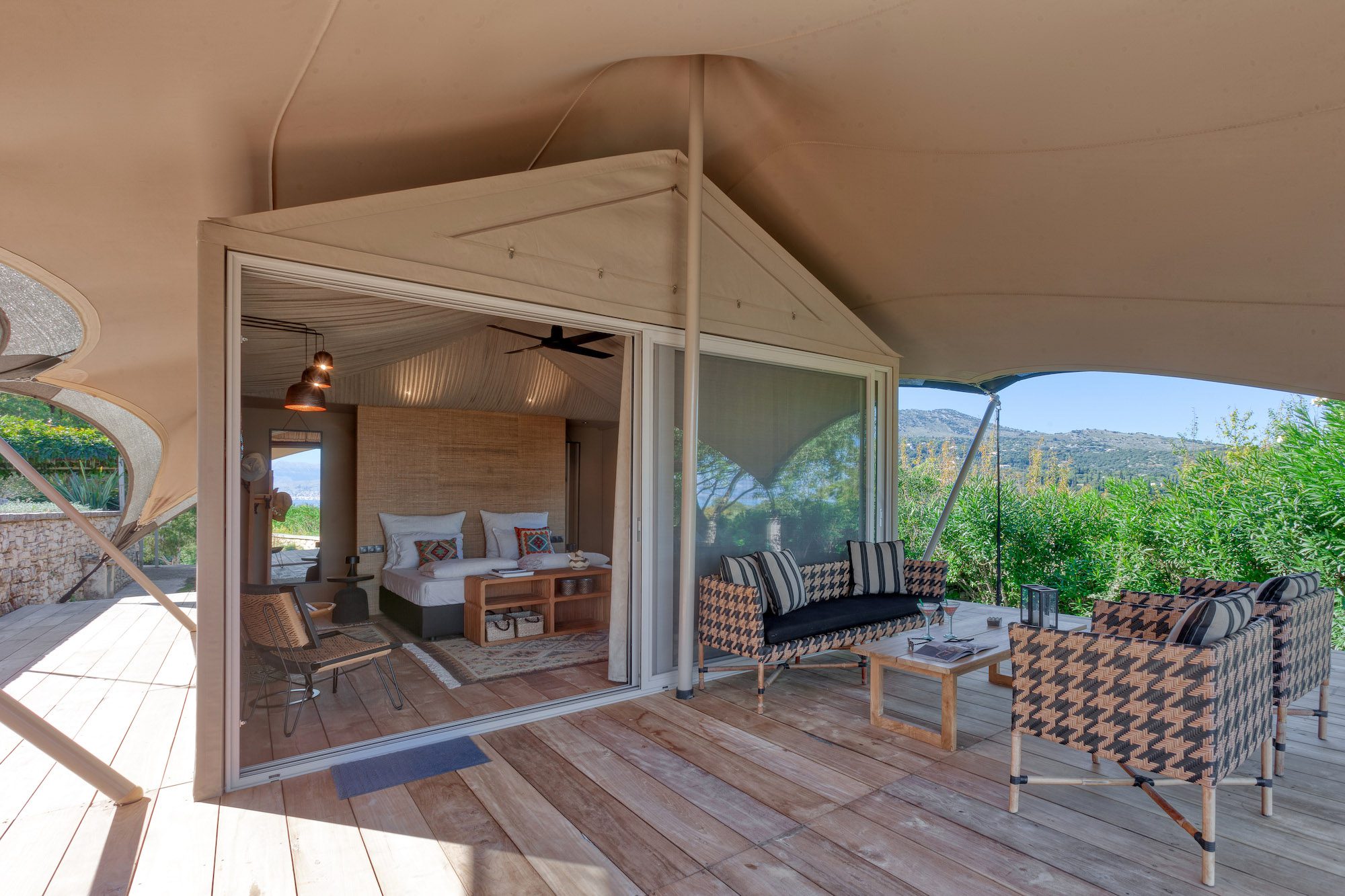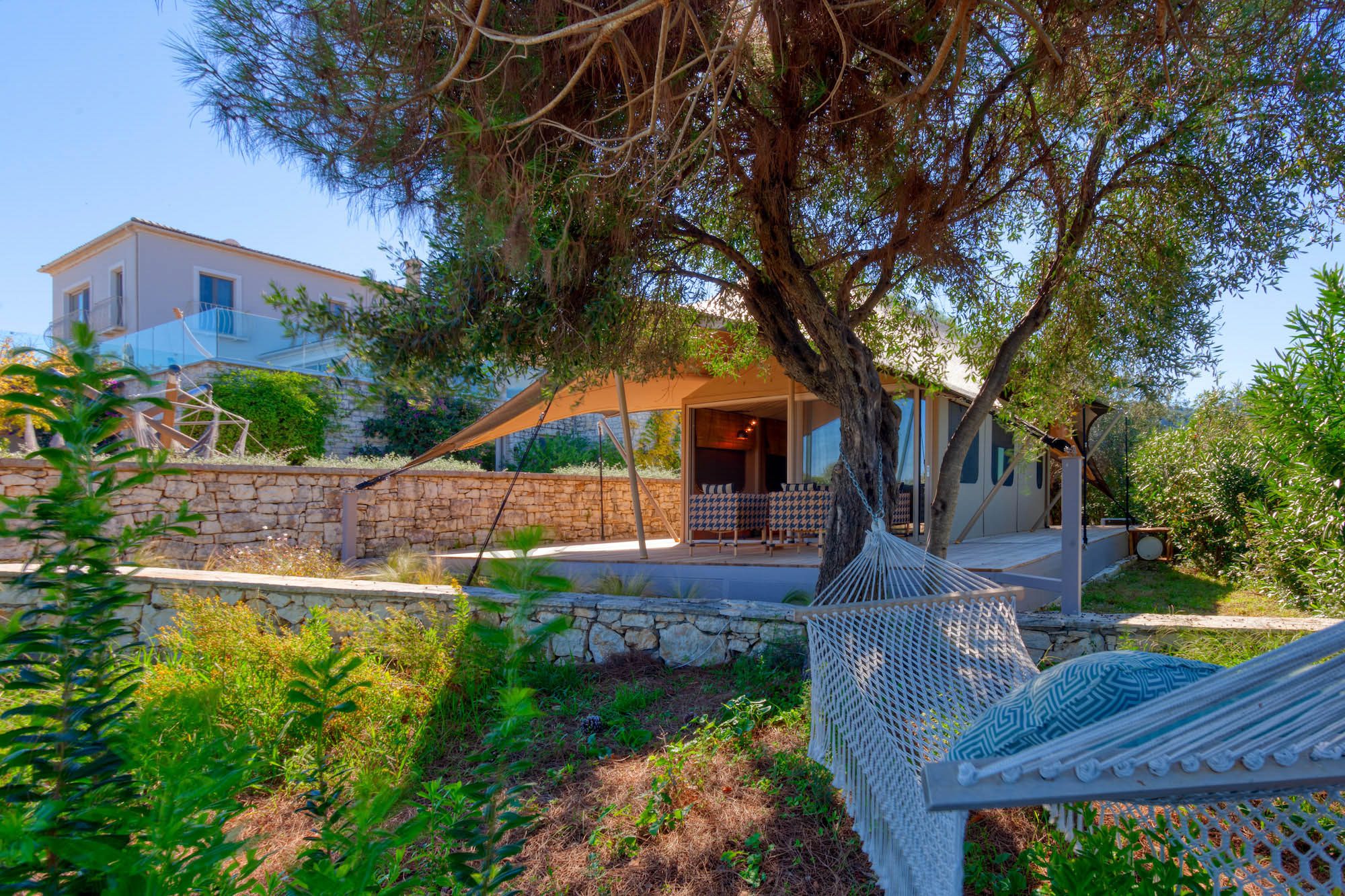 Along with the five spacious bedrooms in the main house, there’s an atmospheric safari-style tented garden suite for two. All bedrooms come with cotton robes, slippers and smart TVs. The large living and dining room on the villa’s ground floor has an arty boho vibe, and the large bi-fold doors connect the outside space. There’s also an additional media/living room and a range of children’s toys. Another interesting feature is the first-floor gym, which has a retractable roof.