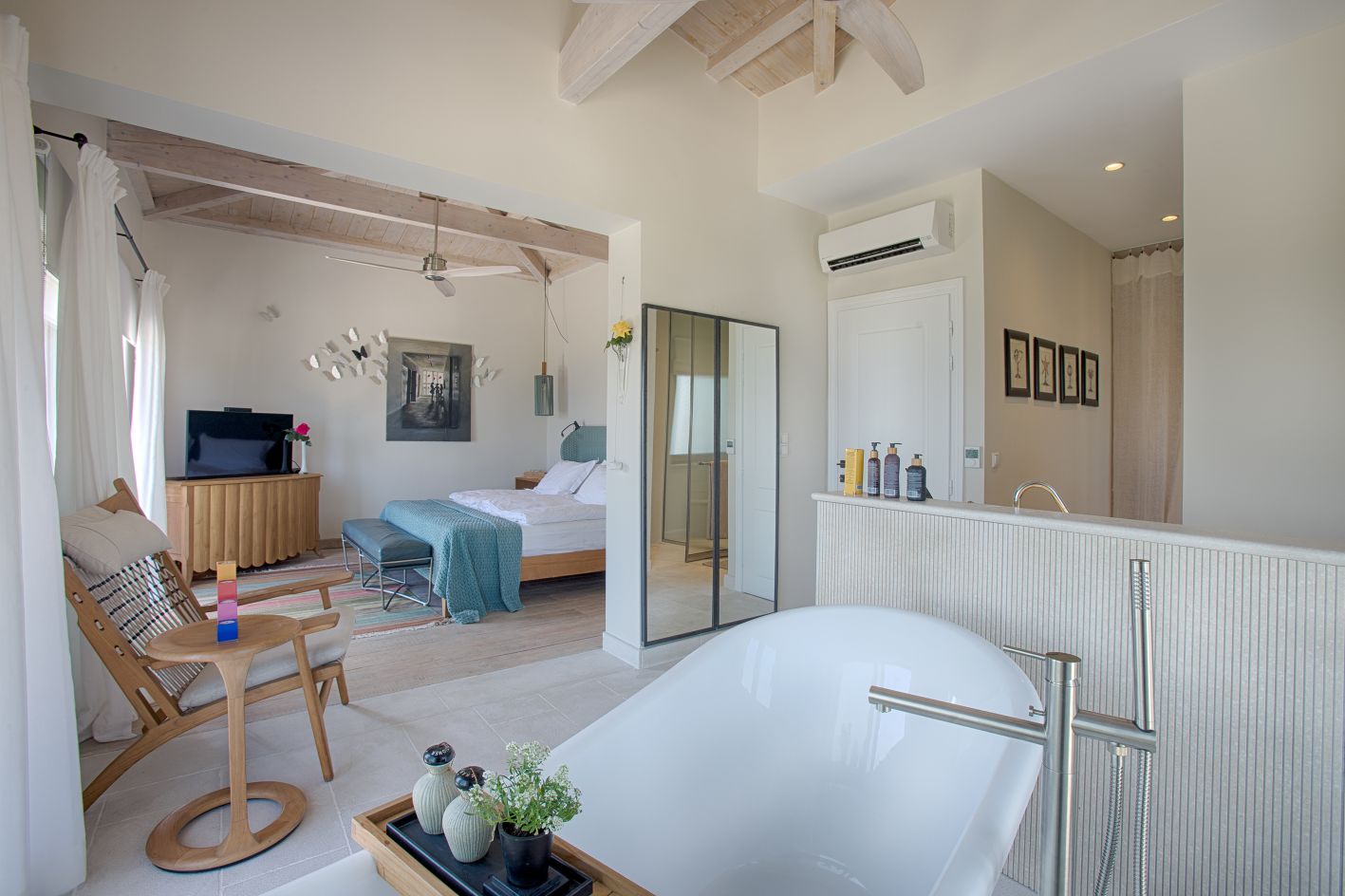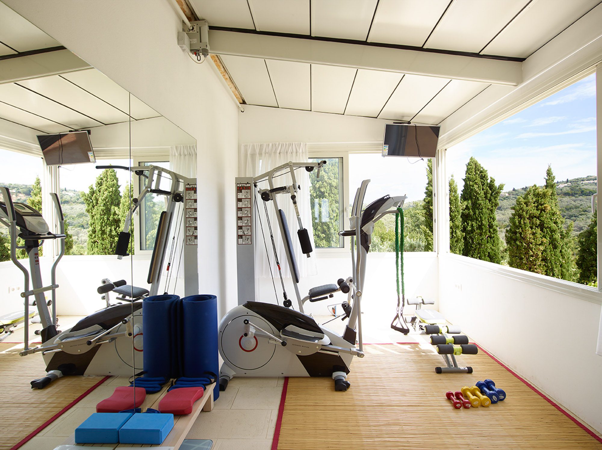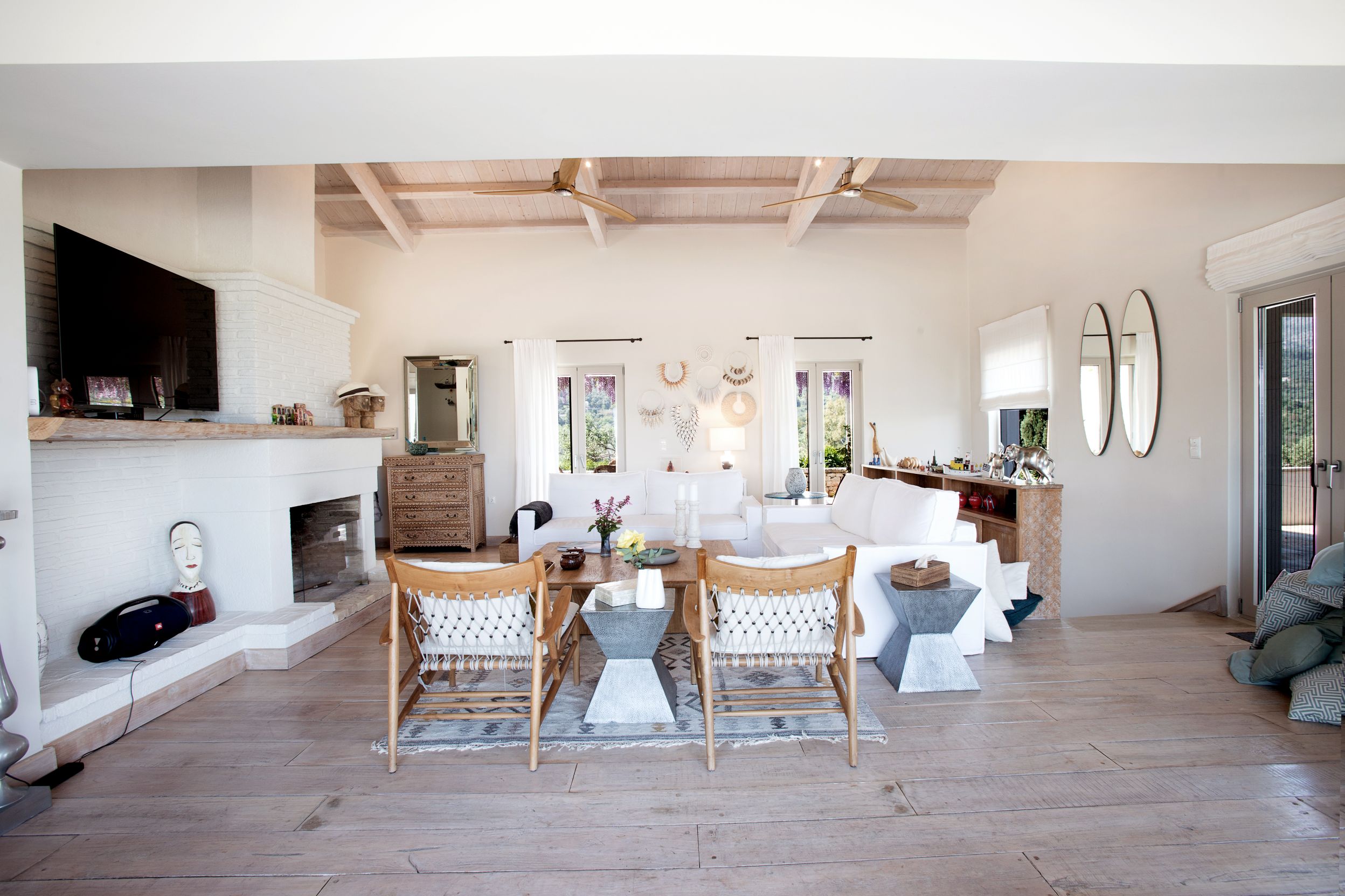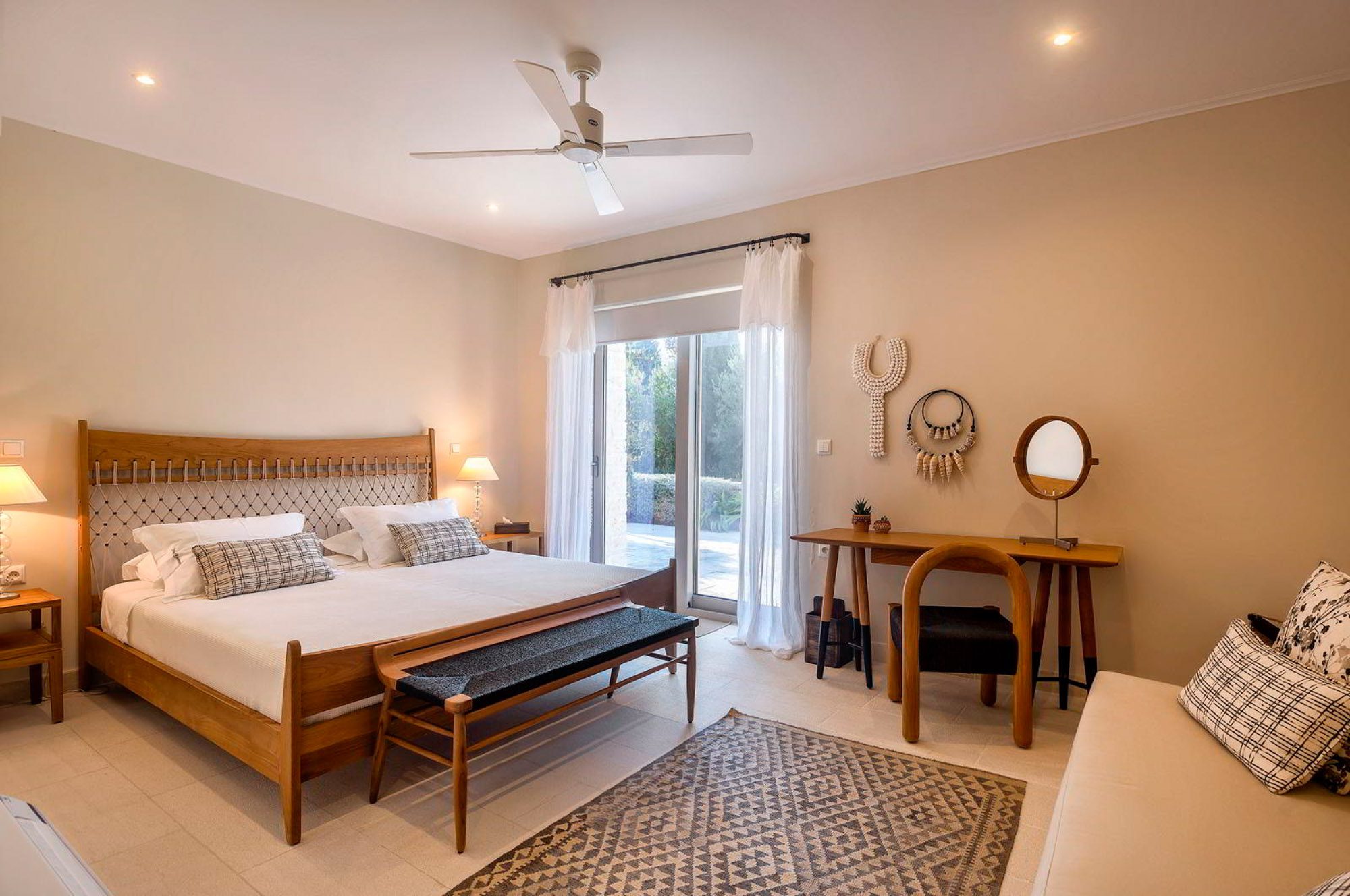 Along with the five spacious bedrooms in the main house, there’s an atmospheric safari-style tented garden suite for two. All bedrooms come with cotton robes, slippers and smart TVs. The large living and dining room on the villa’s ground floor has an arty boho vibe, and the large bi-fold doors connect the outside space. There’s also an additional media/living room and a range of children’s toys. Another interesting feature is the first-floor gym, which has a retractable roof.