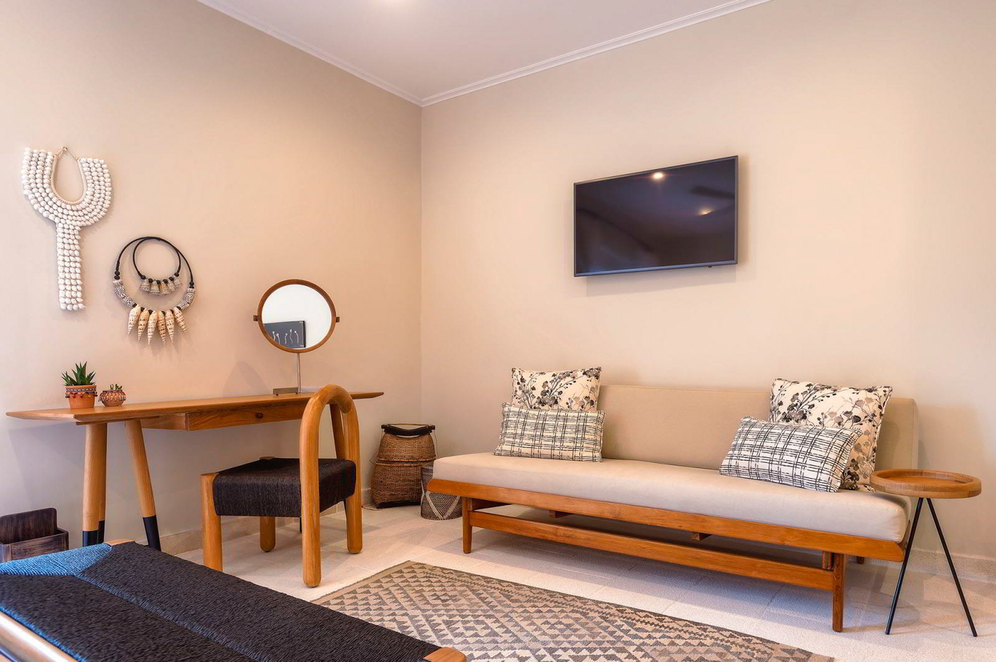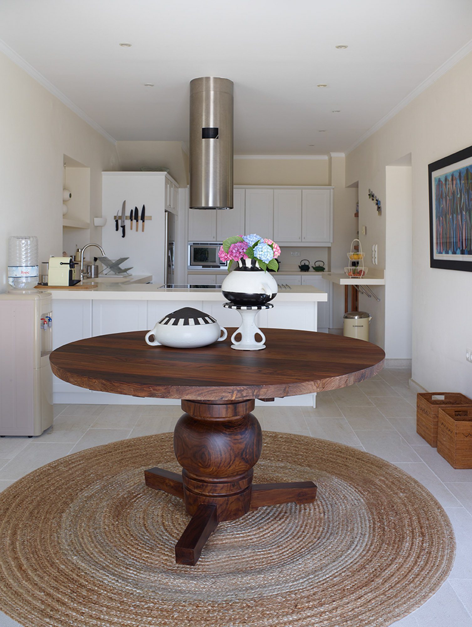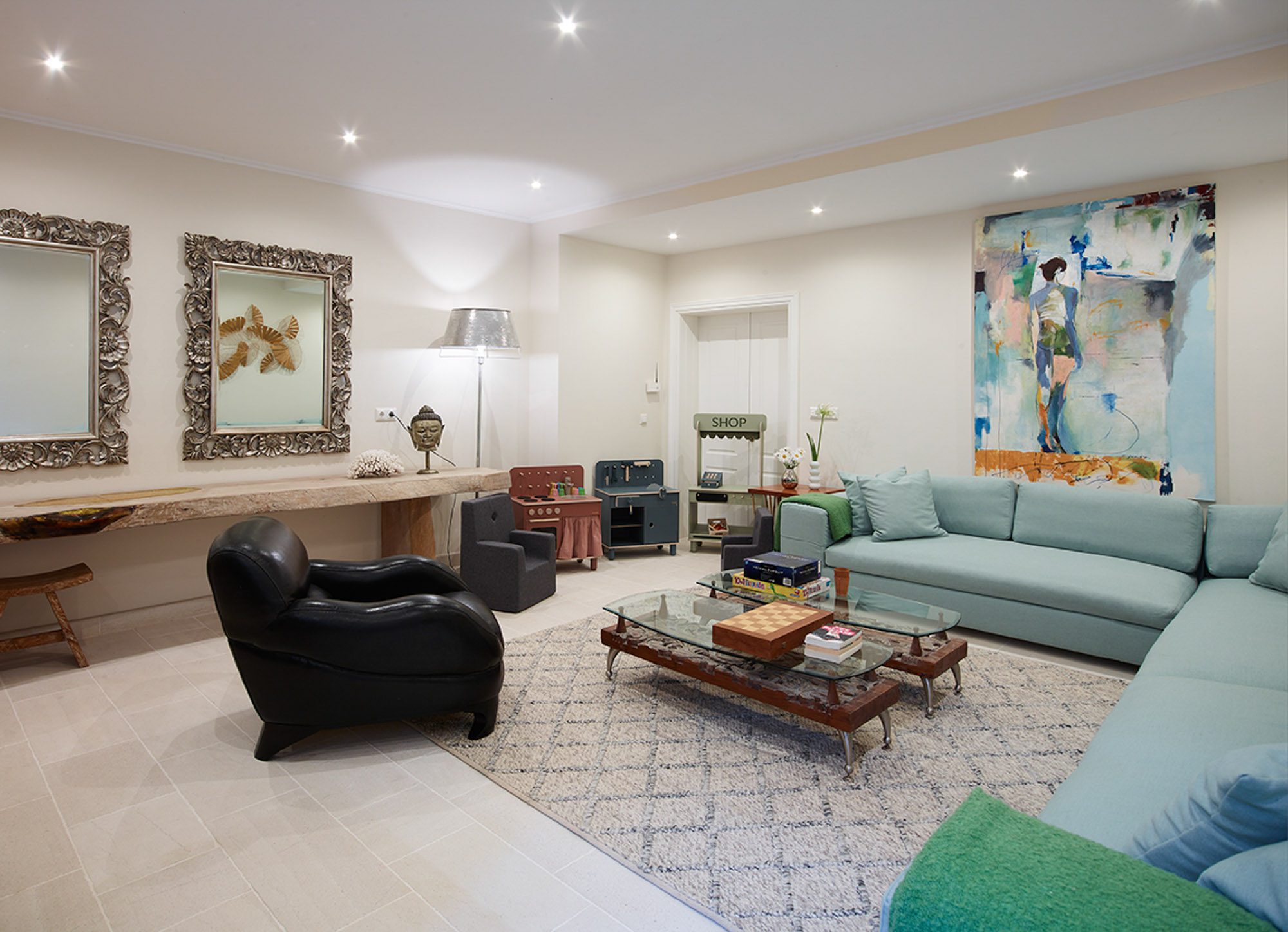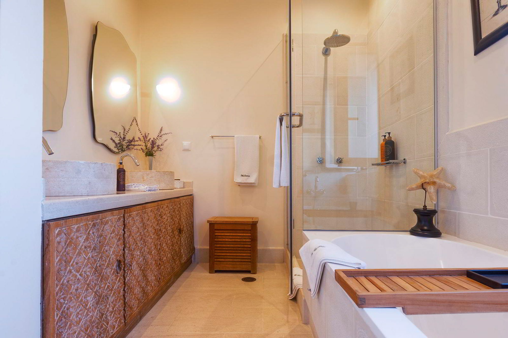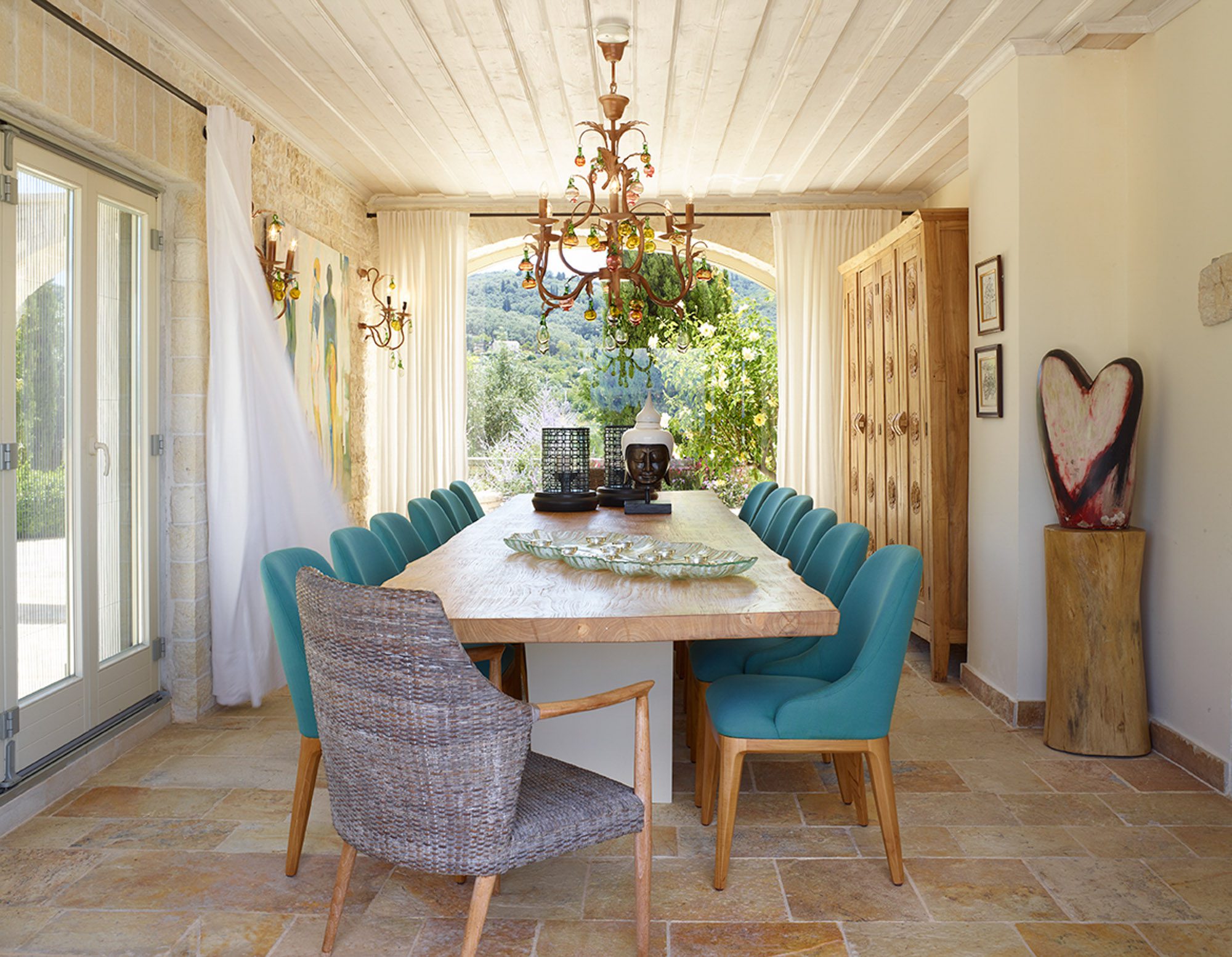 Along with the five spacious bedrooms in the main house, there’s an atmospheric safari-style tented garden suite for two. All bedrooms come with cotton robes, slippers and smart TVs. The large living and dining room on the villa’s ground floor has an arty boho vibe, and the large bi-fold doors connect the outside space. There’s also an additional media/living room and a range of children’s toys. Another interesting feature is the first-floor gym, which has a retractable roof.