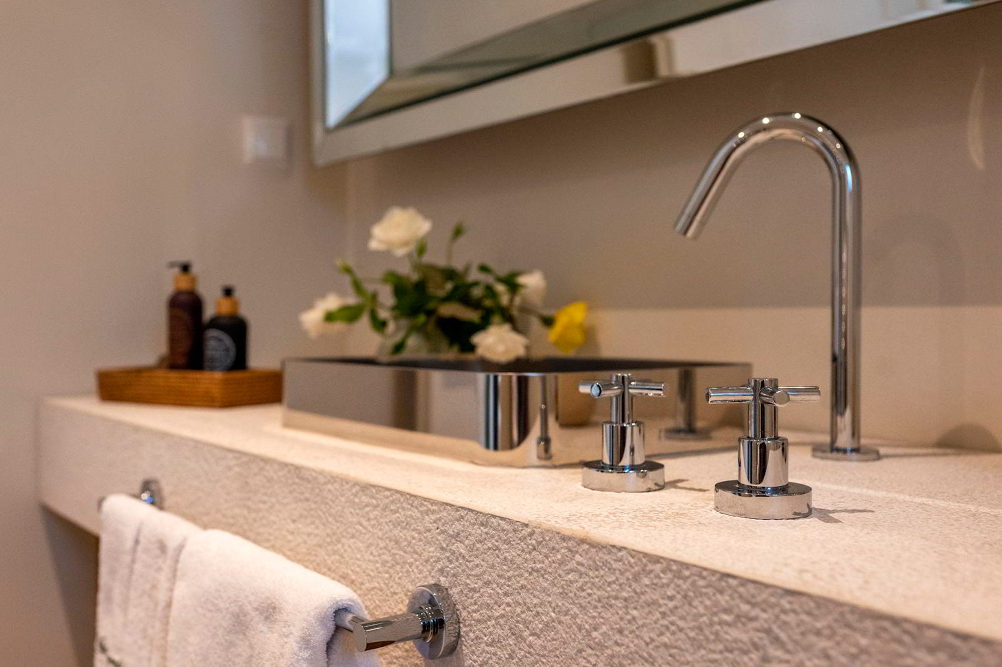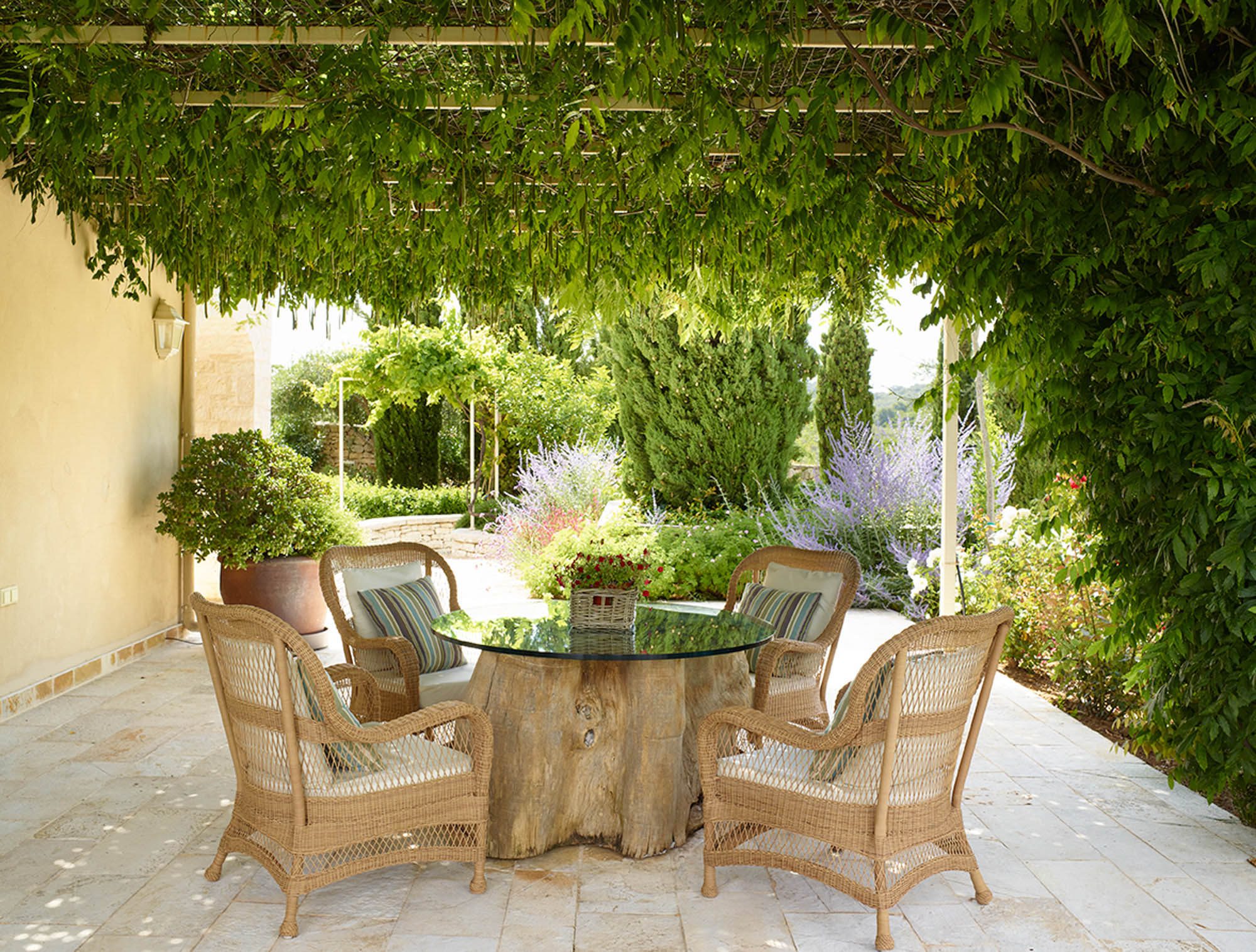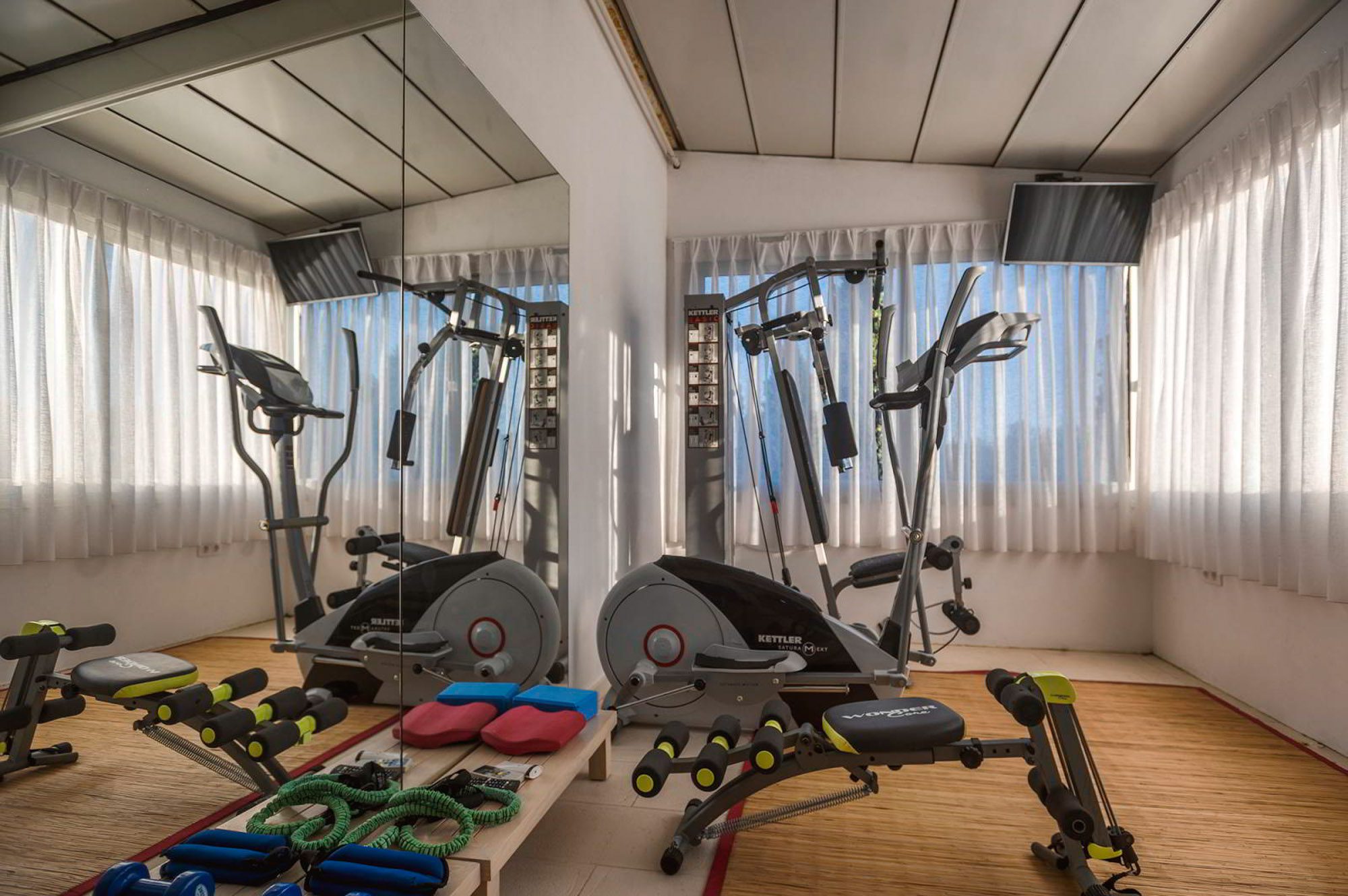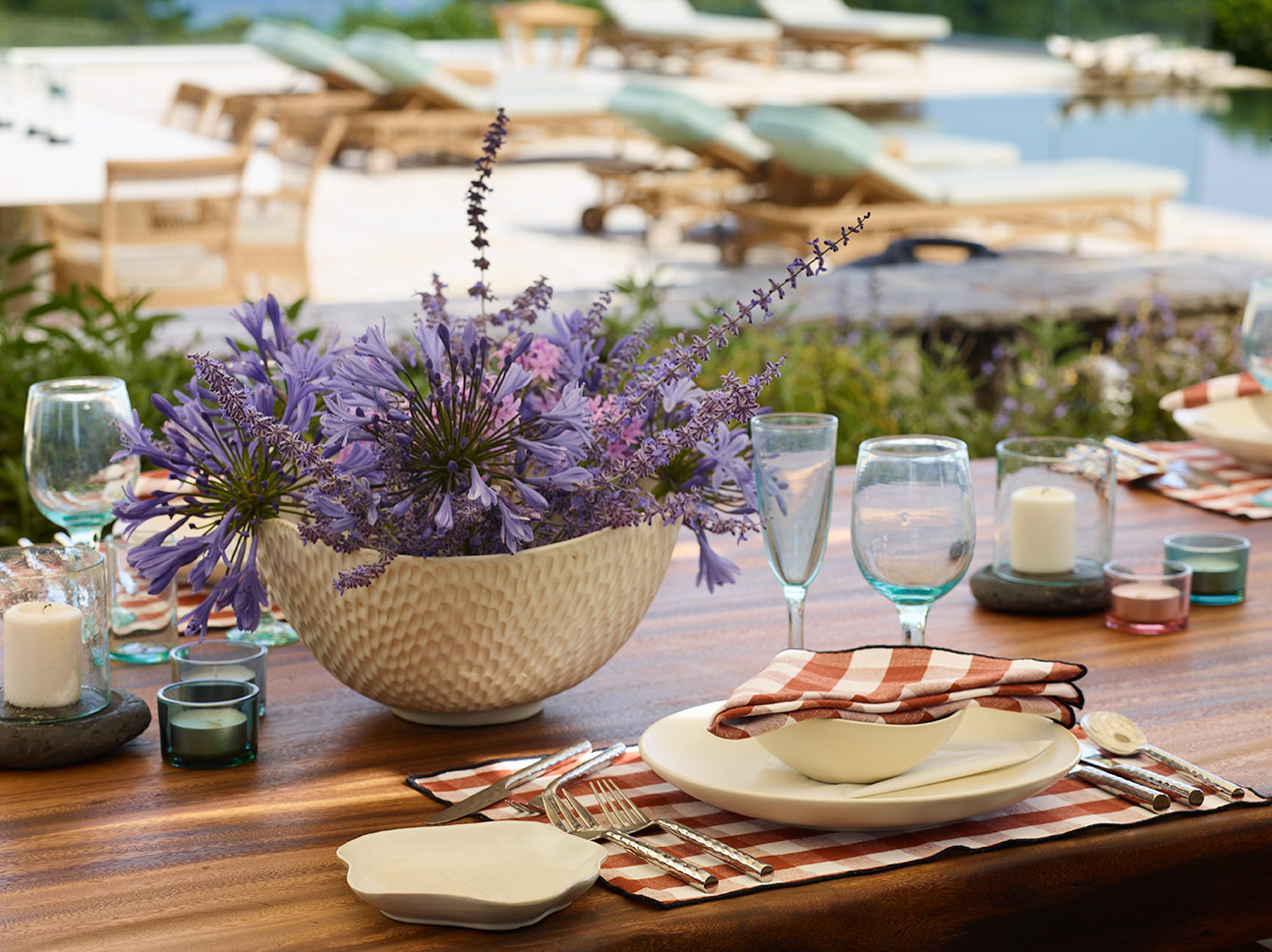 Along with the five spacious bedrooms in the main house, there’s an atmospheric safari-style tented garden suite for two. All bedrooms come with cotton robes, slippers and smart TVs. The large living and dining room on the villa’s ground floor has an arty boho vibe, and the large bi-fold doors connect the outside space. There’s also an additional media/living room and a range of children’s toys. Another interesting feature is the first-floor gym, which has a retractable roof.