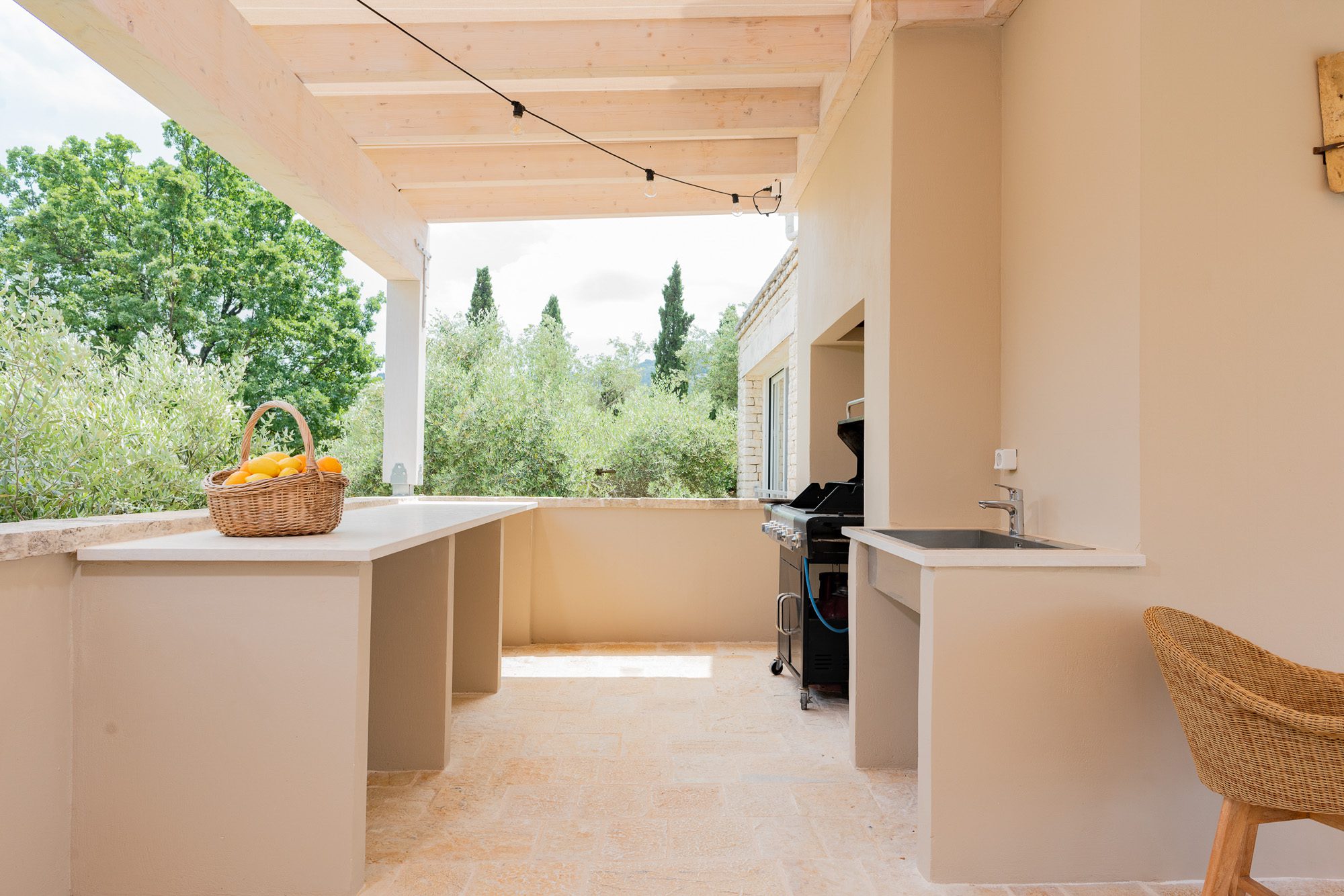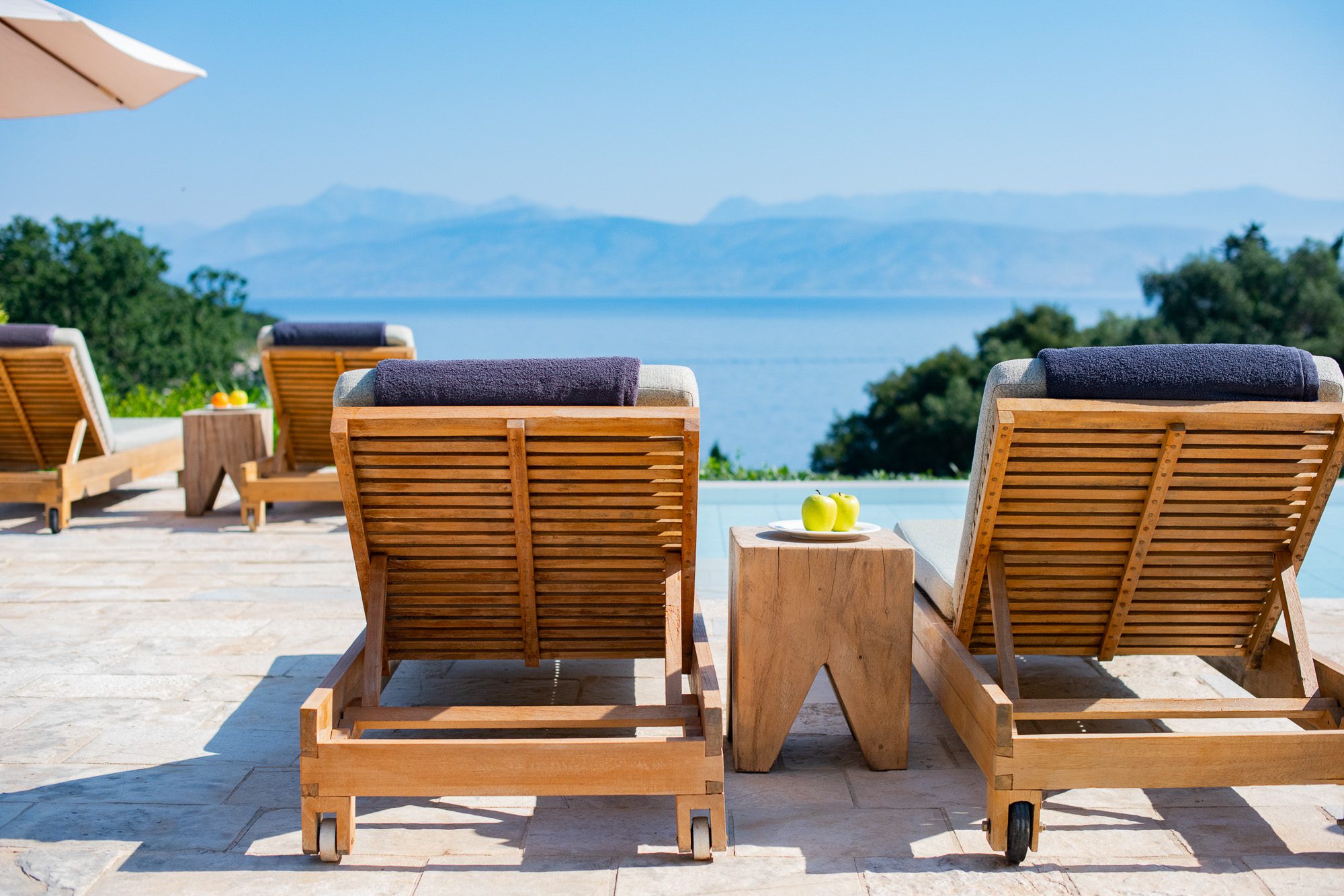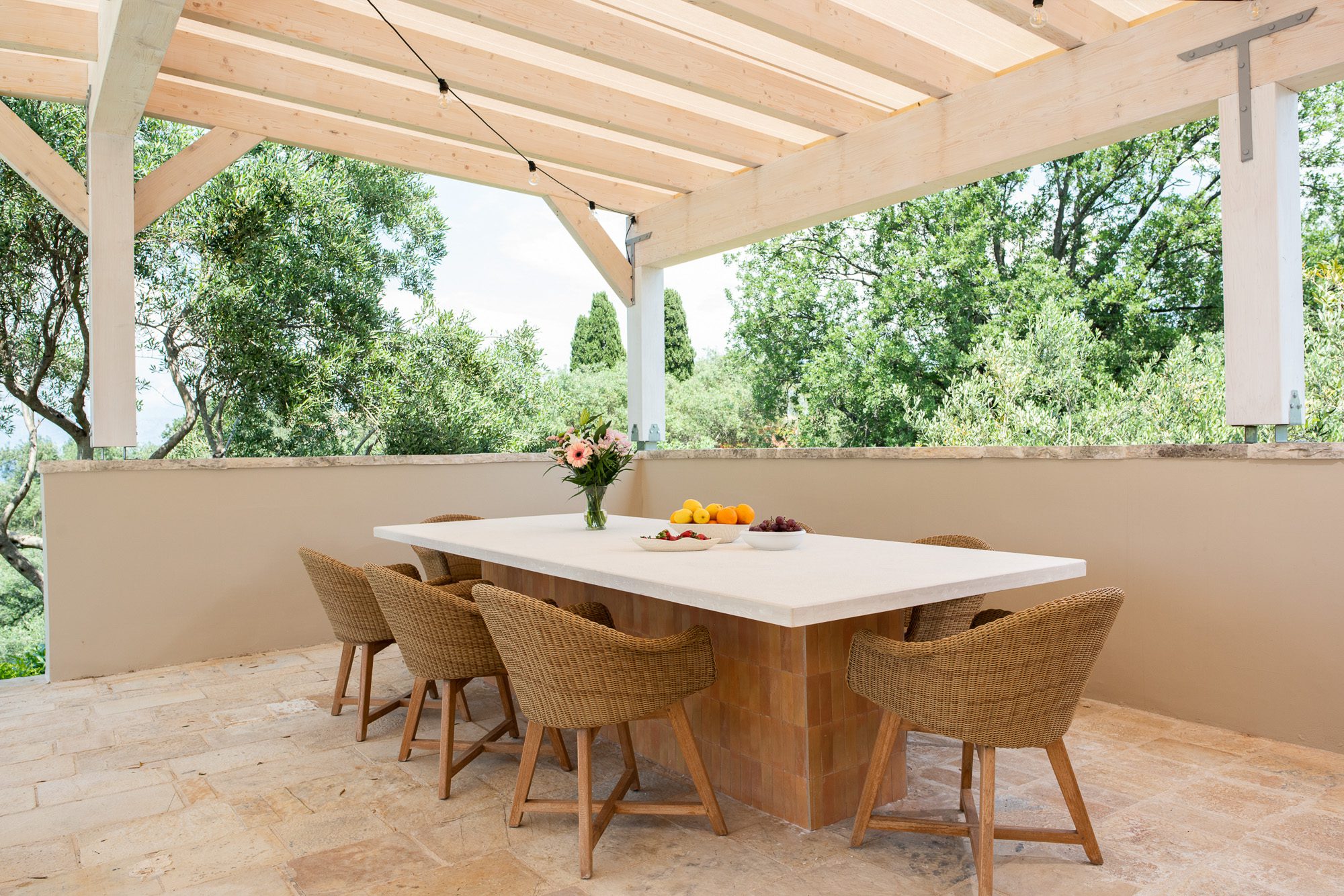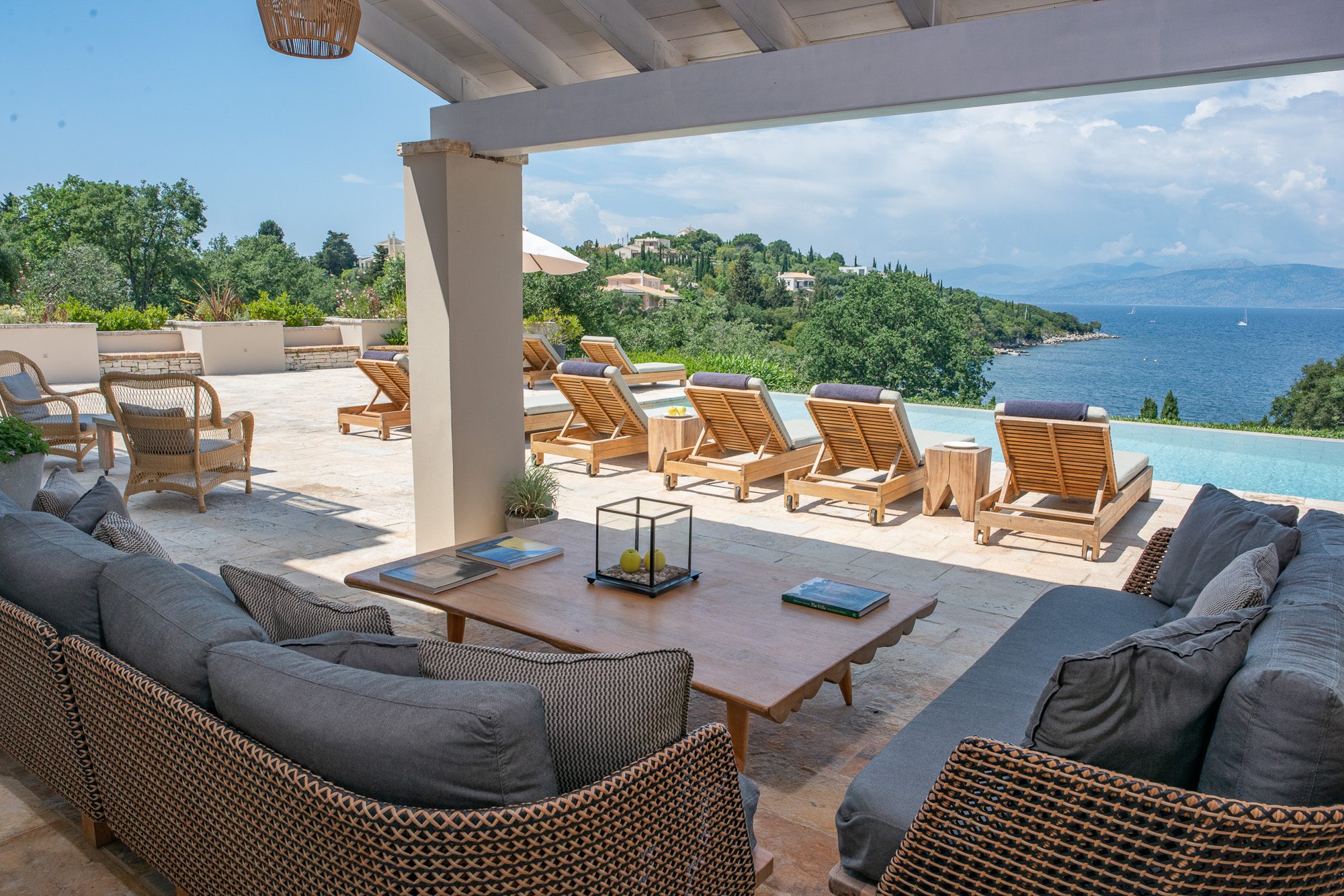 French doors lead from the house to a shaded outdoor dining area and comfortable lounge. The long wooden table comfortably seats 12 here and there's a further table and chairs under a poolside pergola. Around the terrace, there's plenty of space to position the cushioned, wooden sun loungers to relax in the sun or shade, and if you fancy a dip in the sea, you can take the path leading down through the grounds to the little beach and the estate jetty. Zogita is a wonderful place for a memorable Corfu family holiday.