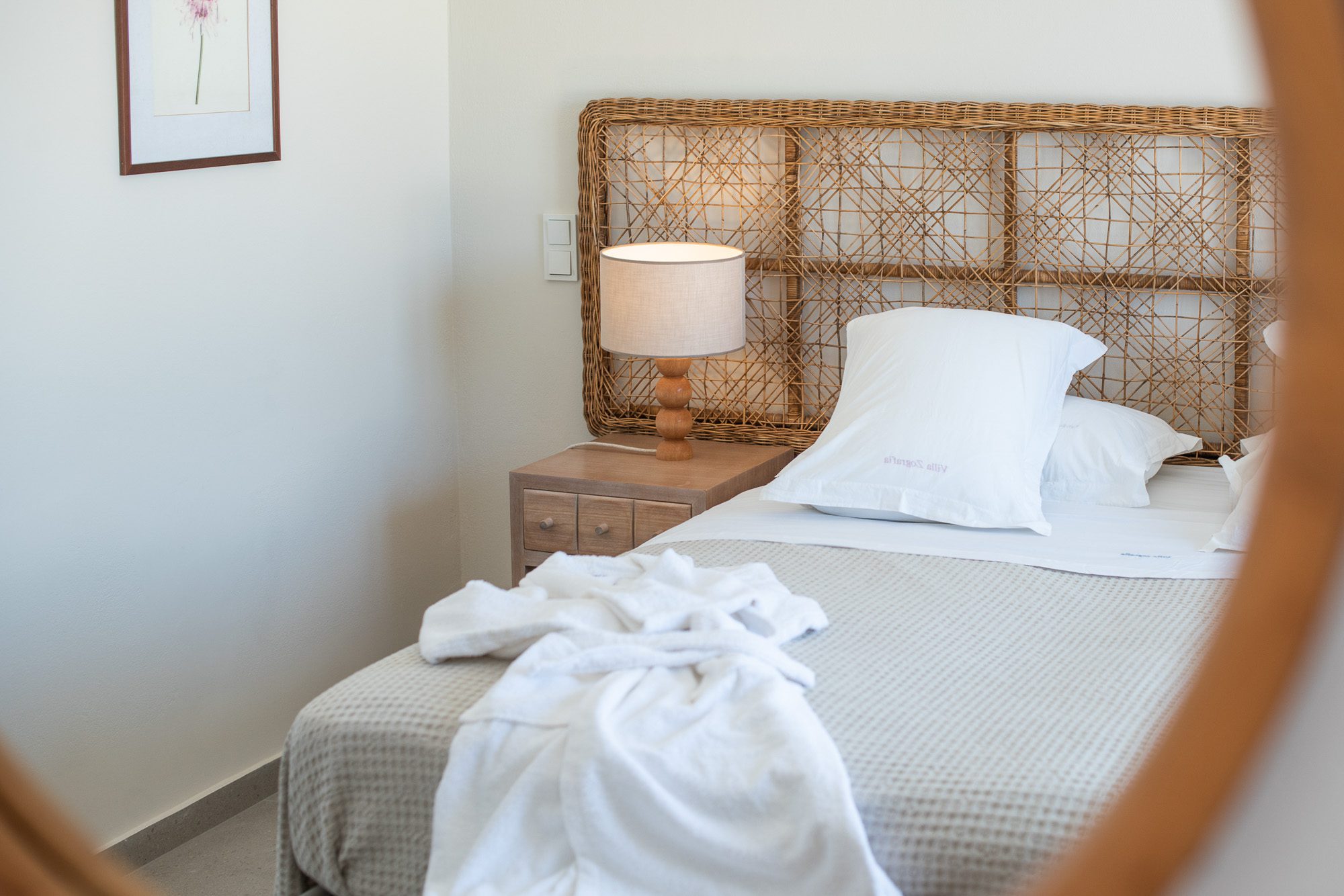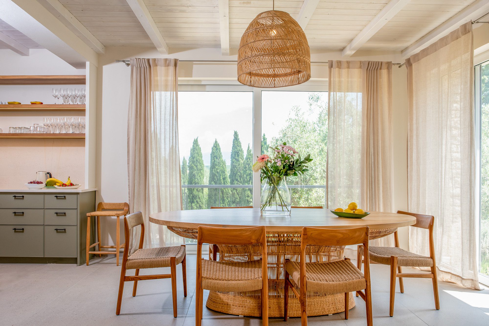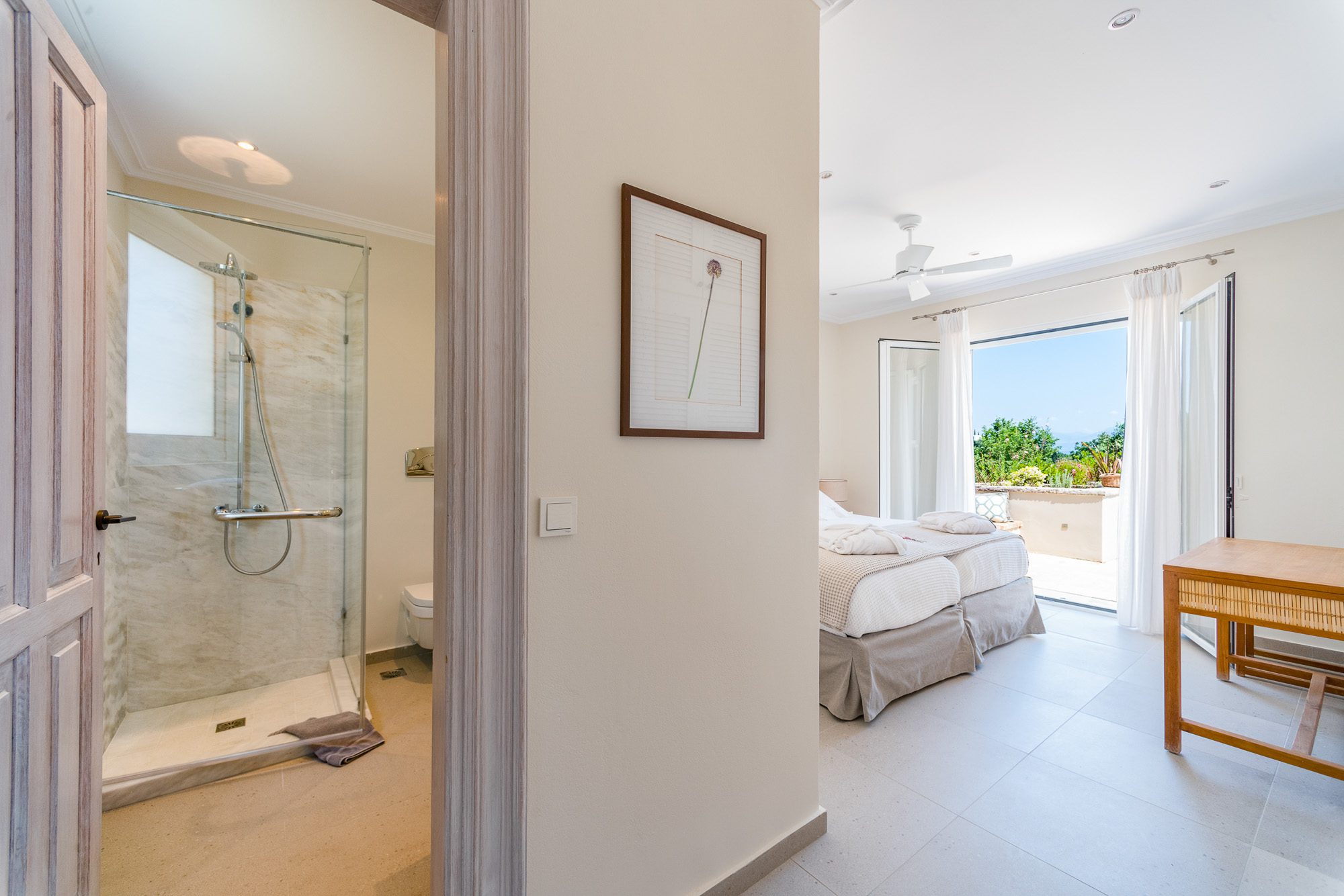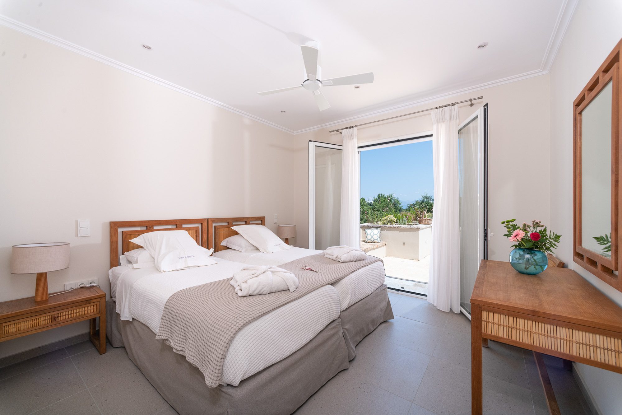 A range of contemporary wooden furniture, deep pale sofas, clean lines, and predominantly off-white interiors keep the spaces feeling light, bright, and spacious. Accommodation is set over three levels with five bedrooms, bathrooms, and ample living space. Ground-floor bedrooms have access to the pool terrace; the master bedroom on the first floor has a private balcony with far-reaching views. It is a practically designed house for a large gathering, giving guests both privacy and space to gather together.