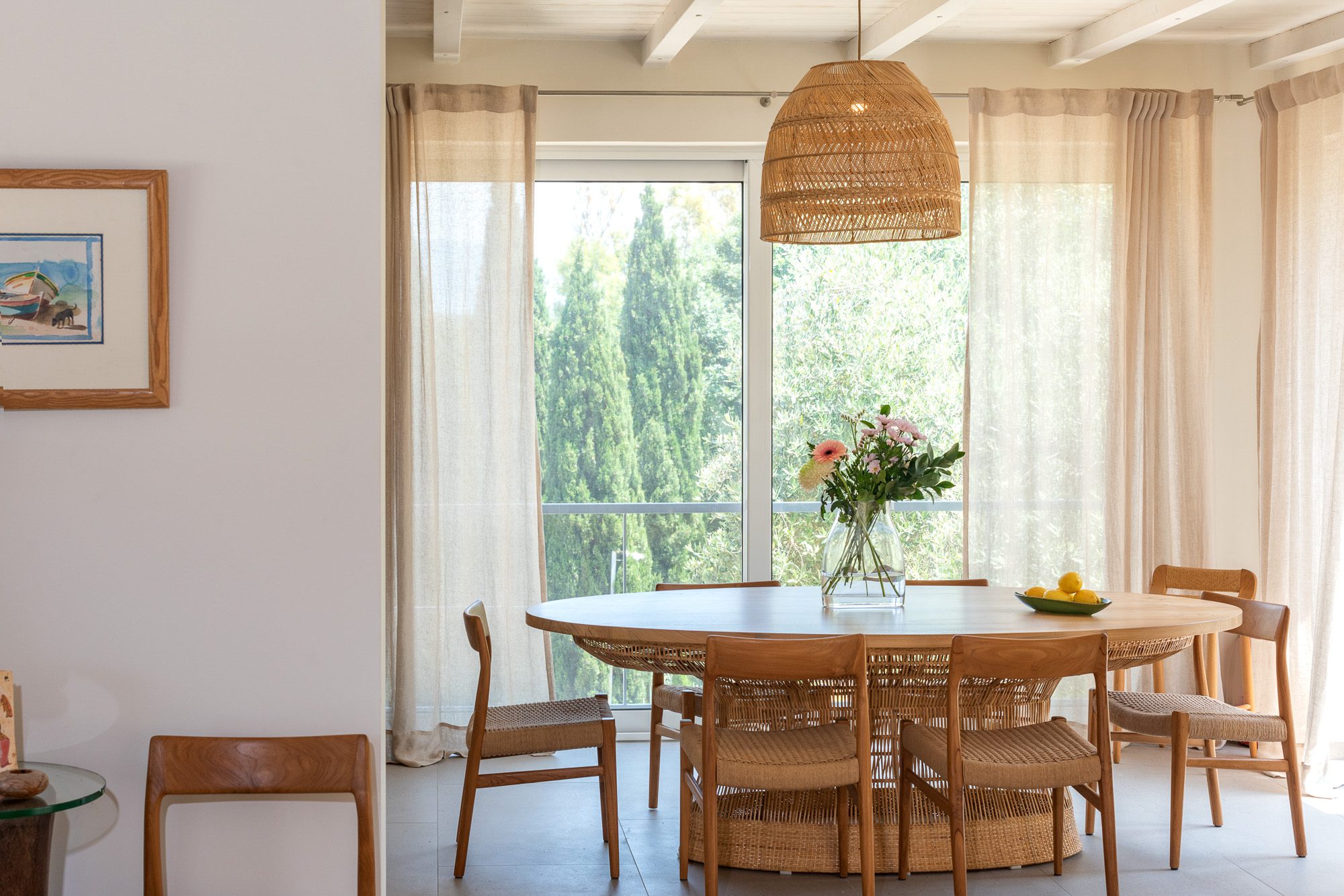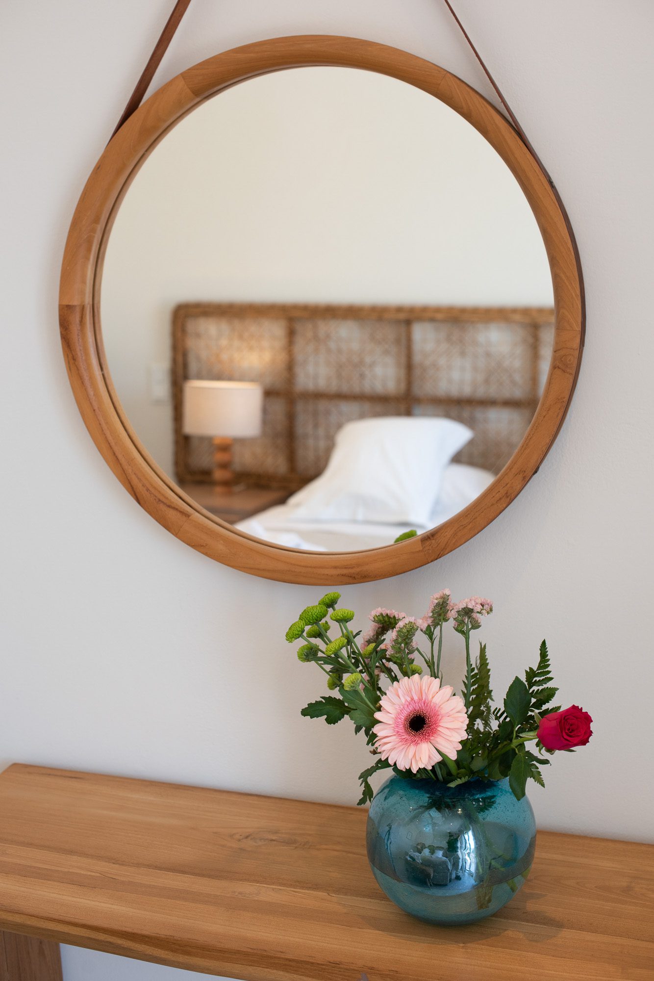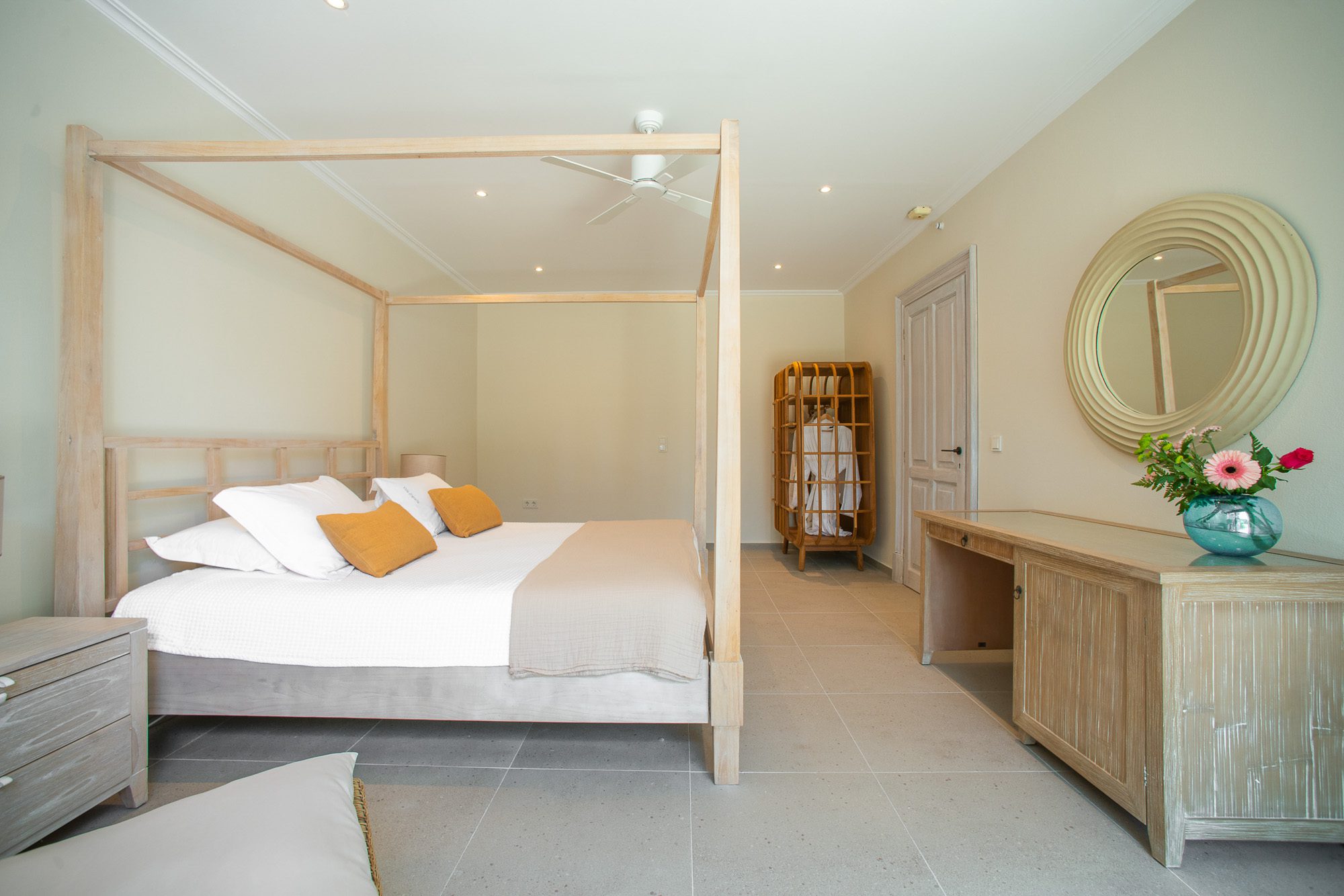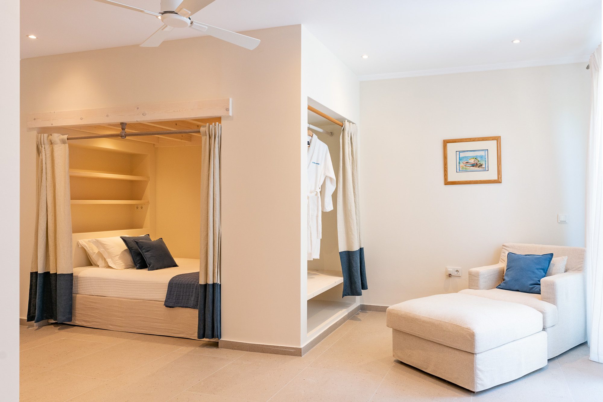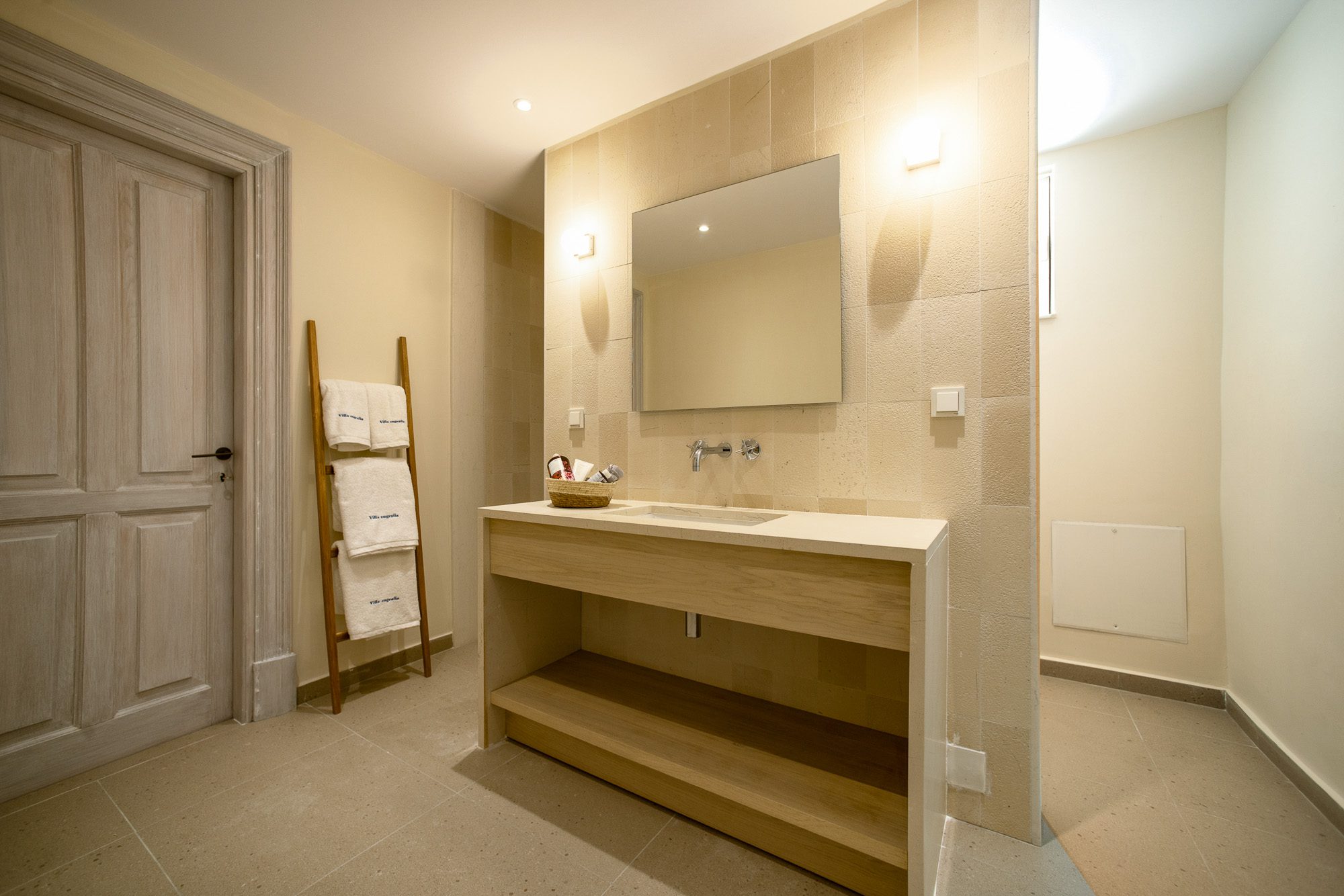 A range of contemporary wooden furniture, deep pale sofas, clean lines, and predominantly off-white interiors keep the spaces feeling light, bright, and spacious. Accommodation is set over three levels with five bedrooms, bathrooms, and ample living space. Ground-floor bedrooms have access to the pool terrace; the master bedroom on the first floor has a private balcony with far-reaching views. It is a practically designed house for a large gathering, giving guests both privacy and space to gather together.