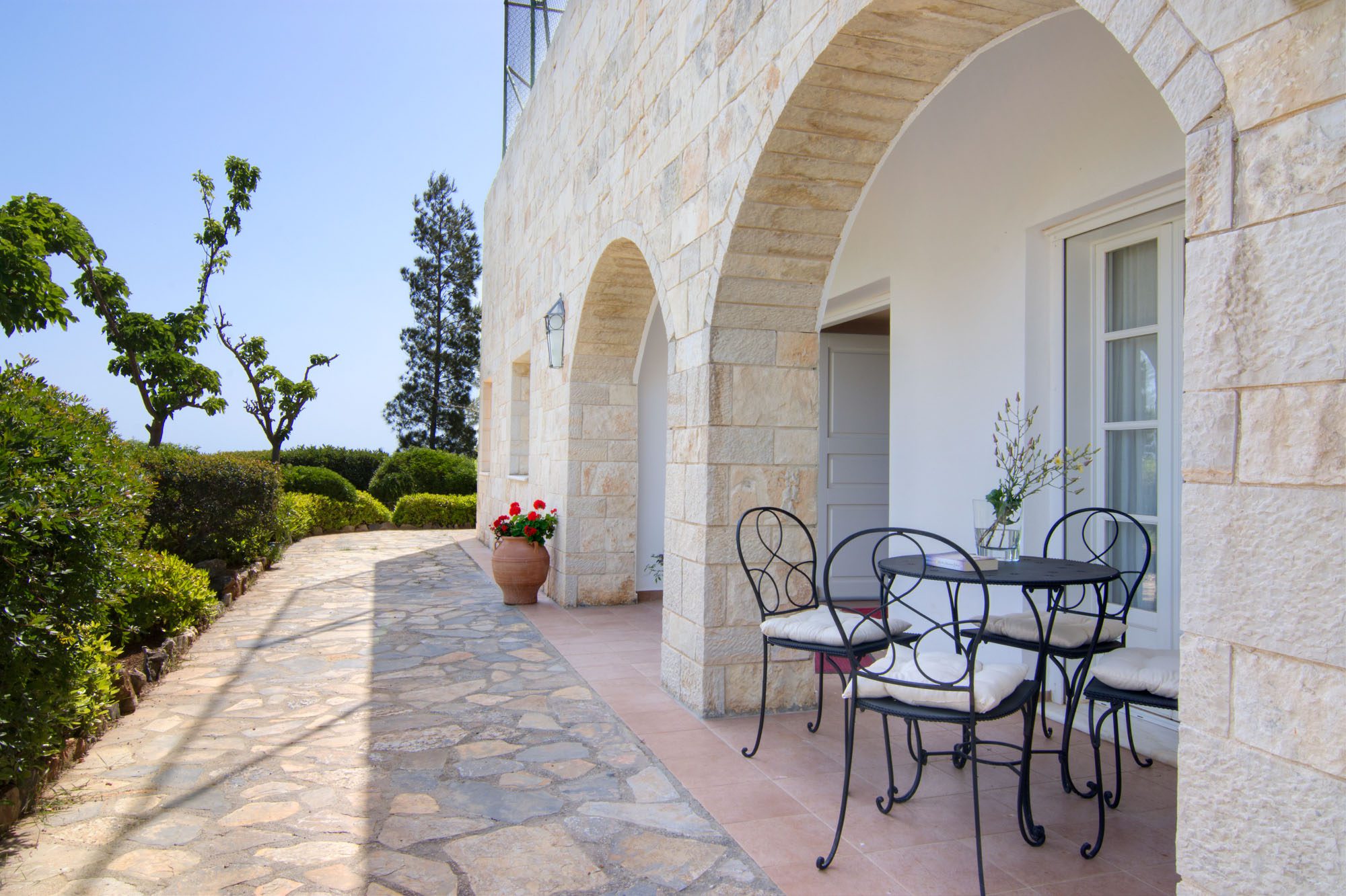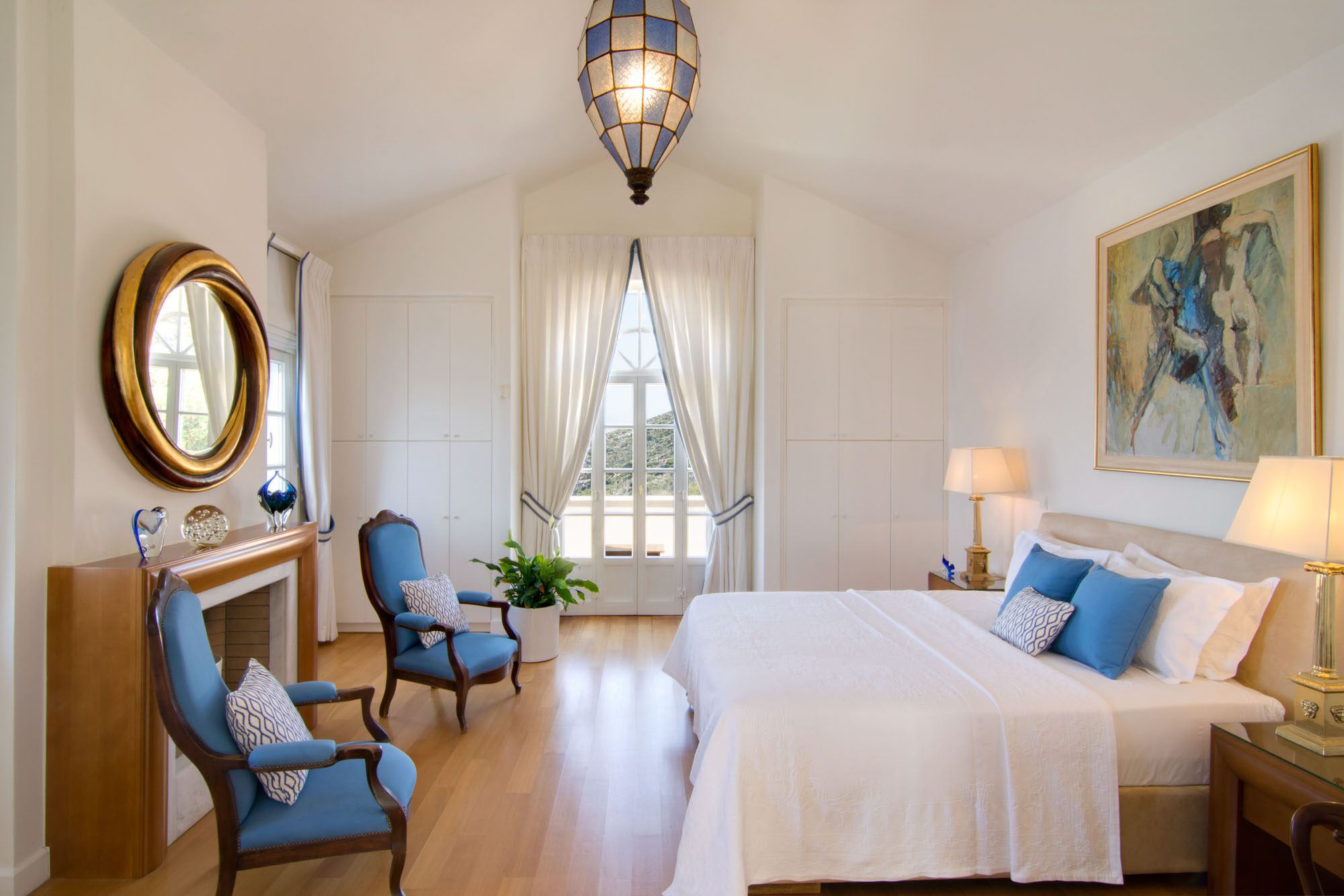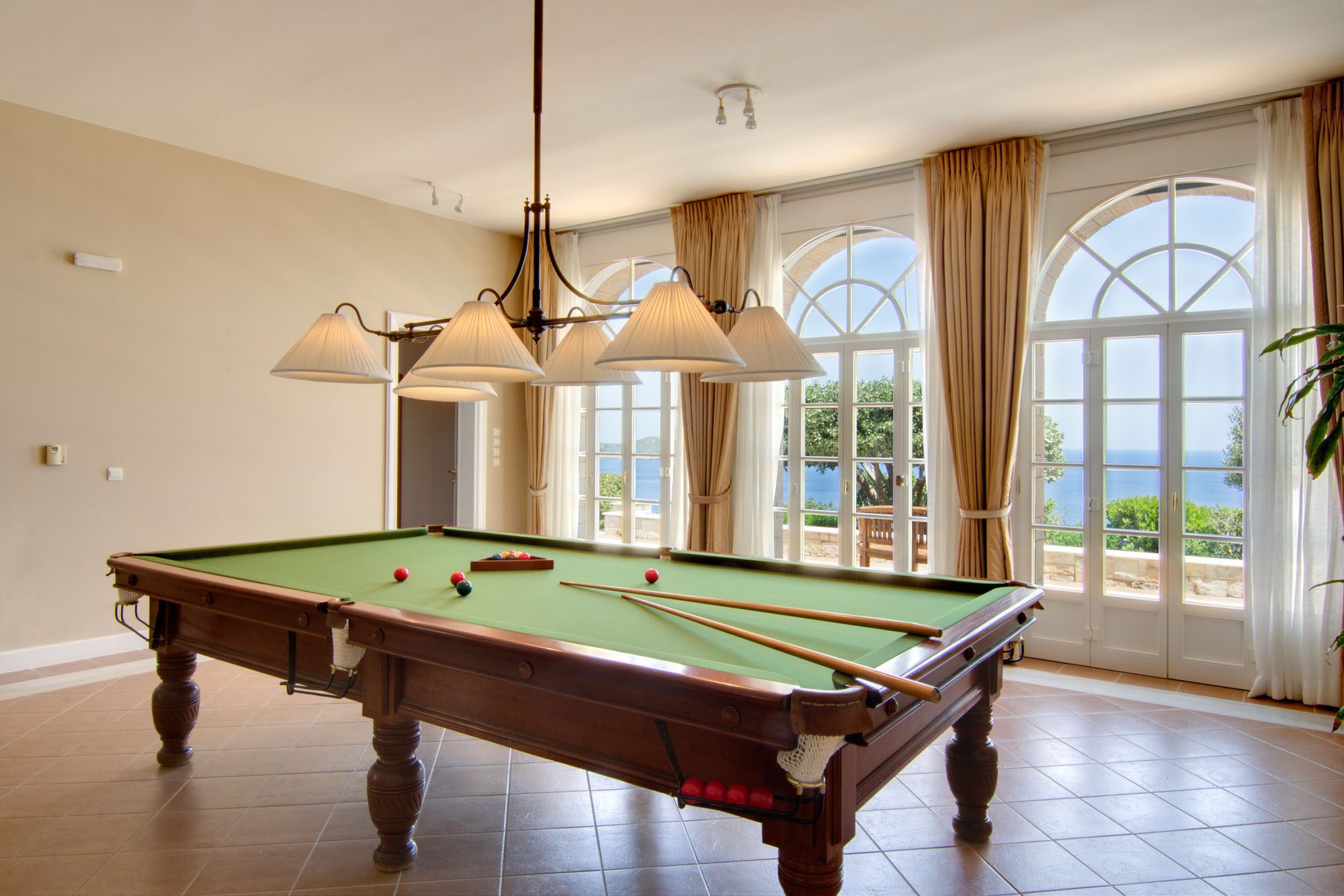 The living room opens to panoramic sea views and features a six-hundred-year-old fireplace, adding a touch of history to its contemporary elegance. Each bedroom has an en suite bathroom and a private balcony or terrace, creating a blend of luxury and personal space. A games room with an antique billiards table and a library with a grand piano make Villa Olous a distinctive family retreat. A nearby two-bedroom cottage nestled beneath the tennis court provides an additional private space, ideal for a small family.