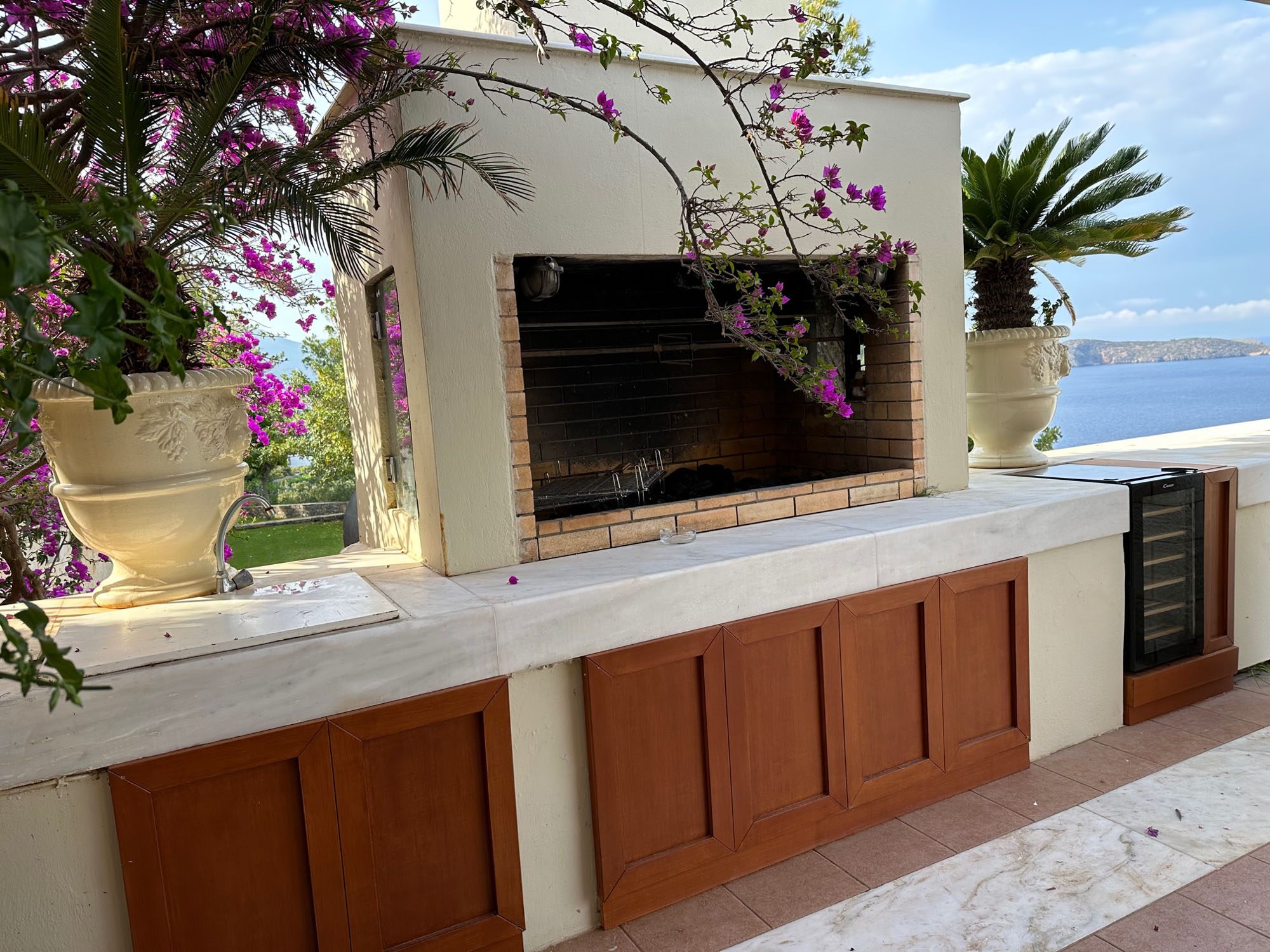 An infinity pool overlooks the sea, framed by a spacious patio complete with a barbecue and a dining area for 12. The private wooden sea deck features loungers, a sun umbrella and a fridge. Stone steps lead into the deep blue sea for those looking to swim on calm days. Guests also have access to a Davis Cup-sized tennis court and a boules court, while the estate’s picturesque Greek Orthodox chapel offers a peaceful patio with stunning sea views.