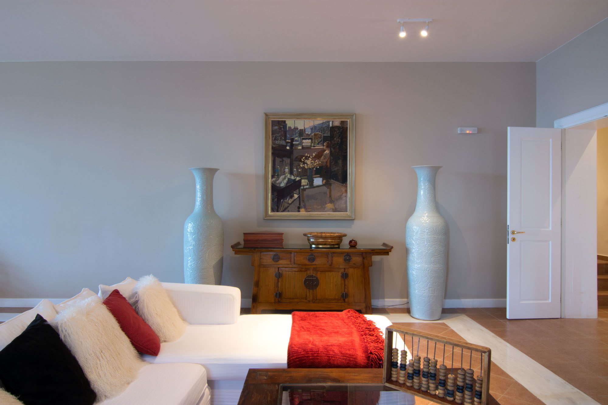The villa’s grounds are equally impressive, with lush olive groves, vibrant local flowers, and carefully placed sculptures enhancing its natural beauty.