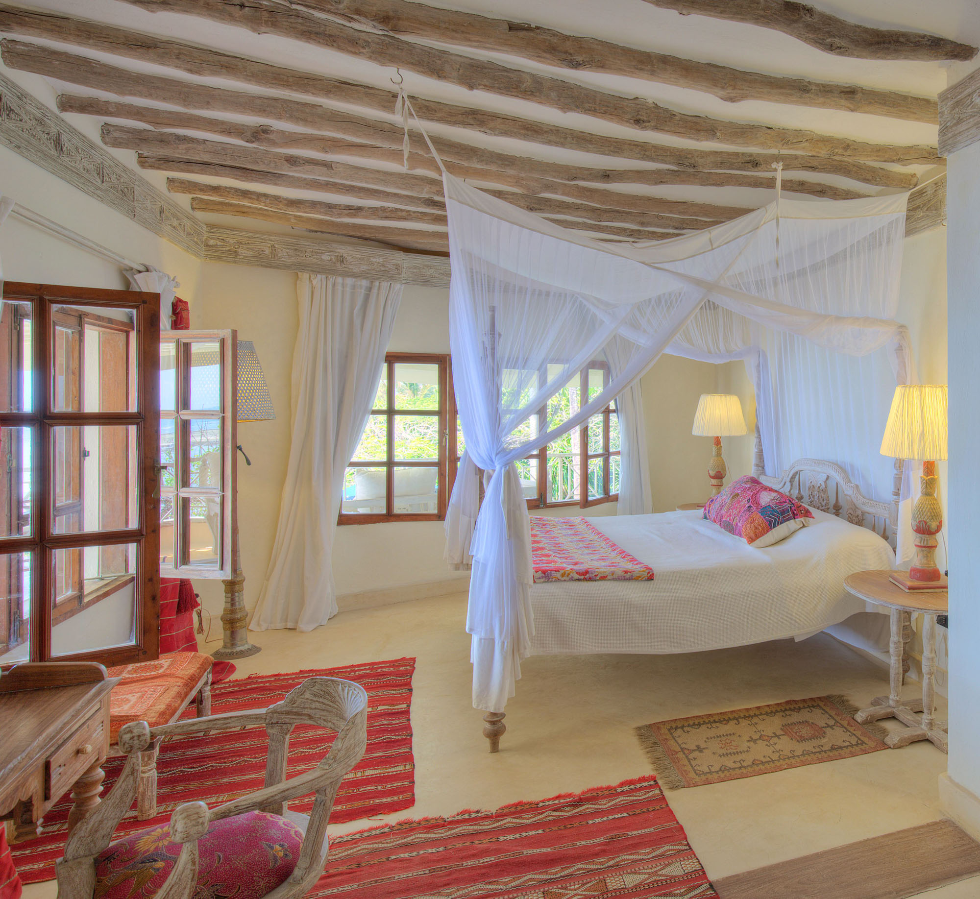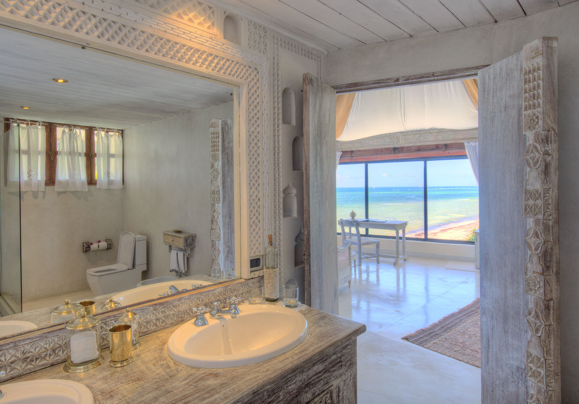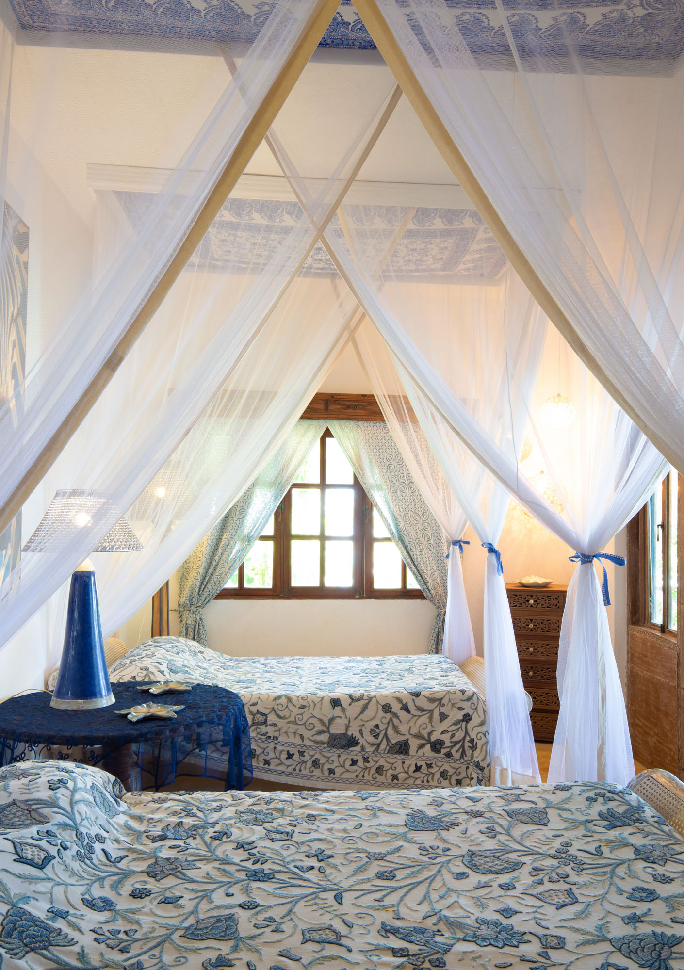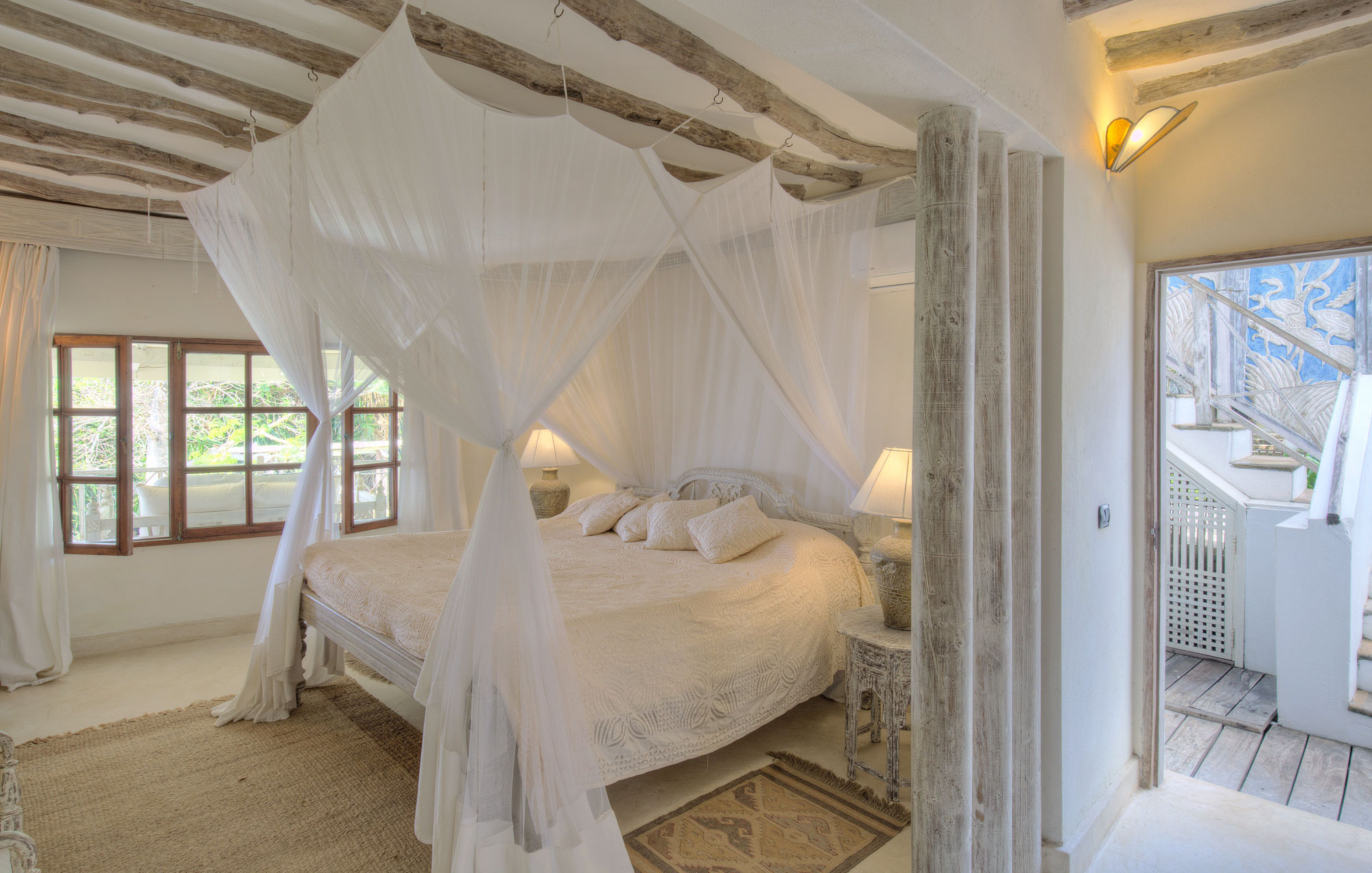 Bright and breezy, the interiors are adorned with flowing fabrics, East African artefacts, and traditional carved Lamu doors, creating a warm and inviting atmosphere. The villa’s spacious rooms feature wooden beams and hand-carved furniture, complementing the natural surroundings. The large veranda, with its hand-carved sofas and cushions, invites you to relax while enjoying the panoramic views. The villa offers four luxurious bedrooms, each designed for comfort and style, with large en suite bathrooms, air conditioning, and mosquito nets.