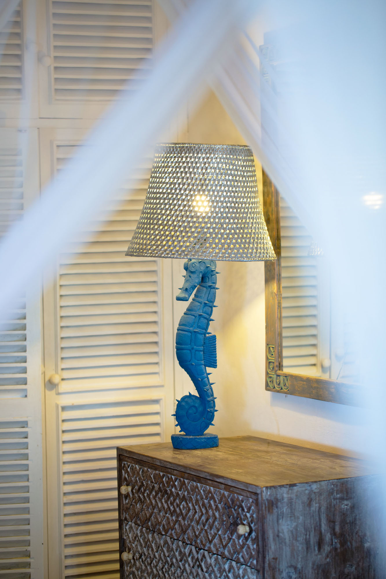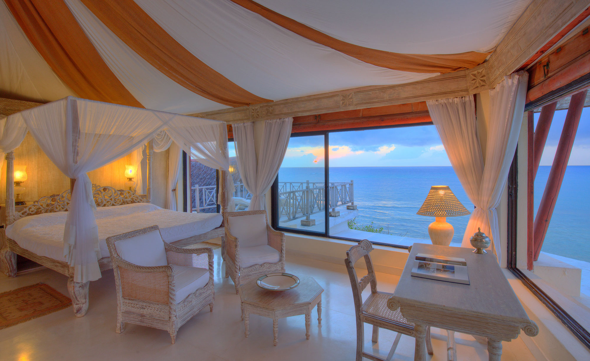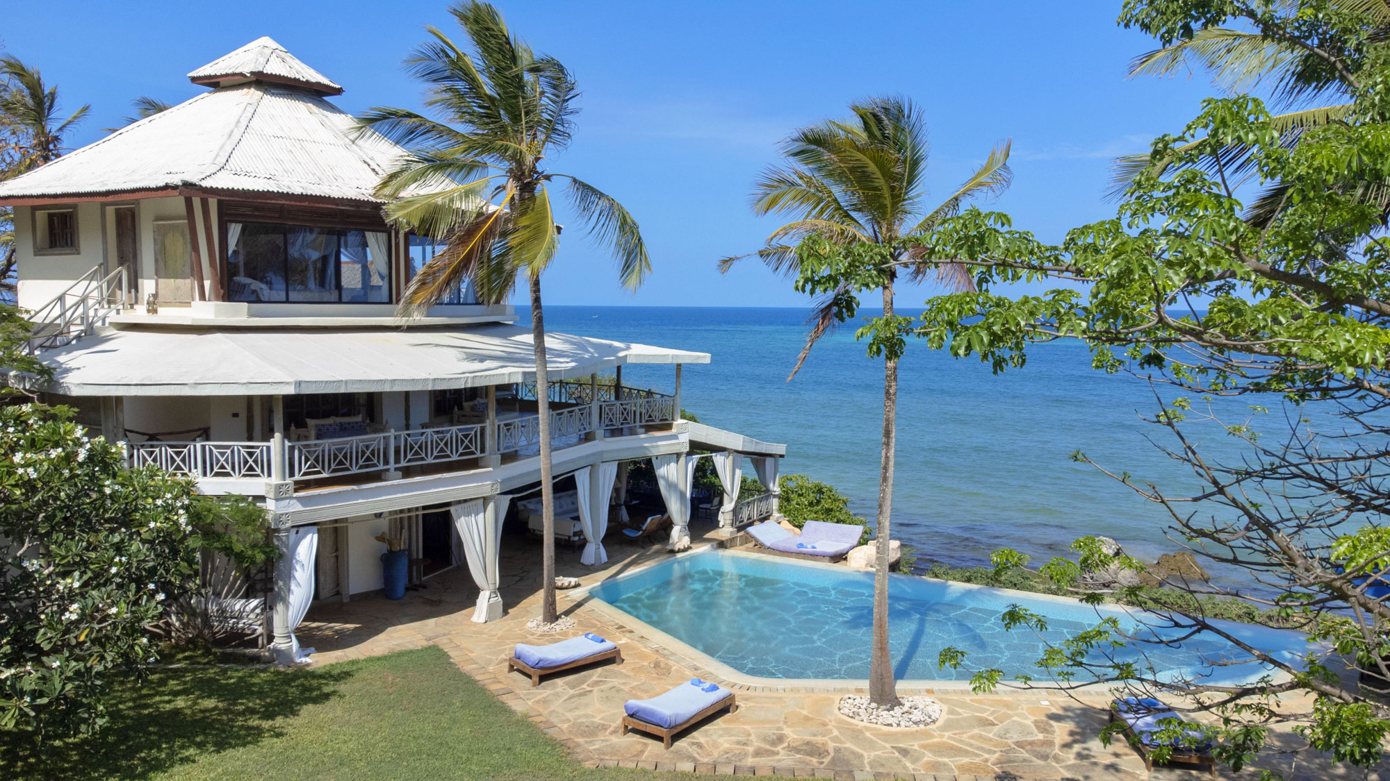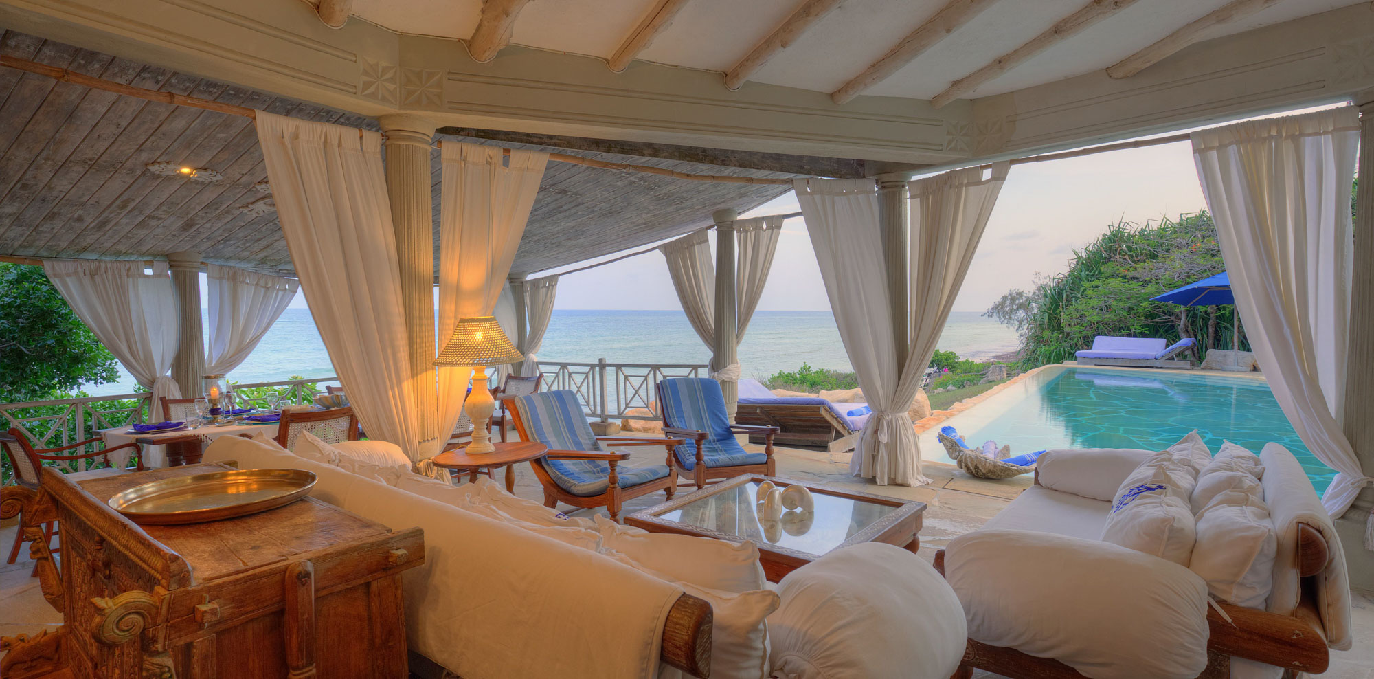 Bright and breezy, the interiors are adorned with flowing fabrics, East African artefacts, and traditional carved Lamu doors, creating a warm and inviting atmosphere. The villa’s spacious rooms feature wooden beams and hand-carved furniture, complementing the natural surroundings. The large veranda, with its hand-carved sofas and cushions, invites you to relax while enjoying the panoramic views. The villa offers four luxurious bedrooms, each designed for comfort and style, with large en suite bathrooms, air conditioning, and mosquito nets.