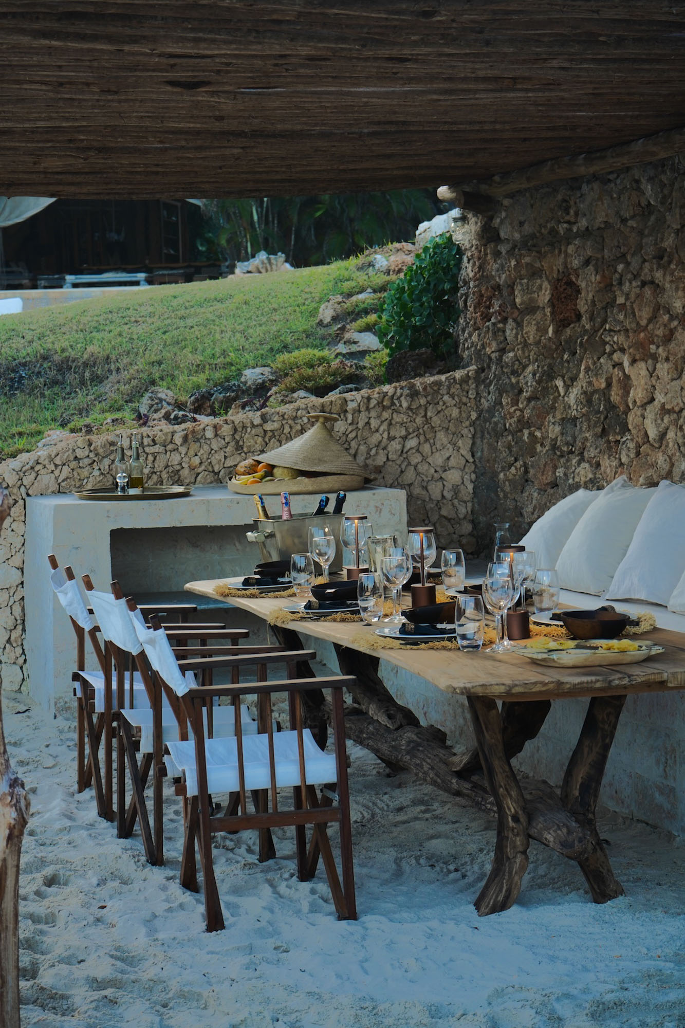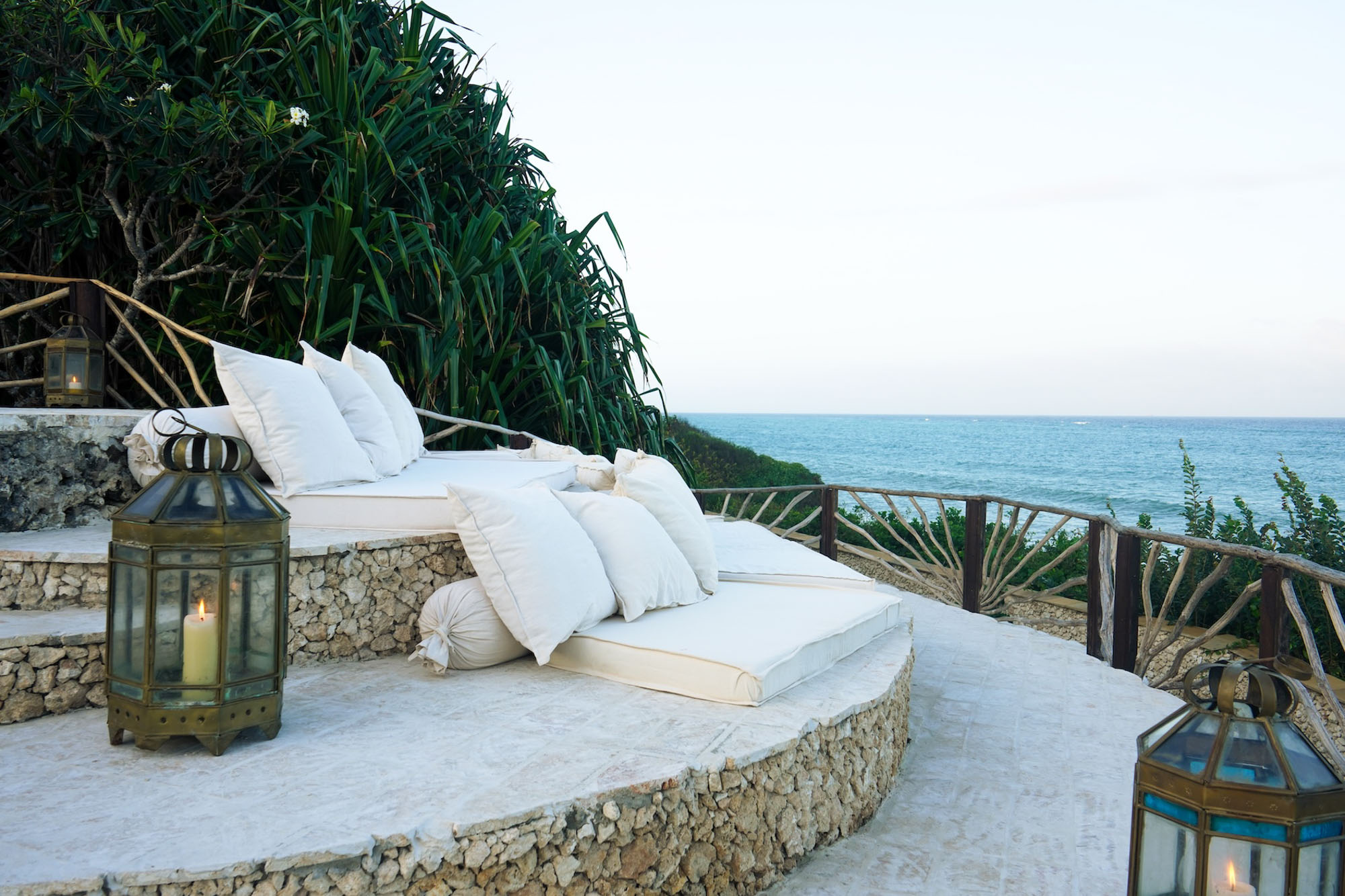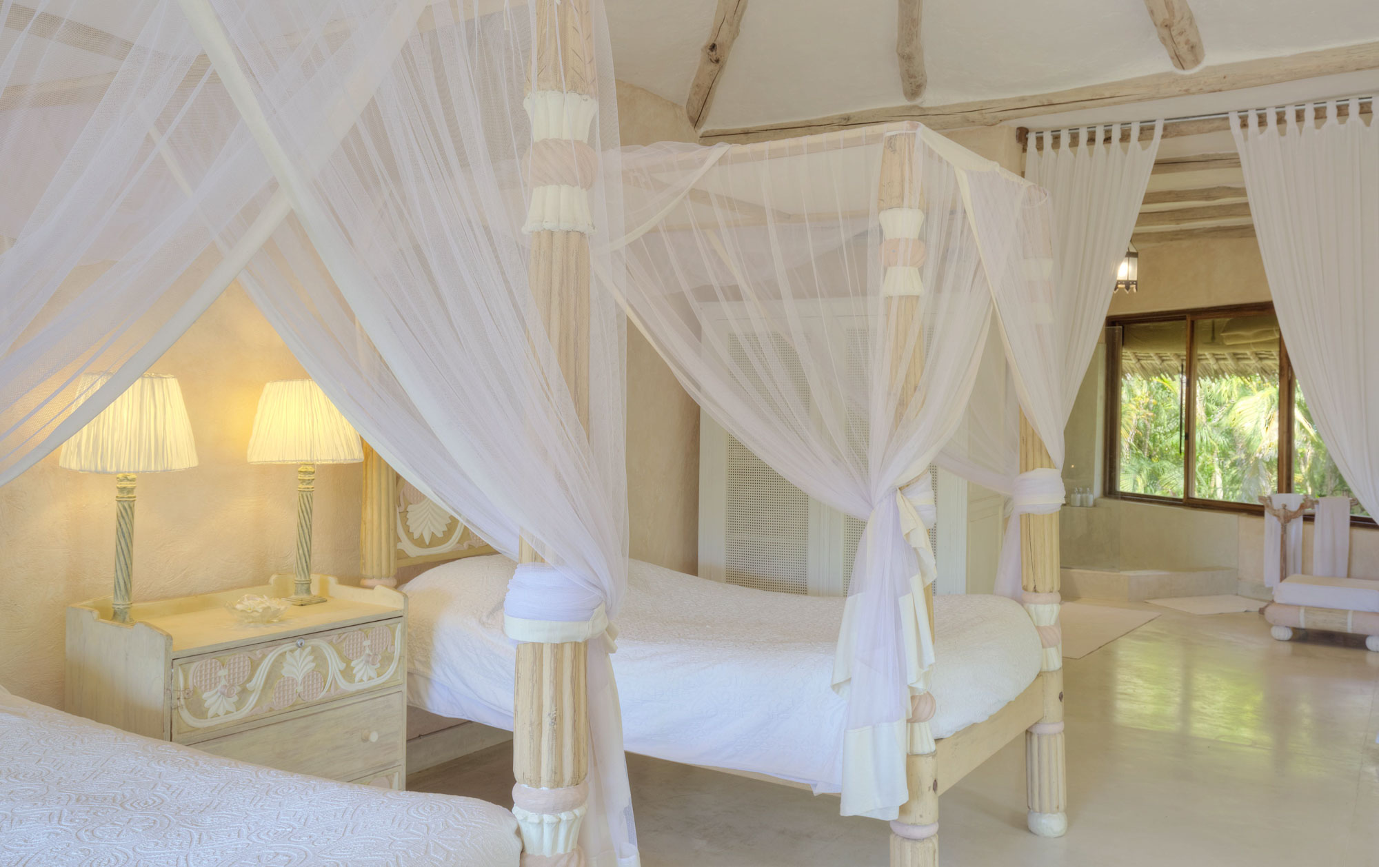 The expansive main veranda, beneath a grand Makuti roof, serves as the heart of the villa. Inside, the villa boasts okra flooring, wooden beams, and carefully selected artifacts that enhance its exceptional design. The living areas are open and inviting, with ample seating for socializing and enjoying the ocean views. The four spacious bedrooms, each with its own distinct interior style, offer both privacy and charm. All rooms are air-conditioned and equipped with mosquito nets, ensuring a comfortable stay.