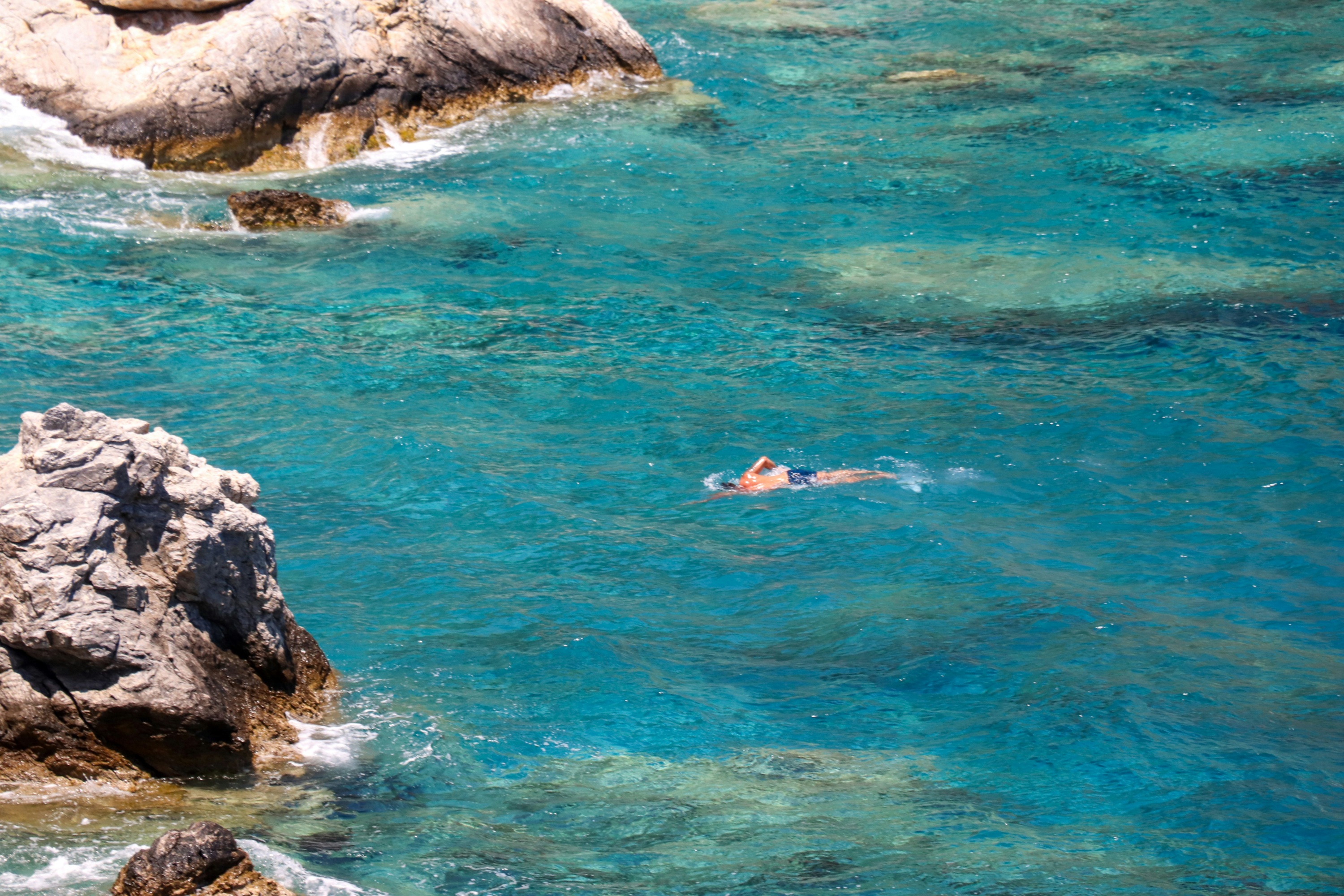 Shimmering, still water and a low-key sailing vibe. A favourite for morning laps and families who value space over scene. Pebbles underfoot and perfect clarity.