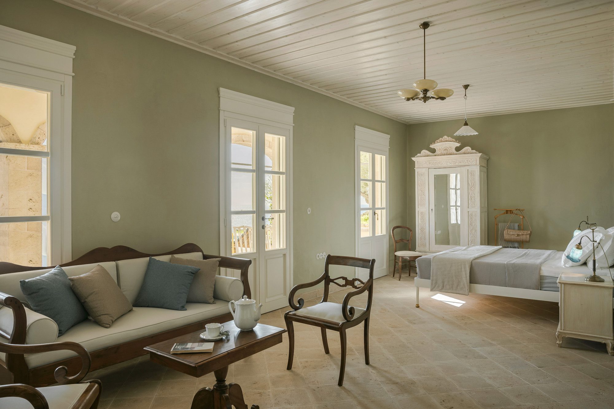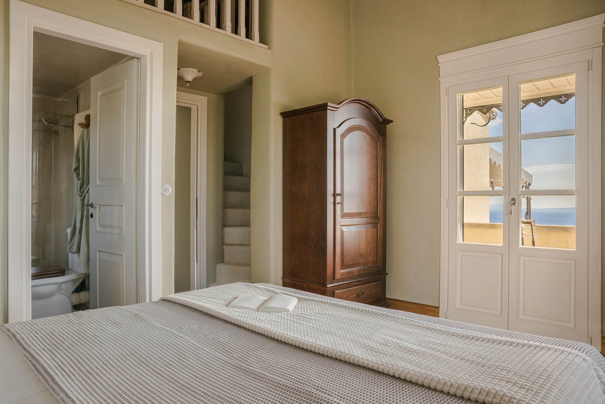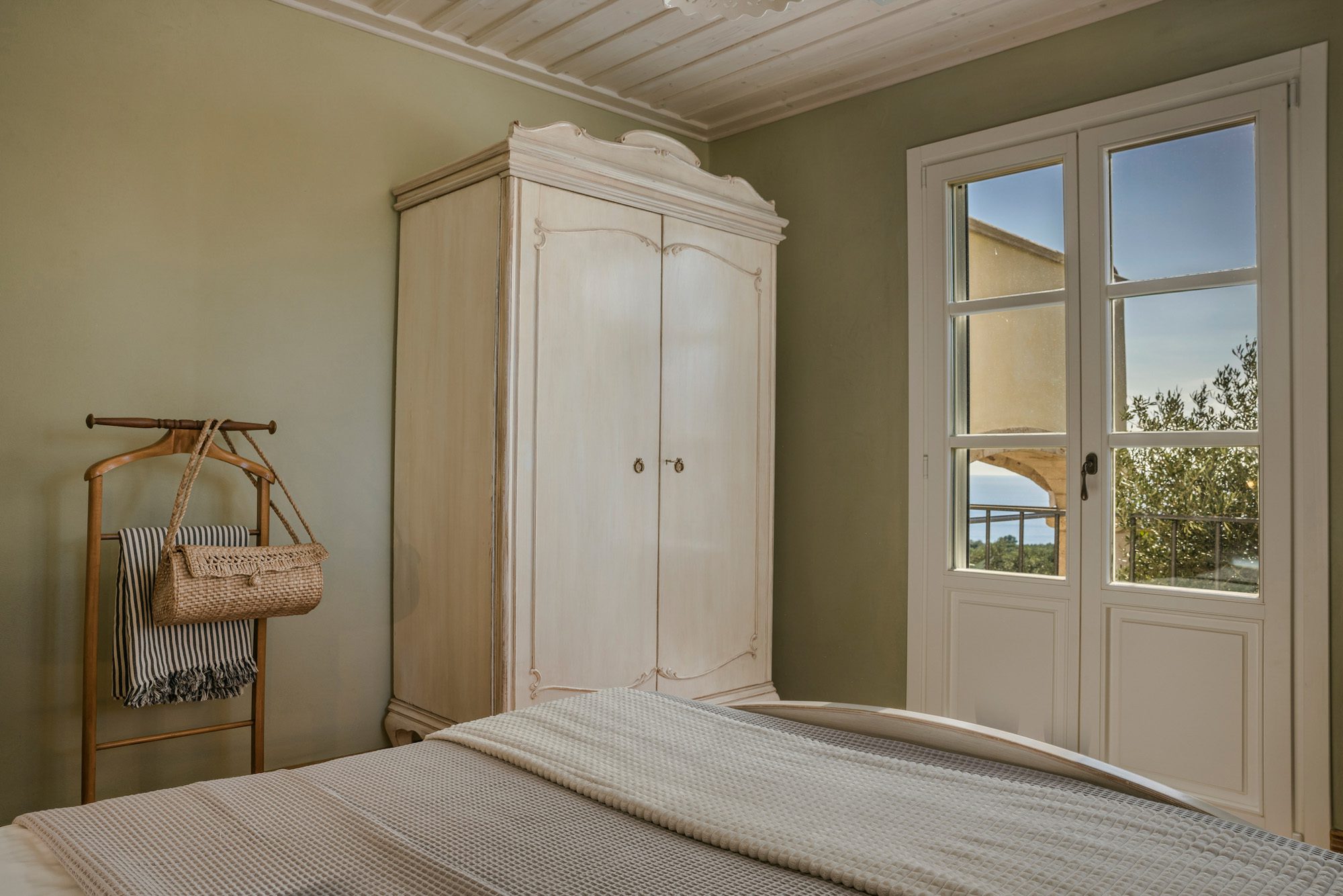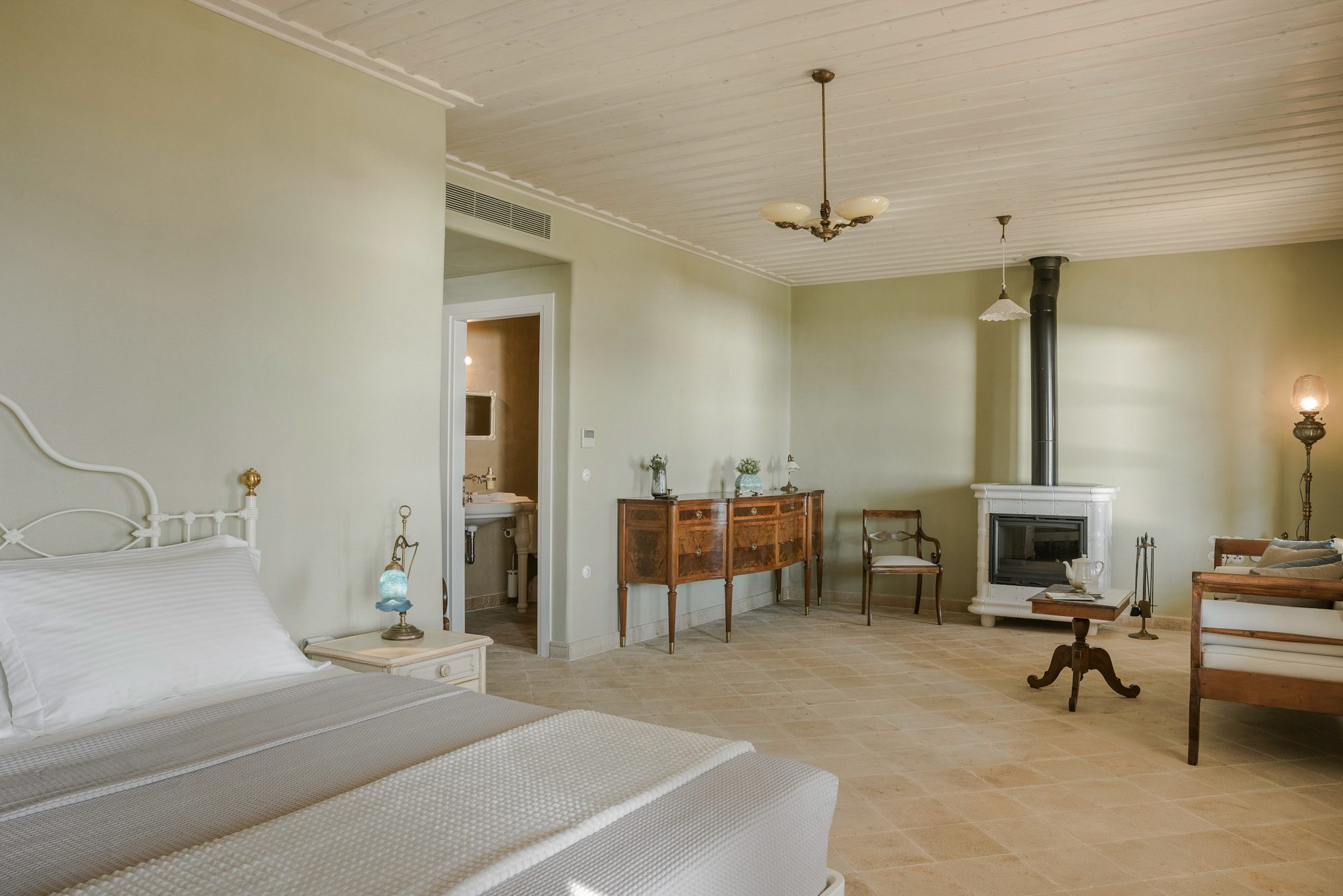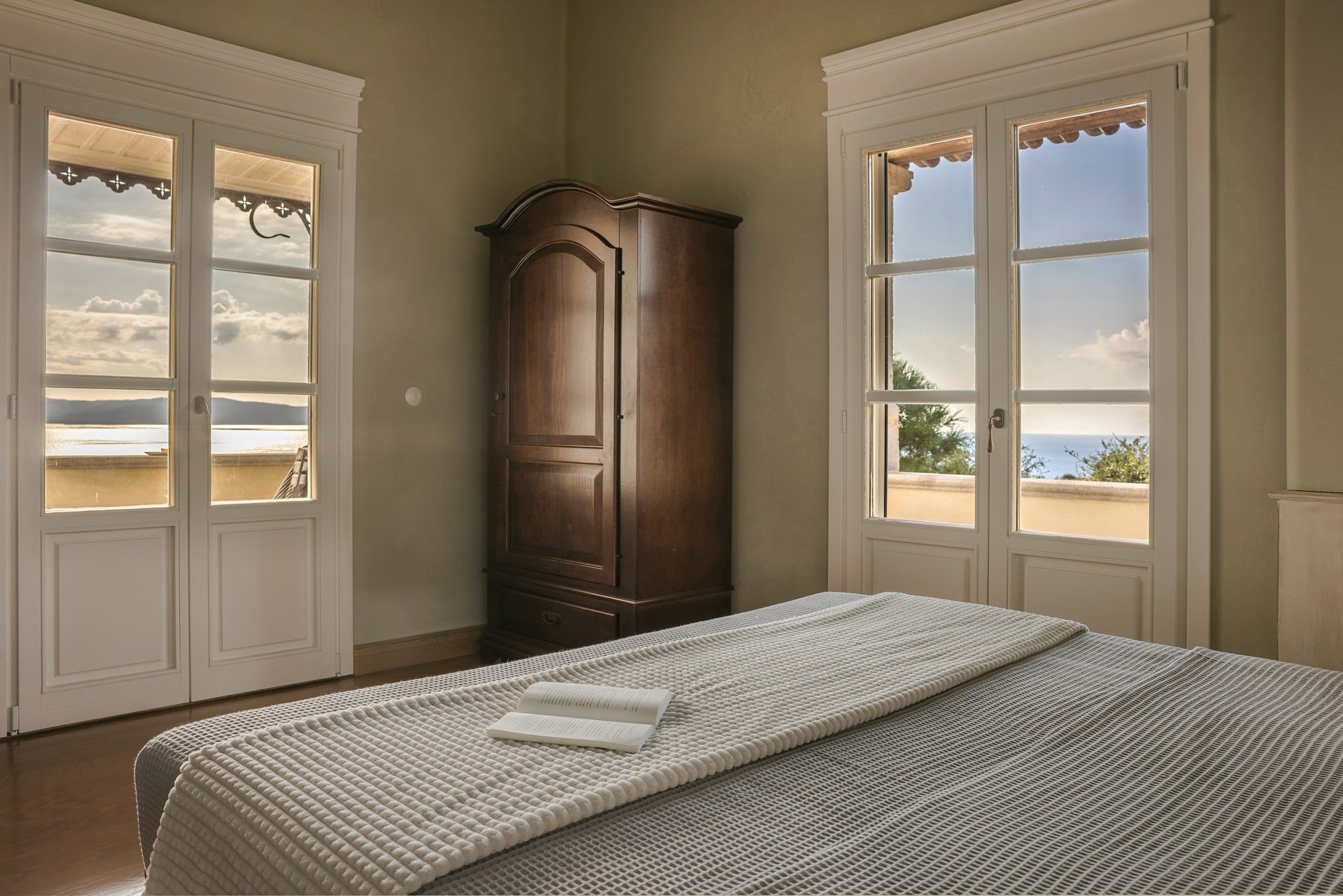 A separate spacious living room, with a large stone fireplace, opens onto the balconied veranda. The villa cleverly combines Ionian architectural design with Venetian & Tuscan influences evident in the interiors. The furniture throughout is classic and elegant.