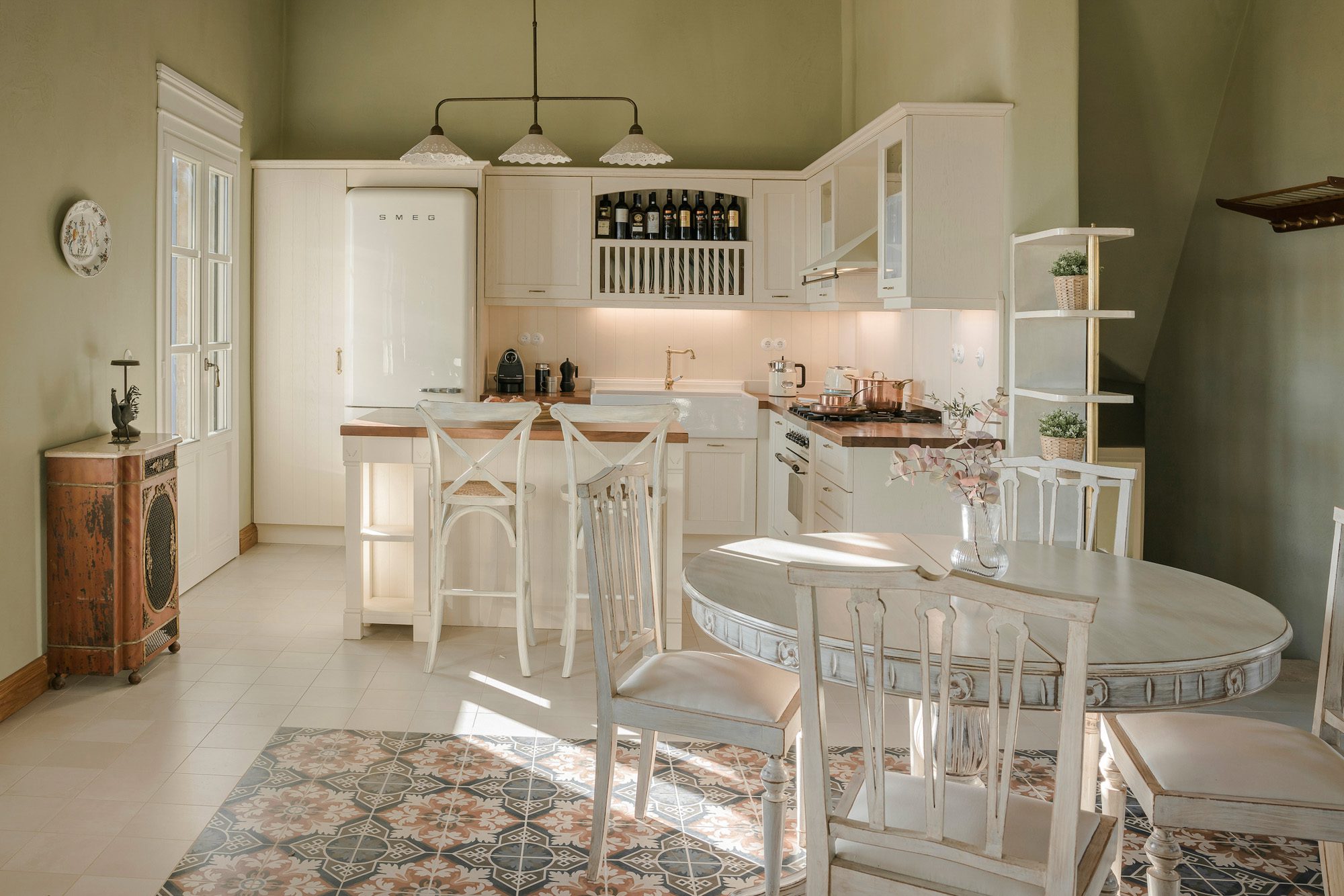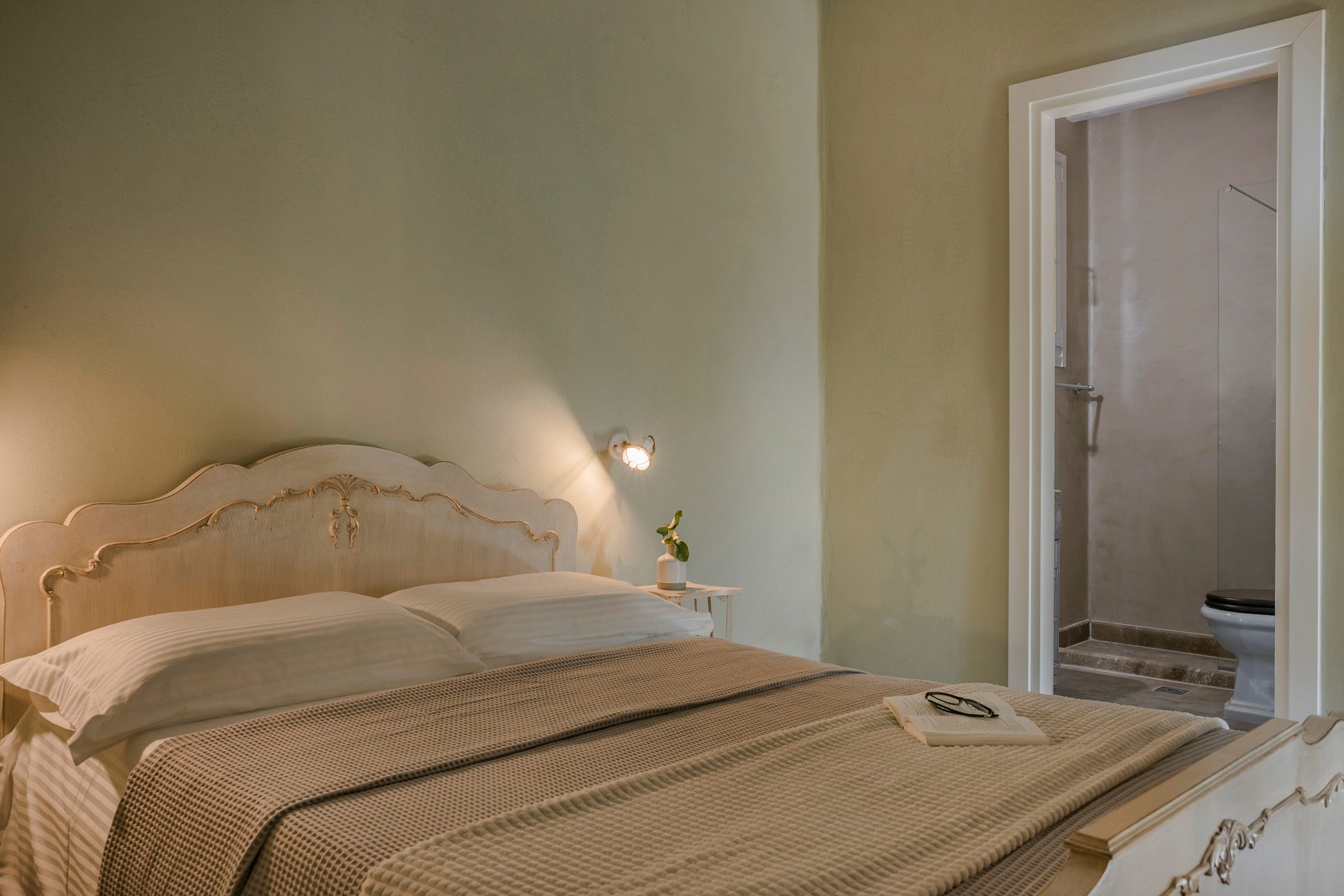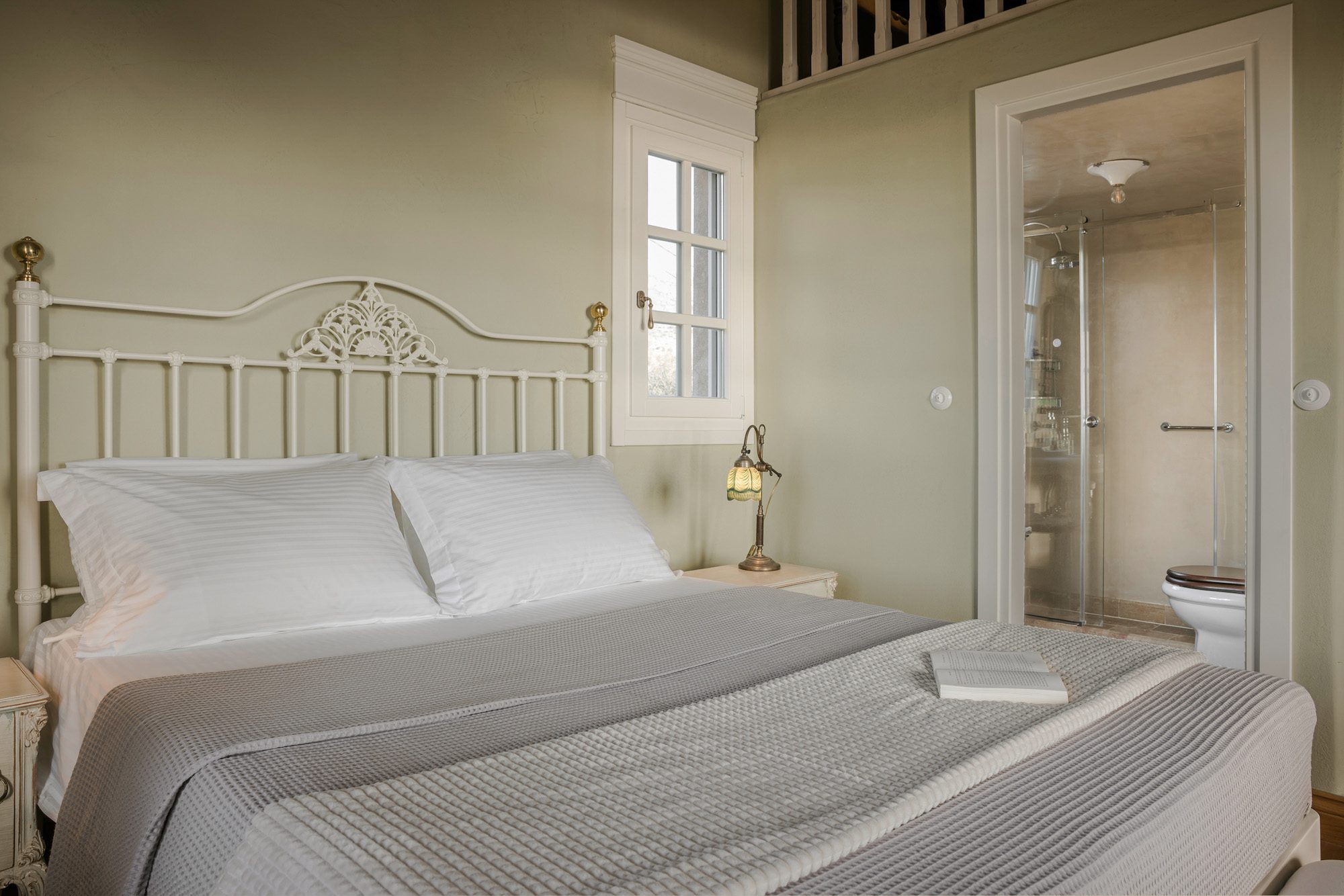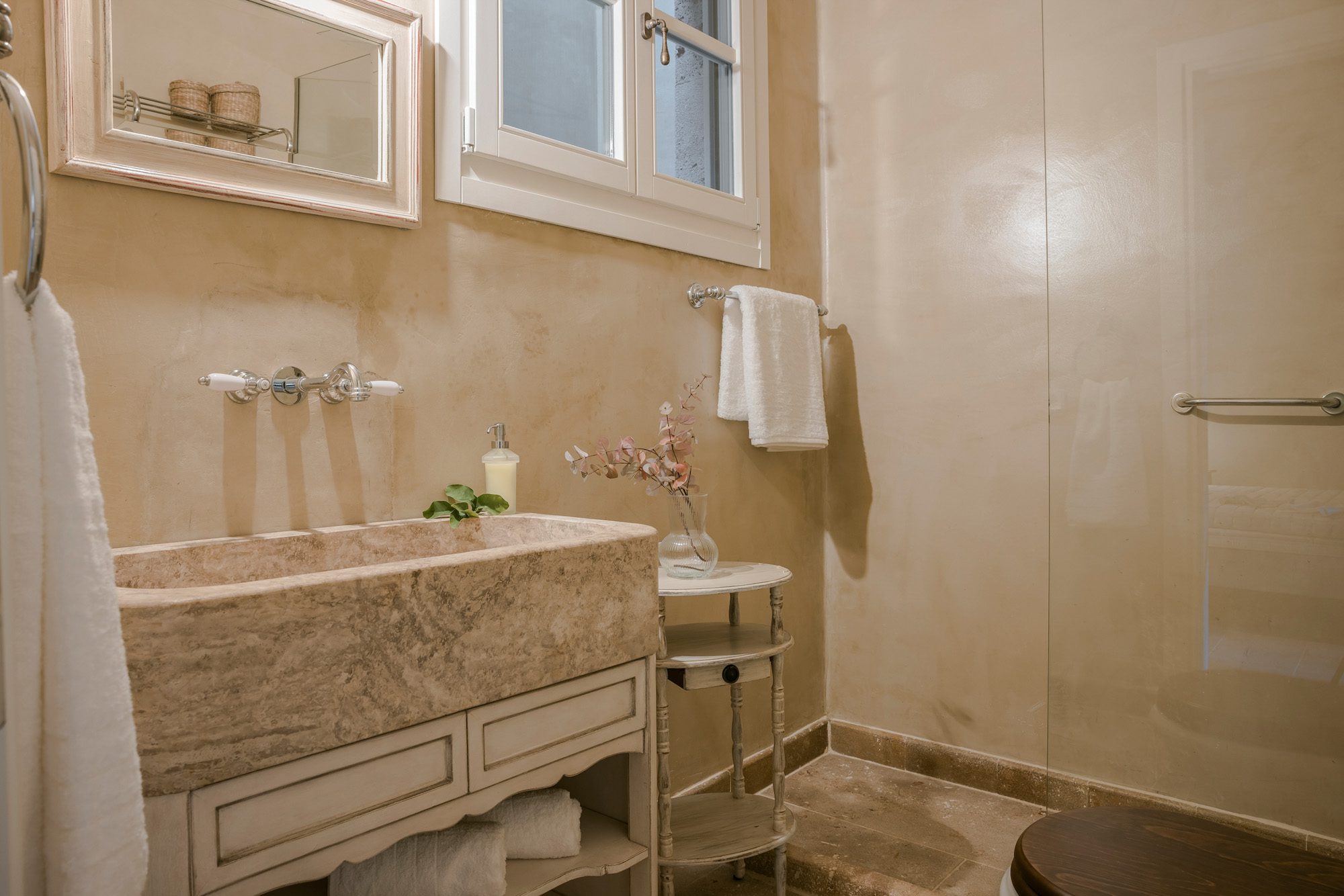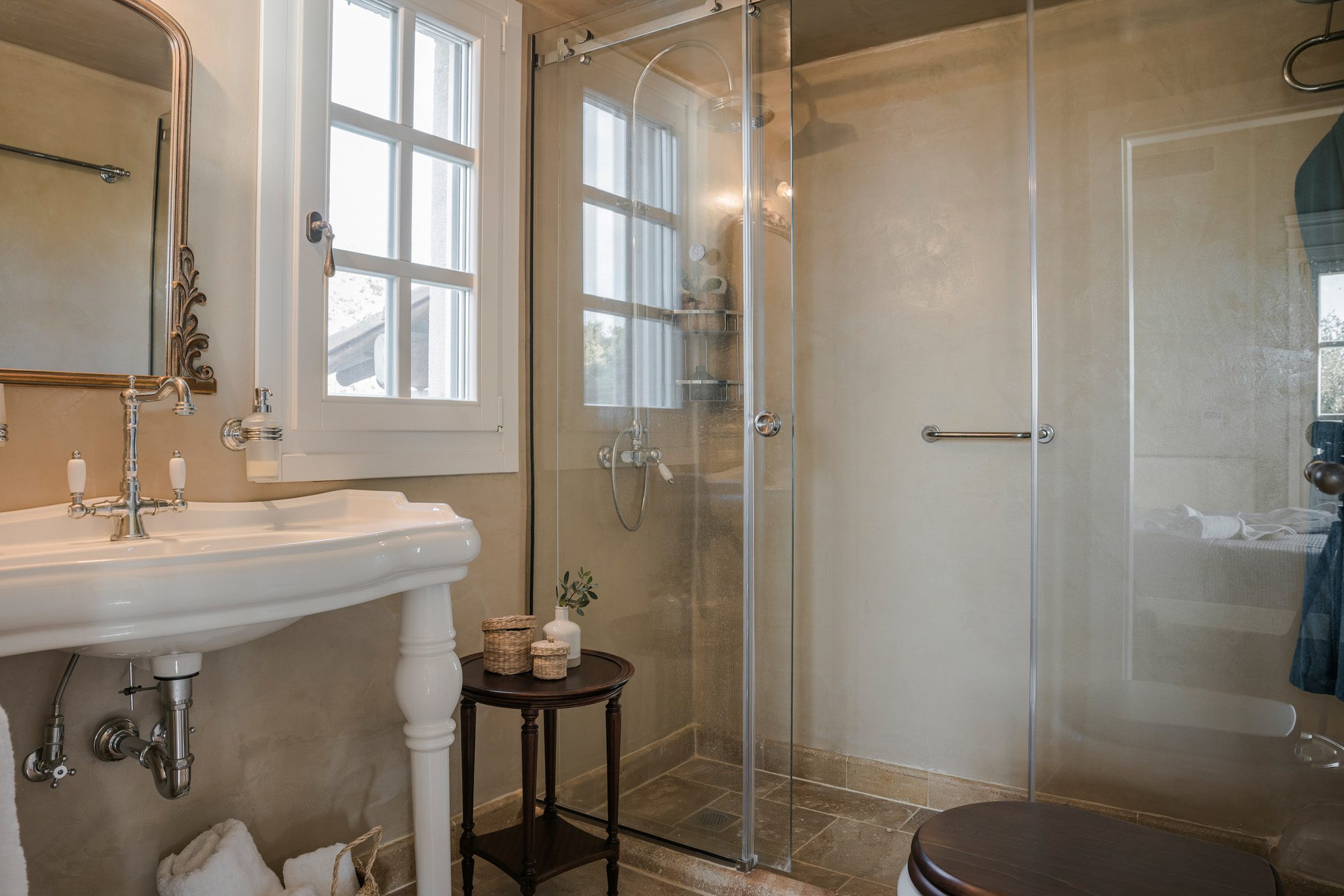 A separate spacious living room, with a large stone fireplace, opens onto the balconied veranda. The villa cleverly combines Ionian architectural design with Venetian & Tuscan influences evident in the interiors. The furniture throughout is classic and elegant.