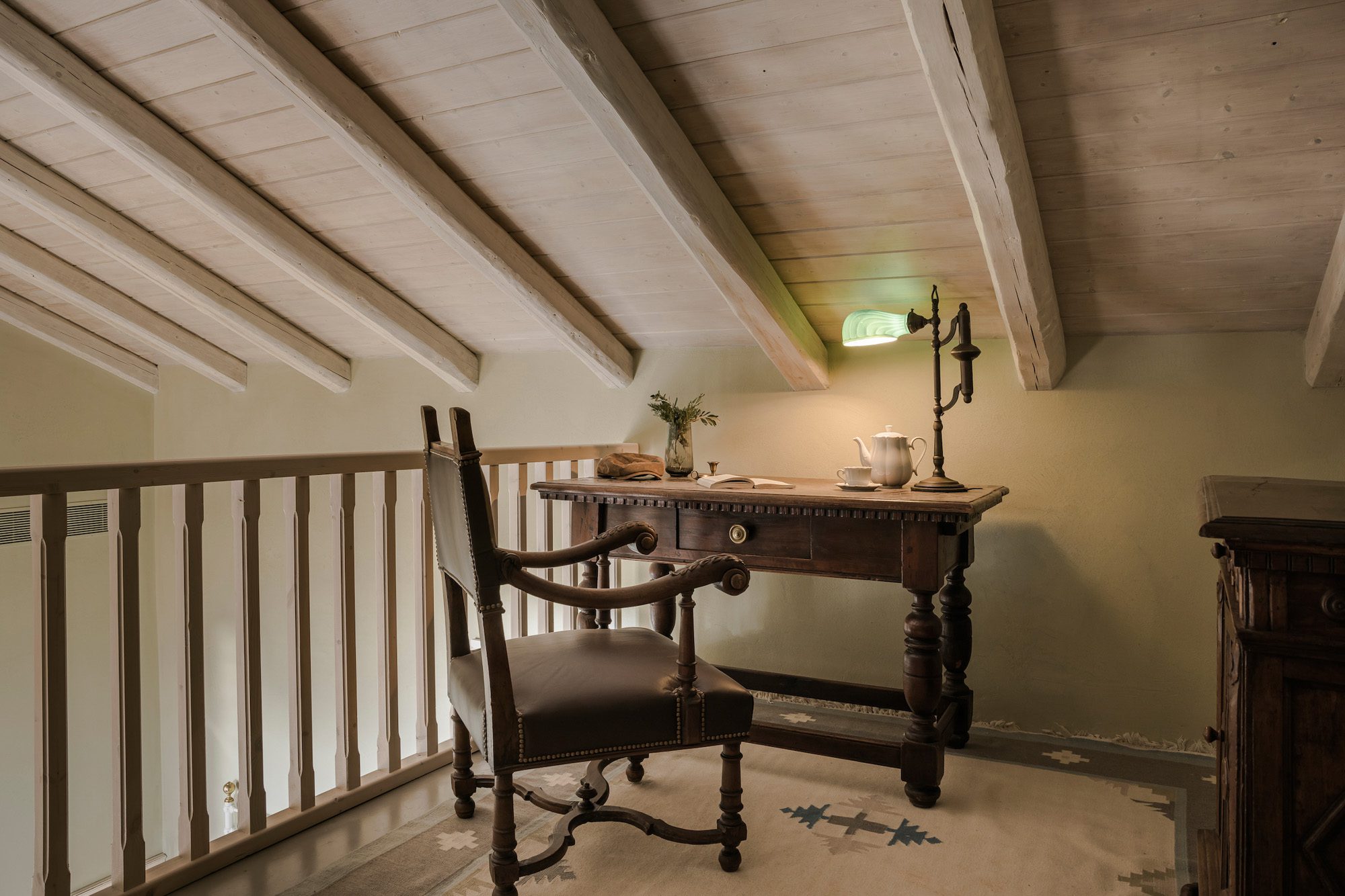 Comfortable wooden sun loungers surround the pool. A long dining table for six sits on the lawn, and a bistro table and chairs are on the terrace. On the balcony, theres a round table and directors chairs and also a rocking chair this is a great place to sit in the shade and admire the views.