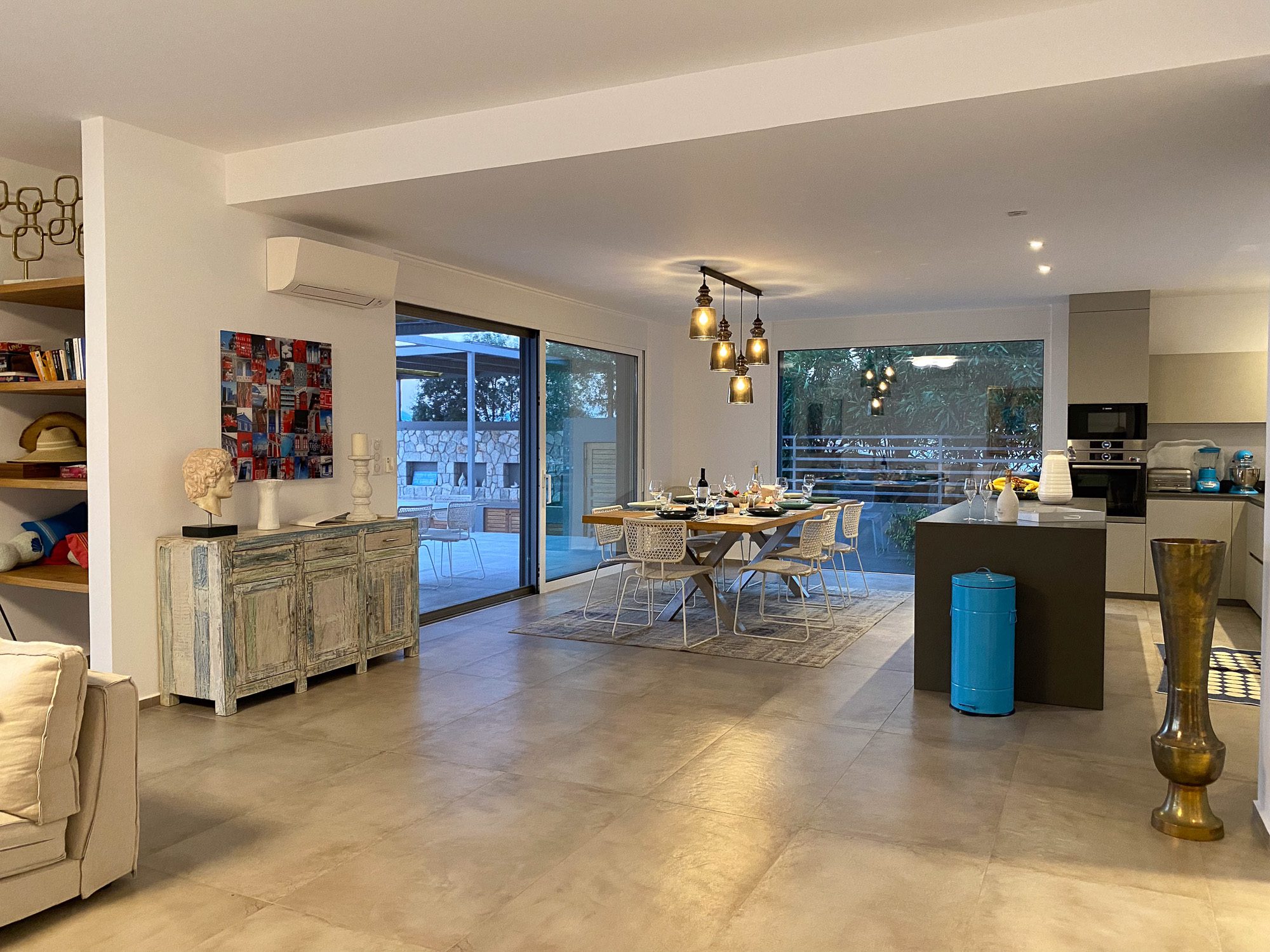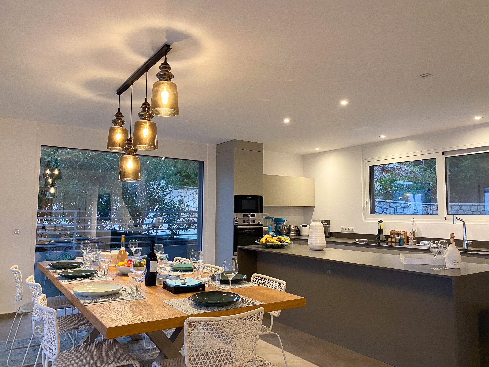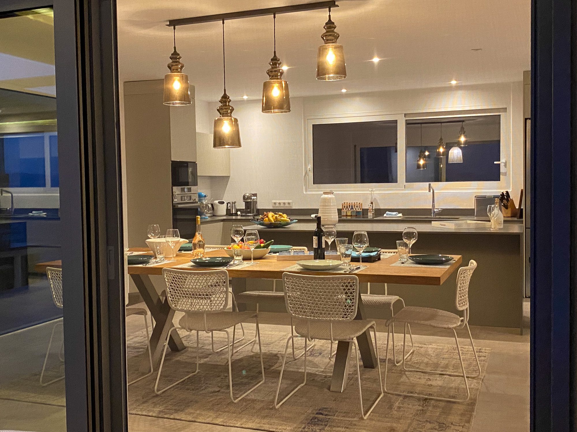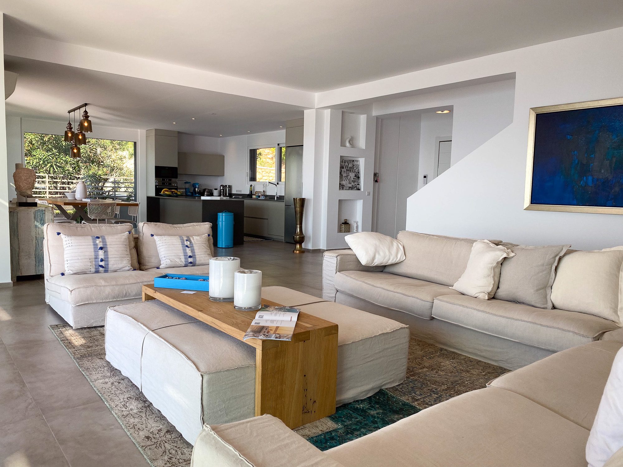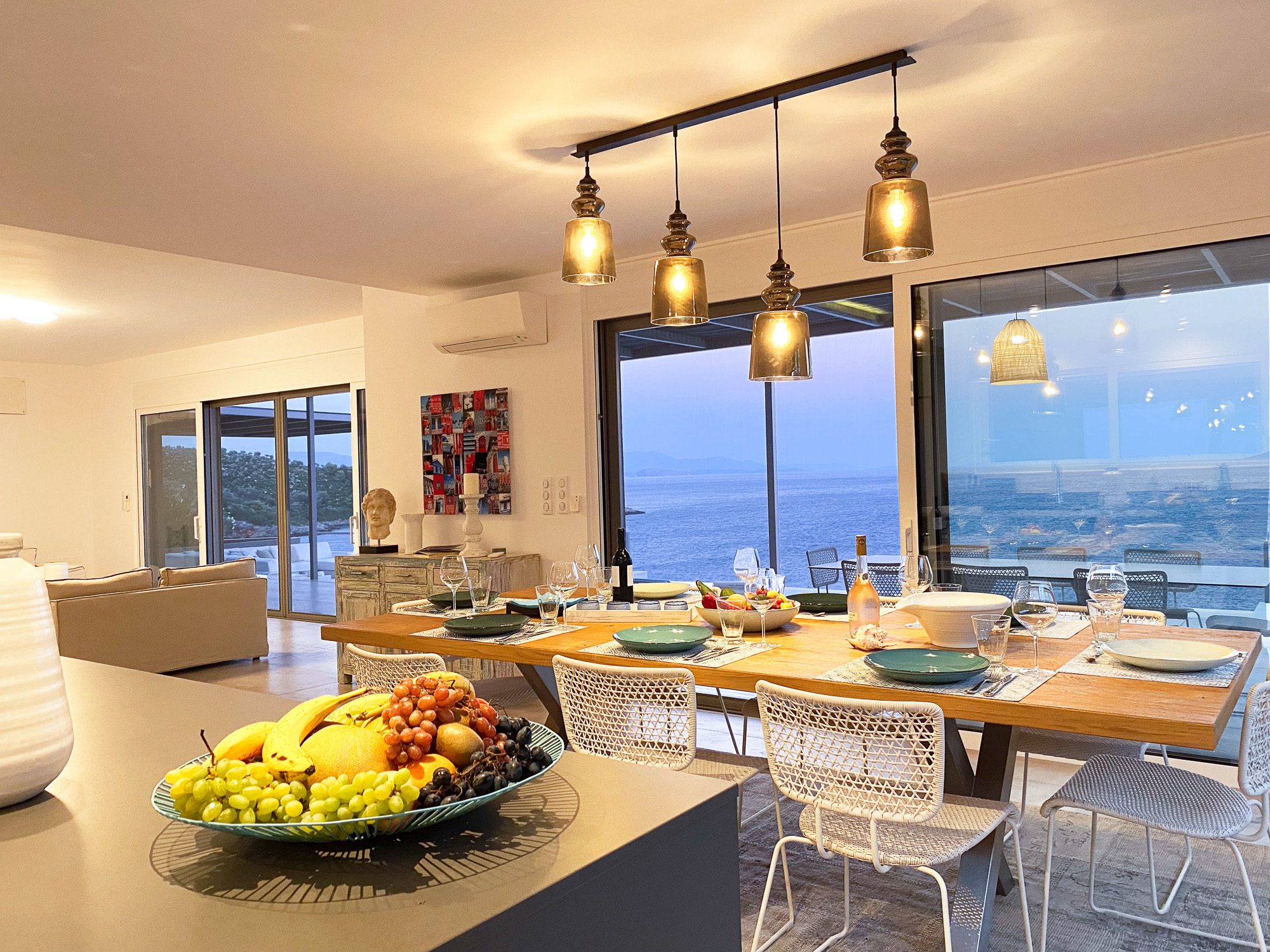 The main open plan living space has large sliding picture doors opening to the terrace and framing the views, lots of comfy sofa seating, dining for eight and a well-equipped kitchen. Theres also a spacious cinema room, finished in earthy tones, with room for everyone to gather. The two ground-floor bedrooms have garden views and shaded outdoor seating areas, whilst the three bedrooms on the first floor have stunning sea views. Theres also a kids bedroom with bunk beds and indoor table tennis.