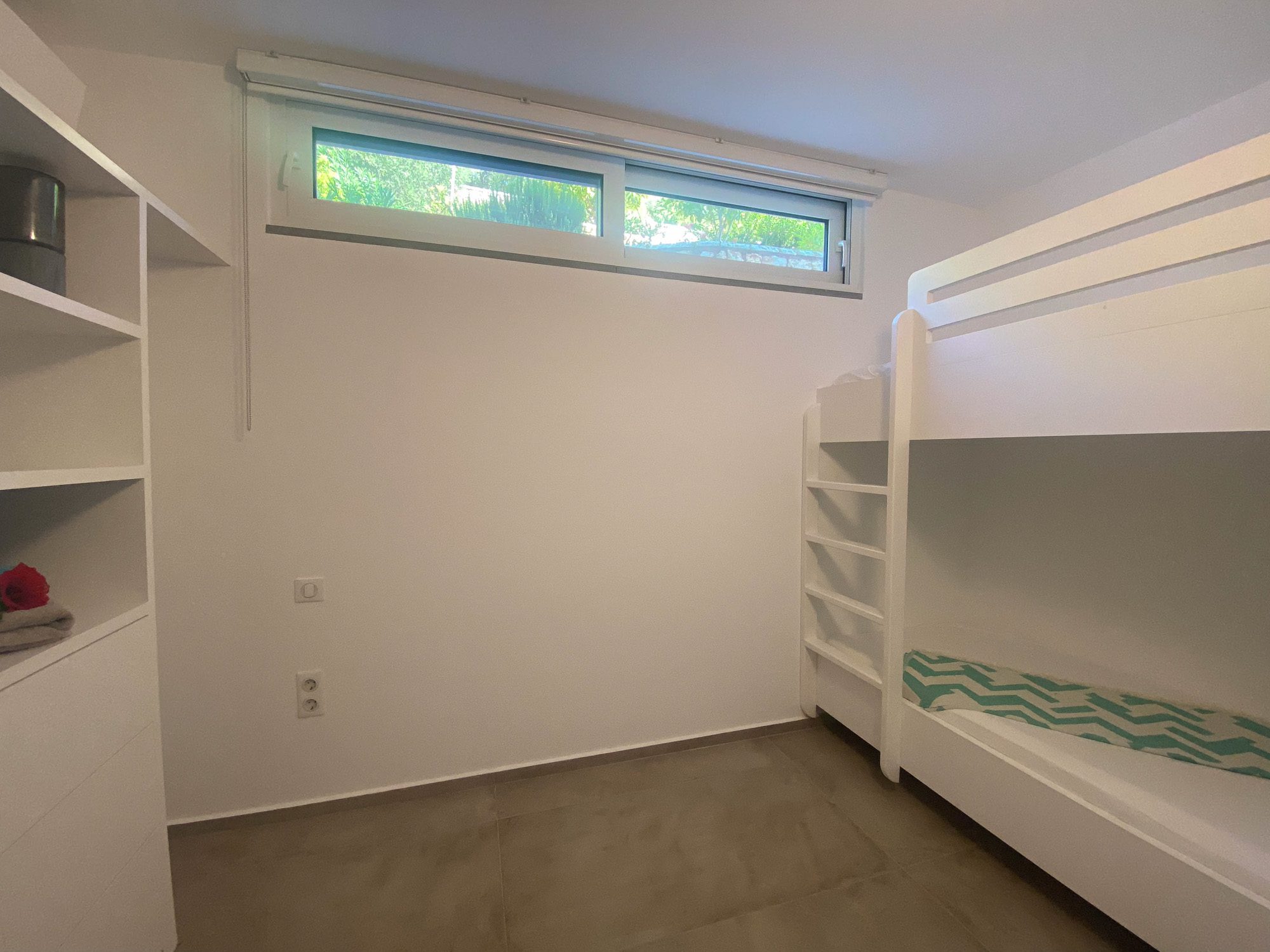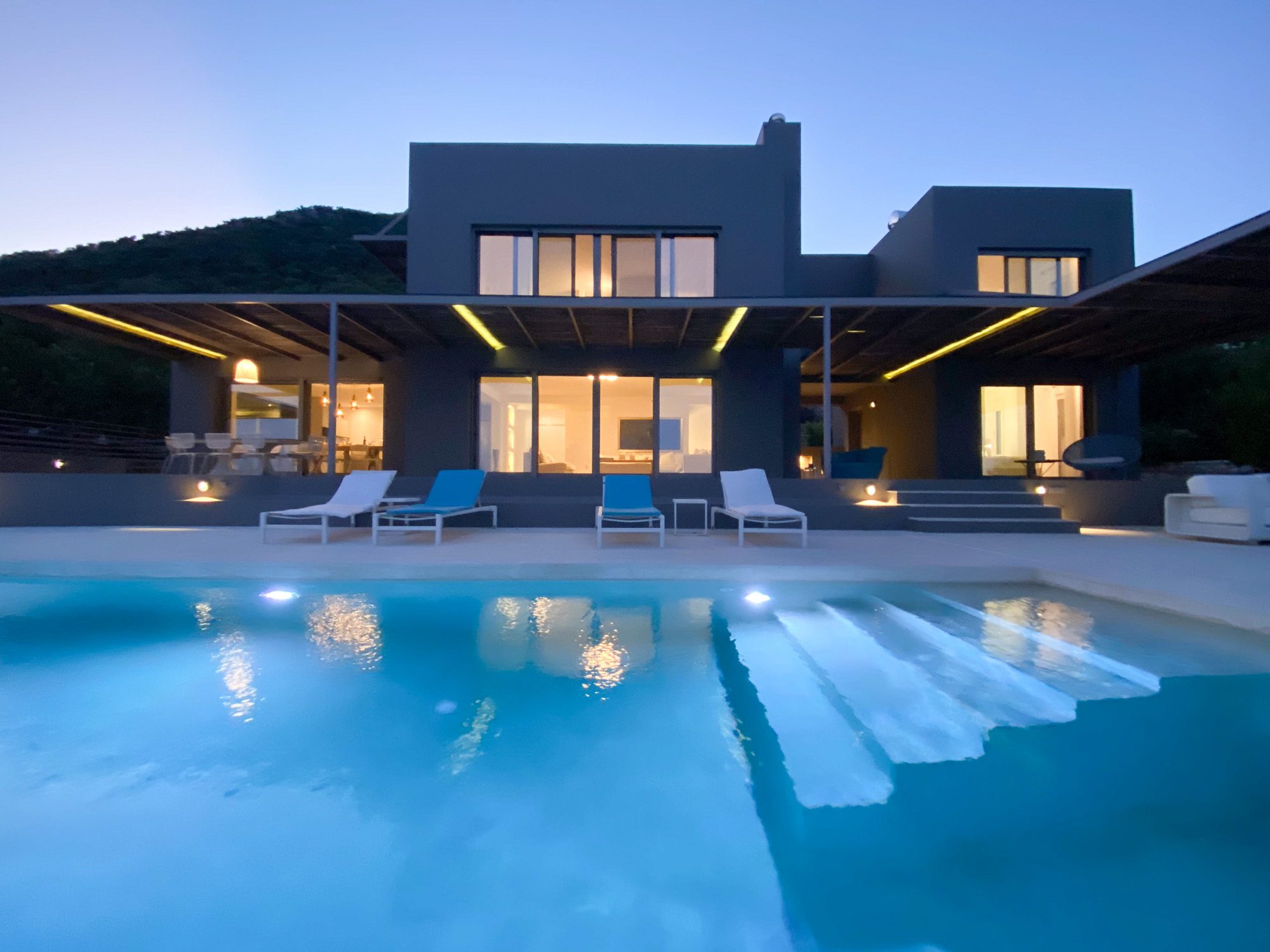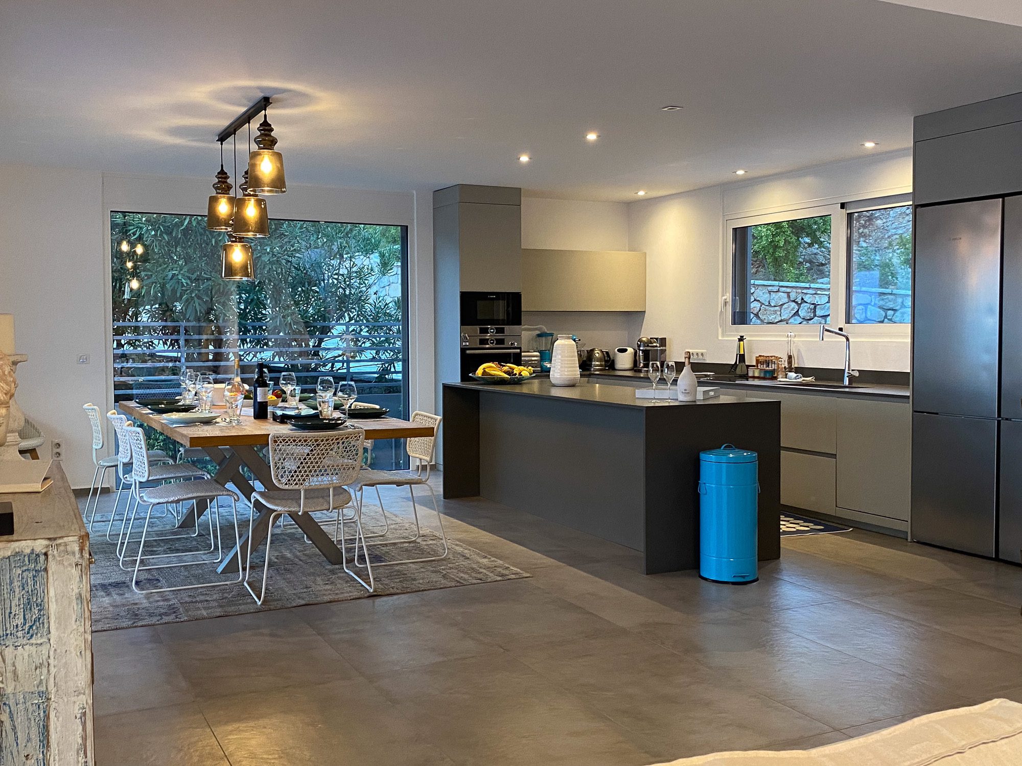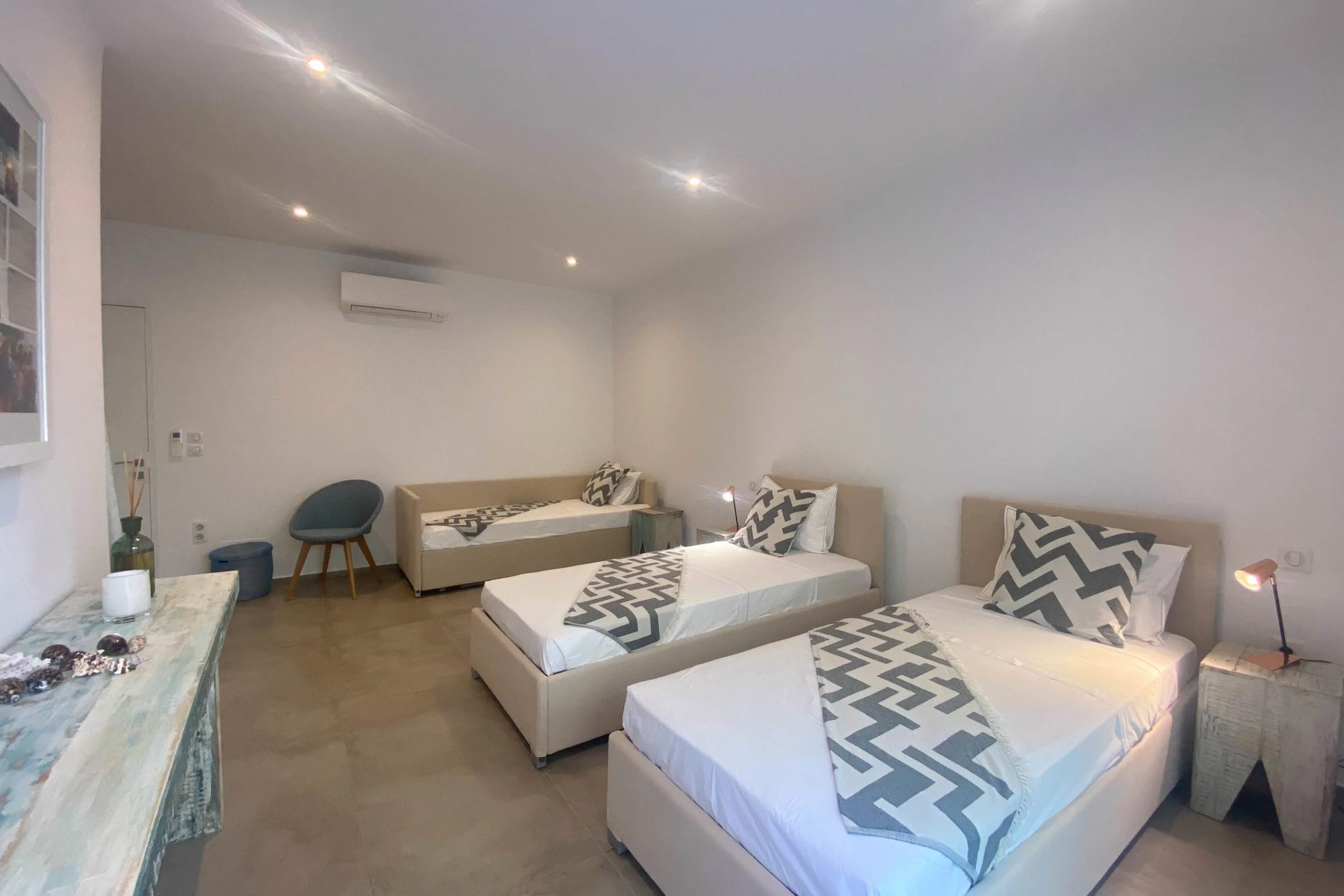 The main open plan living space has large sliding picture doors opening to the terrace and framing the views, lots of comfy sofa seating, dining for eight and a well-equipped kitchen. Theres also a spacious cinema room, finished in earthy tones, with room for everyone to gather. The two ground-floor bedrooms have garden views and shaded outdoor seating areas, whilst the three bedrooms on the first floor have stunning sea views. Theres also a kids bedroom with bunk beds and indoor table tennis.