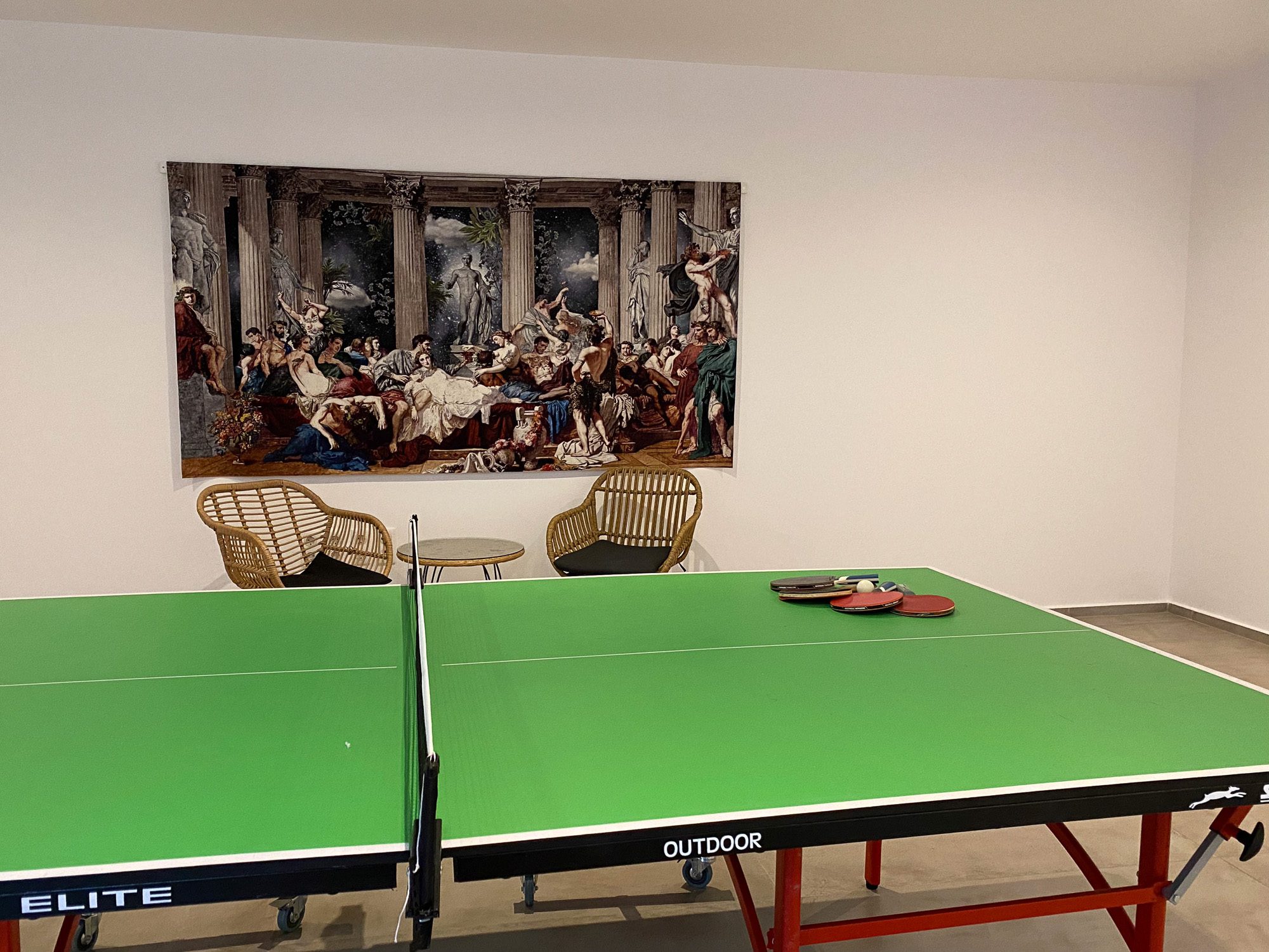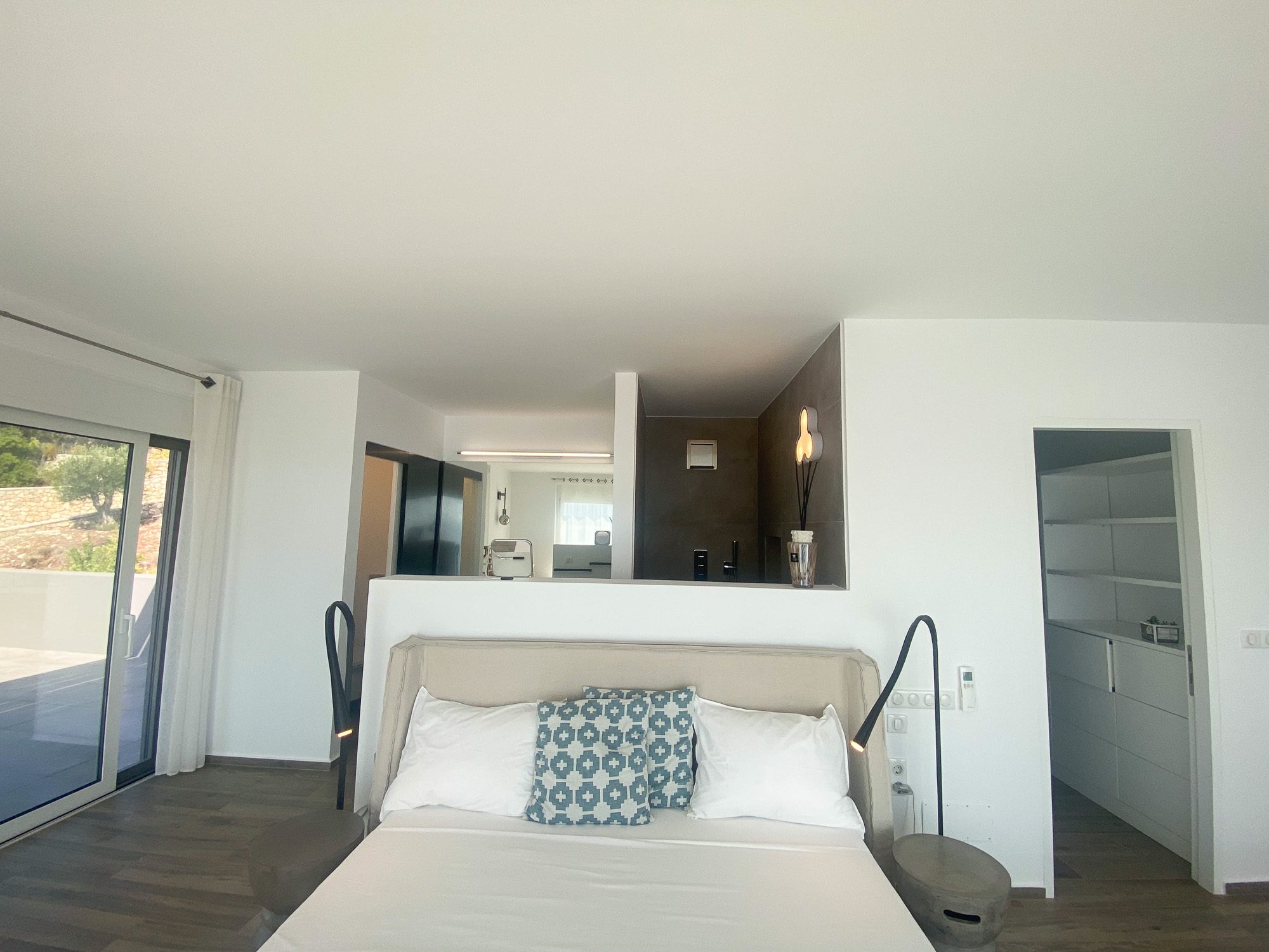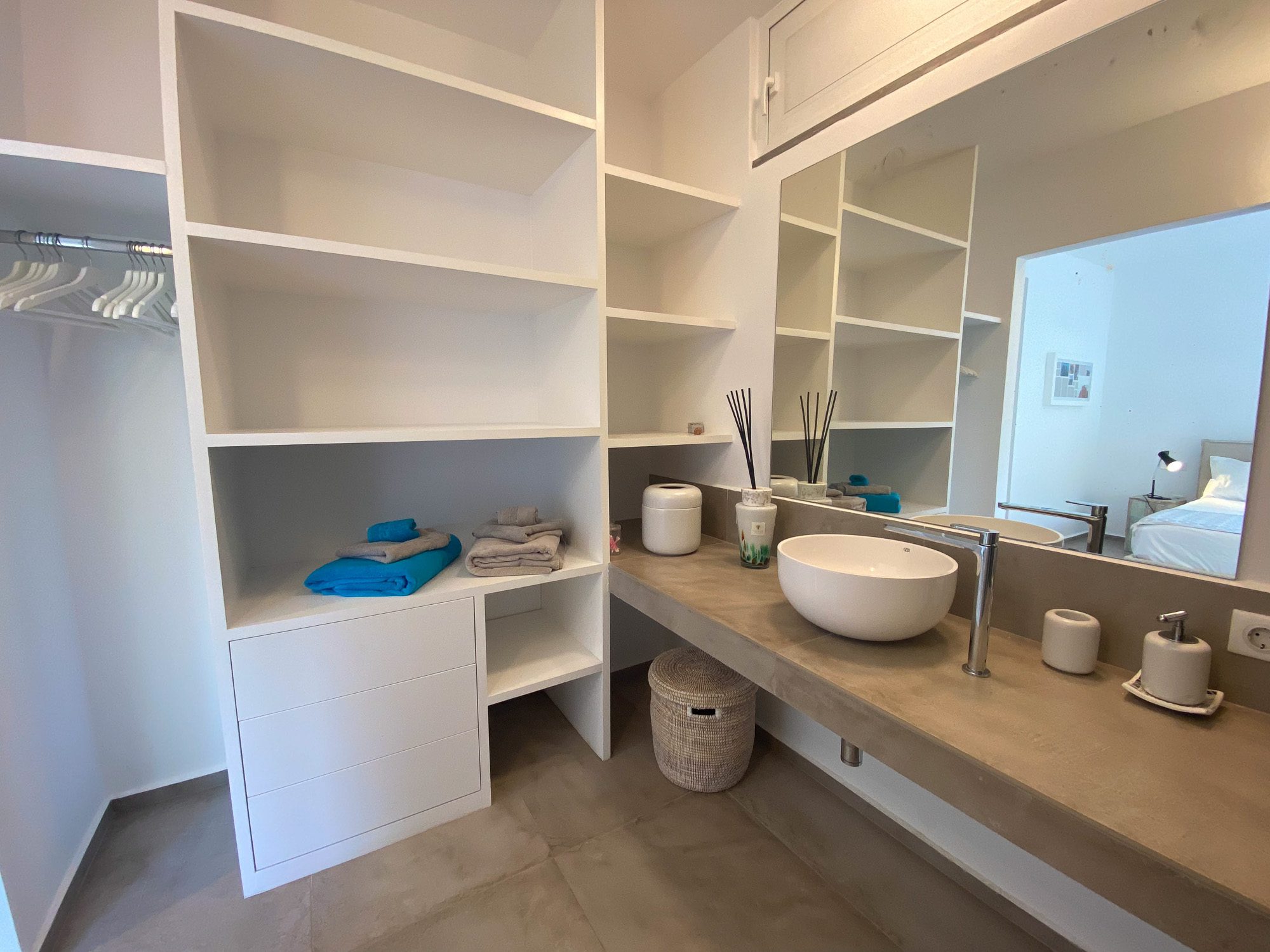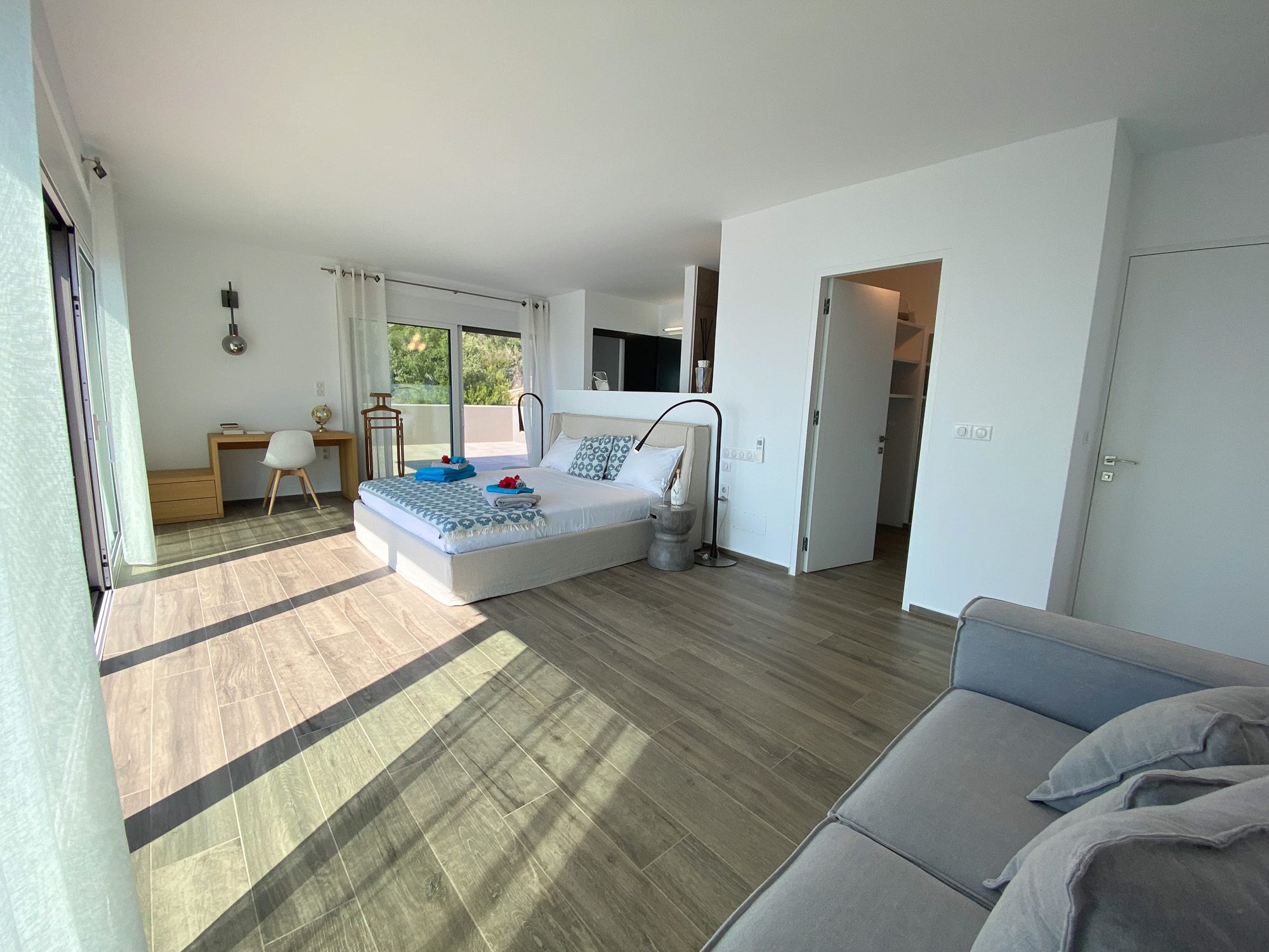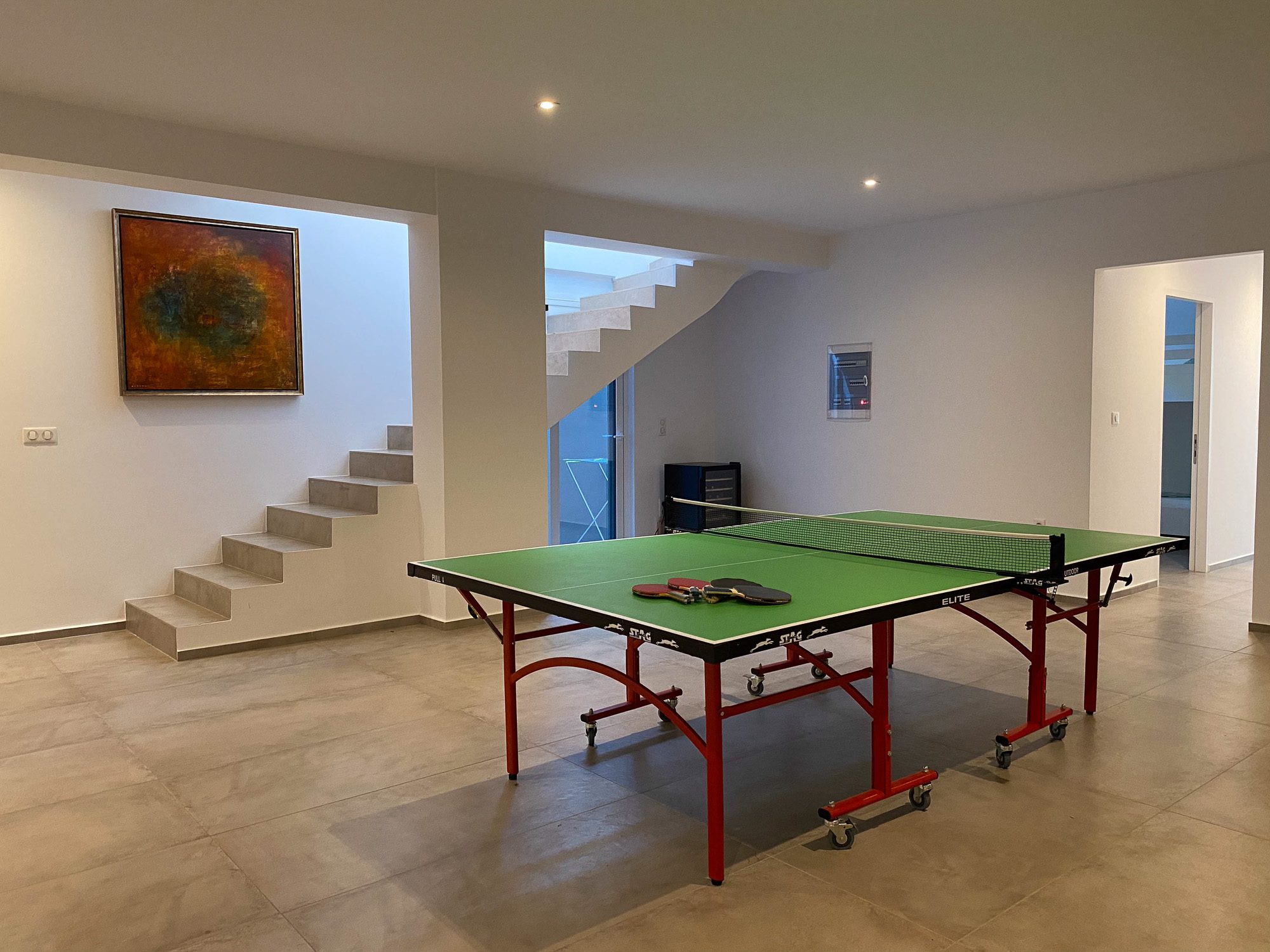 The main open plan living space has large sliding picture doors opening to the terrace and framing the views, lots of comfy sofa seating, dining for eight and a well-equipped kitchen. Theres also a spacious cinema room, finished in earthy tones, with room for everyone to gather. The two ground-floor bedrooms have garden views and shaded outdoor seating areas, whilst the three bedrooms on the first floor have stunning sea views. Theres also a kids bedroom with bunk beds and indoor table tennis.