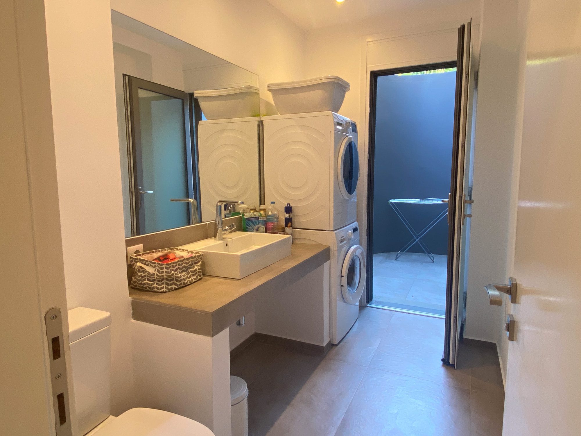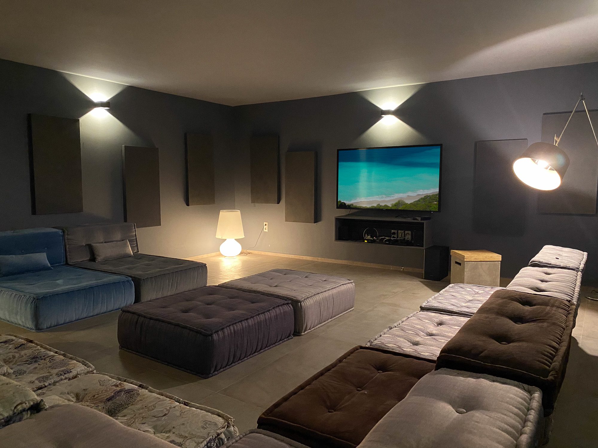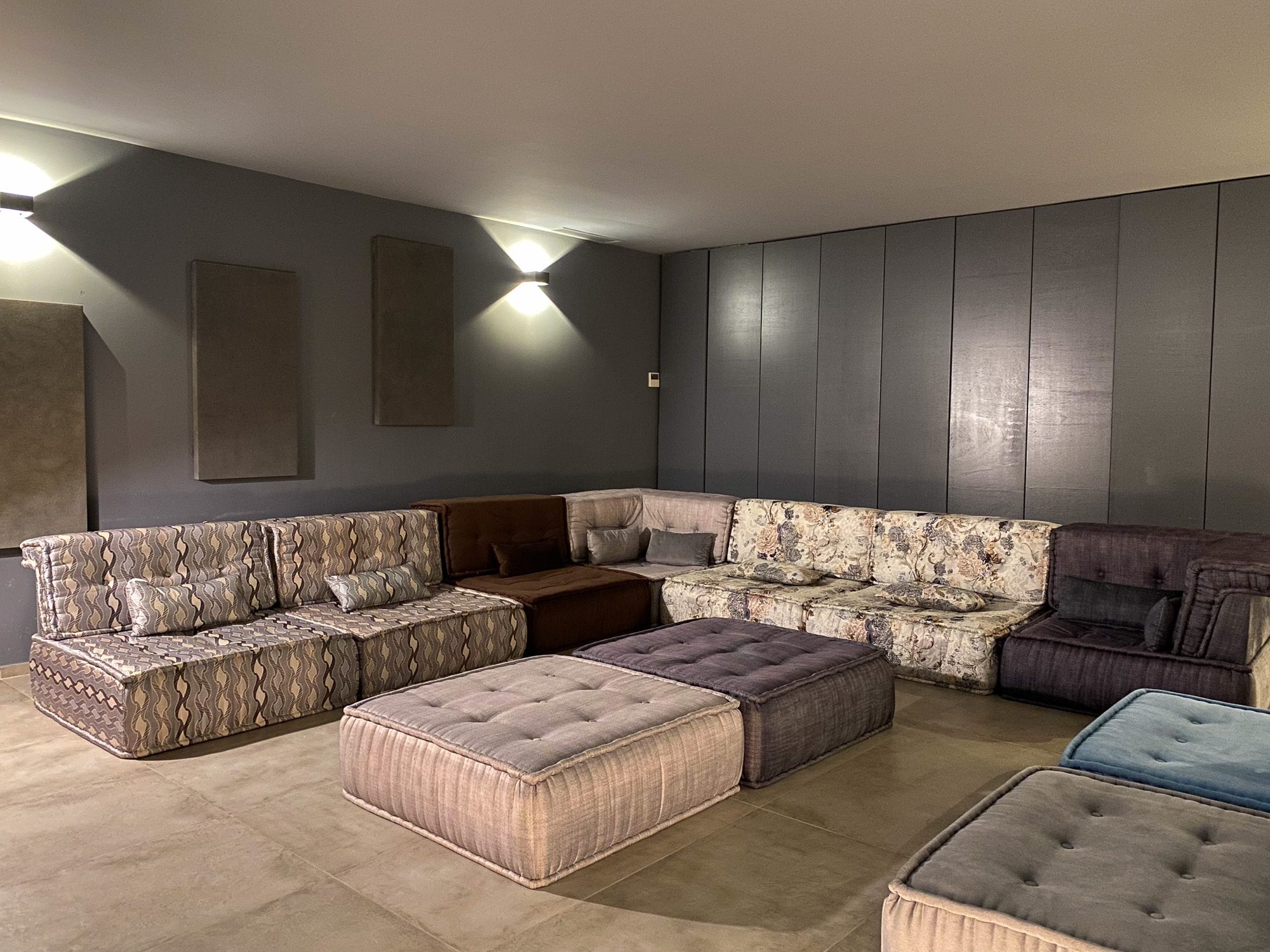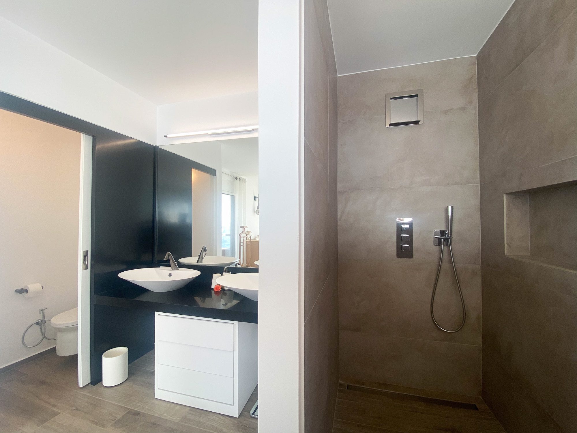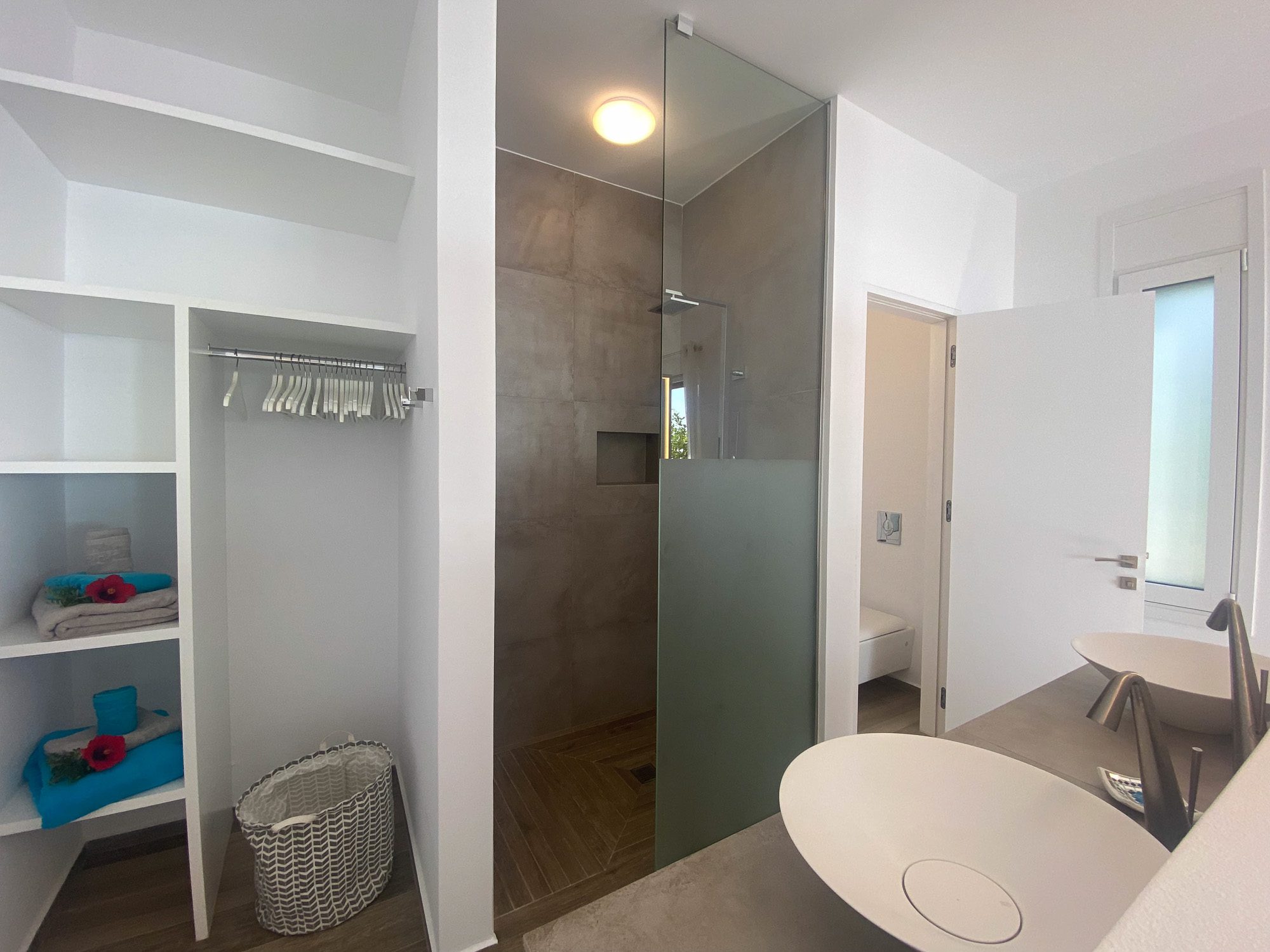 The main open plan living space has large sliding picture doors opening to the terrace and framing the views, lots of comfy sofa seating, dining for eight and a well-equipped kitchen. Theres also a spacious cinema room, finished in earthy tones, with room for everyone to gather. The two ground-floor bedrooms have garden views and shaded outdoor seating areas, whilst the three bedrooms on the first floor have stunning sea views. Theres also a kids bedroom with bunk beds and indoor table tennis.