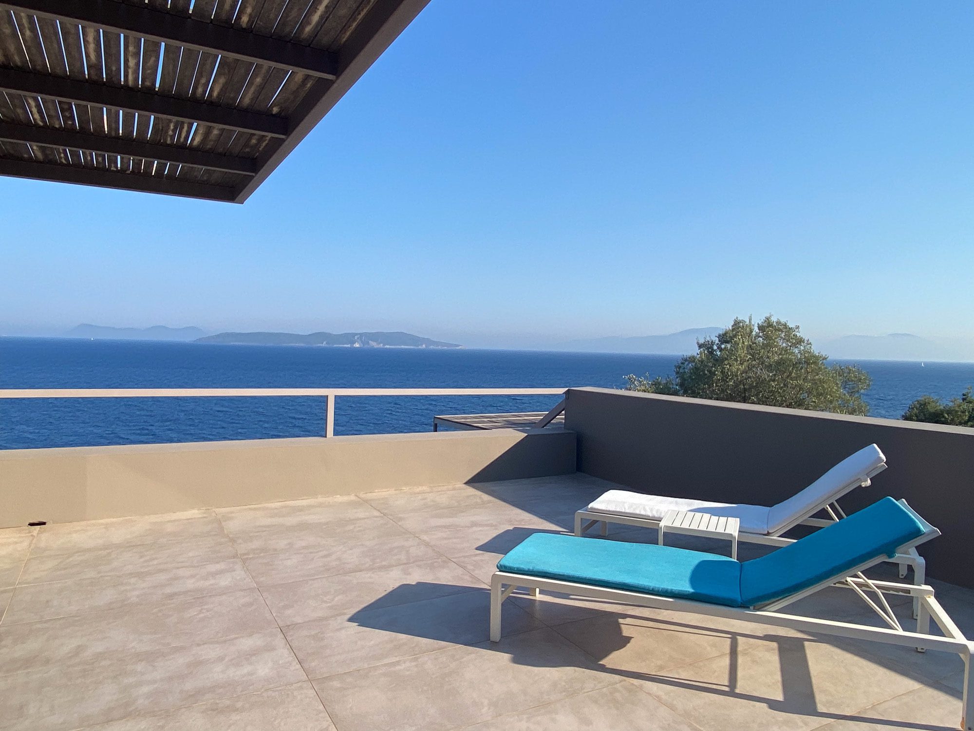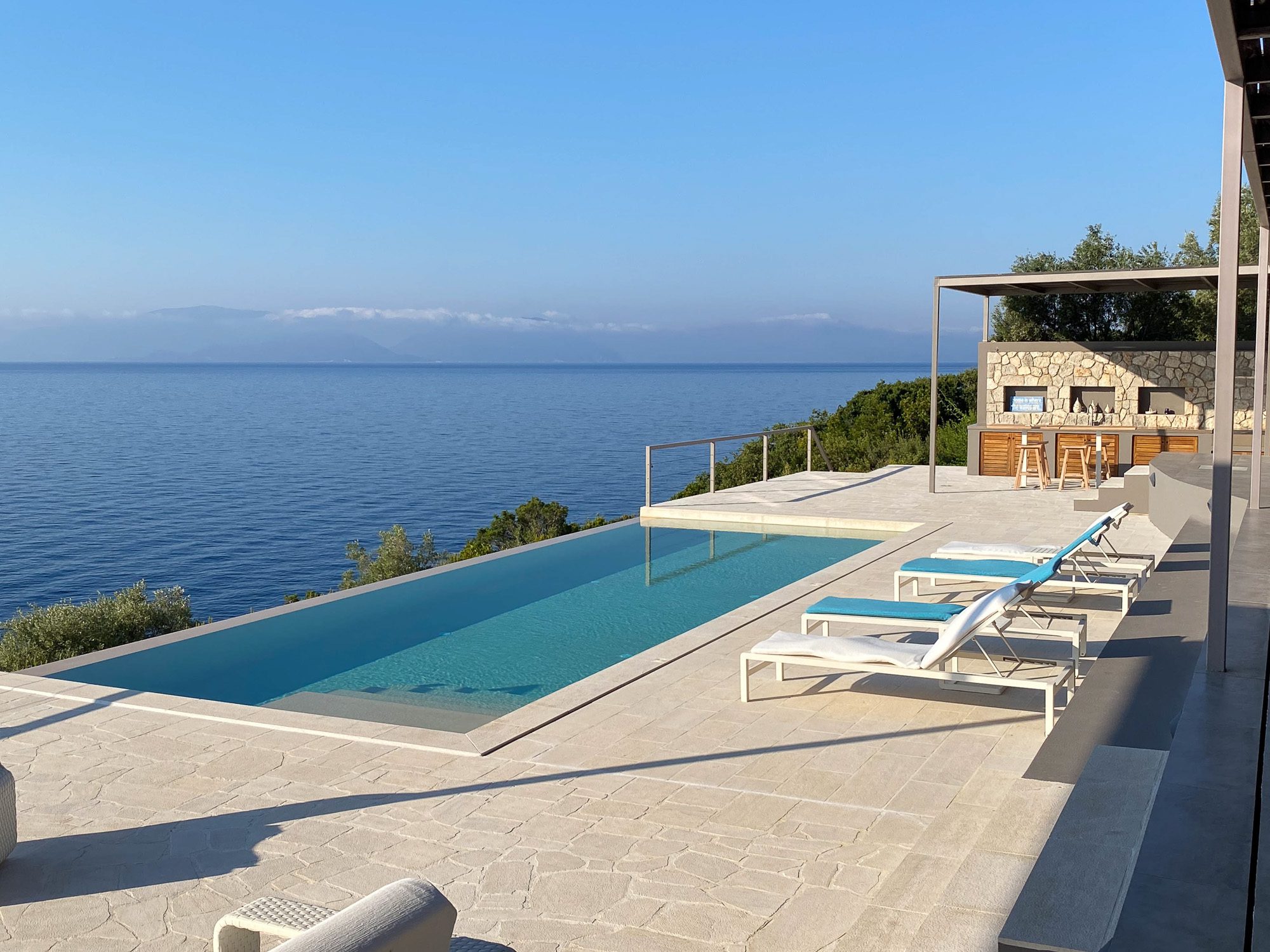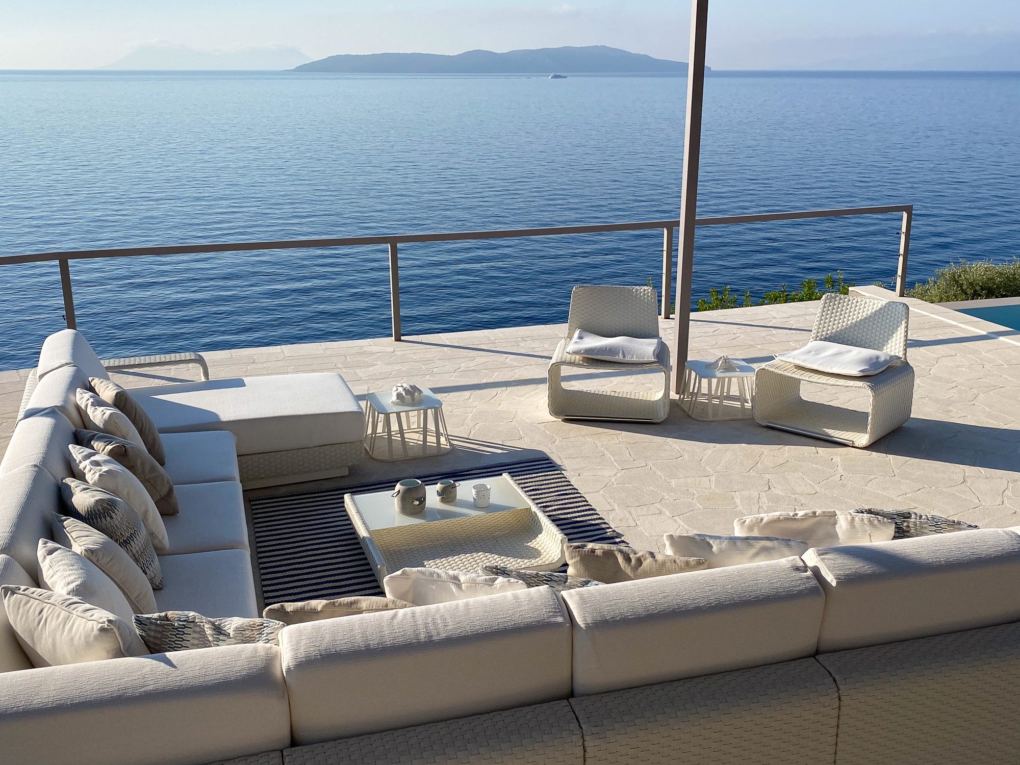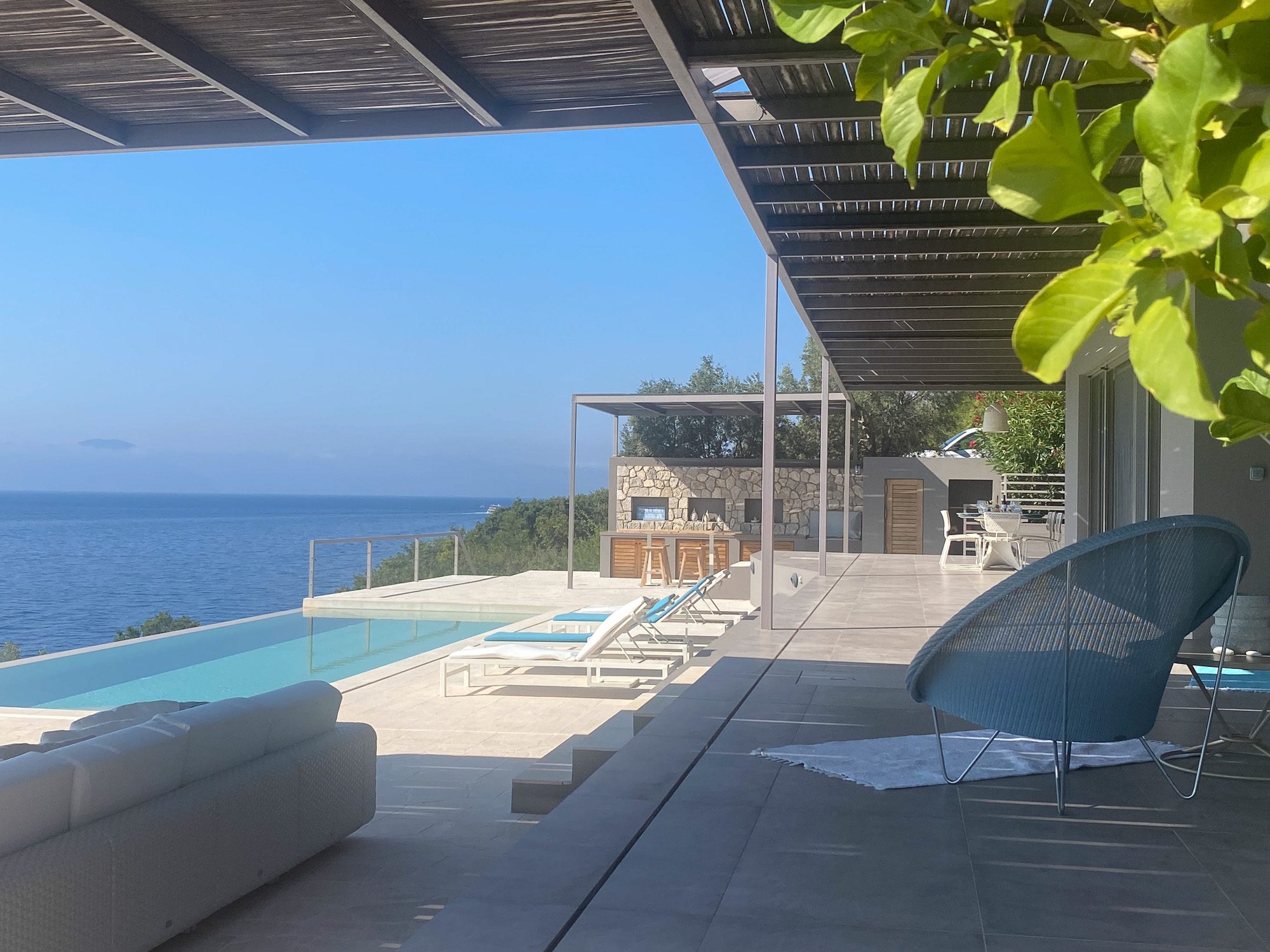 The multi-level terraces, facing out to sea, offer views of Kefalonia and Ithaca. Immediately outside the house is a covered al fresco dining area with steps down to the pool terrace, which features an enticing infinity pool, sun loungers, and an outdoor bar. On a higher terrace, there's a sizeable outdoor lounge with big, comfy cushioned sofas.